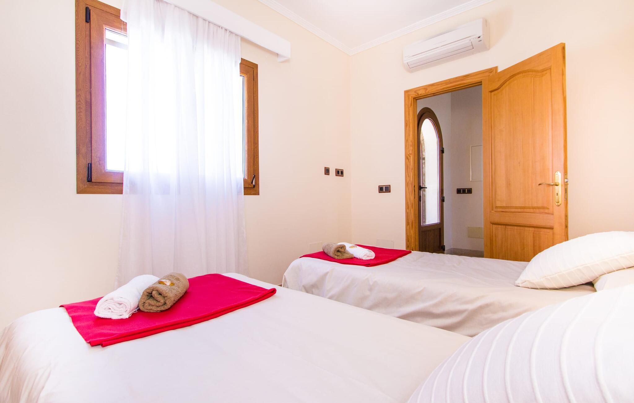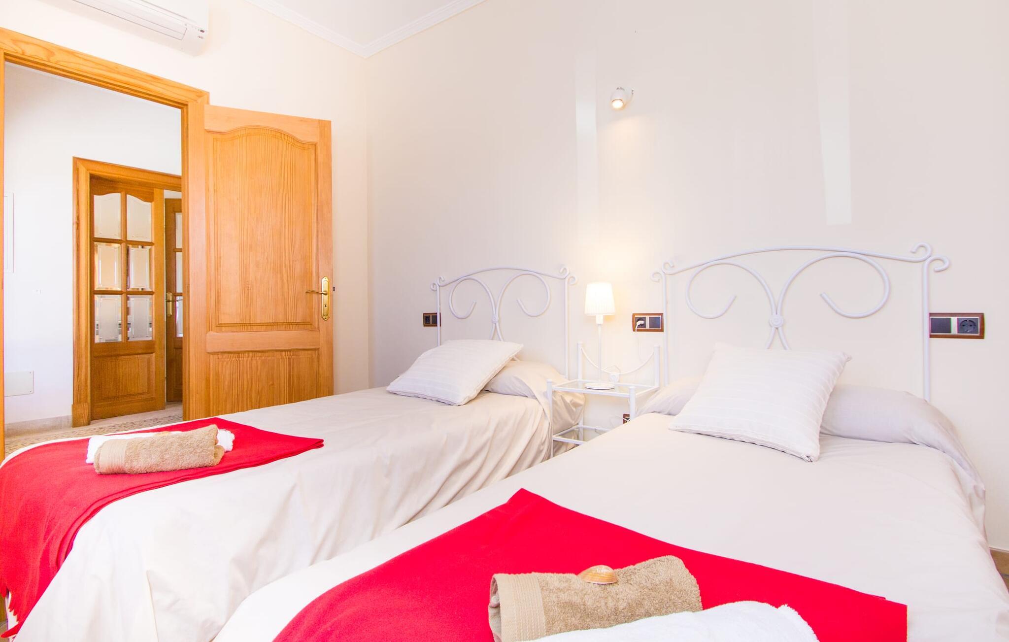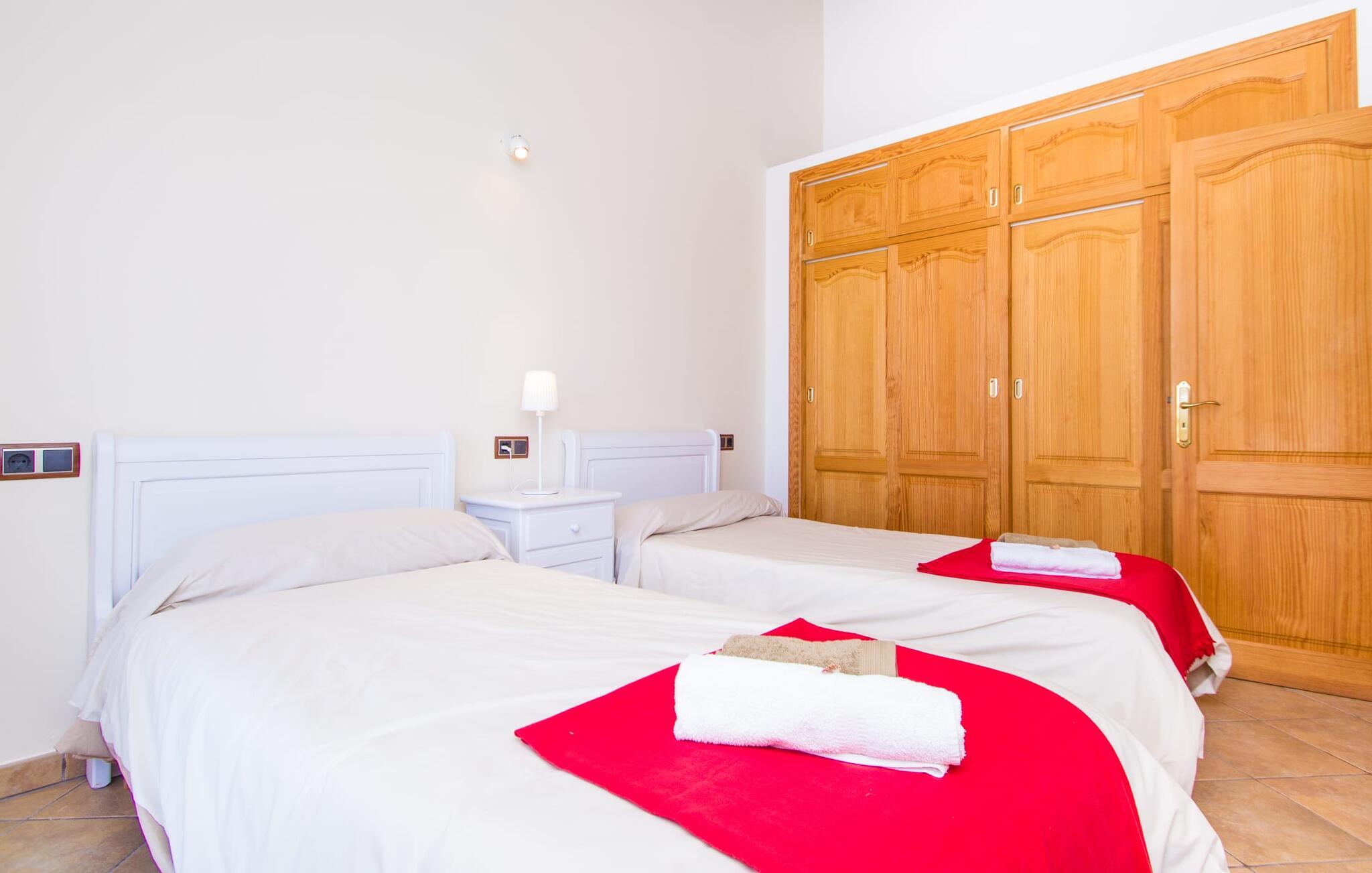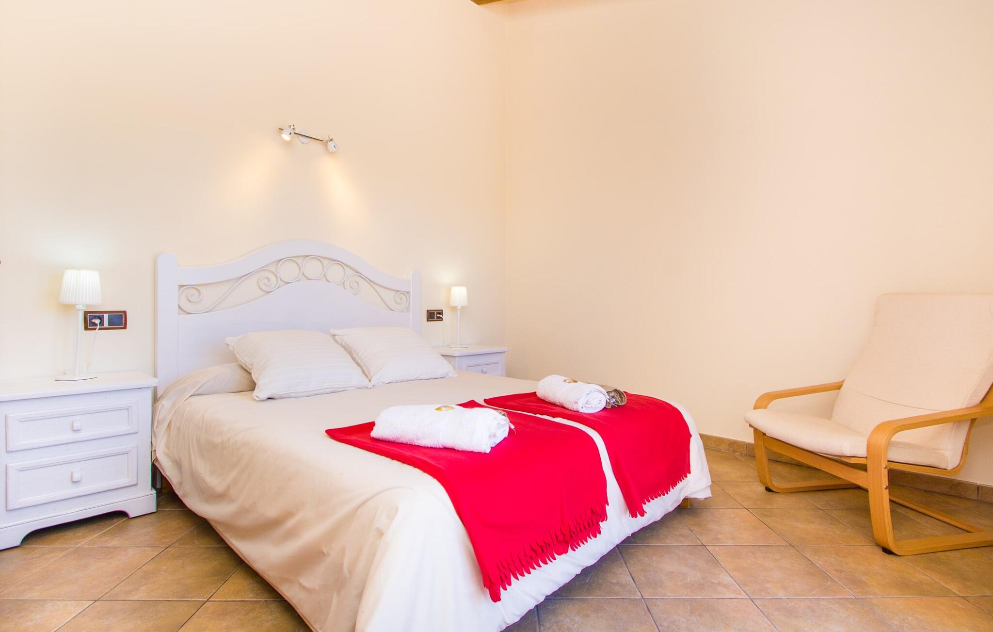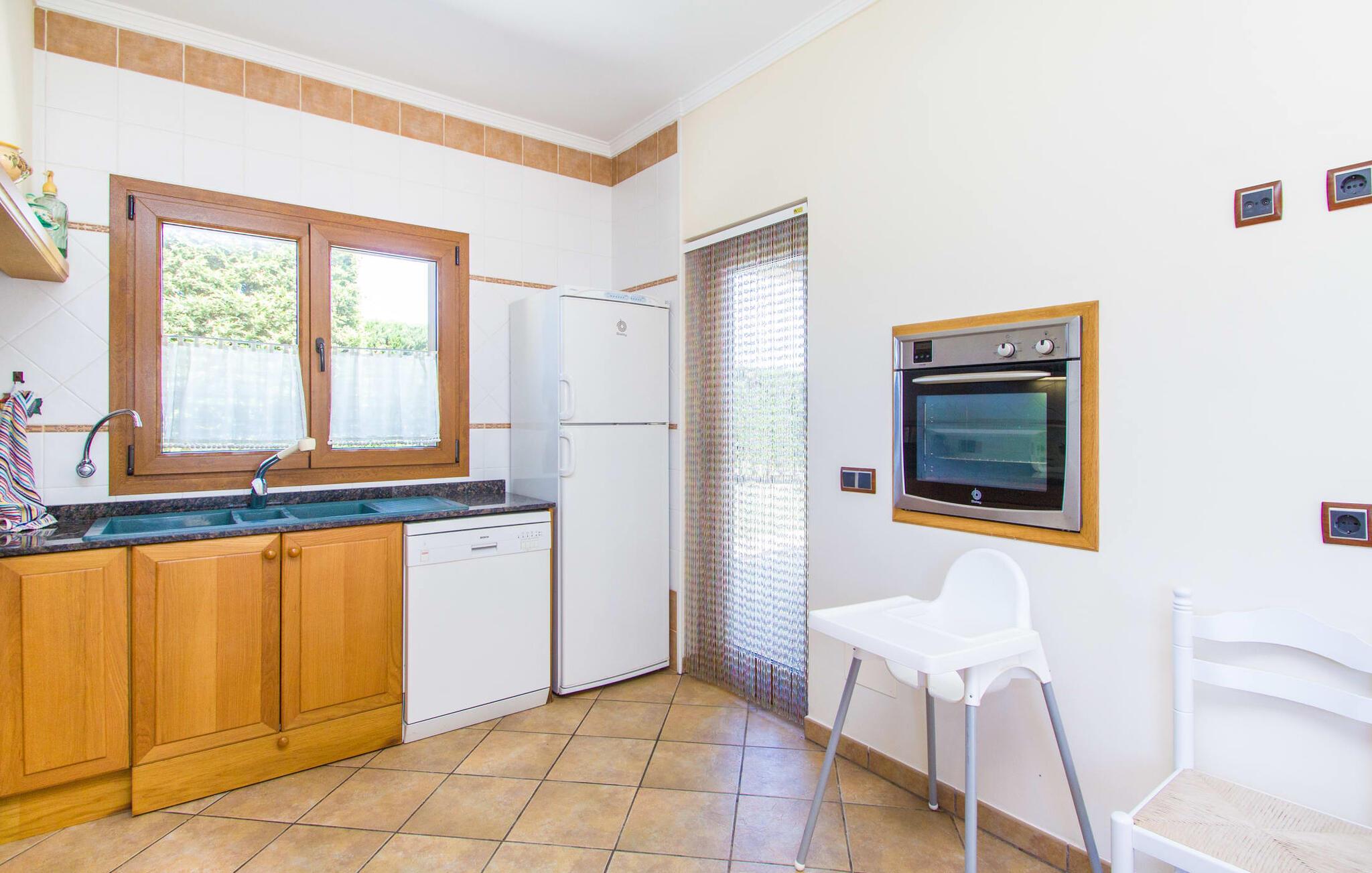 Hvis I er fan af skandinaviske, muntre farveskemaer, vil I straks forelske jer i husets indretning. Farverne på fliser, vægge og møbler harmonerer med hinanden og komplementeres charmerende af villaens belysningskoncept. I den store stue og spisestue kan I se den knitrende ild i pejsen eller slappe af i de store, hvide lædersofaer og se en film på fladskærms-tv'et. Køkkenet, der er udstyret med et bord, har også alt det nødvendige redskab til at sætte prikken over i'et på jeres ferie på Mallorca. Hvis tiden er knap, er der altid mulighed for at forkorte tilberedningen i mikrobølgeovnen. Ovnen er stilfuldt indbygget i væggen, og køleskabet tilbyder rigelig opbevaringsplads, selv til større shoppingture. Et af soveværelserne og et badeværelse ligger også i stueetagen. De to ekstra badeværelser, hvoraf det ene er indrettet i nautisk blå og hvid, samt fire yderligere soveværelser ligger på øverste niveau og fører ud til stuen. Et af badeværelserne har endda et badekar, hvis poolen og havet er for meget for jer. Værelserne ovenpå har også adgang til solterrassen med udsigt over poolen, haven og de landlige omgivelser.
