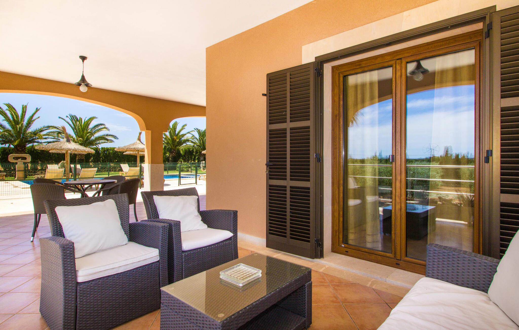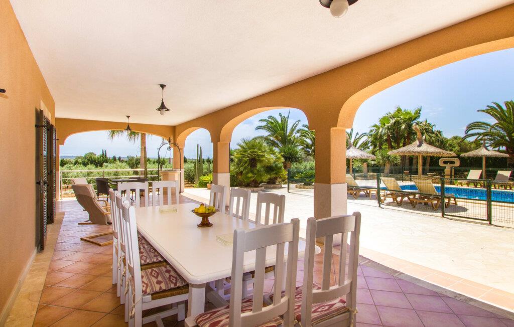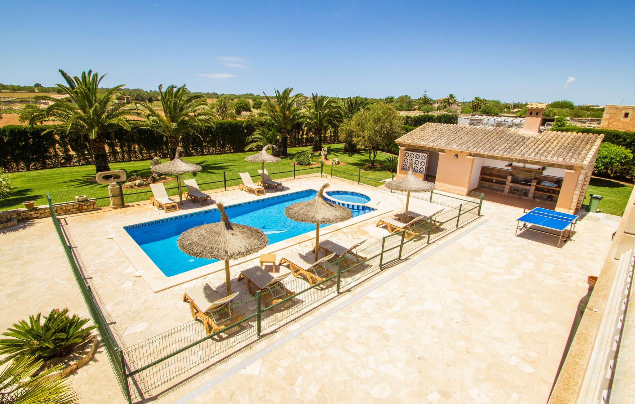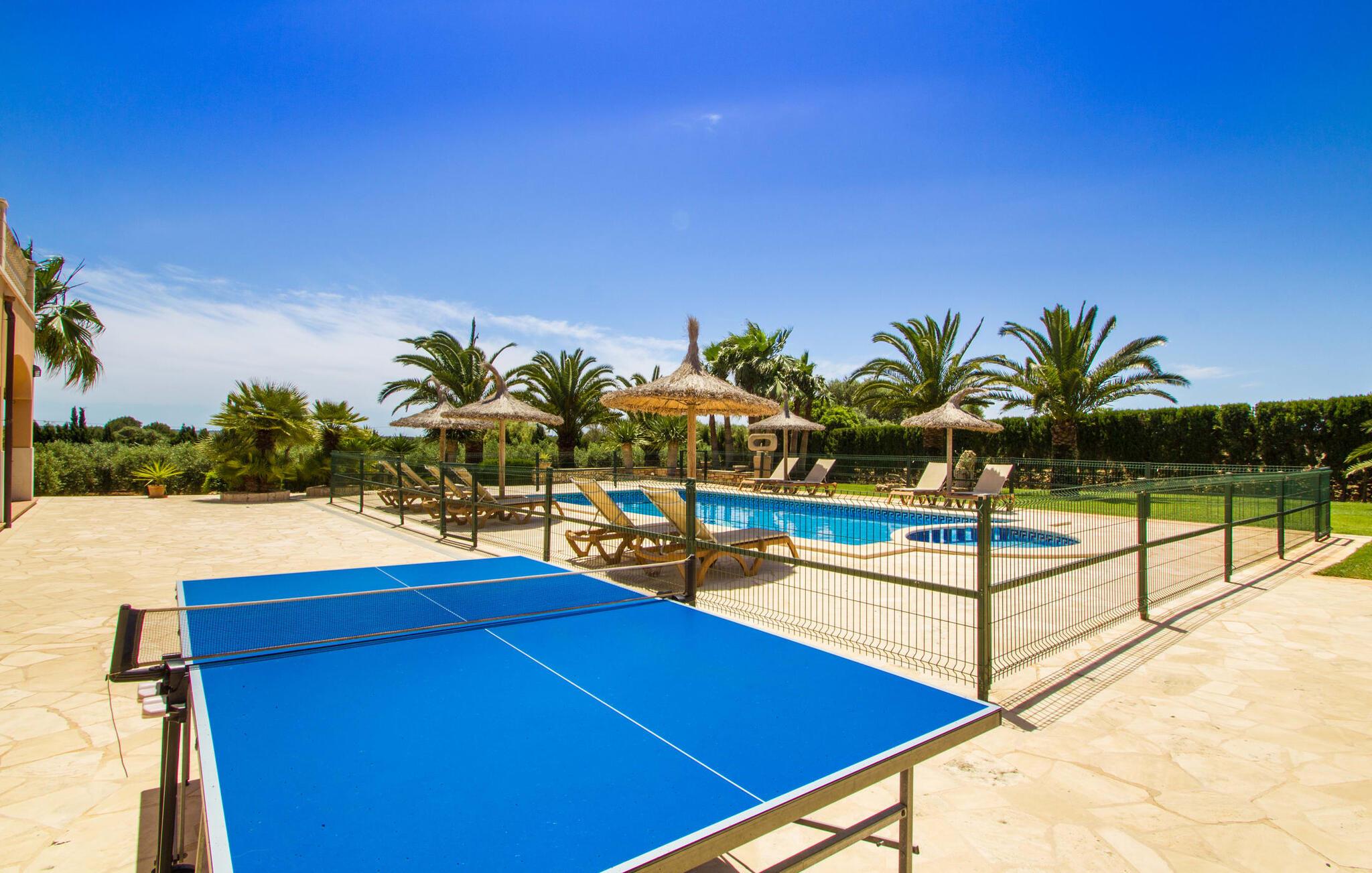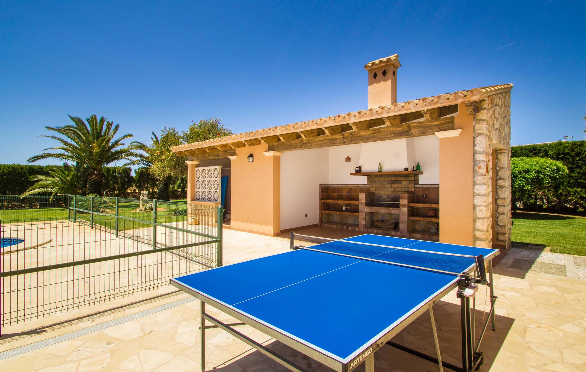 Ved ankomsten til Villa "S'Hort den Julia" tror I måske, I er i Florida: Komfortable liggestole omkranser den store pool, perfekt til timevis af plaskende aktiviteter. Her kan I slappe af, så meget I ønsker, mens I sover, overvåget af statelige palmer. Hvis I booker denne villa som familie, udgør poolen ikke en potentiel fare for de små. Den er omgivet af et hegn, så små børn kan boltre sig til deres hjertes lyst på den store græsplæne. Græsplænen er omgivet af en tæt grøn hæk, der tilbyder en behagelig grad af privatliv. Udenfor er der også en lille hytte med en stor murstensgrill og et veludstyret udendørs badeværelse. Her kan I tilberede lækre delikatesser og fordrive tiden med et spil bordtennis – vinderen modtager den største fisk fra aftengrillmiddagen. Den rummelige og varmt oplyste overdækkede veranda snor sig rundt om huset i en L-form og tilbyder masser af plads til, at hele gruppen kan omgås. Den har et stort hvidt spisebord, et komfortabelt siddeområde i flet og en hyggelig lænestol.