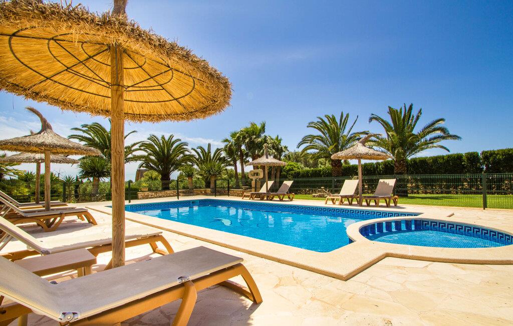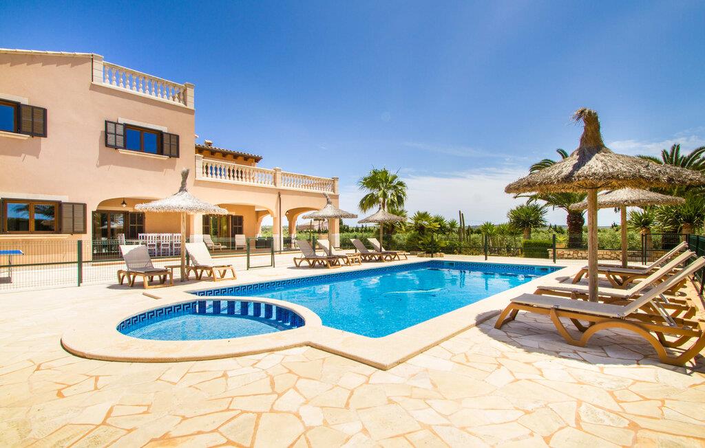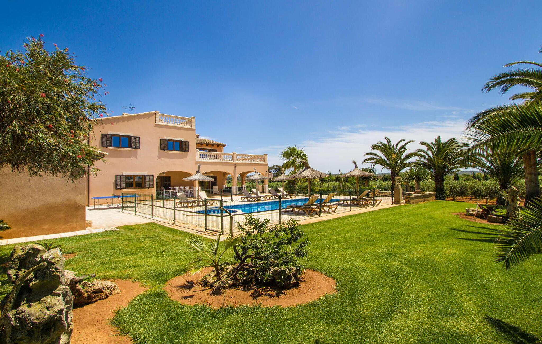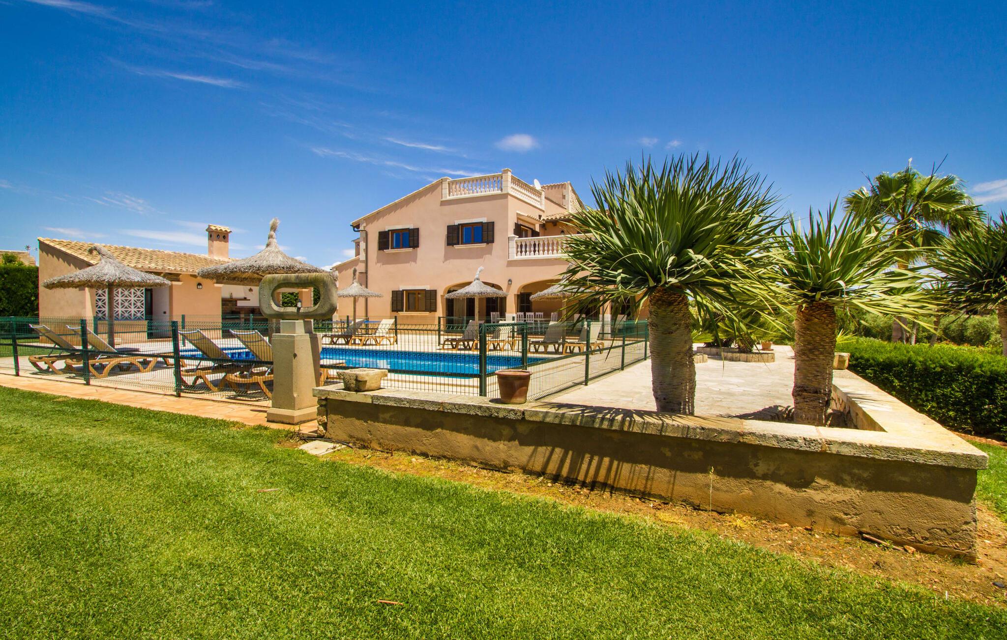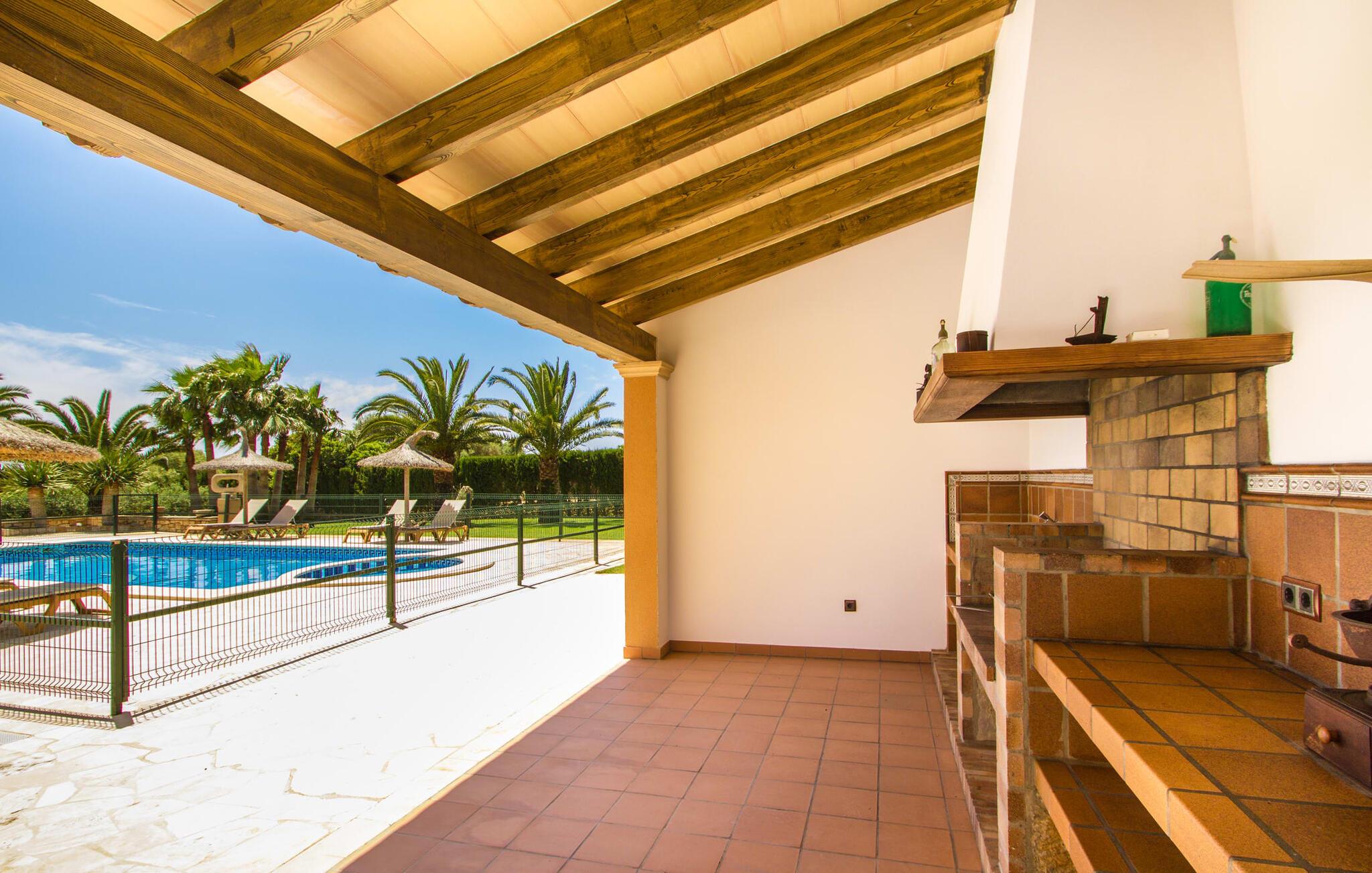 Ved ankomsten til Villa "S'Hort den Julia" tror I måske, I er i Florida: Komfortable liggestole omkranser den store pool, perfekt til timevis af plaskende aktiviteter. Her kan I slappe af, så meget I ønsker, mens I sover, overvåget af statelige palmer. Hvis I booker denne villa som familie, udgør poolen ikke en potentiel fare for de små. Den er omgivet af et hegn, så små børn kan boltre sig til deres hjertes lyst på den store græsplæne. Græsplænen er omgivet af en tæt grøn hæk, der tilbyder en behagelig grad af privatliv. Udenfor er der også en lille hytte med en stor murstensgrill og et veludstyret udendørs badeværelse. Her kan I tilberede lækre delikatesser og fordrive tiden med et spil bordtennis – vinderen modtager den største fisk fra aftengrillmiddagen. Den rummelige og varmt oplyste overdækkede veranda snor sig rundt om huset i en L-form og tilbyder masser af plads til, at hele gruppen kan omgås. Den har et stort hvidt spisebord, et komfortabelt siddeområde i flet og en hyggelig lænestol.
