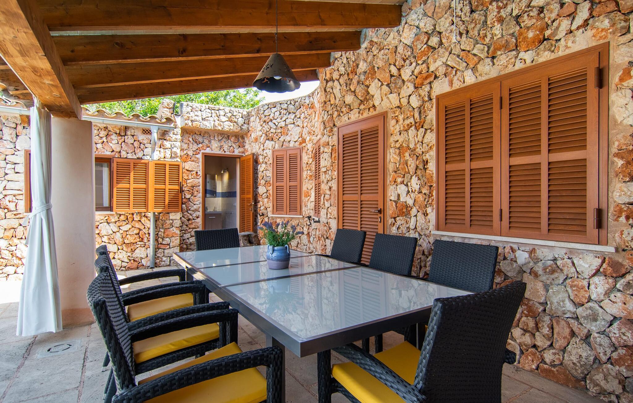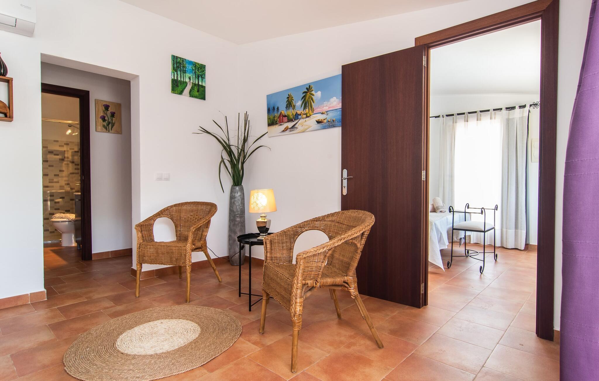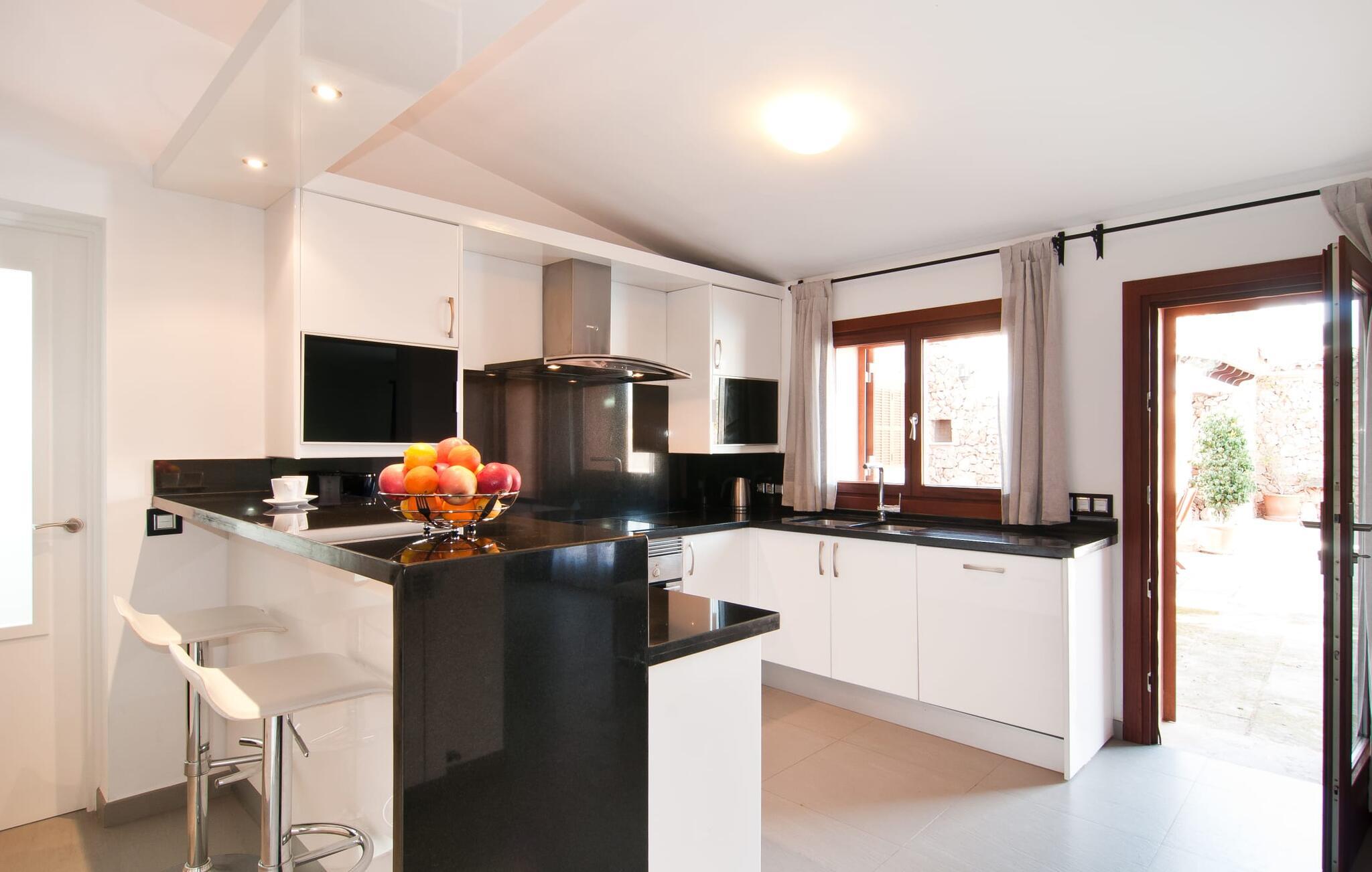 Den charmerende villa "S'Hortet" er det perfekte udgangspunkt for at udforske den sydlige del af øen. Der er en indbydende pool midt i gården. Tag en forfriskende svømmetur og slap af, før I slapper af på terrassen ved poolen. Føler I jer sulten, har I adgang til den rummelige indbyggede grill, som kan rumme en række forskellige måltider. I kan nyde den varme ø-brise eller se på nattehimlen, mens I spiser ved et af de udendørs borde. Gården suppleres af et stråtækt siddeområde og giver et roligt rum til at beundre villaens rustikke stenfacade, der omgiver gården som en beskyttende omfavnelse. Et udendørs badeværelse øger oplevelsen og giver jer mulighed for at nyde den friske luft i længere perioder. Inde i villaen er der en topmoderne lejlighed, der har et elegant sort/hvidt design. Det åbne køkken og opholdsstue skaber en indbydende atmosfære, ideel til at slappe af på sofaen eller planlægge jeres næste eventyr. Med to soveværelser og et badeværelse er villaen velegnet til enhver smag. På den anden side af terrassen finder I de øvrige soveværelser. Her dominerer de naturlige trætoner den lyse og venlige stemning og sikrer et behageligt og stilfuldt ophold. Beliggende i den nordlige del af den hyggelige by Campos, er villaen "S'Hortet" det perfekte udgangspunkt for at udforske den sydlige del af øen: de smukke sandstrande på sydkysten er kun et stenkast væk. Campos selv er kendt for sit legendariske ugentlige marked, men de mange butikker, barer, restauranter og butikker byder på masser af variation. For vandsportsentusiaster er en tur til Sa Ràpita, 12 km væk, absolut umagen værd.