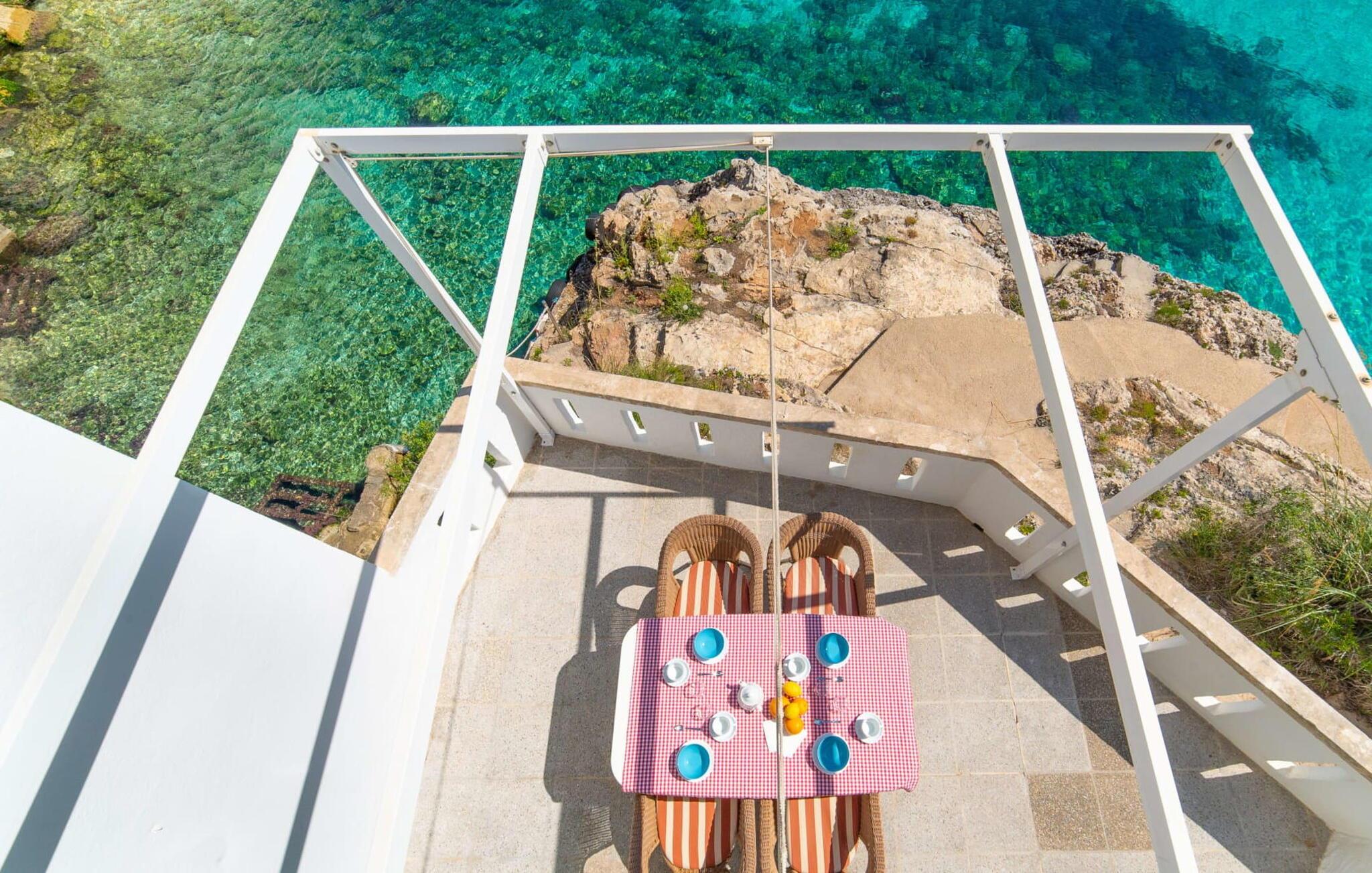 Taget er blevet omdannet til en spektakulær tagterrasse, der byder på en betagende udsigt over lagunen, der strækker sig ud foran. Nedenfor fører terrasserne direkte til havet, hvor det krystalklare vand afslører en sandet havbund og stimer af småfisk. Snorkling i Cala Santanyí er et absolut must, da der er meget at opdage langs klipperne.
