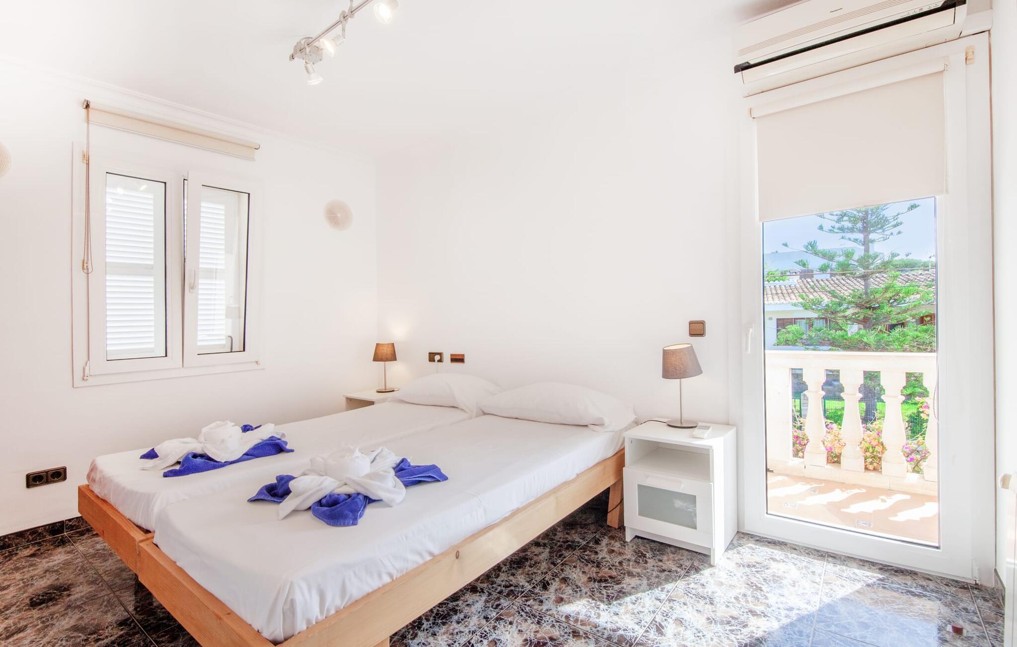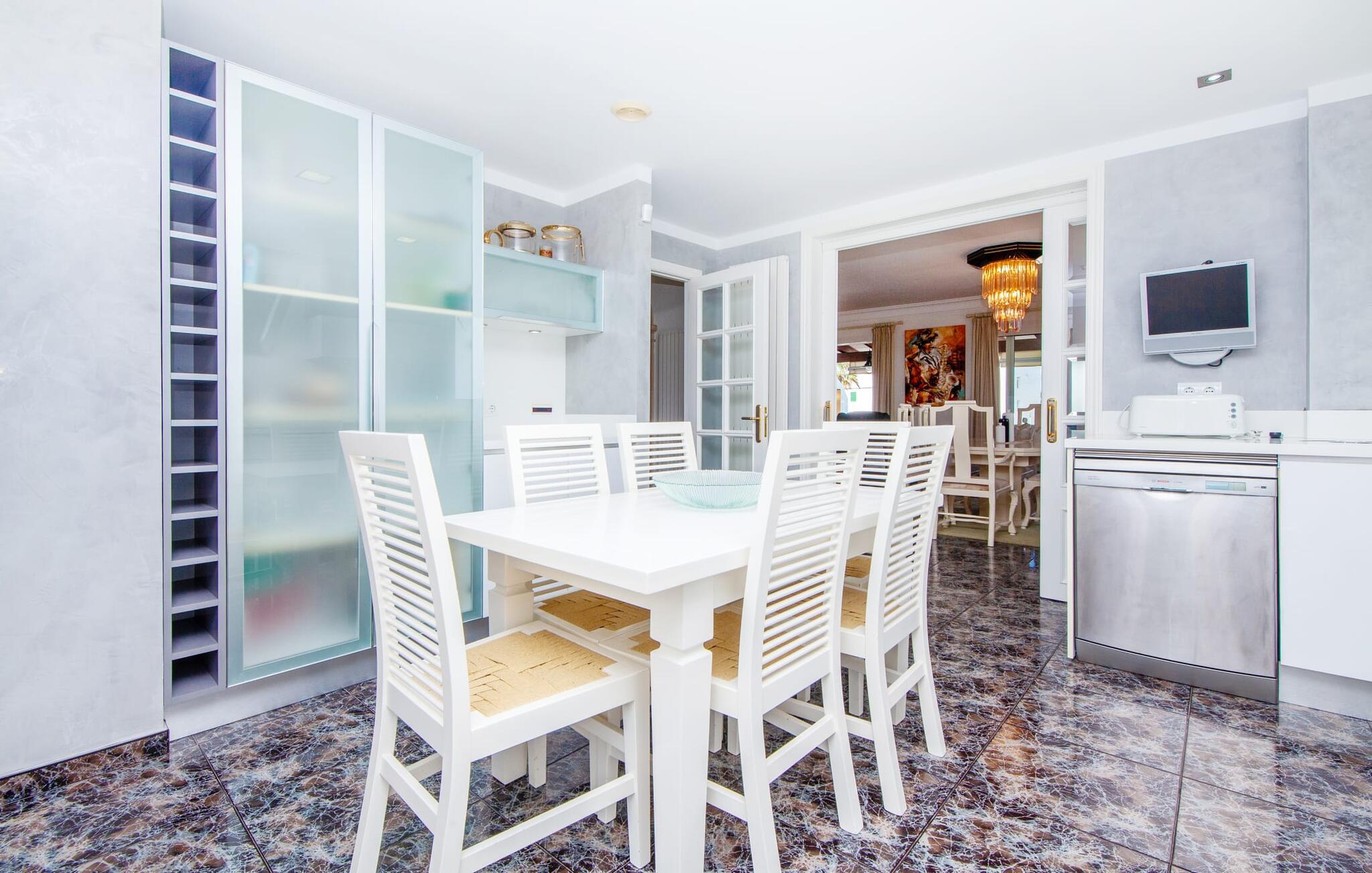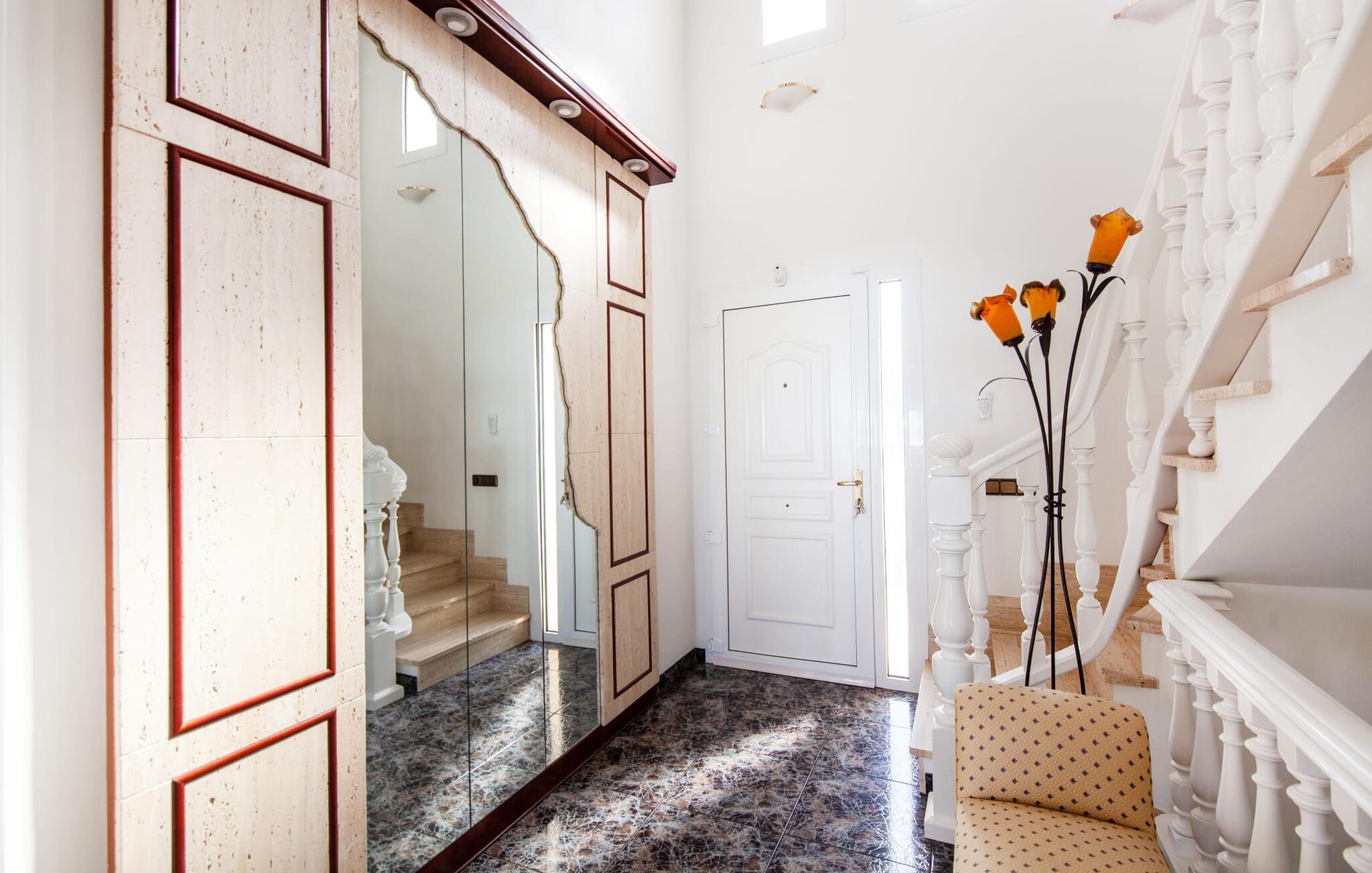 Indenfor udstråler villaen elegance og rummelighed. Den nederste etage indeholder en stue med sommerkøkken og indendørs grill, et soveværelse med dobbeltseng og et komplet badeværelse med badekar. Stueetagen har også et brusebad. Ovenpå finder I en stor stue/spisestue med komfortable siddepladser, et tv og et generøst spisebord samt et fuldt udstyret køkken og tre dobbeltværelser - hvoraf det ene har eget badeværelse og et ekstra brusebad.