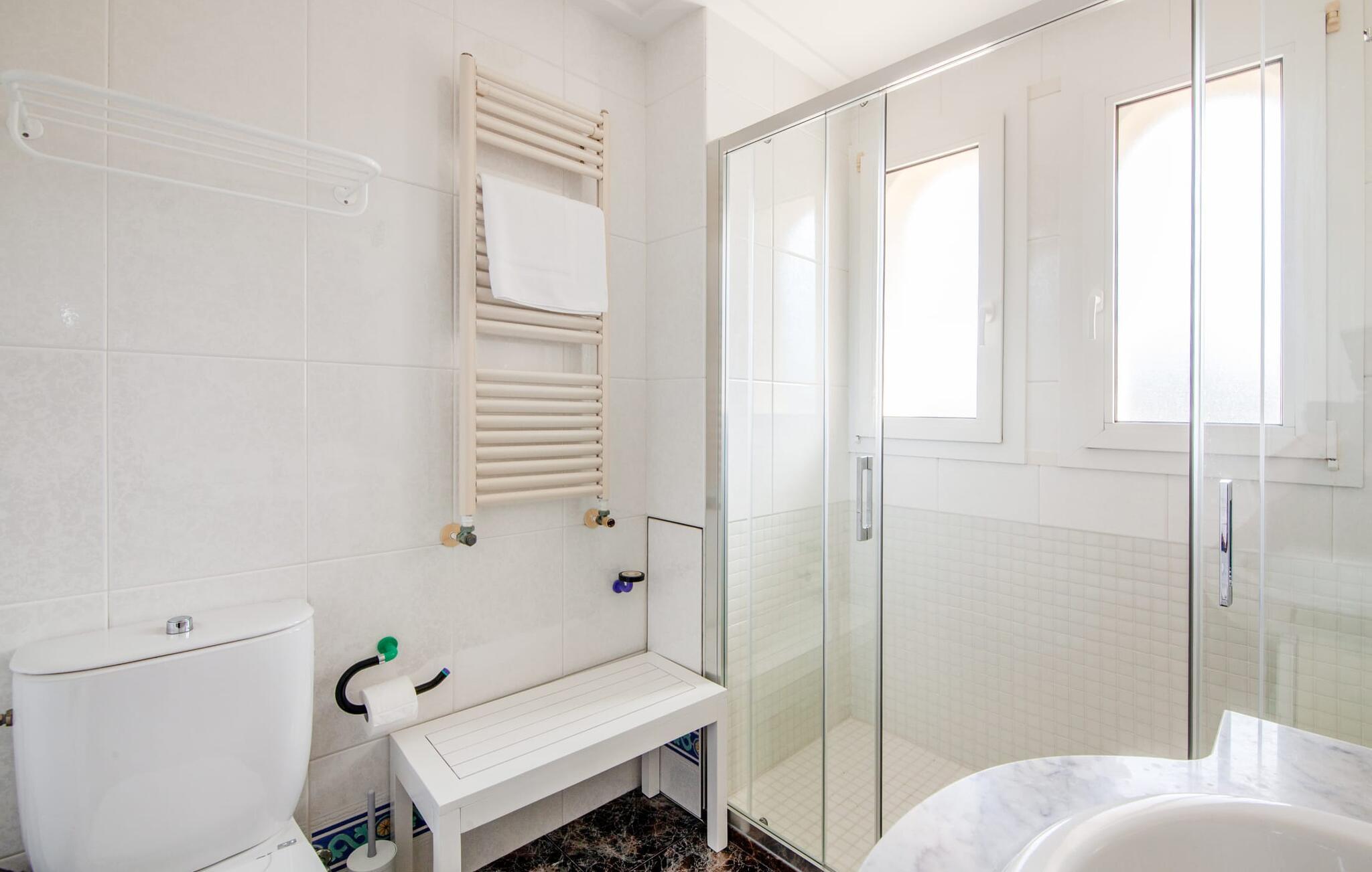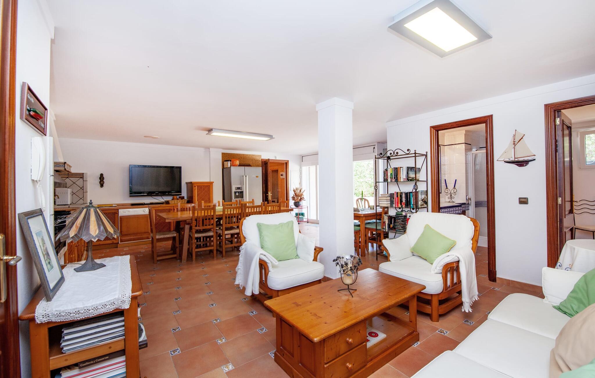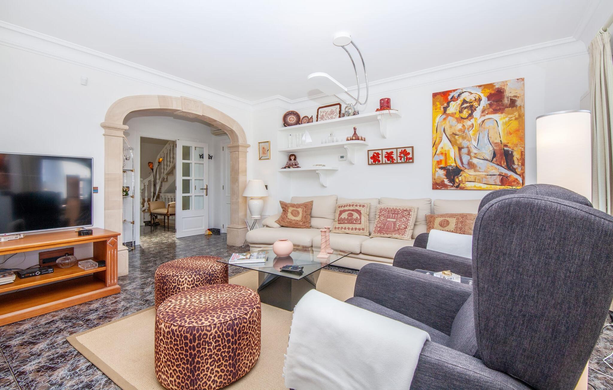 Indenfor udstråler villaen elegance og rummelighed. Den nederste etage indeholder en stue med sommerkøkken og indendørs grill, et soveværelse med dobbeltseng og et komplet badeværelse med badekar. Stueetagen har også et brusebad. Ovenpå finder I en stor stue/spisestue med komfortable siddepladser, et tv og et generøst spisebord samt et fuldt udstyret køkken og tre dobbeltværelser - hvoraf det ene har eget badeværelse og et ekstra brusebad.