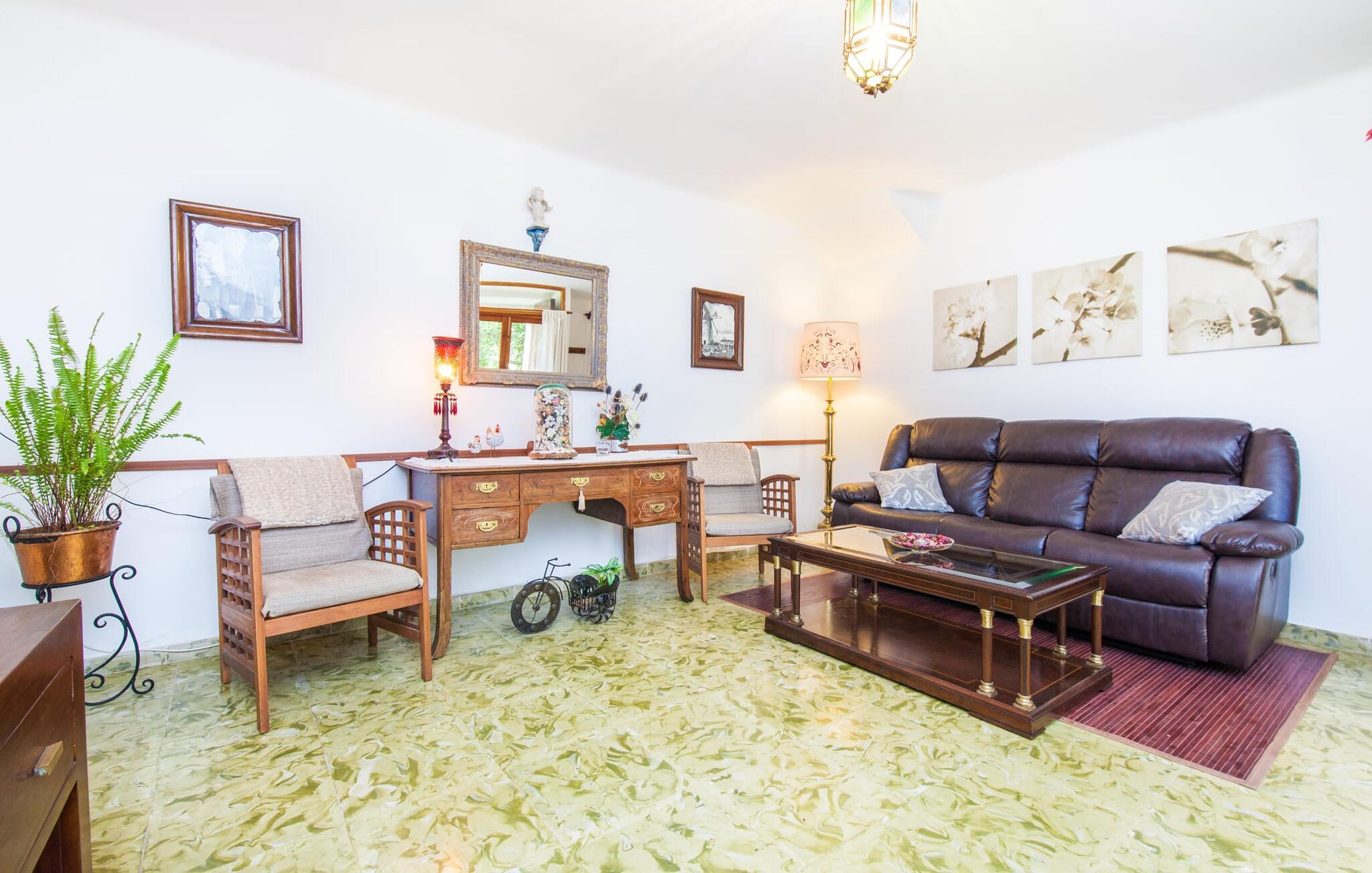 Villaen "Sa Caseta den Tronca" vil glæde jer med sit storslåede udeareal. Alt er smukt plantet, hver centimeter er grøn og blomstrer. Selv udefra giver villaen et rustikt og autentisk indtryk. Nogle af vandområderne er dekoreret med farverige mosaikker og har natursten overalt. Foran huset er der overdækket terrasse og grillplads, hvor I kan tilberede lækre delikatesser. Et andet højdepunkt ved udendørsområdet er den vidunderlige pool. Et spring i det kolde vand er en sikker forfriskning på varme sommerdage. Derudover er der masser af muligheder tilgængelige i og omkring villaen, når det kommer til at finde et sted at slappe af. I kan læne jer tilbage på liggestolene, slappe af i chill-out loungen eller lade jeres bekymringer ligge i hængekøjen. Foretrækker I skygge, er der også en lille overdækket terrasse med opholdsområde ved poolen. Og med vores egen legeplads med gynger og rutsjebaner bliver der også taget godt hensyn til de små, der rejser med os. Det indre af villaen "Sa Caseta den Tronca" er meget rustikt indrettet. I stuen er der en behagelig lædersofa og en gammel brændeovn, som i kombination med den indbyggede varmeovn giver hyggelig varme og en behagelig atmosfære i vintermånederne. Møblerne i dette rum er også overvejende traditionel. Fra stuen fører en dør ind til køkkenet, som er udstyret med en åben naturstensvæg og et lille spisebord. I stueetagen finder I også et soveværelse med dobbeltseng og et badeværelse. De synlige træbjælkelofter og de klassiske møbler giver en masse mallorcansk flair. På øverste etage er der yderligere to soveværelser med dobbeltsenge og et badeværelse med en synlig naturstensvæg, en dobbelt vask og et badekar. Herfra er der også adgang til husets altan. Der finder I et opholdsområde, hvorfra I kan skue ud over trætoppene og nyde omgivelserne i jeres sommerhus i fulde drag. Denne villa ligger midt på øen, nær Sant Joan. Hvis I slentrer gennem byens gader, vil I opdage endnu mere af det autentiske Mallorca. Placeringen af villaen er ideel til udflugter i alle retninger. Med jeres lejebil kan I nå de smukke strande, som kan nås via den tydeligt hørbare vej lige foran huset. Disse strande, herunder den lange sandstrand Can Picafort i Alcúdia-bugten, ligger omkring 30 km fra ejendommen. Palma, Mallorcas hovedstad, ligger cirka 37 km væk. Der vil I opdage masser af interessante seværdigheder, gode restauranter og varierede stier og vandrestier. Efter ca. 6 km kørsel kommer I til Sineu kommune. Hver onsdag er der markedsdag der. Det siges, at dette er det smukkeste bondemarked på hele Mallorca. Typiske mallorcanske delikatesser og tøj, lædervarer og fantastiske julesouvenirs kan købes på markedet. Tro os: I kan simpelthen ikke gå glip af en tur dertil. Den autentiske villa "Sa Caseta den Tronca" ligger midt på øen, nær Sant Joan kommune. Udeområdet omkring feriehuset er virkelig idyllisk. Der er et supermarked ca. 3,2 km væk, hvor I kan gøre jeres daglige indkøb. Der er også en række hyggelige restauranter i byen Sant Joan og i Sineu, ca. 6 km væk, finder Mallorcas smukkeste bondemarked sted hver onsdag.