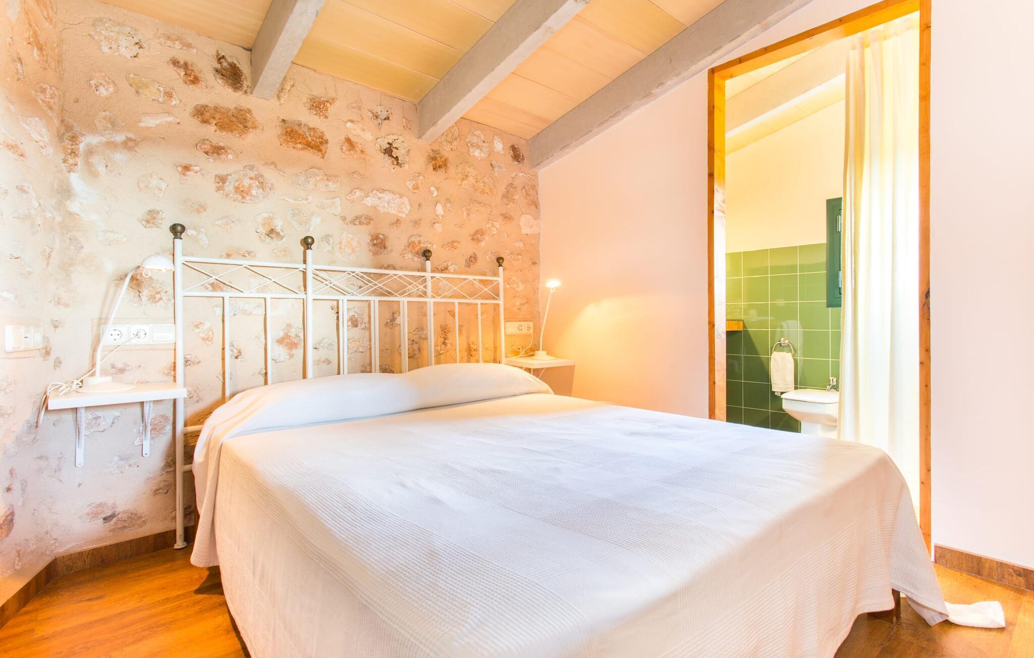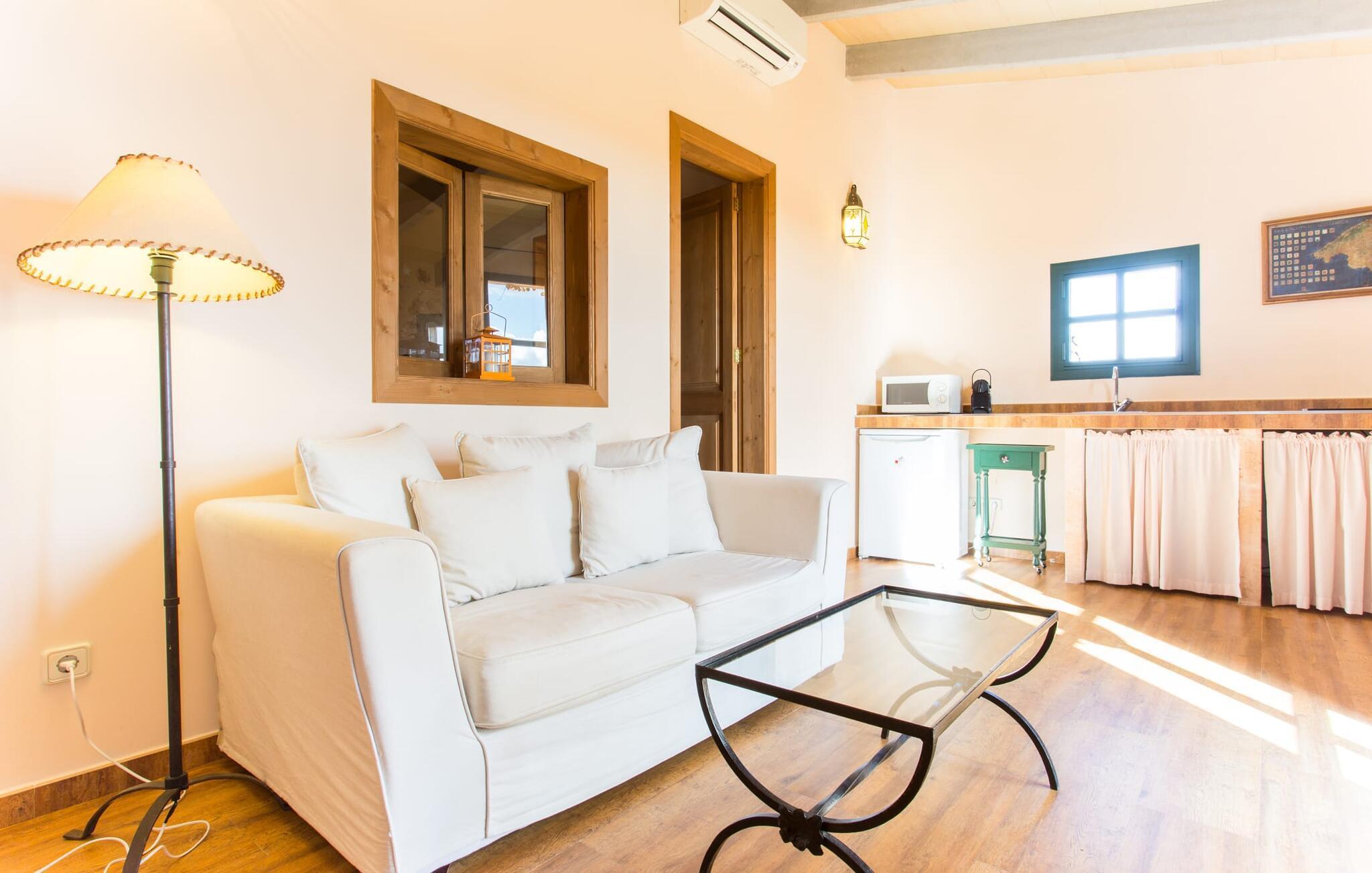 Du vil elske dette smukt restaurerede nostalgiske feriehus med sin vidunderlige terrasse fra første øjeblik. Det har til huse i en over 100 år gammel villa, smagfuldt restaureret i overensstemmelse med den lokale tradition og omgivelserne. Dette charmerende tilflugtssted ligger i idylliske naturlige omgivelser med en frugthave og endda nogle glade høns, der strejfer rundt på ejendommen. Den smukke fælles pool er også tilgængelig for de øvrige fire lejligheder på ejendommen: "Sa Cova Tagomago", "Sa Cova Mallorca", "Sa Cova Formentera" og "Sa Cova Ibiza" og giver dig mulighed for at møde andre feriegæster. Og hvem ved, måske er dette første skridt mod at få nye venner, grille sammen og have gode samtaler. Hvis du rejser med børn, kan dette også være en god mulighed. Når først børnene har travlt med deres nye legekammerater, kan du bruge endnu mere tid derhjemme på at læse den bog, du altid har ønsket at læse, men ikke har fundet. tid til Hvis du foretrækker noget mere aktivt, kan du tage lange gåture i naturen i de smukke omgivelser, forbi de maleriske små vindmøller, der er så typiske for denne region. Køkkenet er det ideelle sted at tilberede en overdådig BBQ. Dette er et Fincallorca feriehus. Det charmerende feriehus "Sa Cova Cabrera" emmer af sin originale sommerhus-flair: rustikke loftsbjælker, delvist naturstensvægge og masser af træ. Et særligt blikfang er den hyggelige lounge med sofa; Vinduet fra gulv til loft byder på en vidunderlig udsigt udenfor, så tv'et er i bedste fald ubetydeligt. Det perfekte sted at sætte sig ned om aftenen og slappe af med et glas mallorcansk vin. Det enkle, men smukt møblerede soveværelse er tilgængeligt gennem døren OG vinduet. Søde drømme er garanteret i dette rolige og stille miljø. Glatte grønne fliser og en naturstensvæg, som harmonerer perfekt med det gyldne spejl, giver en-suite badeværelset dens særlige flair. Køkkenet er udstyret med keramisk kogeplade, mikroovn, køleskab og kapselkaffemaskine. Dens æstetiske enkelhed passer perfekt til landstedets atmosfære. Hvert værelse i dette feriehus er designet, så du altid føler, at du er, hvor du er: midt på det autentiske Mallorca. Langt væk fra de ansigtsløse facader, der ødelægger landskabet i turistområder. Forkæl dig selv med en pause fra hverdagen og nyd denne perle. Med en lejebil kan du nå byen Campos på få minutter. Da det stort set er en landbrugsby, er det det perfekte sted at hente friske råvarer fra markerne. Der er et lokalt landmandsmarked hver torsdag og lørdag. Du bør bestemt aflægge et besøg på det lille familieostmejeri Formatges Burguera. Det er på vejen til Colonia de Sant Jordi og er kendt for sin fremragende ost. Kun 21 km væk ligger den fantastiske Es Trenc strand, kendt for sit hvide sand og smukke natur. Beliggende mellem fyrretræer og blidt bølgende klitter er det ikke kun en fryd for øjet, men også perfekt for børn, da vandet kun gradvist bliver dybere. Et himmelsk sted på landet. Denne beskrivelse opsummerer sommerhuset "Sa Cova Cabrera", som er helt perfekt til par og små familier på grund af sin rolige og fredelige beliggenhed. Den lille by Campos ligger kun 8,7 km væk. Der vil du finde adskillige butikker til at dække dine daglige behov. Smukke strande såsom Platja de Sa Rapita og Ses Covetes ligger kun 20 minutter væk i bil.