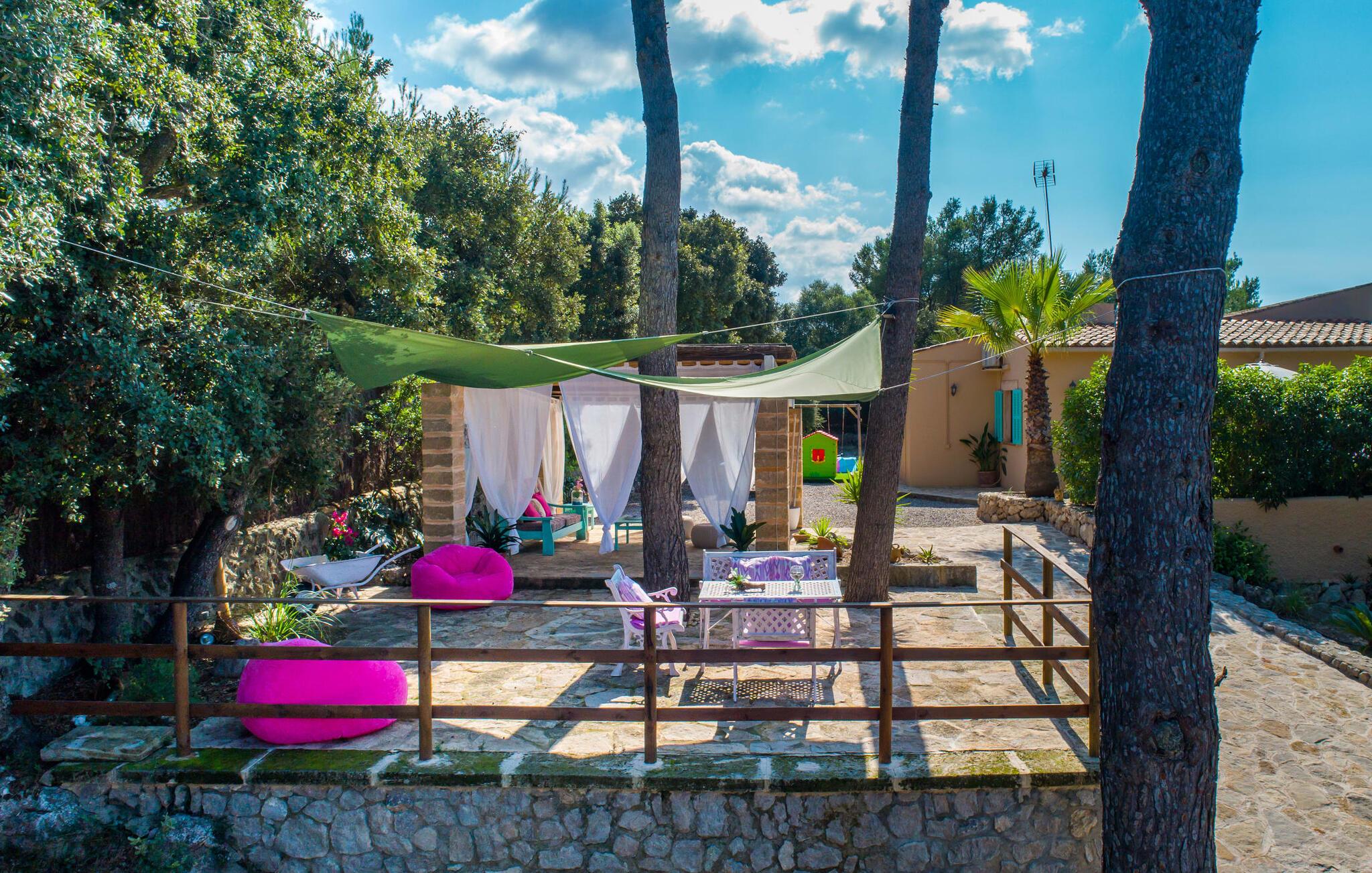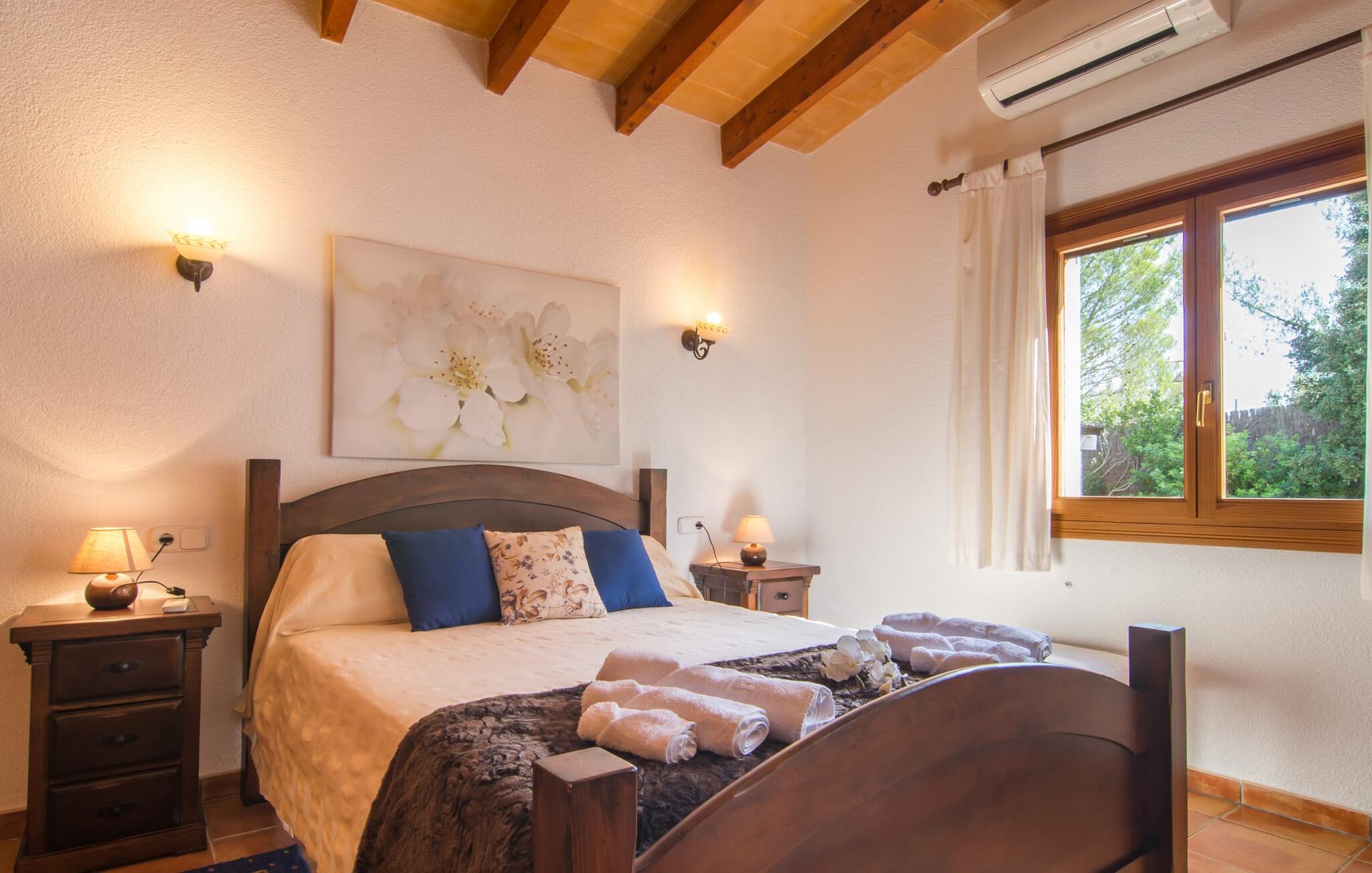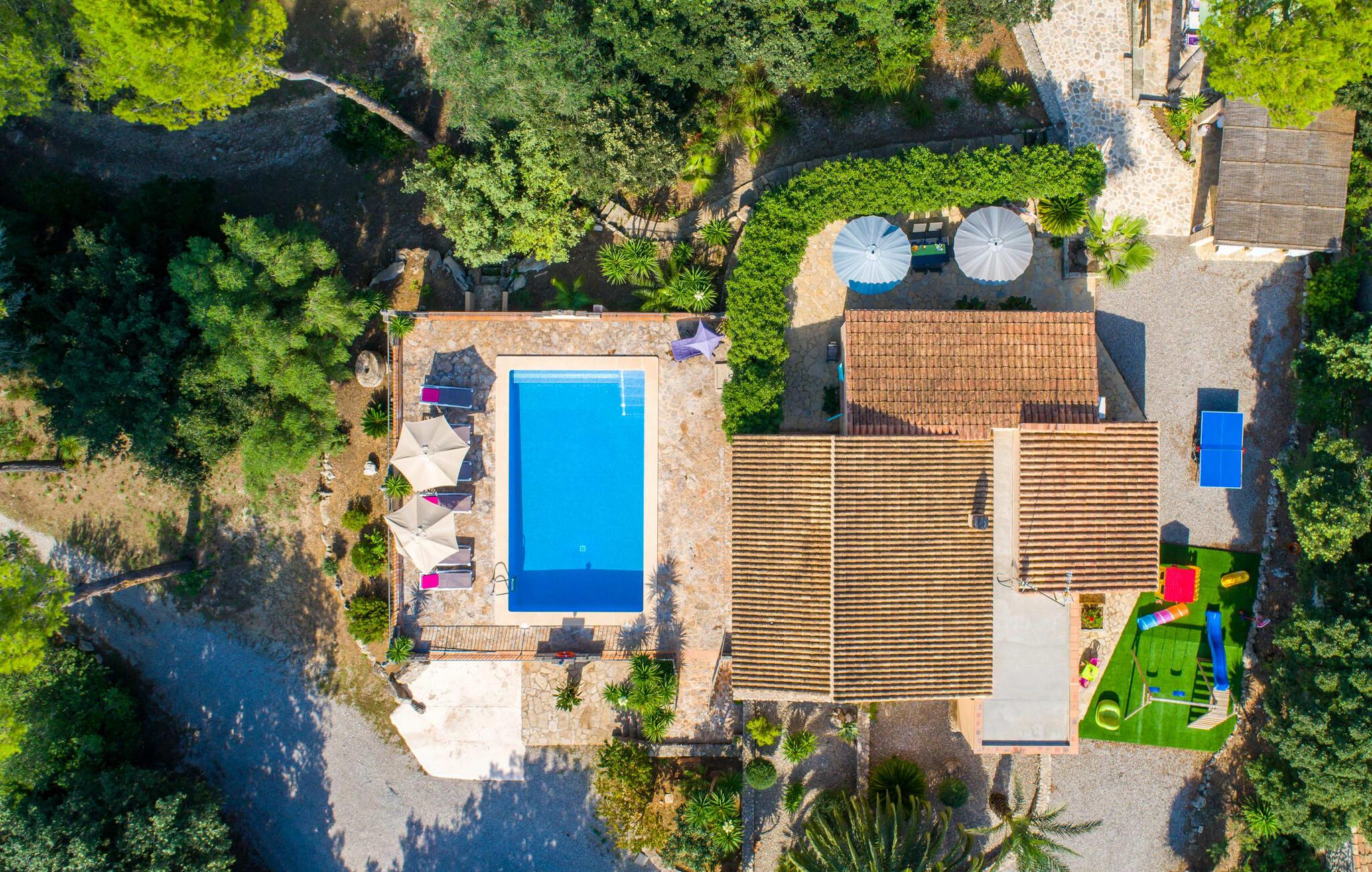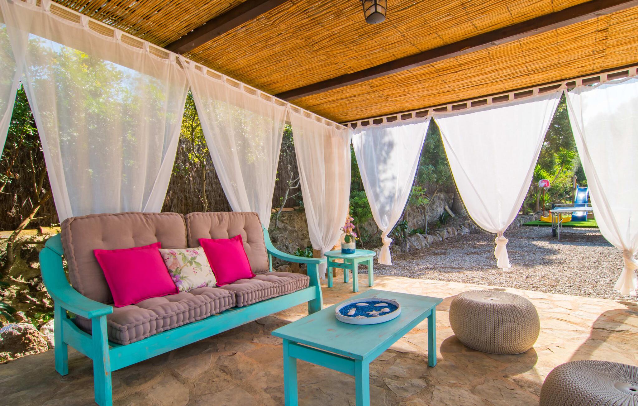 Oplev den fortryllende villa "Sa Creu de s'Auma", et fortryllende tilflugtssted omgivet af eksotiske planter og en klar blå himmel. Denne dejlige ejendom inviterer jer til at slappe af, startende med en grussti, der fører til jeres private poolterrasse. Nyd en afslappet svømmetur eller slentre barfodet ned ad den solbeskinnede bakke forbi en luftig pergola, før I synker ned i en farverig hængekøje eller slapper af på luksuriøse liggestole ved poolen. Den overdækkede terrasse er perfekt til udendørs spisning, og en grill venter på jer med friske markedsdelikatesser. Familier vil sætte pris på det dedikerede legeområde for børn, mens sportsentusiaster kan spille bordtennis. Indvendigt har villaen store vinduespartier, der fylder rummet med øens funklende lys, der fremhæver det lyse interiør. En stenbuegang forbinder det hyggelige opholds- og spiseområde med en pejs og et hyggeligt køkken med moderne faciliteter som en mikrobølgeovn og opvaskemaskine. Med to badeværelser og soveværelser designet til komfort - det ene med to enkeltsenge og det andet med generøse dobbeltsenge - er denne villa en ideel tilflugtssted for familier, par og venner, der tilbyder en rolig atmosfære, der vil få jer til at føle jer hjemme. I udkanten af en landsby, kun otte minutter i bil fra centrum af Artà, inviterer denne smukke villa "Sa Creu de s'Auma" jer til et idyllisk skovklædt naturlandskab, ideelt til samtalevandringer. Talrige attraktive seværdigheder kan nemt nås med bil, især det nærliggende kystområde med sine vidunderlige naturlige sandstrande. Den lille kystby Cala Millor med sit smukke turkise vand ligger kun 15 minutters kørsel væk.