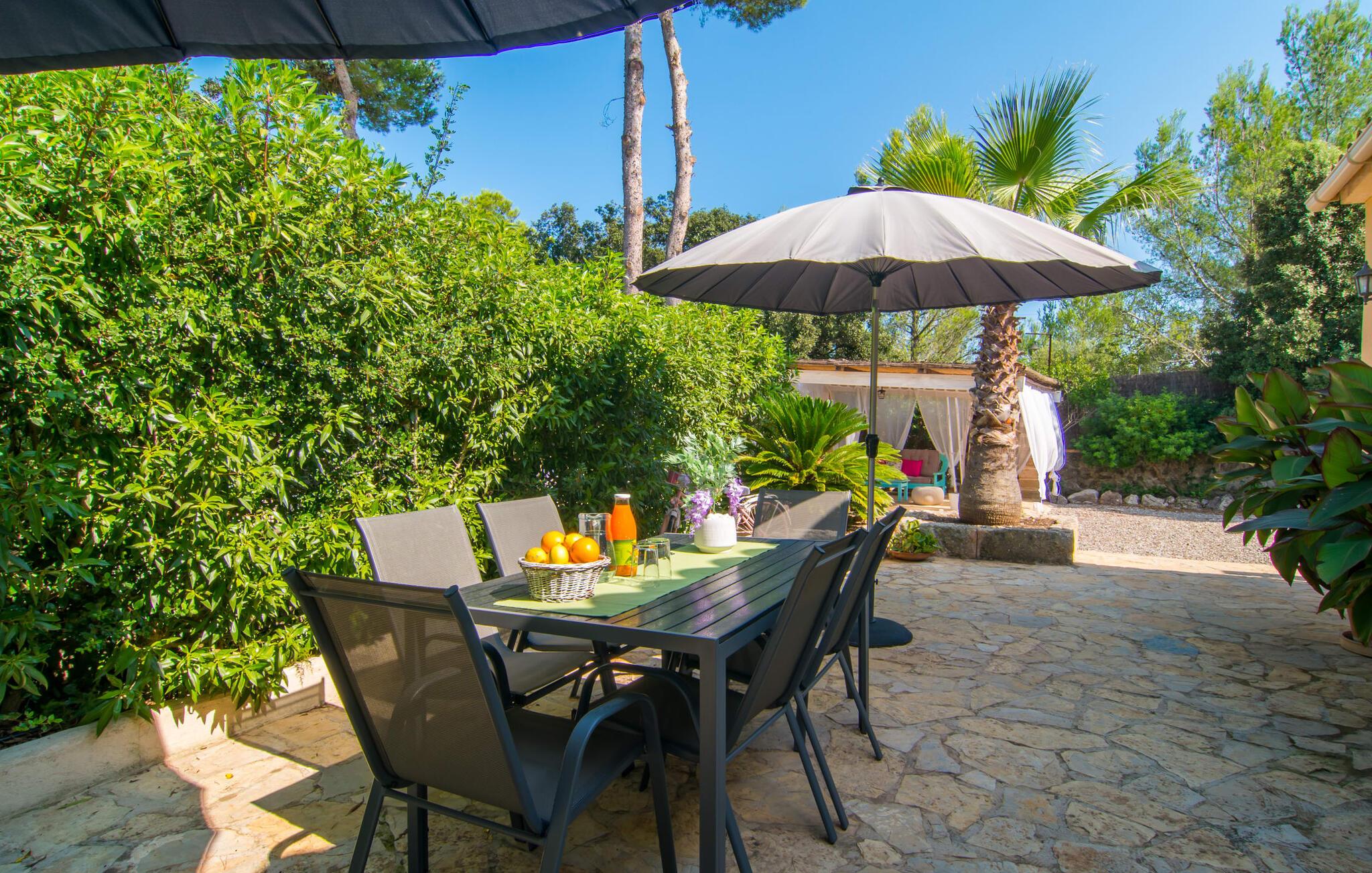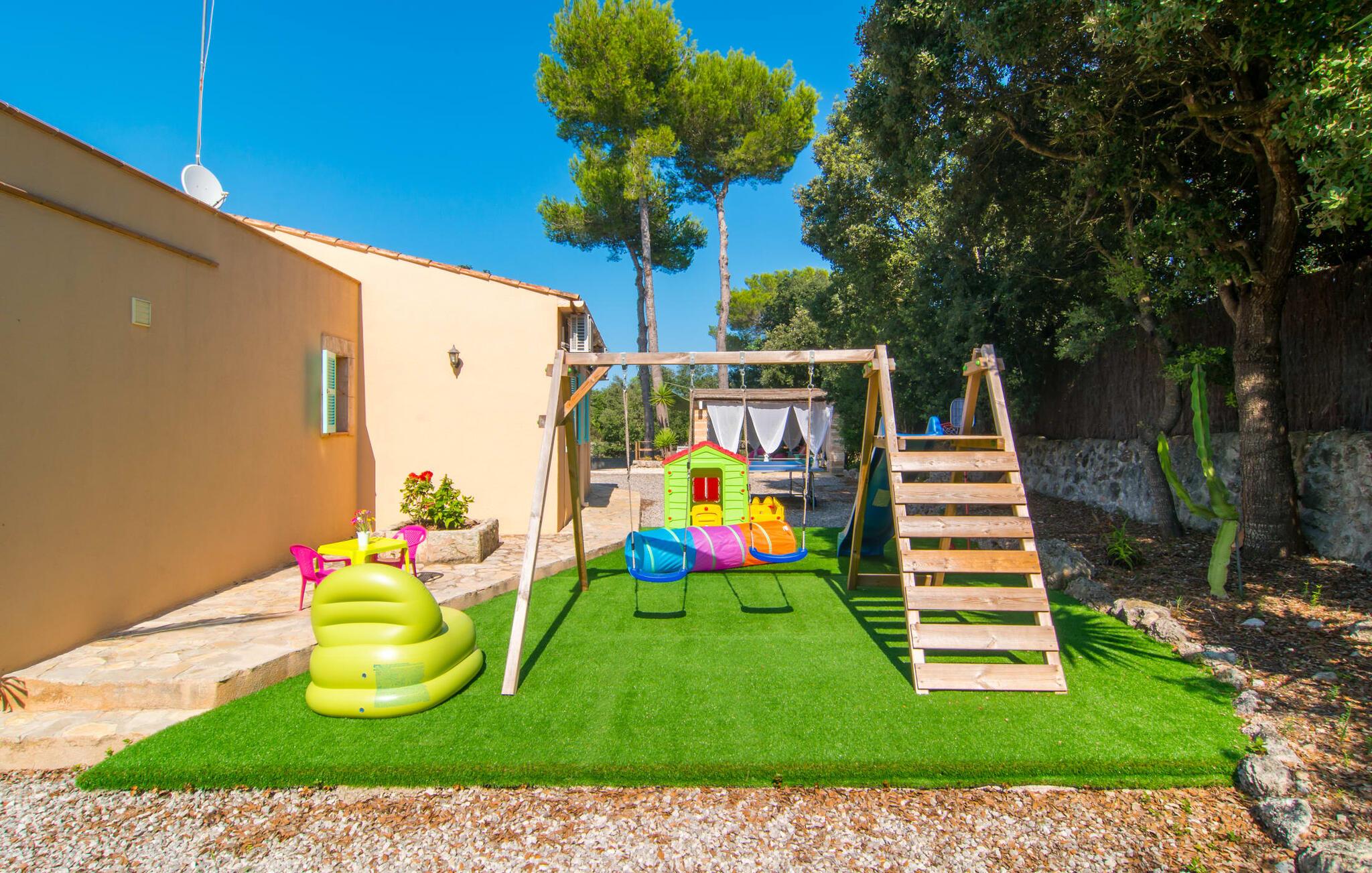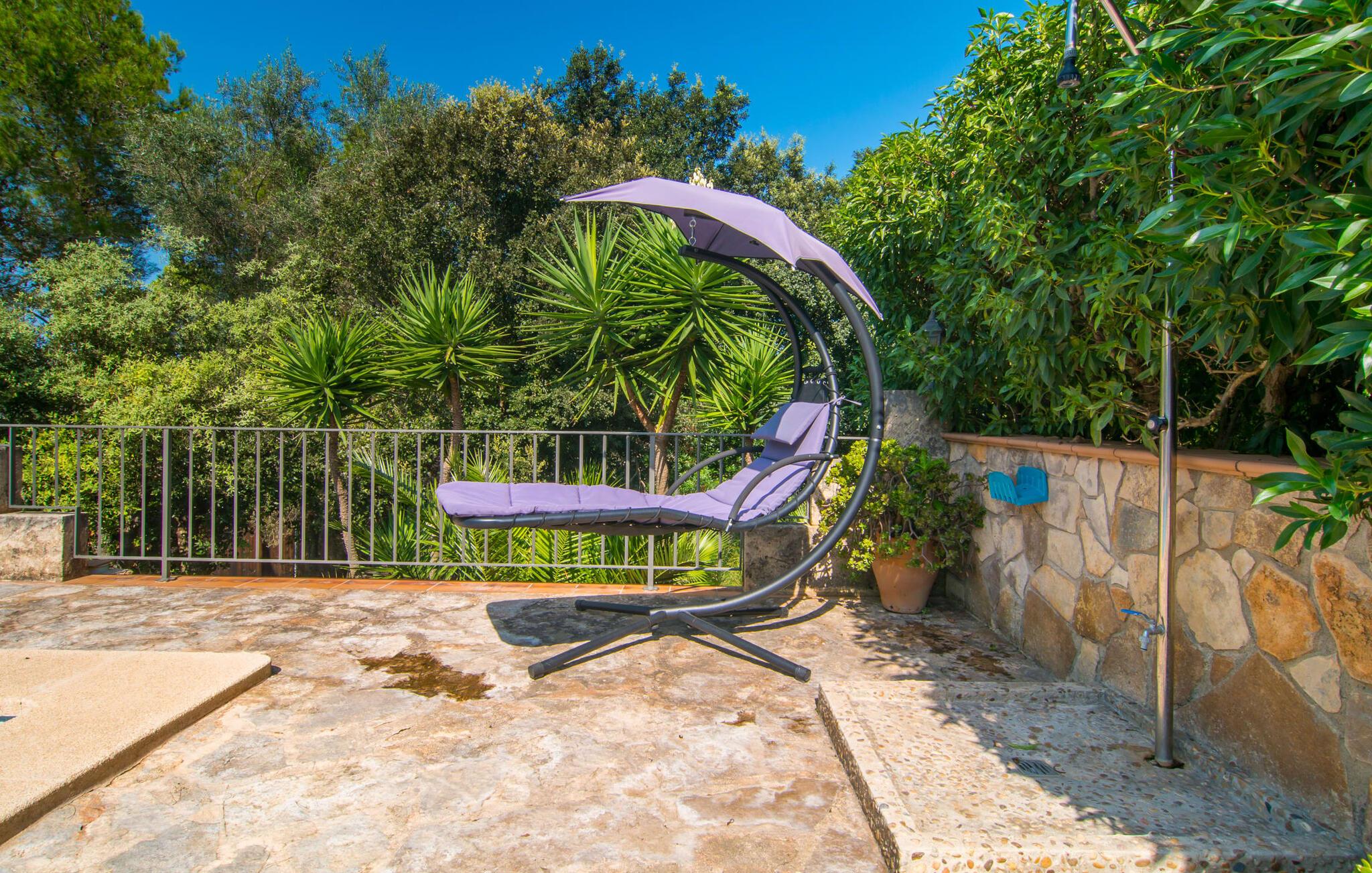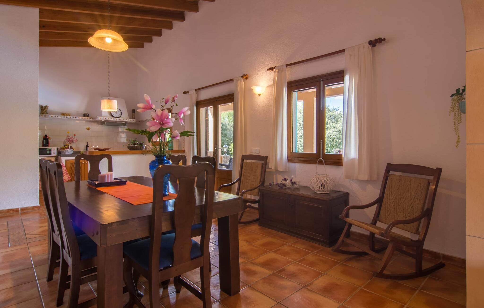 Oplev den fortryllende villa "Sa Creu de s'Auma", et fortryllende tilflugtssted omgivet af eksotiske planter og en klar blå himmel. Denne dejlige ejendom inviterer jer til at slappe af, startende med en grussti, der fører til jeres private poolterrasse. Nyd en afslappet svømmetur eller slentre barfodet ned ad den solbeskinnede bakke forbi en luftig pergola, før I synker ned i en farverig hængekøje eller slapper af på luksuriøse liggestole ved poolen. Den overdækkede terrasse er perfekt til udendørs spisning, og en grill venter på jer med friske markedsdelikatesser. Familier vil sætte pris på det dedikerede legeområde for børn, mens sportsentusiaster kan spille bordtennis. Indvendigt har villaen store vinduespartier, der fylder rummet med øens funklende lys, der fremhæver det lyse interiør. En stenbuegang forbinder det hyggelige opholds- og spiseområde med en pejs og et hyggeligt køkken med moderne faciliteter som en mikrobølgeovn og opvaskemaskine. Med to badeværelser og soveværelser designet til komfort - det ene med to enkeltsenge og det andet med generøse dobbeltsenge - er denne villa en ideel tilflugtssted for familier, par og venner, der tilbyder en rolig atmosfære, der vil få jer til at føle jer hjemme. I udkanten af en landsby, kun otte minutter i bil fra centrum af Artà, inviterer denne smukke villa "Sa Creu de s'Auma" jer til et idyllisk skovklædt naturlandskab, ideelt til samtalevandringer. Talrige attraktive seværdigheder kan nemt nås med bil, især det nærliggende kystområde med sine vidunderlige naturlige sandstrande. Den lille kystby Cala Millor med sit smukke turkise vand ligger kun 15 minutters kørsel væk.