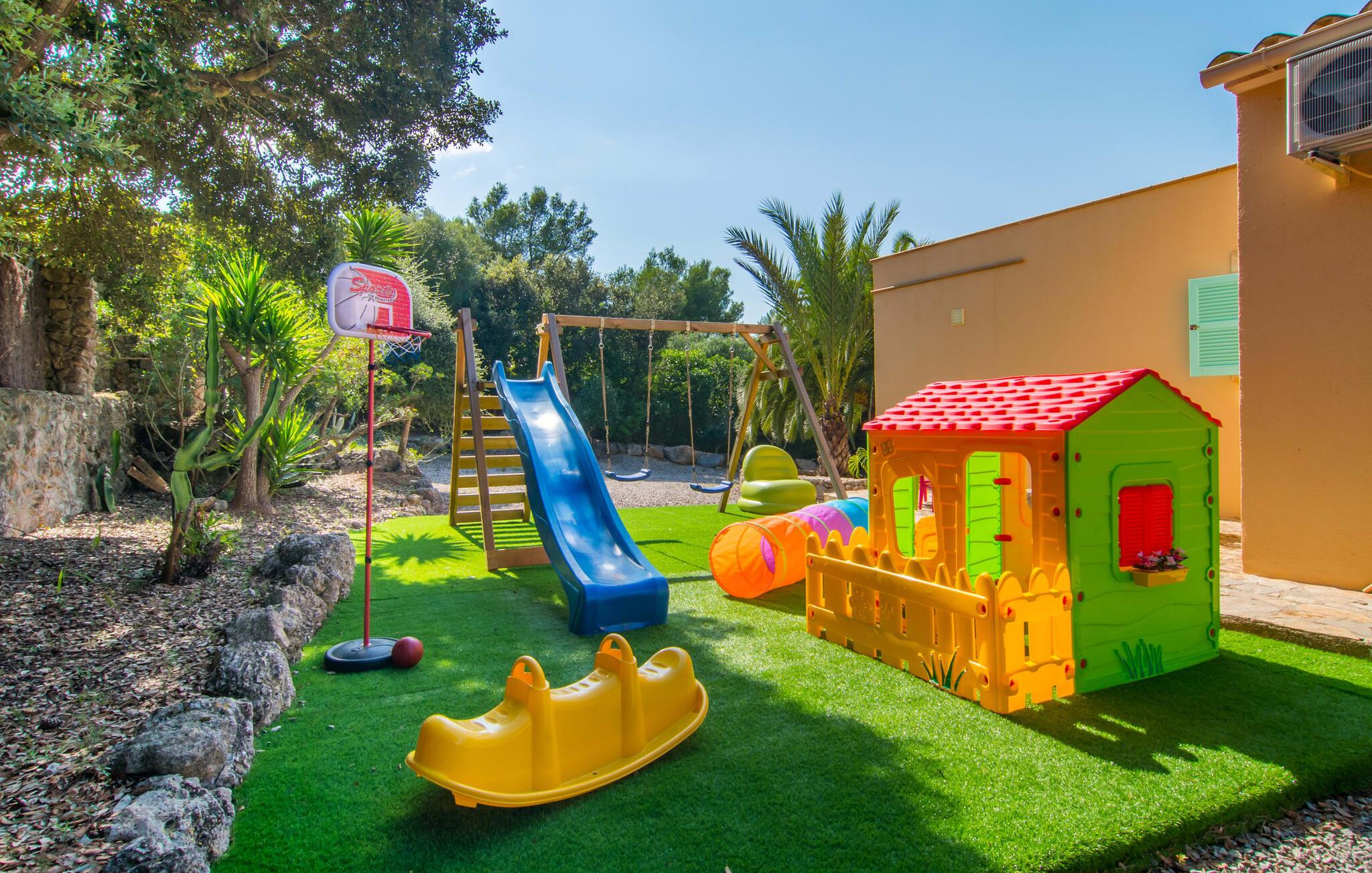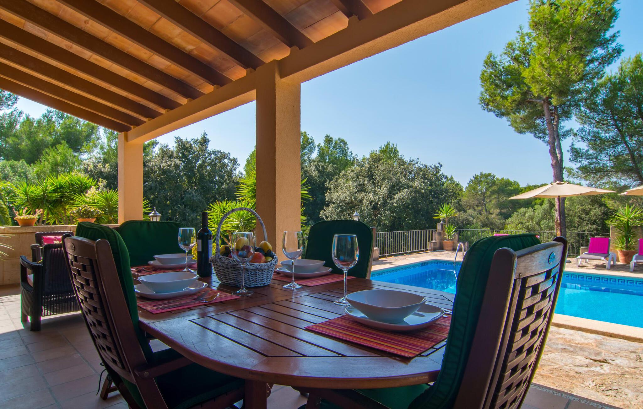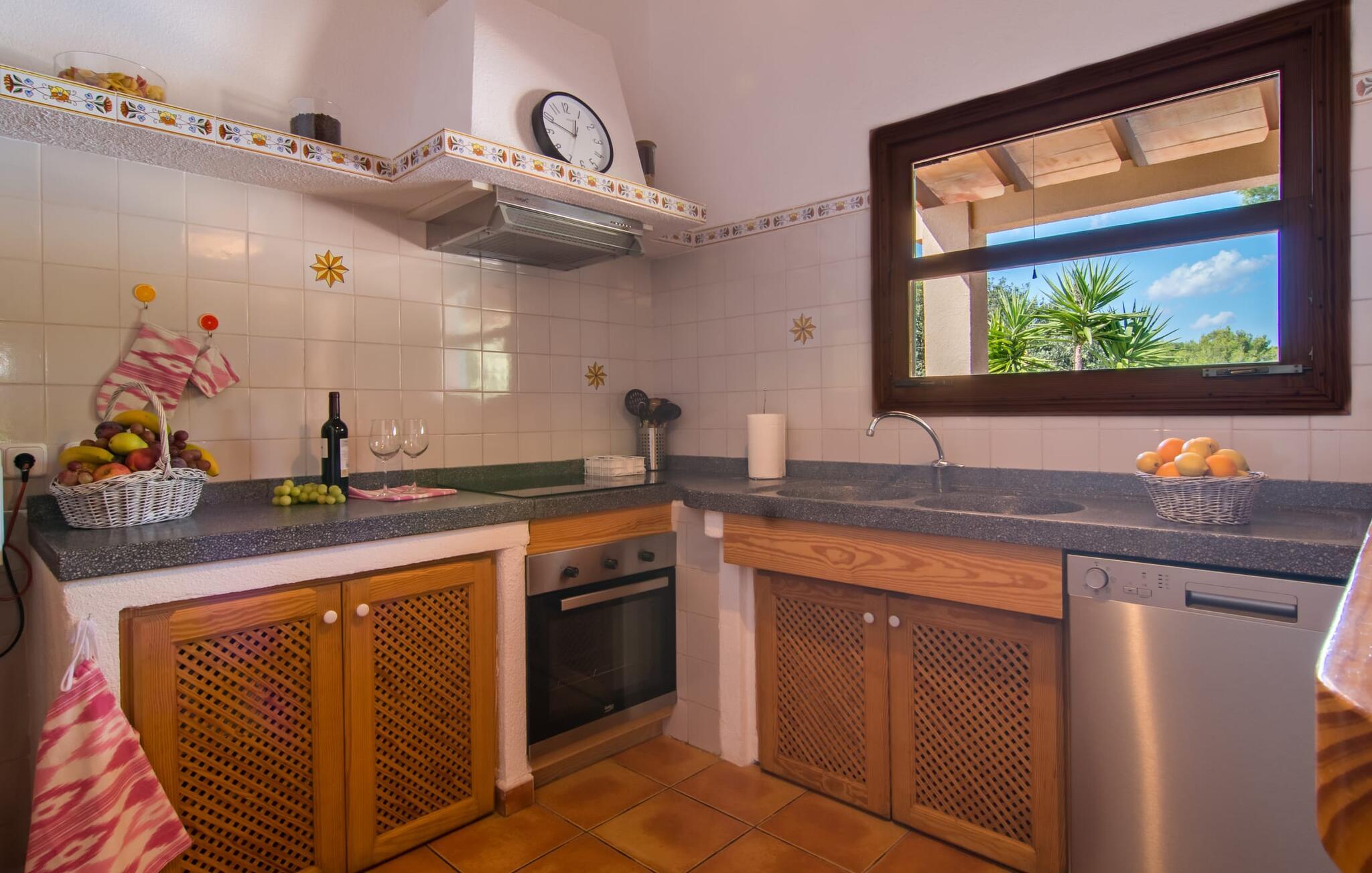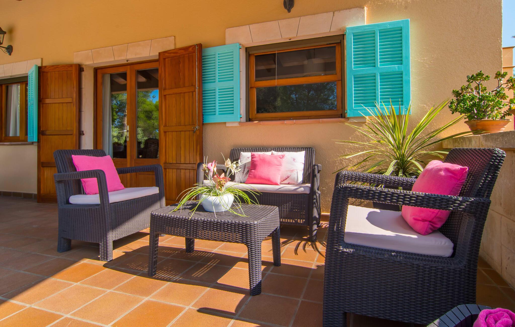 Oplev den fortryllende villa "Sa Creu de s'Auma", et fortryllende tilflugtssted omgivet af eksotiske planter og en klar blå himmel. Denne dejlige ejendom inviterer jer til at slappe af, startende med en grussti, der fører til jeres private poolterrasse. Nyd en afslappet svømmetur eller slentre barfodet ned ad den solbeskinnede bakke forbi en luftig pergola, før I synker ned i en farverig hængekøje eller slapper af på luksuriøse liggestole ved poolen. Den overdækkede terrasse er perfekt til udendørs spisning, og en grill venter på jer med friske markedsdelikatesser. Familier vil sætte pris på det dedikerede legeområde for børn, mens sportsentusiaster kan spille bordtennis. Indvendigt har villaen store vinduespartier, der fylder rummet med øens funklende lys, der fremhæver det lyse interiør. En stenbuegang forbinder det hyggelige opholds- og spiseområde med en pejs og et hyggeligt køkken med moderne faciliteter som en mikrobølgeovn og opvaskemaskine. Med to badeværelser og soveværelser designet til komfort - det ene med to enkeltsenge og det andet med generøse dobbeltsenge - er denne villa en ideel tilflugtssted for familier, par og venner, der tilbyder en rolig atmosfære, der vil få jer til at føle jer hjemme. I udkanten af en landsby, kun otte minutter i bil fra centrum af Artà, inviterer denne smukke villa "Sa Creu de s'Auma" jer til et idyllisk skovklædt naturlandskab, ideelt til samtalevandringer. Talrige attraktive seværdigheder kan nemt nås med bil, især det nærliggende kystområde med sine vidunderlige naturlige sandstrande. Den lille kystby Cala Millor med sit smukke turkise vand ligger kun 15 minutters kørsel væk.