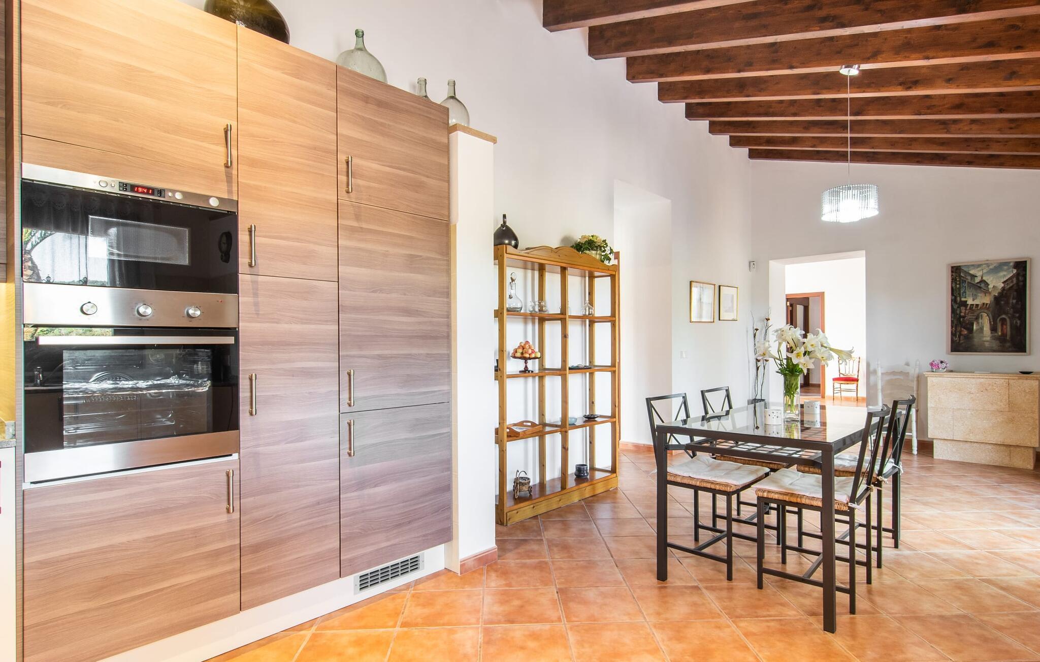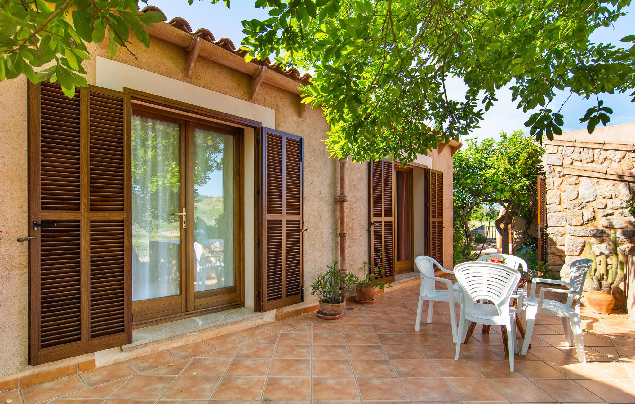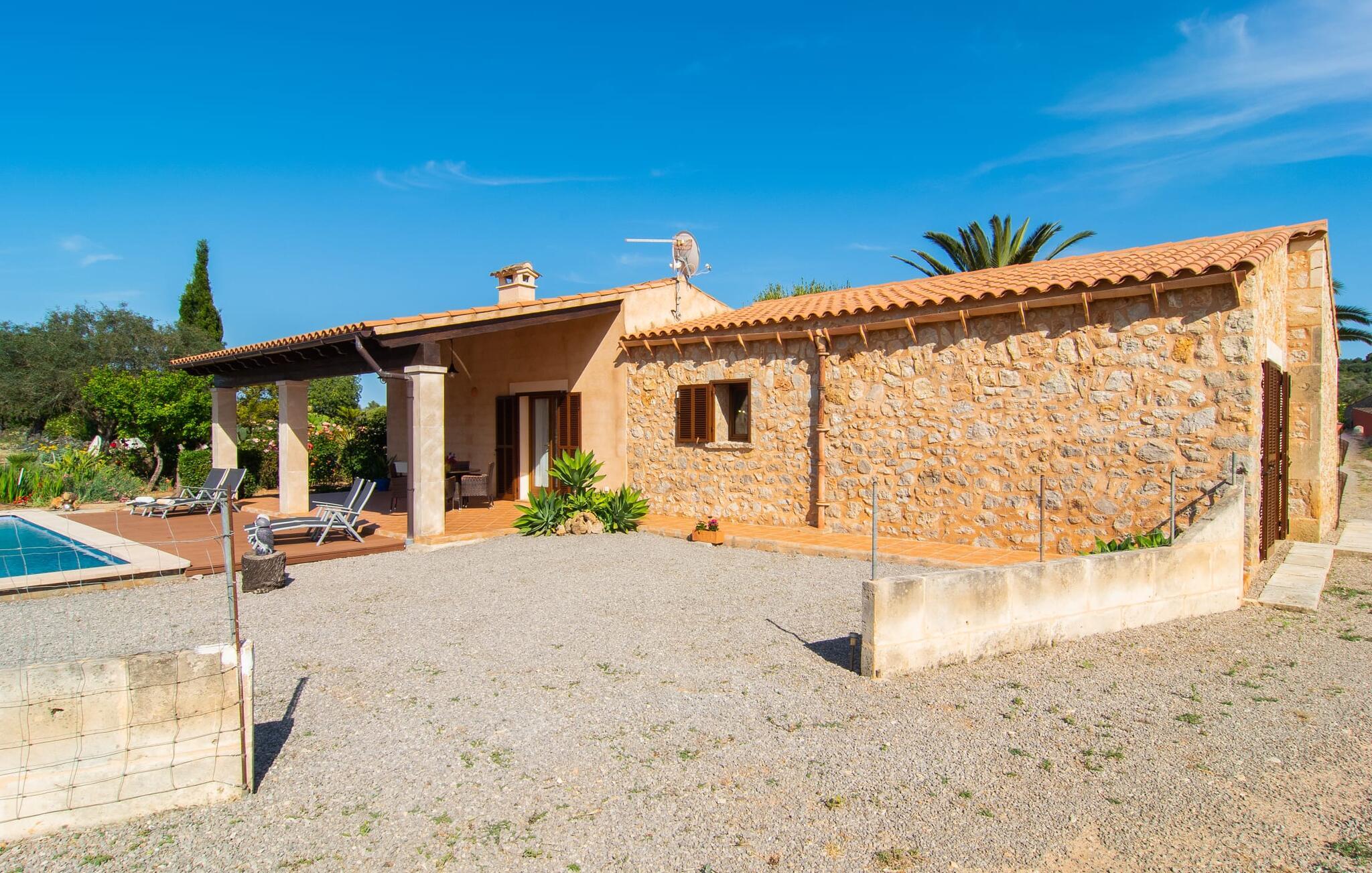 En vidunderlig vidde omgiver enhver nybegynder i villaen "Sa Granja", som ligger i en smuk landlig beliggenhed nær Artà. Den smukke panoramaudsigt, som I kan nyde herfra, vil straks betage jer - og humøret vil svæve i det omkringliggende åbne rum. Faktisk er dette et perfekt sted at bare slappe af, fordi her er absolut fred og ro. I umiddelbar nærhed af ejendommen er der kun den lille, lidt brugte vej, der fører til villaen. Et indbydende aspekt ved udearealet er de smukke terrassearealer foran og bag huset, hvor I kan bruge jeres tid på mange forskellige måder. Der er et smukt bord med polyrattan møbler på den overdækkede veranda til en behagelig siddeoplevelse eller til at spise. Her kan I sidde om morgenen og nyde den blå himmel med en styrkende morgenmad eller en aromatisk kop kaffe. Skøn afslapning er mulig på en af de tre liggestole i poolen, som er tilgængelige for alle soltilbedere blandt jer. En parasol er også tilgængelig, hvis det kræves. Poolen er let tilgængelig via trapper og giver en behagelig forfriskning på varme dage. Der er en rig frugt- og grøntsagshave vedligeholdt af ejerne og åben for gæster. Den landlige villa, bygget i middelhavsstil, byder sine gæster velkommen i en munter og elegant atmosfære. Store rum med den helt rigtige mængde møbler skaber en følelse af luftighed og rummelighed. Det dekorative træbjælkeloft harmonerer vidunderligt med de hvide vægge og terracotta gulvfliser. En stor, åben stue/spisestue med tilstødende køkken tilbyder jer adskillige måder at bruge jeres tid på. Mens I kan slappe af af hjertens lyst på den komfortable lænestol eller sofa, giver det storslåede spisebord jer også mulighed for at spise sammen indendørs, som I ønsker det. Det tilstødende køkken er udstyret med alle førsteklasses faciliteter til hverdagens behov, herunder en filterkaffemaskine. En generøs arbejdsflade og masser af opbevaringsplads gør det nemmere at tilberede mad til flere personer på samme tid. Stilfuldt indrettede værelser tilbyder et ideelt grundlag for en afslappende søvn på ferien. Det hjælper de eksisterende senge med, hvoraf to er 0,90 x 2,00 m og en på 1,70 x 2,10 m. Det sidste soveværelse er også udstyret med en-suite badeværelse. Villaen "Sa Granja" ligger i et roligt, men alligevel godt forbundet beliggenhed. Det skønne feriehus ligger knap 3 km syd for den attraktive by Artà og er omgivet af en grund på knap 18.000 m². Cala Ratjada med sin smukke strand og havnepromenade ligger kun 20 minutter væk i bil.