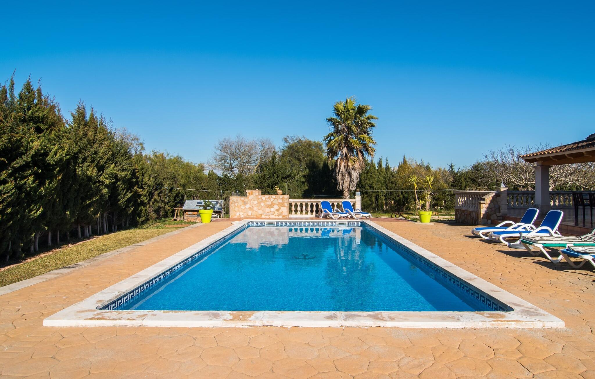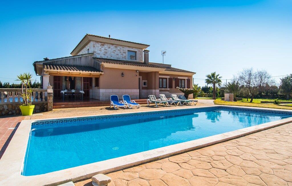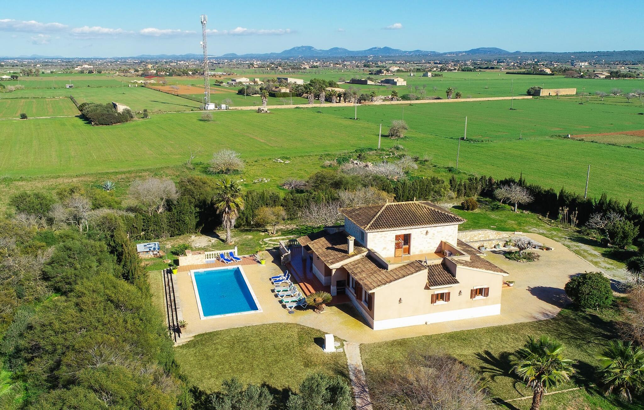Komfortabelt, rummeligt og omgivet af smukt middelhavslandskab: det lyder som et fabelagtigt feriehus, ikke? Især hvis I værdsætter en rolig, landlig beliggenhed med masser af privatliv. Villaen "Sa Gravera de Sa Barrala" ligger på en rummelig ejendom med en smukt anlagt have på den sydlige del af øen. Familier med børn vil føle sig særligt godt tilpas her: Plænerne giver plads til at lege, og poolen ved huset inviterer jer til at plaske rundt og svømme. Forældre kan holde øje med deres små fra den overdækkede terrasse. Eller fra en af liggestolene, der er sat op omkring det kølige vand. Motion gør jer sulten: Grillen hjælper jer med at tilberede alle slags lækkerier, som I kan nyde ved spisebordet med udsigt til haven og poolen. Der er også et opholdsområde på en anden overdækket terrasse foran huset, ideel til en kop kaffe på ethvert tidspunkt af dagen. Hvis I vil slikke solen, kan I tage til tagterrassen ovenpå. Villaens indre er lyst og venligt. Hvide og enkelte solgule vægge sikrer sammen med mange små loftslamper og store vinduer en sommerlig lethed, der gennemsyrer hele huset. Møbleringen er en blanding af praktiske, moderne og traditionelt-rustikke elementer, så I straks vil føle jer hjemme. I stueetagen er der det rummelige indgangsparti og stuen med en kæmpe sofa og glasbord: perfekt til hyggelige tv-aftener med lækre snacks! Alternativt kan I sætte jer til et måltid sammen ved træspisebordet ved siden af, som giver god plads til de retter, der tilberedes i køkkenet. Så snart I er mæt og træt, kan I blot trække jer tilbage til et af de tre dobbeltværelser i stueetagen eller til det andet dobbeltværelse på øverste etage. Alle værelser har kunstfærdigt designede enkelt- eller dobbeltsenge i træ. Boligkomforten afrundes af tre moderne badeværelser, to af dem i stueetagen og et en-suite badeværelse på første sal. I kan udforske området omkring jeres hus til fods eller på cykel: det typiske landskab i det sydlige Mallorca er overvejende landbrugsmæssigt og udstråler en særlig fred og sindsro. Dette afspejles også i de omkringliggende byer. Campos, som kun ligger 9,3 km væk og kan nås med lejebil via vejen, som kan høres afhængigt af vindretningen, er et godt eksempel på denne regions afslappede livsstil. Området omkring byen er hovedsageligt fokuseret på husdyrbrug, kapersdyrkning og osteproduktion. Gå ikke glip af lokale delikatesser i de fremragende restauranter, tapasbarer og caféer. Romantiske gyder, stenhuse, kirker – der er ikke meget andet at se i Campos, men hvis I lader jer indhylle i atmosfæren væk fra turistmasserne, lader stedet intet tilbage at ønske. For en dag på stranden skal I blot køre 4 km til sandstranden Ses Covetes eller bugten Es Freu de Ses Covetes - begge er beliggende i et smukt klitlandskab. Et rummeligt feriehus på en rummelig grund, med egen pool lige foran døren, omgivet af et typisk middelhavslandskab: Dette er villaen "Sa Gravera de Sa Barrala", beliggende nær Ses Covetes. De overdækkede terrassearealer foran og bag huset byder på masser af plads til at sidde, hygge og slappe af - og på øverste etage giver en tagterrasse en fantastisk udsigt over det omkringliggende område. Strandene i Ses Covetes, kun 4 km væk, kan nemt nås med udlejningsbil.