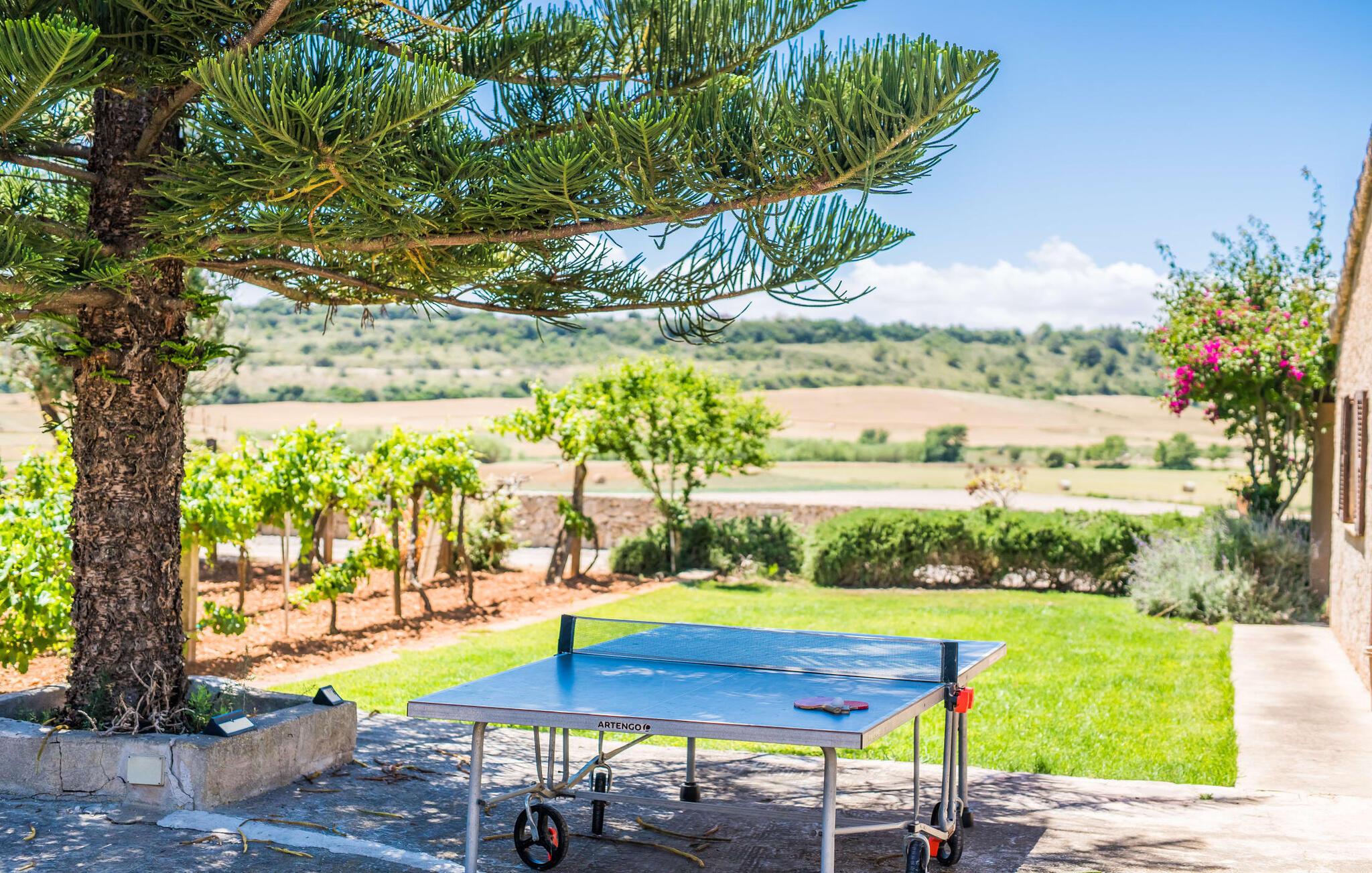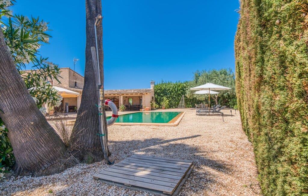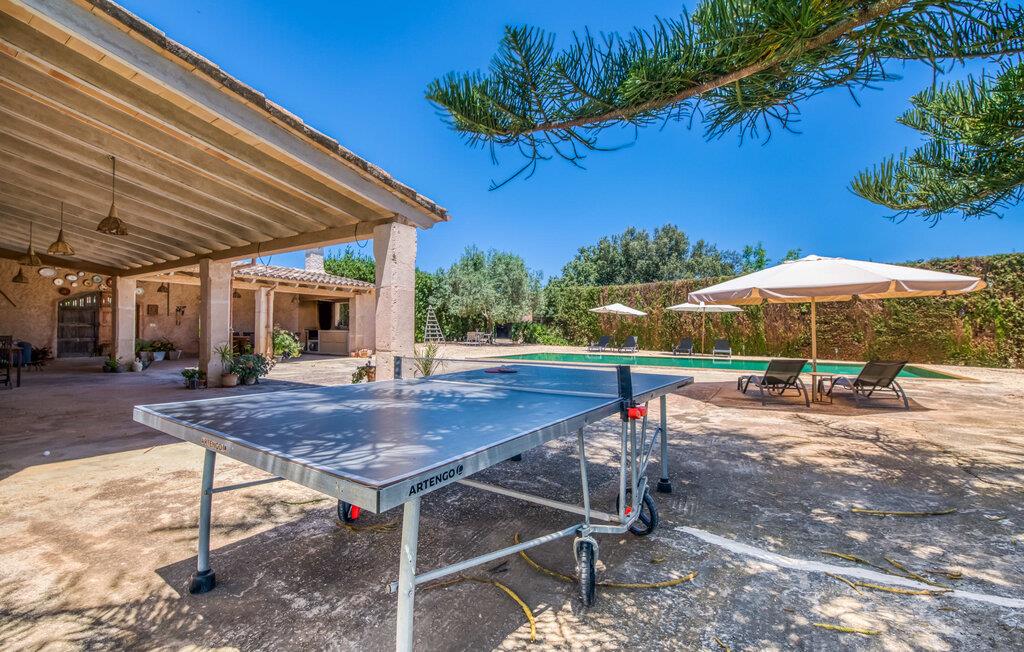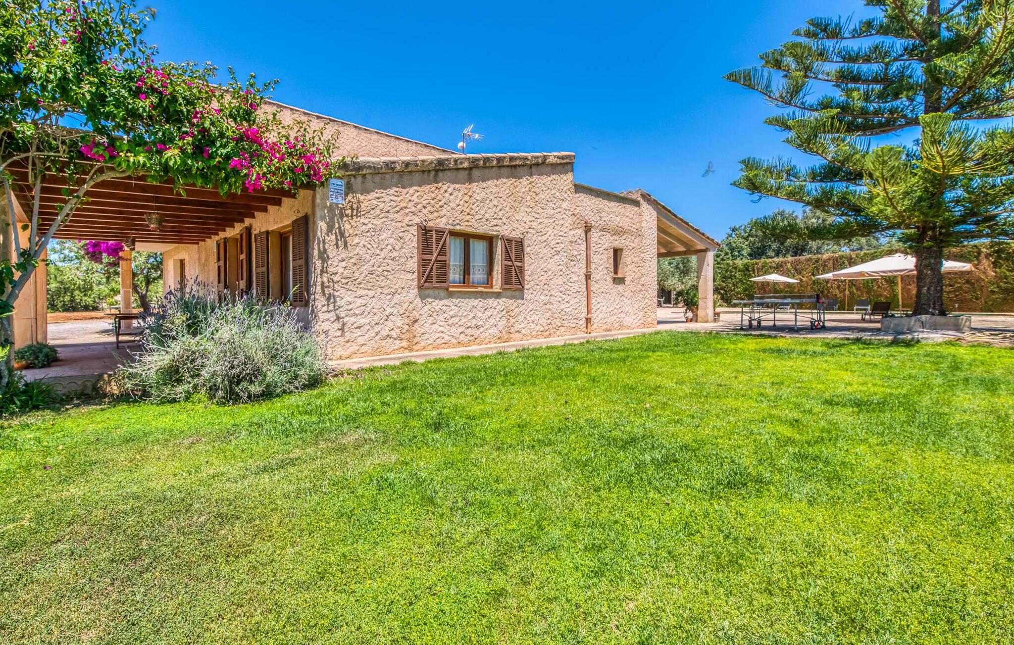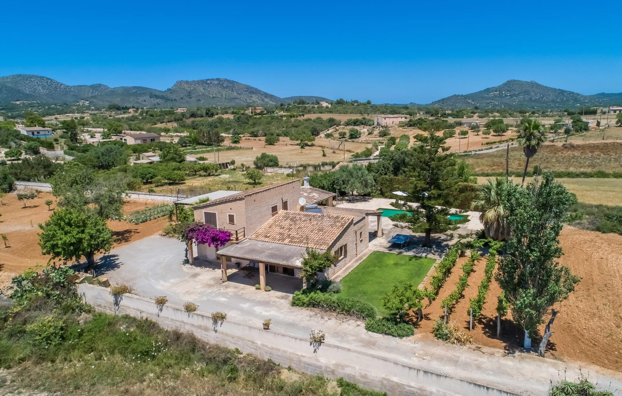 Villa "Sa Grua" er en charmerende mallorcansk ejendom i den østlige del af Mallorca, nær Sant Llorenc. Beliggende på en rummelig grund på 14.100 m² dekoreret med palmer og hække, tilbyder det en betagende udsigt over det blidt bølgende landskab. Udendørsområdet har en delvis overdækket terrasse, der omgiver en pool, suppleret med en grusseng, liggestole og en stilfuld hængekøje til afslapning. En overdækket terrasse fungerer som en udendørs spiseplads, ideel til grillmad. Smagfuld indretning tilbyder gæsterne et indbydende rum med udsigt over poolområdet og haven. Indvendigt strækker villaen sig over 160 m² og er præget af lyse farver og træaccenter, der skaber en hyggelig atmosfære. Opholds- og spiseområdet i åbent plan omfatter et solidt spisebord og et fuldt udstyret køkken samt moderne faciliteter som vaskemaskine, opvaskemaskine, tørretumbler og aircondition. Villaen har tre velindrettede dobbeltværelser og fire badeværelser, alle med naturligt lys og moderne indretning. Forskellige hyggelige siddeområder sikrer privatliv og komfort, hvilket gør det til et ideelt tilflugtssted for gæster. Den venlige villa "Sa Grua" er beliggende nær det naturlige kystsamfund Sant Llorenc på den østlige del af øen. Flere smukke strande ligger kun få minutters kørsel fra villaen. Det nærliggende Sant Llorenc byder på en bred vifte af shopping- og spisemuligheder. Op til fire golfbaner (Son Servera, Capdepera, Sera Pula, Canyamel) er let tilgængelige med lejebil.