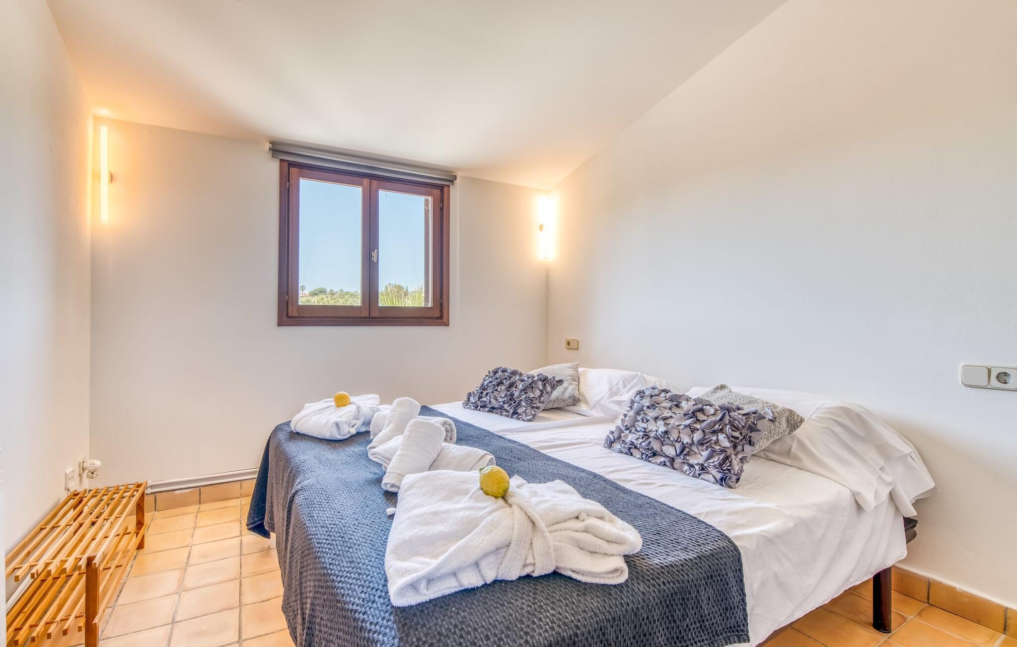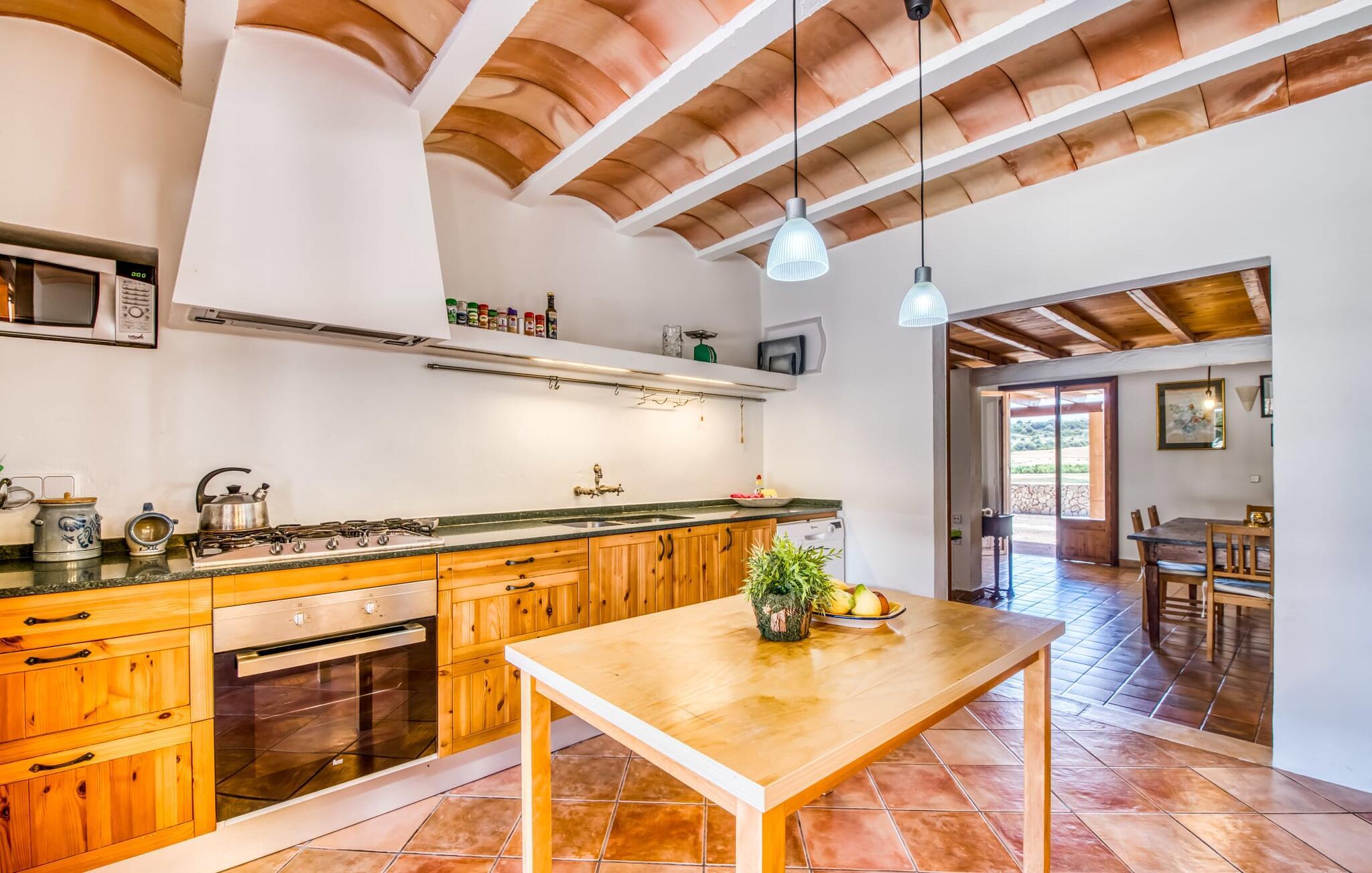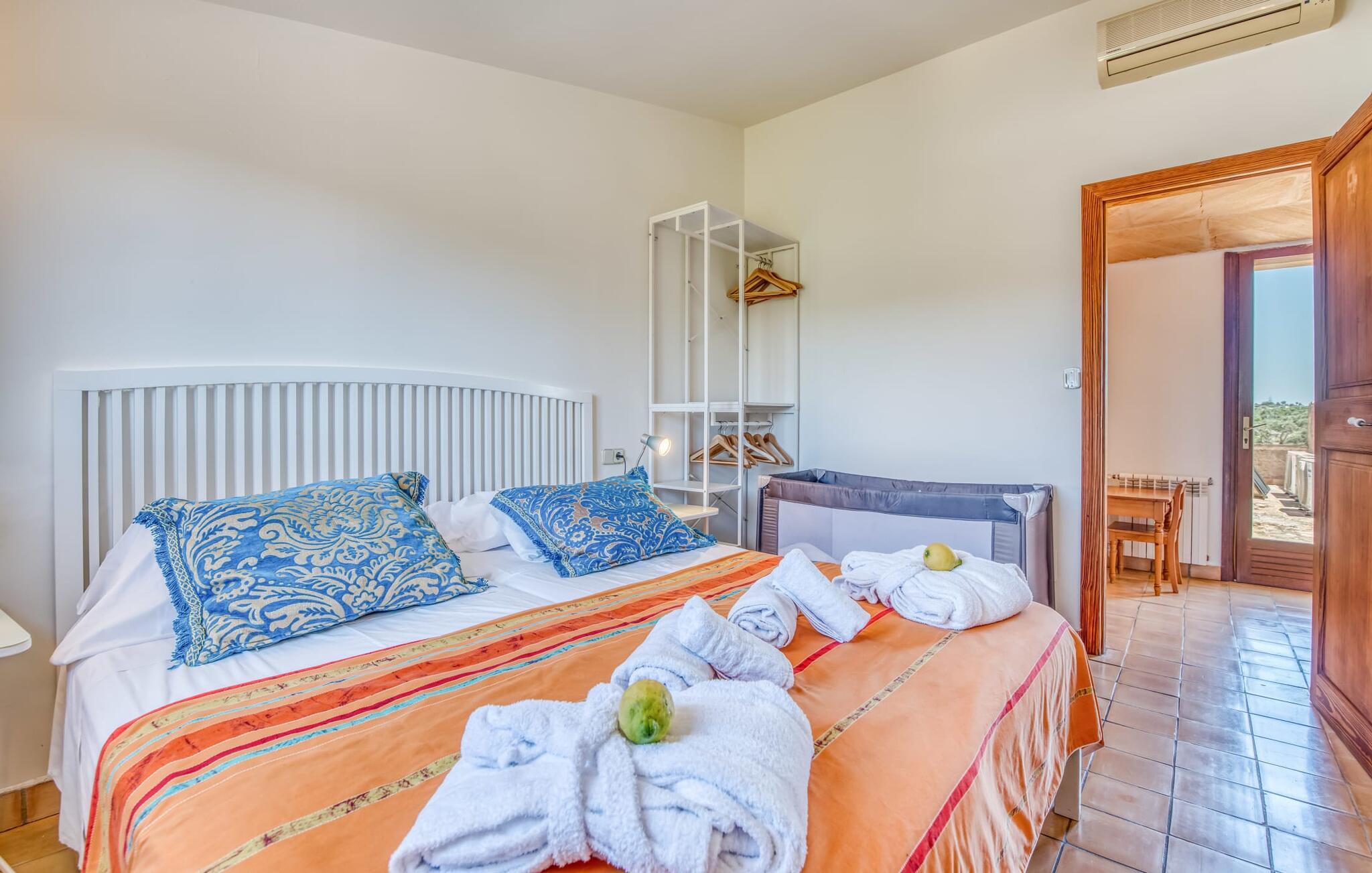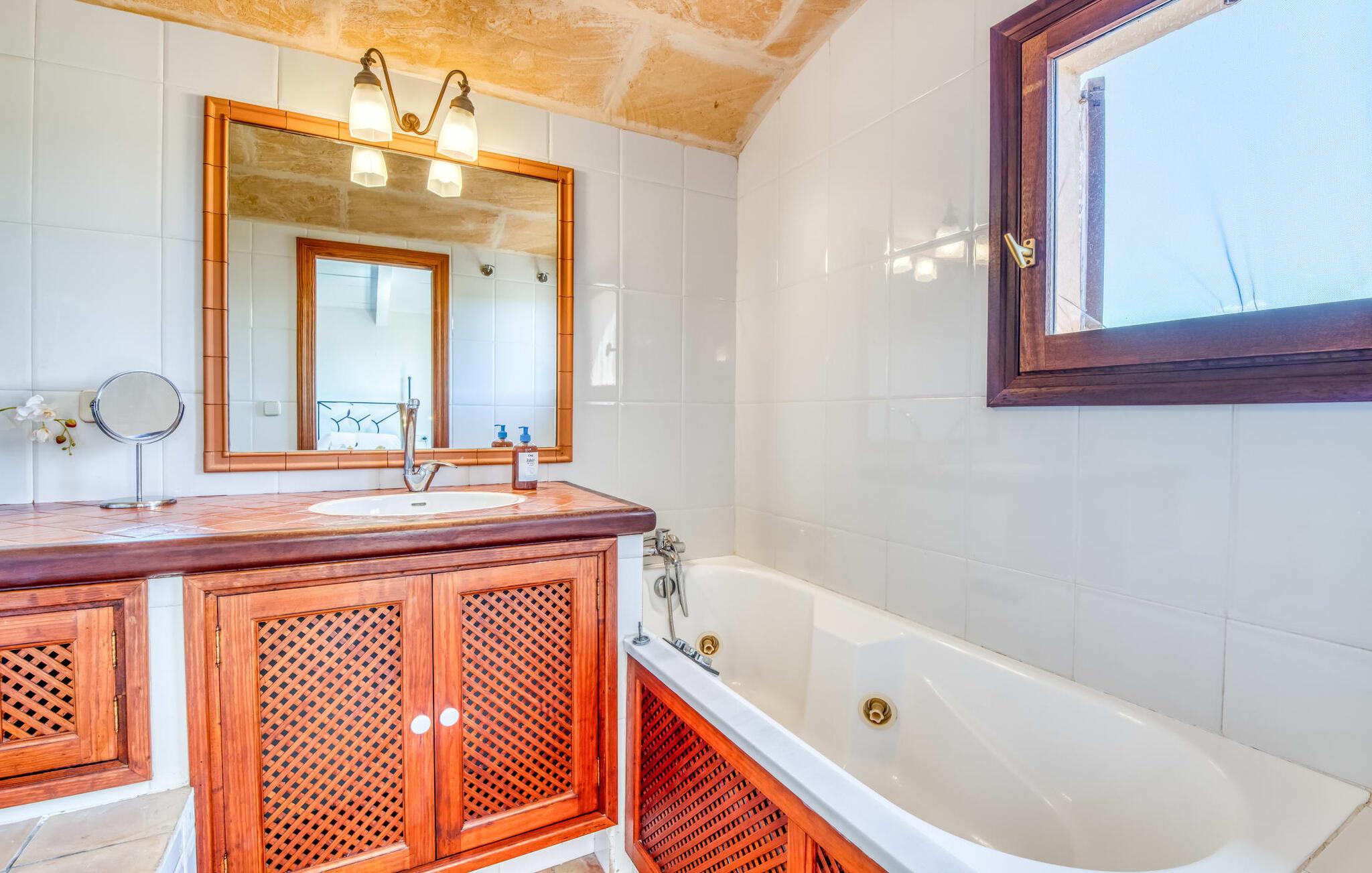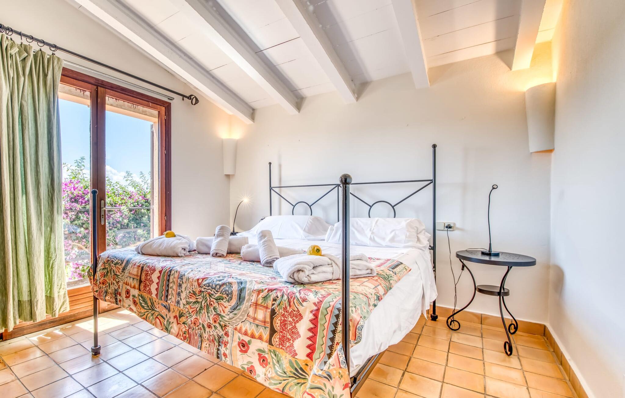 Villa "Sa Grua" er en charmerende mallorcansk ejendom i den østlige del af Mallorca, nær Sant Llorenc. Beliggende på en rummelig grund på 14.100 m² dekoreret med palmer og hække, tilbyder det en betagende udsigt over det blidt bølgende landskab. Udendørsområdet har en delvis overdækket terrasse, der omgiver en pool, suppleret med en grusseng, liggestole og en stilfuld hængekøje til afslapning. En overdækket terrasse fungerer som en udendørs spiseplads, ideel til grillmad. Smagfuld indretning tilbyder gæsterne et indbydende rum med udsigt over poolområdet og haven. Indvendigt strækker villaen sig over 160 m² og er præget af lyse farver og træaccenter, der skaber en hyggelig atmosfære. Opholds- og spiseområdet i åbent plan omfatter et solidt spisebord og et fuldt udstyret køkken samt moderne faciliteter som vaskemaskine, opvaskemaskine, tørretumbler og aircondition. Villaen har tre velindrettede dobbeltværelser og fire badeværelser, alle med naturligt lys og moderne indretning. Forskellige hyggelige siddeområder sikrer privatliv og komfort, hvilket gør det til et ideelt tilflugtssted for gæster. Den venlige villa "Sa Grua" er beliggende nær det naturlige kystsamfund Sant Llorenc på den østlige del af øen. Flere smukke strande ligger kun få minutters kørsel fra villaen. Det nærliggende Sant Llorenc byder på en bred vifte af shopping- og spisemuligheder. Op til fire golfbaner (Son Servera, Capdepera, Sera Pula, Canyamel) er let tilgængelige med lejebil.