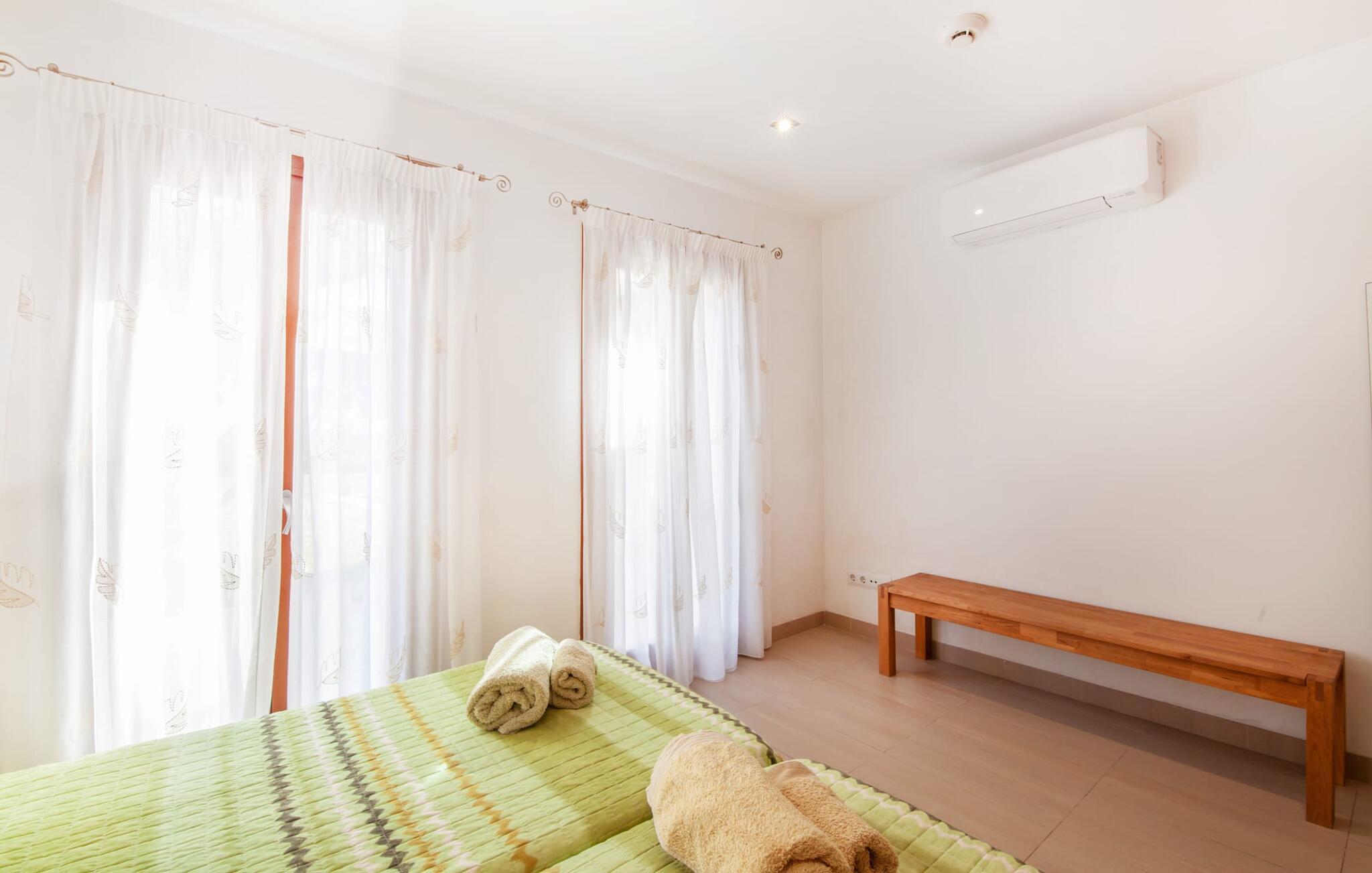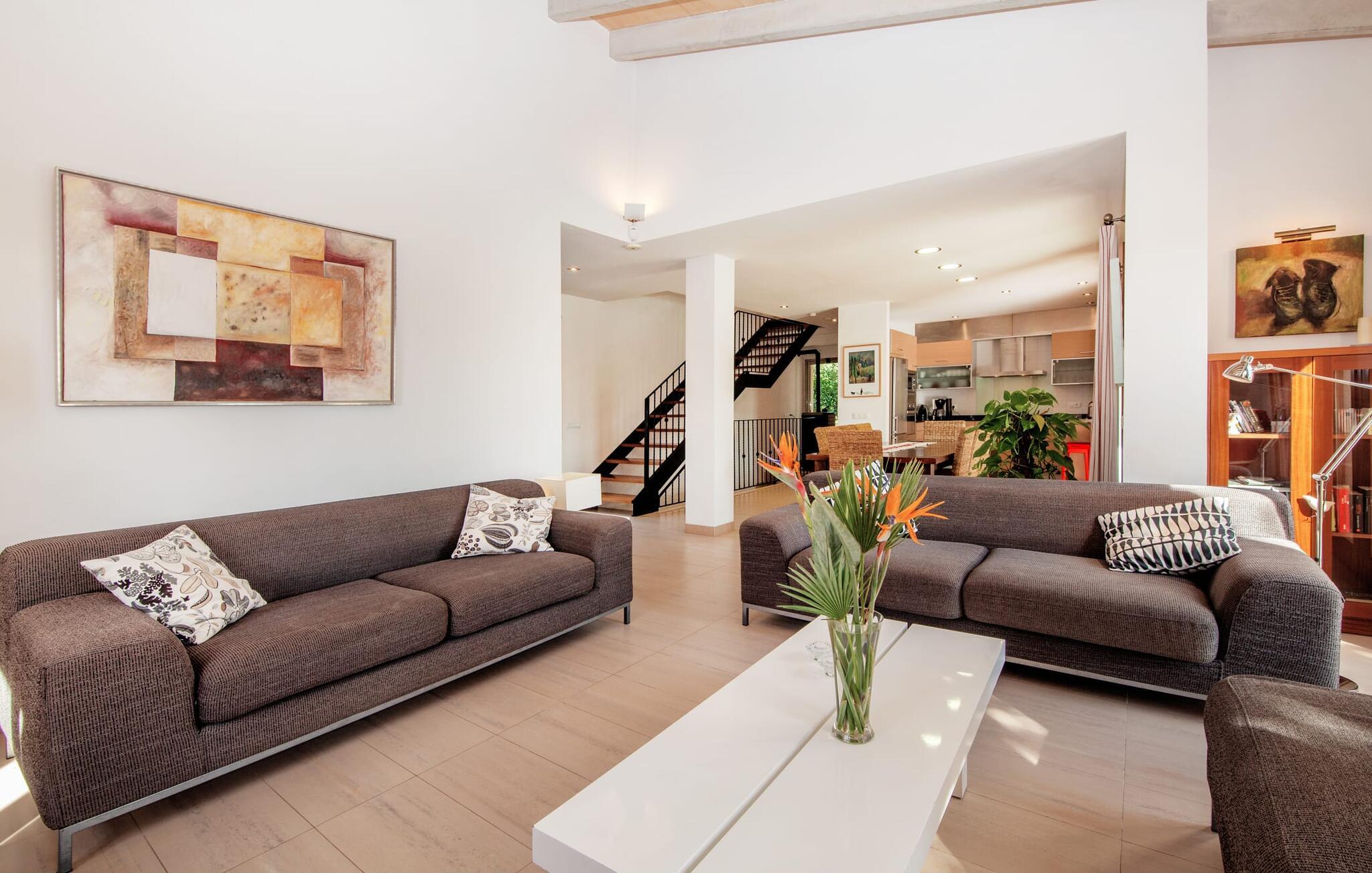 Dette smukke feriehus på Mallorca er omgivet af vidunderligt frodige træer og udsigten fra forsiden af det omkringliggende landskab kunne næsten ikke være mere fortryllende. I får straks lyst til at slå lejr ved siden af det høje palmetræ og nyde en bog og jeres yndlingsdrink på en af de komfortable liggestole. Fortsætte! Der er masser af plads på græsplænen til lange timers afslapning, og de børn, der er kommet med, vil helt sikkert nyde pladsen til at løbe rundt! På varme dage er der naturligvis ingen stop for en forfriskning, den lange pool inviterer jer til at tage et par omgange eller plaske rundt. Poolen er meget nem at nå via en hjørnetrappe og skråner derefter behageligt ned. Svømning med udsigt over bjergene! De stilfuldt indrettede, åbne eller overdækkede terrasseområder inviterer til afslapning lige ved siden af huset. Her er afstandene til køkken mm korte uden at gå på kompromis med udsigten til landskabet. Husets indretning er også indbydende: megen harmoni i form af absolut harmonisk arrangerede former, materialer og farver samt mange lyse, gulv-til-loft vinduer skaber en atmosfære af ren komfort. Komfortable polstrede møbler inviterer jer til at fejre afslapning indendørs med en smuk udsigt udenfor. Om pejsen eller fjernsynet (eller begge dele) giver komfort på en kølig aften er helt op til jer. Måske er det en god snak og et lækkert glas rødvin, der gør samværet endnu sjovere? Herfra er der glidende overgang til spisepladsen og det tilstødende, fuldt udstyrede køkken, hvor alt er til rådighed til selvforplejning. På denne nederste etage er der også et soveværelse med dobbeltseng og et badeværelse. På øverste etage er der yderligere tre soveværelser og to badeværelser, hvoraf det ene er en suite. Soveværelserne scorer også point med gulv til loft vinduer og en vidunderlig udsigt. Nu burde det stå klart: Hvis I værdsætter stil og komfort og ønsker at nyde den smukkeste landskabsudsigt på jeres ferie, er denne finca på Mallorca det rigtige sted for jer! Et drømmehus på Mallorca med en bekvem beliggenhed til attraktive udflugtsmål og stranden? Her er det! Herfra kan I nemt rejse i forskellige retninger og samtidig føle jer hjemme i den meget smagfuldt indrettede finca og nyde den smukke have. Der er godt 5 km til byen for shopping. Alcúdia-bugten med dens 16 km lange kæde af strande ligger også kun en kort køretur væk og byder på et varieret program.