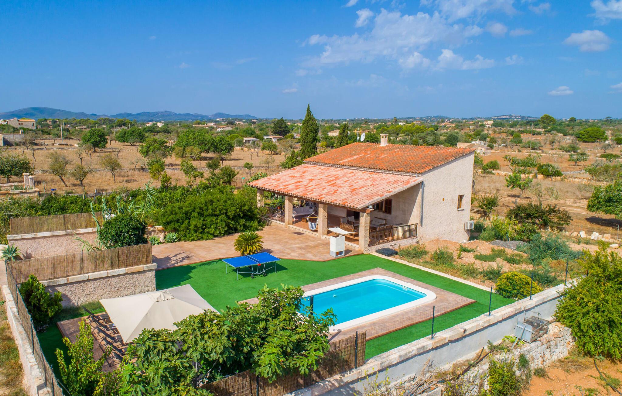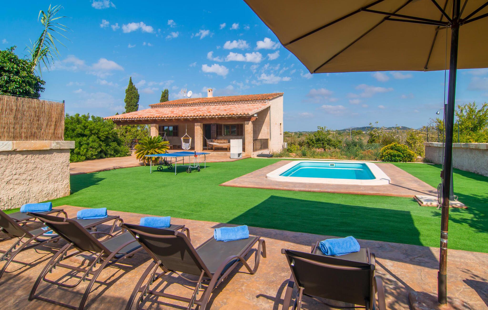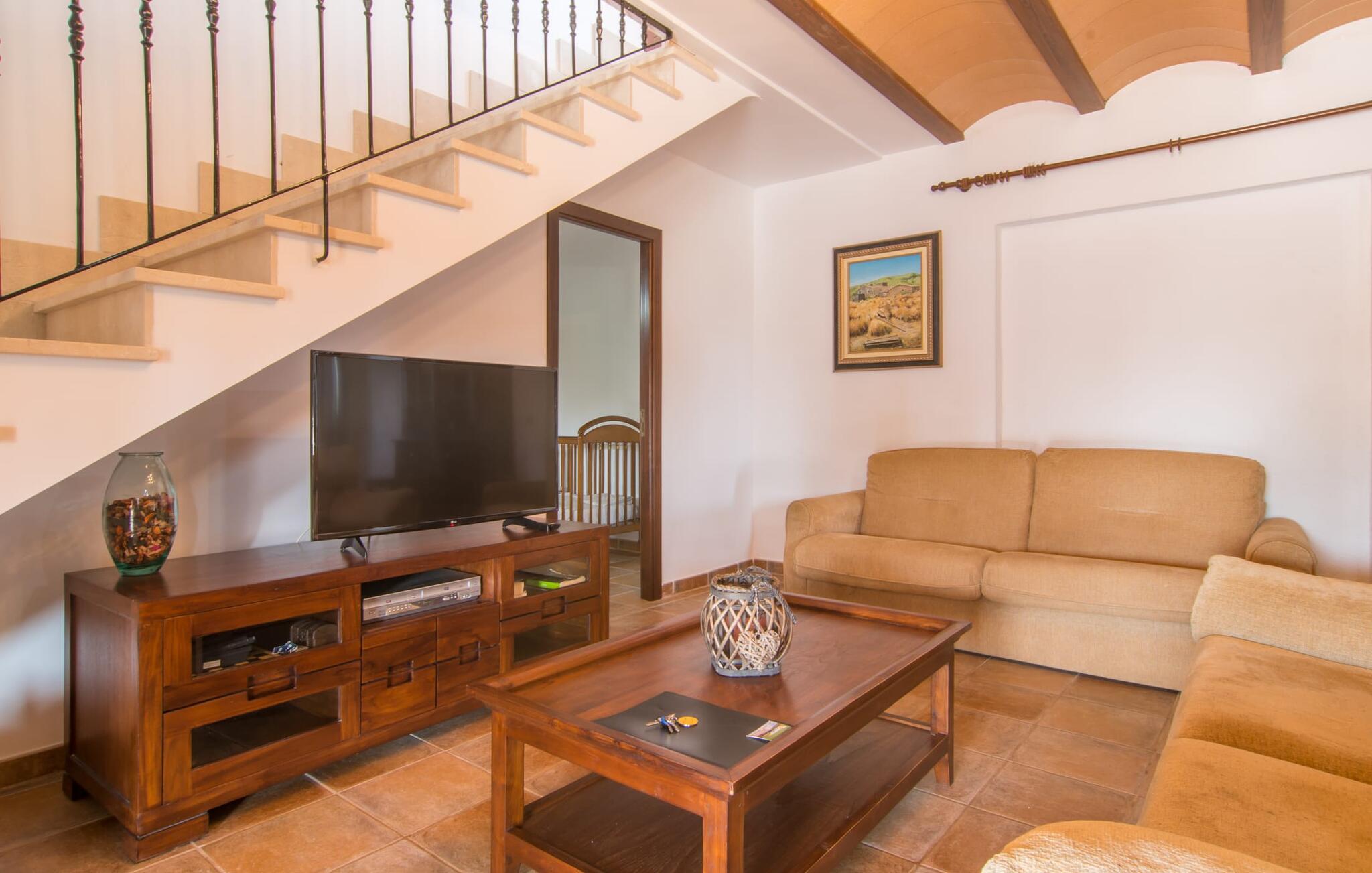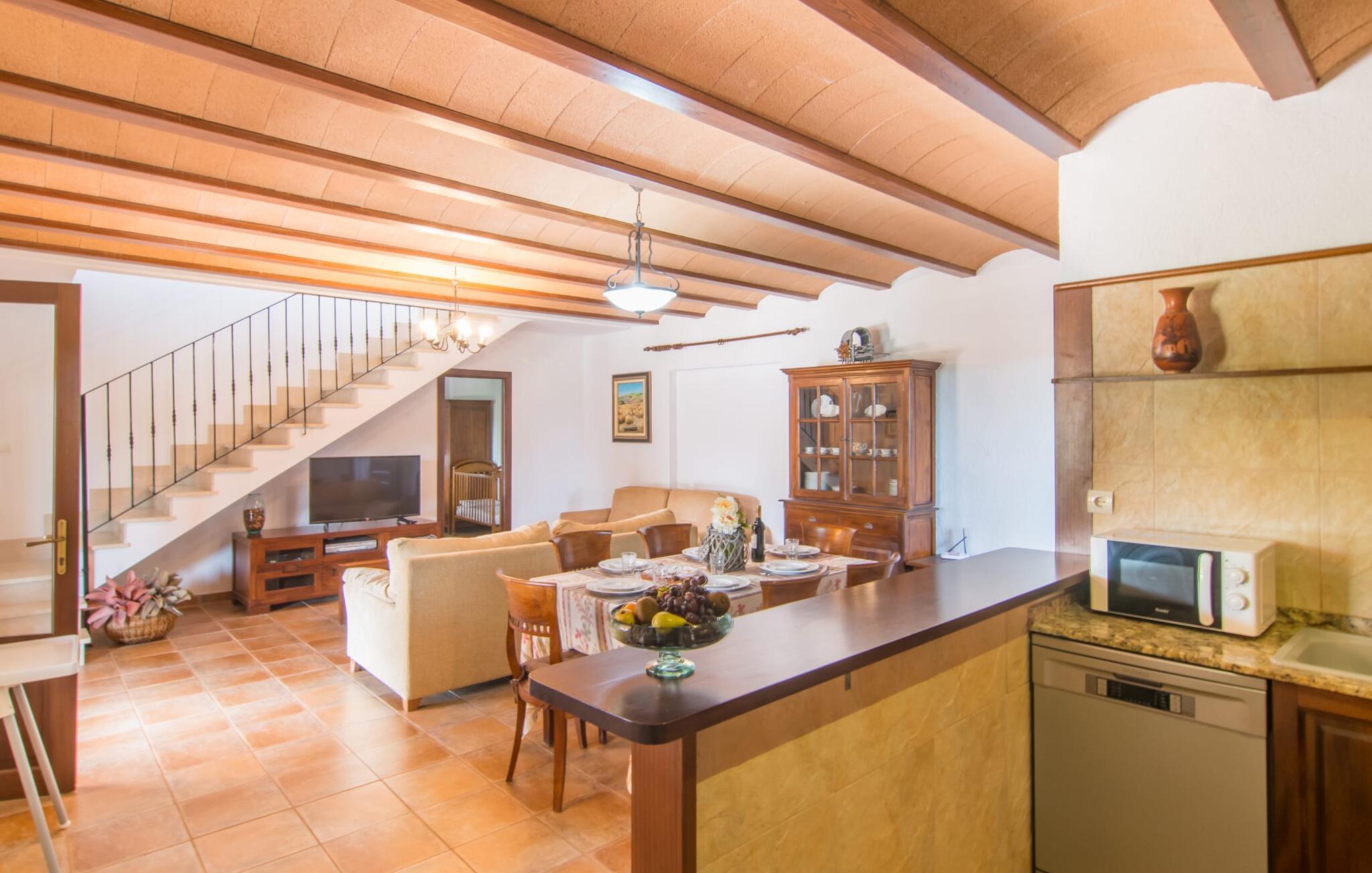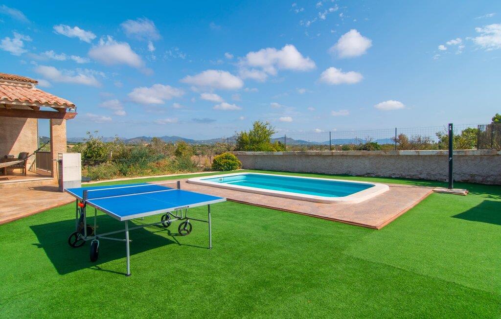 Villaen "Sa Pedrera d'es Turó" er en oase tæt på havet og byder på en masse variation på østkysten. Det gælder også for selve villaen: Det rummelige udendørsareal lokker jer til at tilbringe tidløse, solrige eftermiddage med en vidunderlig forfriskende pool. Omgivet af frodigt grønt kunstgræs kan I efter at have plasket rundt gøre jer godt tilpas på en af de komfortable liggestole, indtil den varme brise tørrer jeres solbeskinnede hud, og I måske får lyst til at spille bordtennis. Den overdækkede verandaterrasse byder på en hængekøje, en gyngestol, en verandagynge og et afslappende opholdsområde - attraktive steder at slappe af i den afslappende ro. Der er også en indbygget grill til jeres rådighed, så I kan bruge meget tid i den friske luft. Selve huset er smukt og komfortabelt indrettet. Et rustikt værelse med accent af mørke trætoner er udstyret med et sofahjørne, hvorfra I kan se en film sidst på dagen. Der er også et spisebord og, noget adskilt, et fremragende udstyret køkken med gaskomfur, så jeres opvaske bliver helt rigtige. Udover et badeværelse med et luksuriøst badekar byder stueetagen på et soveværelse med dobbeltseng. De yderligere to soveværelser med dobbeltsenge er placeret på øverste etage og har hver en børneseng, så unge familier vil finde ideelle ferieforhold i villaen. Der er også et badeværelse på denne etage. Diskrete kunstværker på væggene skaber en behagelig, behagelig atmosfære i hele huset. I kan blot snuppe en af cyklerne ved Villa "Sa Pedrera d'es Turó" for at køre de 1,5 km til Porto Cristo. Fra den smukke promenade er skuet af lystyachter og sejlbåde, der kommer og går, fascinerende at se. Der er en vej i nærheden af villaen, som nogle gange kan høres, men som giver god adgang til infrastruktur. I kan hurtigt nå smukke, fine sandstrande, hvoraf de fleste har en lavvandet indgang til havet, så familier kan tilbringe dejlige dage ved vandet. Manacor, 13 km væk, er en glimrende mulighed, hvis I ønsker at tilbringe en dag med shopping og caféer. I kan selvfølgelig også køre til øens hovedstad Palma, en time væk. Den søde villa "Sa Pedrera d'es Turó" er kun en kilometer væk fra en strand, og Porto Cristo, 2 km væk, lover maritim flair på jeres ferie. Her kan I slentre langs havnepromenaden og planlægge, hvilken af de attraktive østkyststrande, I gerne vil besøge næste gang. Om søndagen vækker det farverige ugentlige marked på Passeig de la Sirena opsigt.