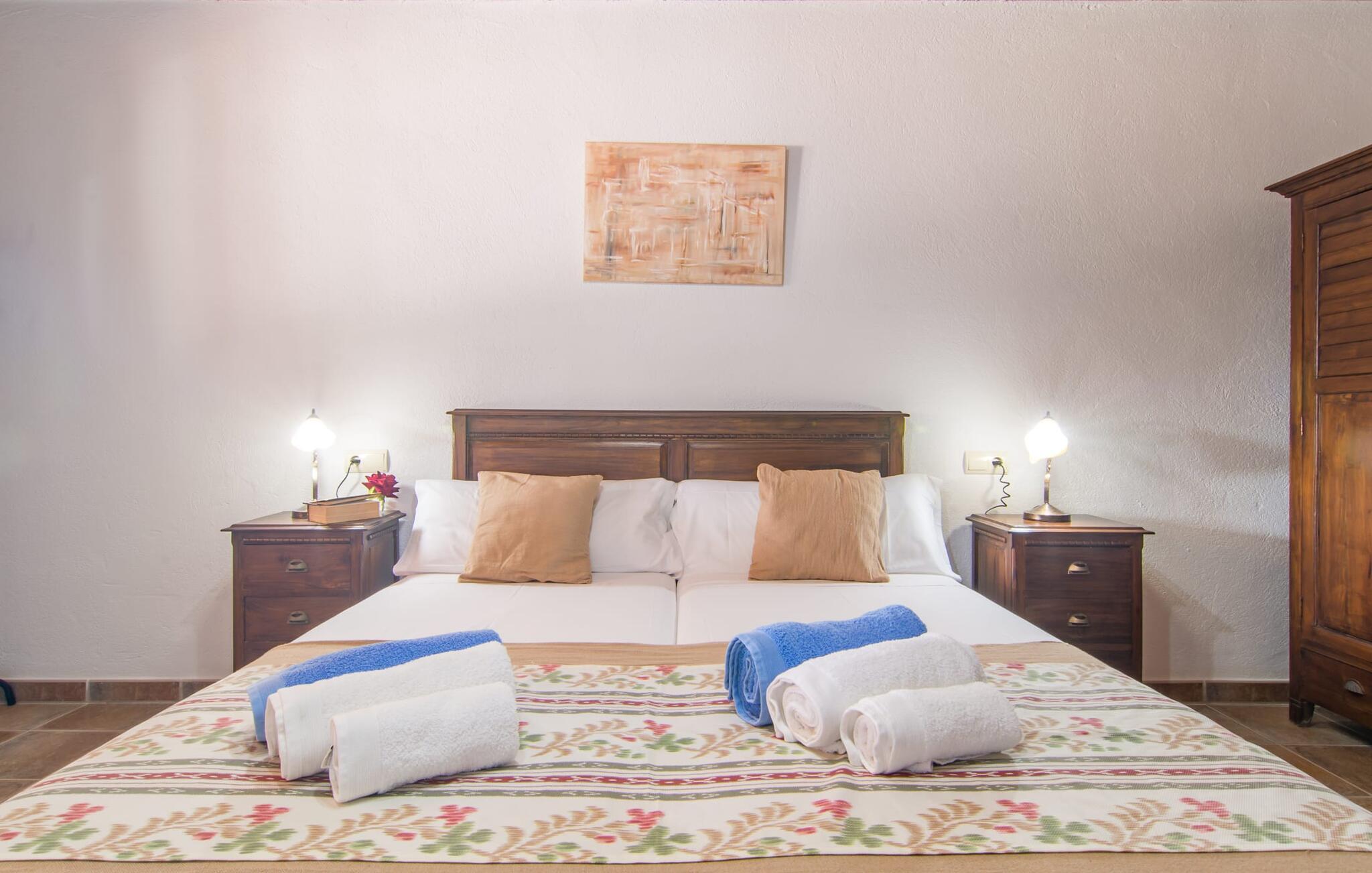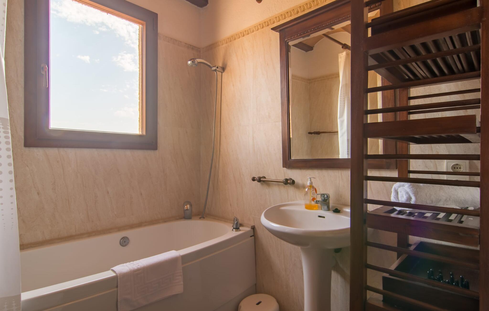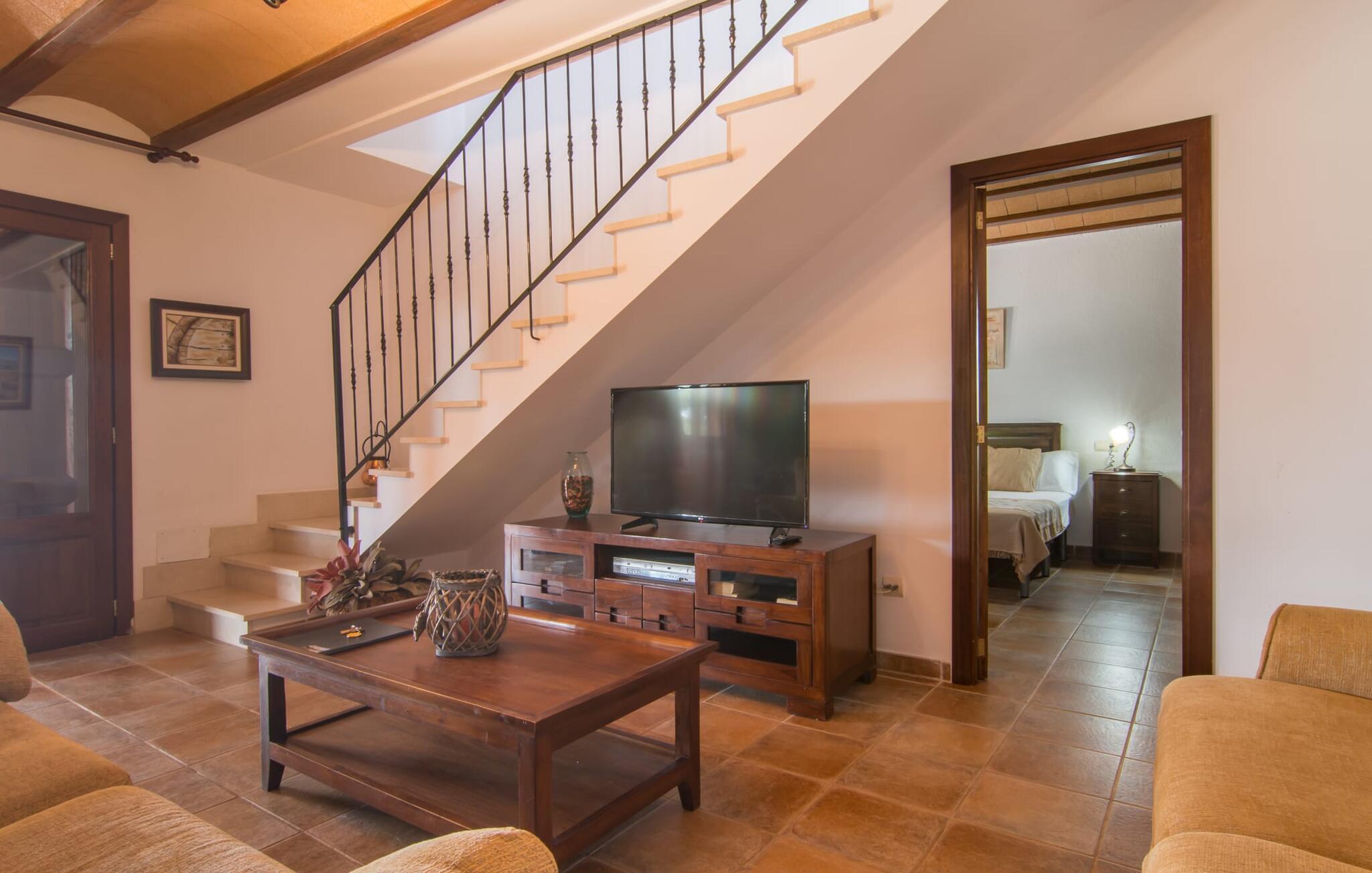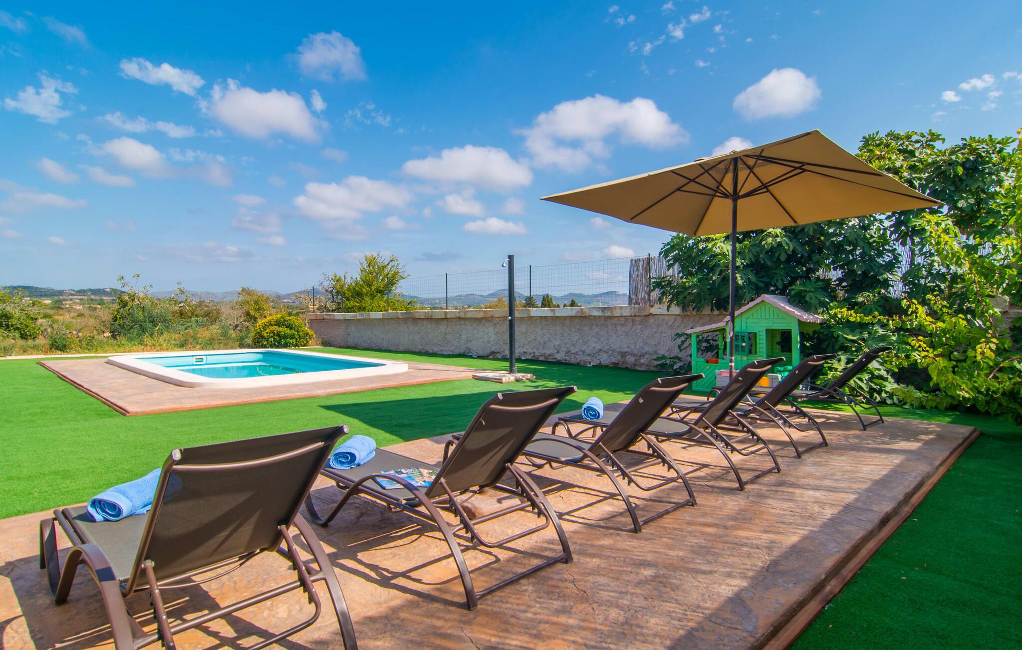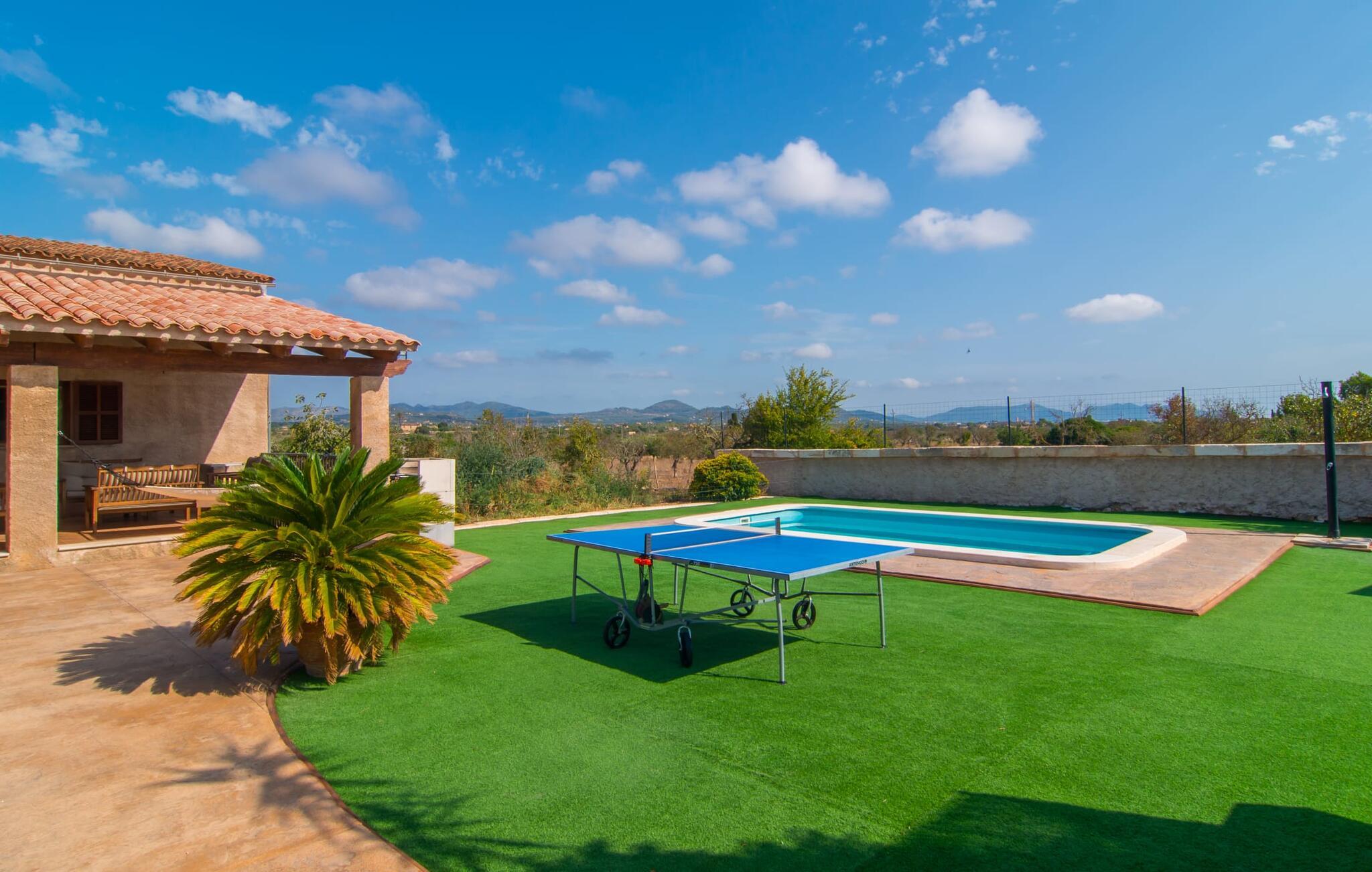 Villaen "Sa Pedrera d'es Turó" er en oase tæt på havet og byder på en masse variation på østkysten. Det gælder også for selve villaen: Det rummelige udendørsareal lokker jer til at tilbringe tidløse, solrige eftermiddage med en vidunderlig forfriskende pool. Omgivet af frodigt grønt kunstgræs kan I efter at have plasket rundt gøre jer godt tilpas på en af de komfortable liggestole, indtil den varme brise tørrer jeres solbeskinnede hud, og I måske får lyst til at spille bordtennis. Den overdækkede verandaterrasse byder på en hængekøje, en gyngestol, en verandagynge og et afslappende opholdsområde - attraktive steder at slappe af i den afslappende ro. Der er også en indbygget grill til jeres rådighed, så I kan bruge meget tid i den friske luft. Selve huset er smukt og komfortabelt indrettet. Et rustikt værelse med accent af mørke trætoner er udstyret med et sofahjørne, hvorfra I kan se en film sidst på dagen. Der er også et spisebord og, noget adskilt, et fremragende udstyret køkken med gaskomfur, så jeres opvaske bliver helt rigtige. Udover et badeværelse med et luksuriøst badekar byder stueetagen på et soveværelse med dobbeltseng. De yderligere to soveværelser med dobbeltsenge er placeret på øverste etage og har hver en børneseng, så unge familier vil finde ideelle ferieforhold i villaen. Der er også et badeværelse på denne etage. Diskrete kunstværker på væggene skaber en behagelig, behagelig atmosfære i hele huset. I kan blot snuppe en af cyklerne ved Villa "Sa Pedrera d'es Turó" for at køre de 1,5 km til Porto Cristo. Fra den smukke promenade er skuet af lystyachter og sejlbåde, der kommer og går, fascinerende at se. Der er en vej i nærheden af villaen, som nogle gange kan høres, men som giver god adgang til infrastruktur. I kan hurtigt nå smukke, fine sandstrande, hvoraf de fleste har en lavvandet indgang til havet, så familier kan tilbringe dejlige dage ved vandet. Manacor, 13 km væk, er en glimrende mulighed, hvis I ønsker at tilbringe en dag med shopping og caféer. I kan selvfølgelig også køre til øens hovedstad Palma, en time væk. Den søde villa "Sa Pedrera d'es Turó" er kun en kilometer væk fra en strand, og Porto Cristo, 2 km væk, lover maritim flair på jeres ferie. Her kan I slentre langs havnepromenaden og planlægge, hvilken af de attraktive østkyststrande, I gerne vil besøge næste gang. Om søndagen vækker det farverige ugentlige marked på Passeig de la Sirena opsigt.