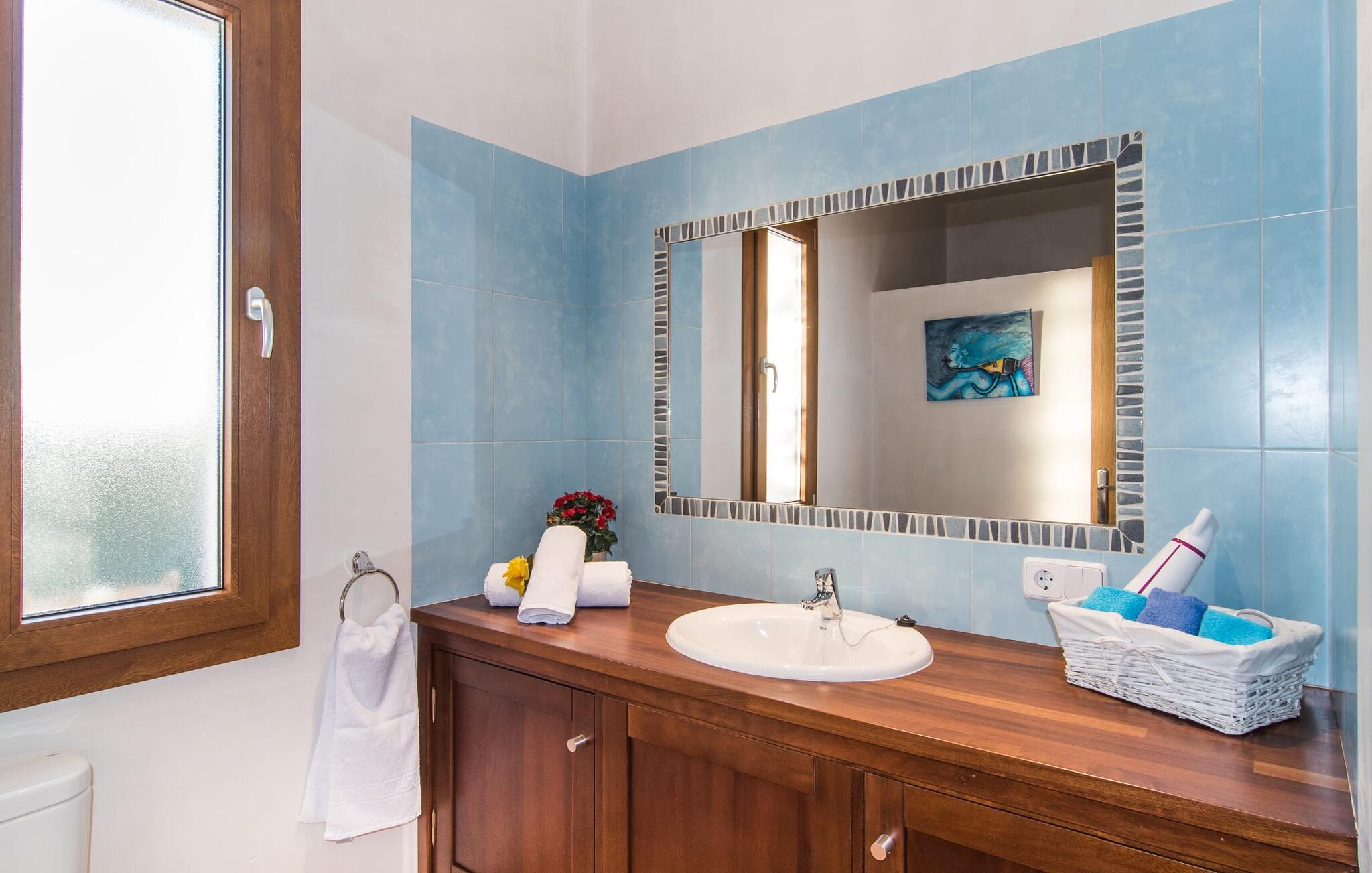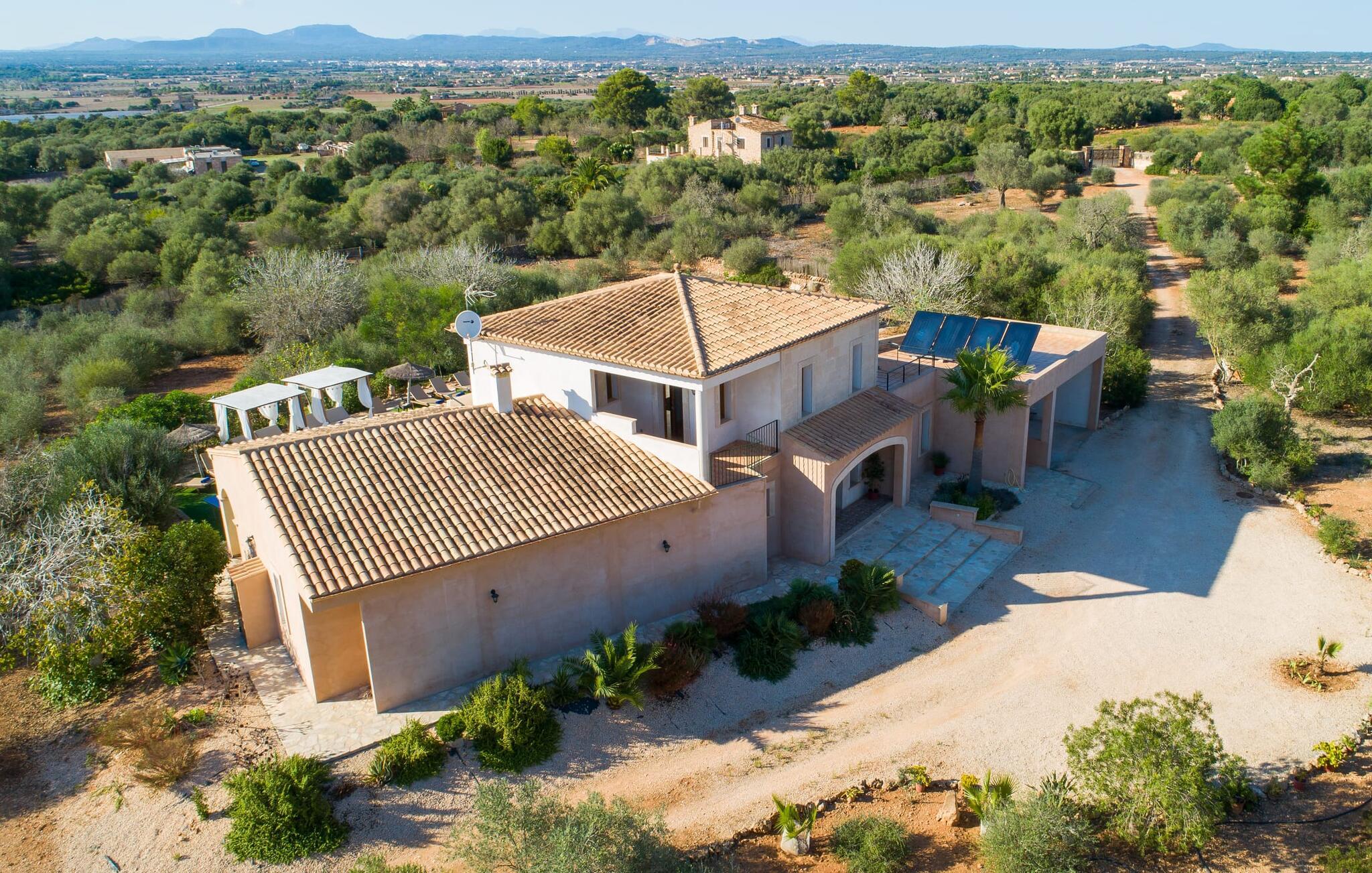 Rummelig ejendom på en idyllisk ejendom – sådan kan man beskrive den vidunderligt vedligeholdte villa “Can Estiu”. Det ligger i smuk ensomhed i et roligt, grønt landskab på den sydlige del af øen, langt væk fra byerne og derfor absolut priviligeret. Ejendommen er meget omgivet af marker og små skove. Selve ejendommen har et behageligt udvendigt design med naturstensfinish og en frodig have. Den kantløse pool, foret med blå mosaikfliser, har en førsteklasses beliggenhed lige foran husets overdækkede terrasse. På en frodig græsplæne er der masser af plads til de komfortable liggestole og den vævede raffia-paraply. Uanset om I solbader eller er i den kølige skygge, kan I genlære, hvordan I slapper af her. At lave ingenting i så smukke omgivelser forynger sindet, ligesom at læse en god bog. Verandaen ved huset byder på plads nok til en hyggelig spiseplads, en behagelig sofa med lounge-følelse og et hyggeligt opholdsområde med kurvemøbler. Den rød- og hvidternede dug passer til denne moderne udseende villa og giver den et dejligt strejf af nostalgisk Mallorca både inde og ude. Det er ofte disse små detaljer, der får jer til at føle jer godt tilpas. Den store solterrasse på øverste etage, hvorfra udsigten over kystlandskabet er endnu mere imponerende, bidrager også til den gavnlige effekt af denne velholdte ejendom. Den lyse villa, som er oplyst af adskillige vinduer, er ikke kun et tilflugtssted for at sove. Lyse terracotta gulvfliser, mørke trædøre, hvide vægge med bløde stuklister og forsænkede loftslamper giver huset en meget behagelig tidløs atmosfære. Det åbne, let bugtende opholds-, spise- og køkkenområde har også samme effekt. Ved siden af køkkenet er der en hyggelig pejs med lyst sofaområde. Skranken dekoreret med stenfliser adskiller den visuelt fra resten af rummet. Takket være de omfattende faciliteter vil jeres ferie med selvforplejning aldrig være en byrde. Åbenheden i dette område og et andet siddeområde bag spisebordet gør dette sted ideelt til kommunikation, uanset om I rejser med flere familier eller mange venner. Især hvis I rejser med par, en gruppe singler eller to familier, er et hus som "Can Estiu", der har aircondition og eget badeværelse med bruser i alle soveværelser, naturligvis særligt behageligt. Det store soveværelse ligger på første sal og har direkte udgang til solterrassen. På trods af den trendy hvide stil og subtile dekorative elementer, vil I føle jer hjemme i dette afslappede landsted. Måske også fordi rummene er fyldt med charmen fra det sydlige Mallorca. Felanitx, Santanyí, Campos og Colònia de Sant Jordi, som alle er kendt som dejlige steder, er et besøg værd og har skabt sig et navn for deres autentiske, landlige karakter. Væk fra masseturismen kan I slentre gennem små gader og nyde travlheden på de ugentlige markeder, der finder sted på forskellige dage. Klosteret San Salvador, saltmarkerne omkring Ses Salines og lange sandstrande med caribisk flair er de umiskendelige vartegn i denne smukke region. Det er netop i denne region, kun 6 km fra Campos, at den stærkt anbefalede villa "Can Estiu" ligger. Med sin moderne stil og komfortable, hjemlige indretning falder den perfekt ind i omgivelserne, så I kan nyde en skøn ferie på alle måder! Den moderne villa "Sa Pedrera den Miquel" ligger på en fremtrædende beliggenhed i den charmerende sydlige del af øen mellem den smukke by Ses Salines og den hyggelige by Campos. Shopping kan gøres i byen, 10 minutter væk. Torsdage og lørdage er markedsdage der. Den rolige beliggenhed inde i landet giver jer mulighed for at nå sande badeparadiser som den naturlige strand Es Trenc eller den hvide sandbugt Sa Ràpita, som er en del af kommunen i havnebyen Colònia de Sant Jordi.