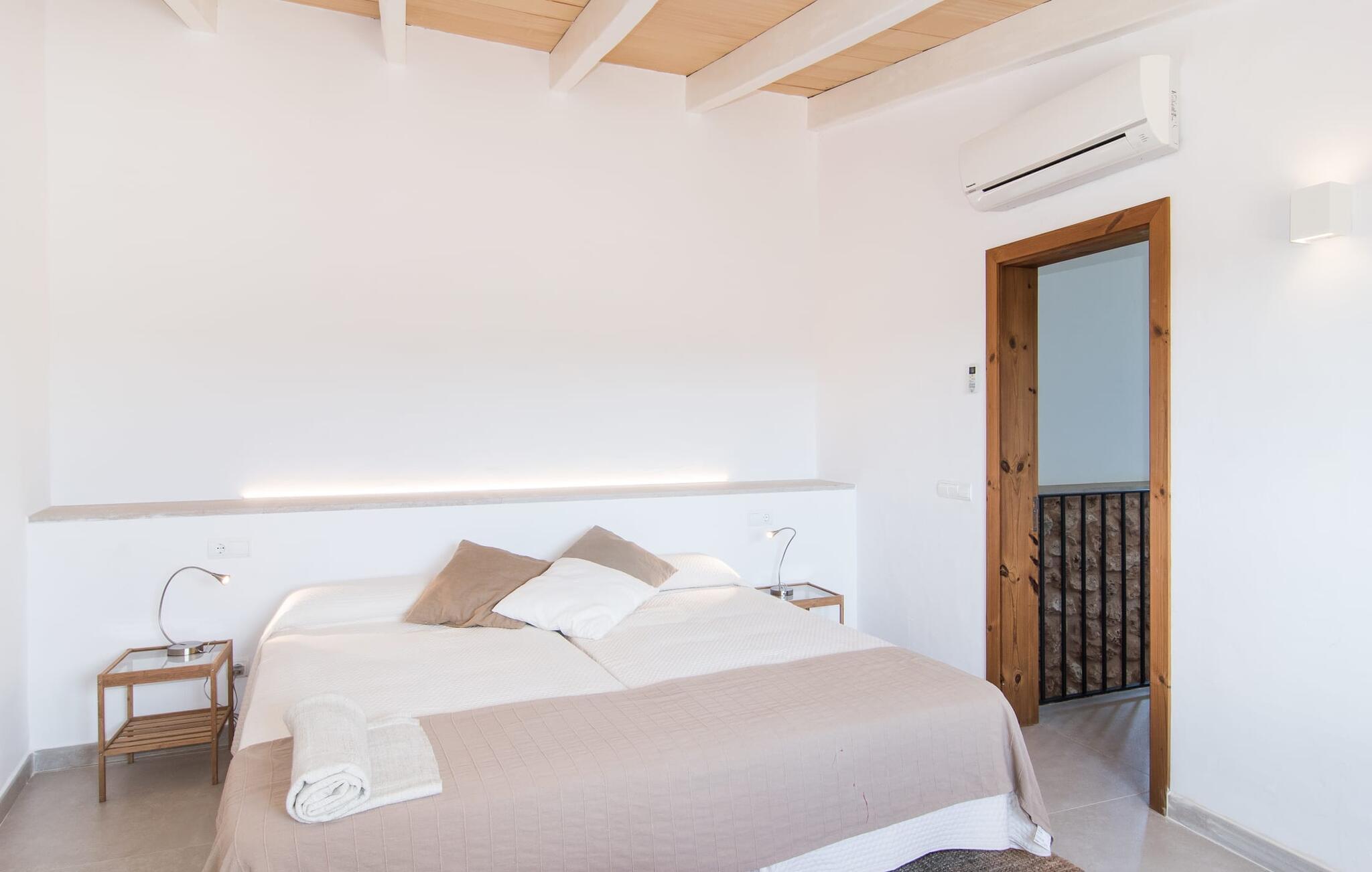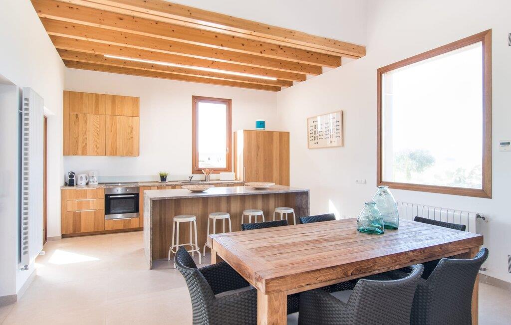Fincaen "Sa Sinia d'Es Trenc" er et strålende eksempel på den perfekte symbiose mellem et gammelt mallorcansk landsted og moderne arkitektur. Resultatet er imponerende og yderst vellykket. Ejendommen opnår formentlig også sin stimulerende effekt gennem sin isolerede beliggenhed og sin landbrugskarakter - ingen umiddelbare naboer, kun marker og frodig vegetation så langt øjet rækker. En harmonisk atmosfære, hvor afslapning er i højsædet. På grund af strukturen, som er vokset gennem mange år, kan I forvente en varieret og yderst smuk have fyldt med oliven- og johannesbrødtræer, cypresser og frugttræer. Naturstensstier fører gennem det uberørte terræn. Poolområdet ligger tæt på huset og samtidig let forhøjet, da det er tilgængeligt via få trin. Området er indhegnet med bambusmåtter og tilbyder en mobil sikkerhedsanordning til børn. Den rummelige og lavvandede pool (mellem 2 og 1,10 m) er indrammet af en omgivende solterrasse. To separate fortelte med bambustag tilbyder skyggefulde og meget afslappende afslapningsmuligheder på ergonomisk formede liggestole. Der er også overdækkede terrasser lige ved siden af huset, som giver mulighed for at slappe af komfortabelt i skyggen. Der er et professionelt bordtennisbord under et af dem, men højdepunktet er husets store overdækkede terrasse. Denne veranda har et bord til 12 personer med elegante siddepladser. Verandaens store dimensioner gør, at spisepladsen kan kombineres med nogle sofaer, der fungerer som et chill-out område. Mens I griller sammen, kan I se cypresserne og den smukke grønne have i det fjerne. Så I kan slutte dagen af med et dejligt glas mallorcansk rødvin! De fleste af soveværelserne er placeret i den gamle del af bygningen, som naturligvis er gennemgribende renoveret. Det hylder bygningens oprindelige karakter ved at holde de historiske stenbrud synlige, hvilket skaber en helt speciel følelse. Farvepaletten på loungerne er meget subtil med hvide, beige og naturlige eller let glaserede træværk og fliser af elfenben. Alle udstyret med aircondition, de rummelige soveværelser tilbyder ikke kun en afslappende nattesøvn, men også en hjemlig atmosfære. De er fordelt på to etager og fuldendes af i alt seks moderne bruserum, alle en-suite. Dobbeltværelset med integreret badeværelse er et eksempel på innovativ arkitektur og grænseløs tænkning. Et åbent boligkoncept i form af en hems blev skabt i stueetagen i den nye bygning. Gennem de store vindueselementer, der åbner ud til terrassen, oplever vi en lysfyldt stue/køkken/alrum. I kan se hele rummet fra det komfortable beige sofaområde. I midten er spisestuen med en solid rustik bænk. Køkkenet er visuelt adskilt af en central ø med få taburetter. Men de flotte og skinnende træskabe med komplet, komplekst udstyr skal ikke skjules. Denne opdeling gør det nemt at lave mad sammen og skaber et kommunikationsrum. Et skønt mødested om morgenen, når duften af friskbrygget kaffe svæver gennem huset, og I planlægger resten af jeres afslappende ferie i den behagelige morgenluft. Der er meget at opdage i dette flade kystområde: steder som Ses Salines, Campos saltsletter, kystbyen Colonia de Sant Jordi og længere væk små landsbyer som Santanyi. De tilbyder et repræsentativt udvalg af denne sydlige kystregion, som stadig er stærkt præget af landbruget. I området finder I også de smukke hvide sandstrande og krystalklare vand i Es Freu de Ses Covetes og Es Trenc. I kan komme dertil til fods, på cykel eller nemt i bil. Det betyder, at hver dag kan designes individuelt og frit. Hvor end dagsturene tager jer hen, er én ting sikkert: Et ophold på drømmeejendommen "Sa Sinia d'Es Trenc" er ikke mindre attraktivt og lover en vidunderlig uformel og afslappende oplevelse - en ferie for jer! Villaen "Sa Sinia d'Es Trenc" består af et gammelt bondehus og en tilbygning, hvilket skaber et spændende ensemble med en fantastisk have, poolområde og terrasser. Huset ligger syd for Campos ud mod kysten. For shopping kan I gå til Campos eller Ses Salines, begge byer er den samme afstand på 6 km. Da I allerede er halvvejs mod kysten, er sandstrandene her, især drømmestranden Es Trenc, 15 minutter væk i bil.