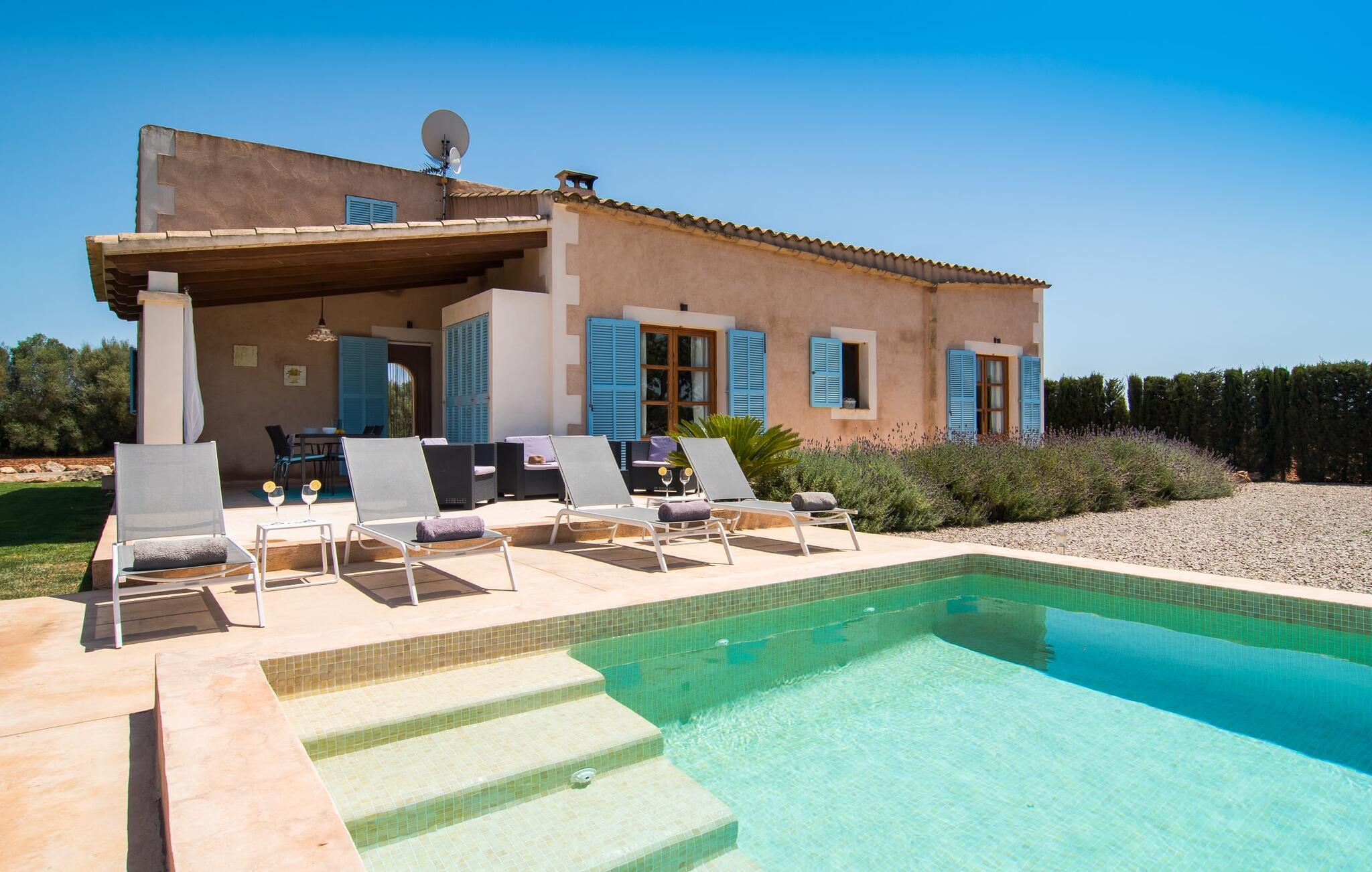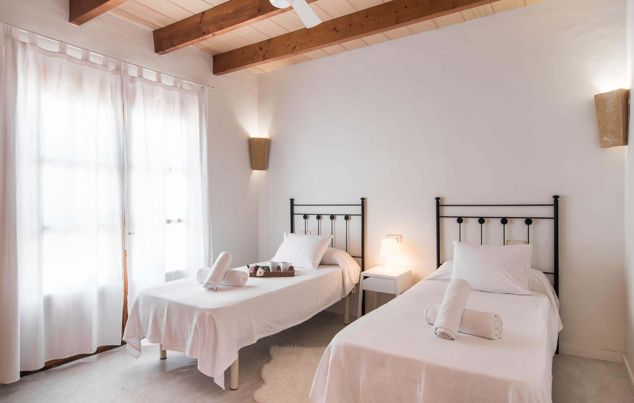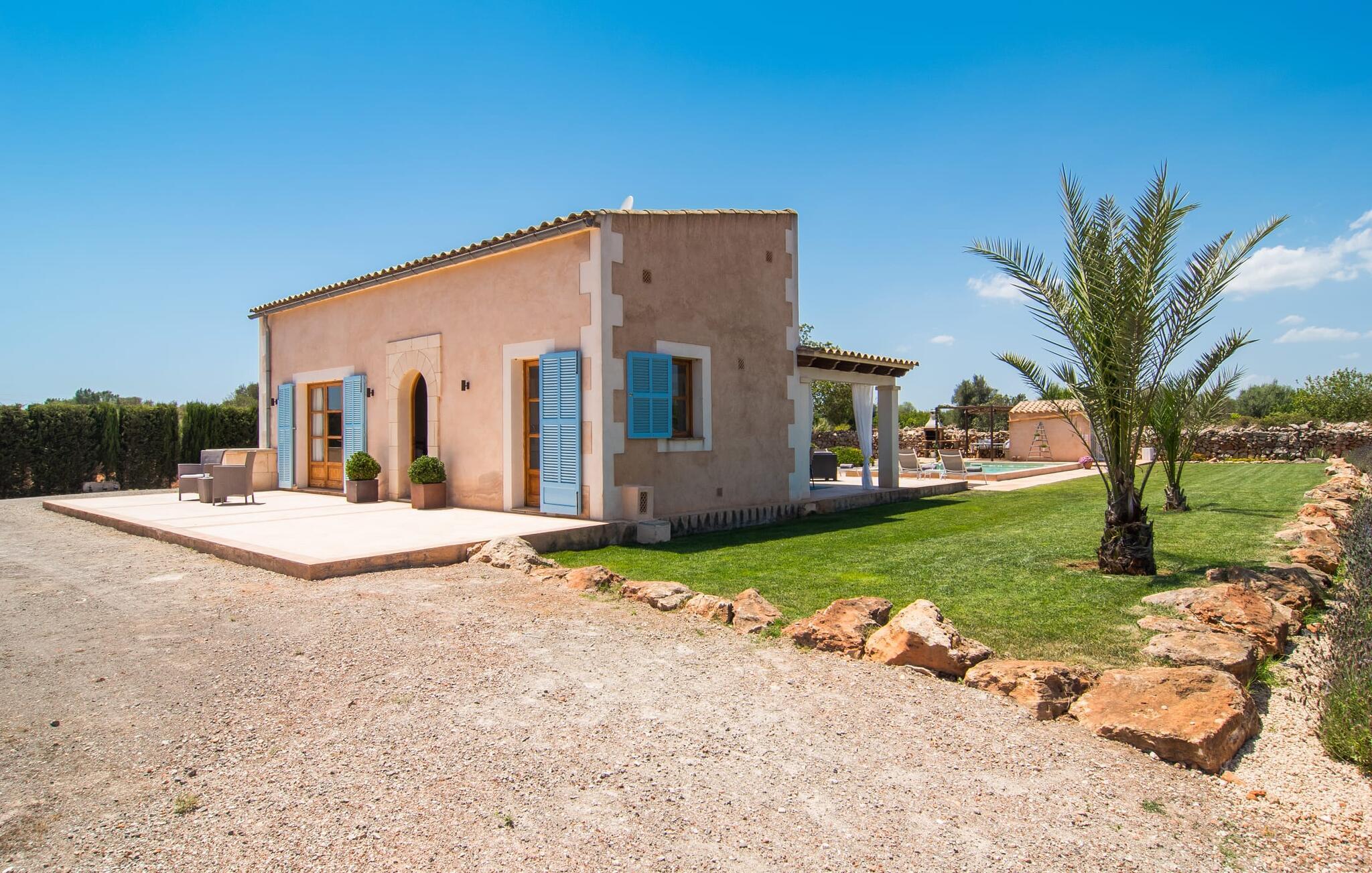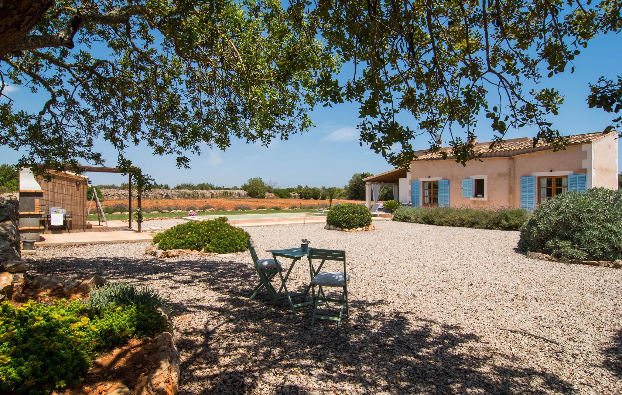 Den smukke feriefinca "Sa Tanca Gran" byder på plads til op til fire gæster. Det er omgivet af marker i det landlige lavland i det smukke sydlige Mallorca. Her er I helt for jer selv og alligevel er indkøbsmuligheder og smukke strande ikke langt væk. Det pæne, minimalistiske design af udendørsområdet inviterer jer til at blive hængende i timevis under middelhavssolen. Den vidunderlige pool er udstyret med liggestole og parasoller. Lige ved siden af huset er der en hyggelig, overdækket terrasse, hvor I kan nyde jeres måltider i skyggen. På den modsatte side af poolen er der en muret grill og endnu en solbeskyttet udendørs spiseplads under en pergola. Afhængigt af vindretningen kan der høres kørestøj i det fjerne fra landstedet, men det betyder også, at kystdestinationer som Cala D'Or eller Portocolom er let tilgængelige. Sommerhuset i stueetagen byder velkommen med en lys, smagfuldt indrettet opholdsstue. Rustikke elementer blev kombineret med moderne komfort. Det fuldt udstyrede køkken er integreret i en charmerende stue og spisestue i åbent plan med pejs. De to dobbeltværelser er udstyret med overskabe og kan nemt mørklægges med rulleskodder. Både soveværelserne og det primære opholdsrum er udstyret med aircondition. Et moderne badeværelse med bruser fuldender rummet. Feriehuset har stabilt internet og er også velegnet til hjemmearbejde. Ferieboligen ligger på det sydlige Mallorca, 6,5 km nordvest for Felanitx. Her finder I flere supermarkeder og indkøbsmuligheder. De nærmeste sandstrande Cala Murada, Cala Tropicana og Cala Marçal ligger omkring 25 minutter væk i bil. Aircondition er inkluderet i prisen i stuen fra 12:00 til 22:00 og i soveværelserne fra 22:00 til 06:00. Brug uden for disse tider vil blive faktureret kontant på stedet.