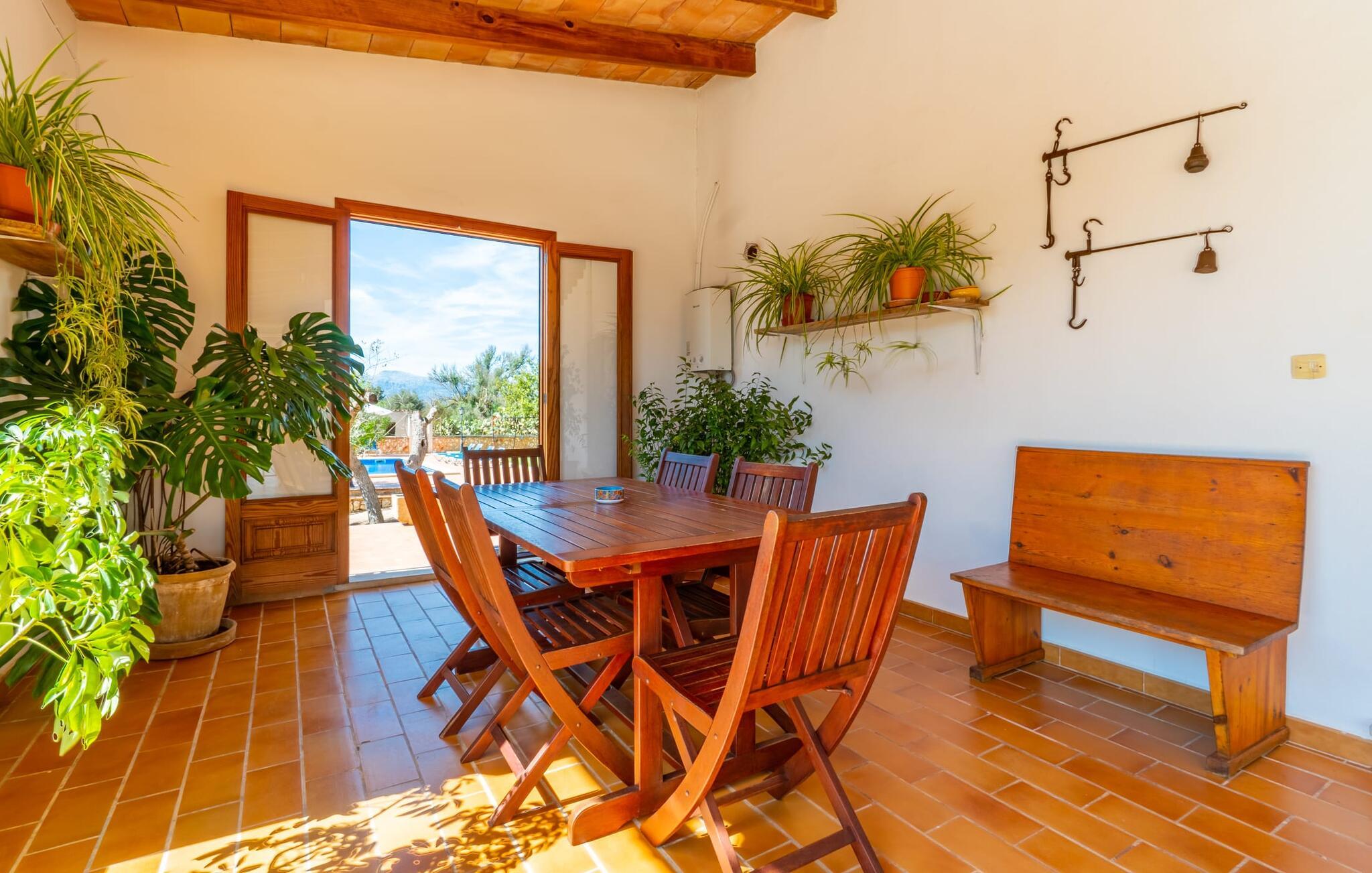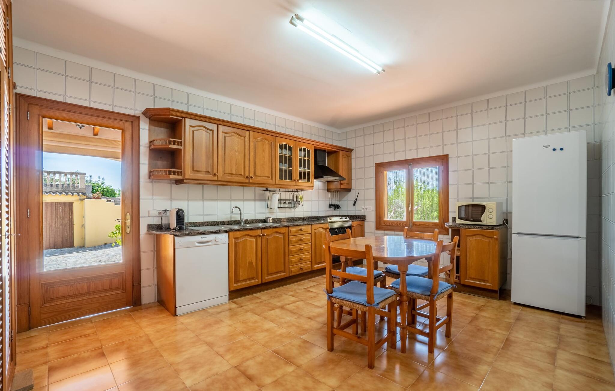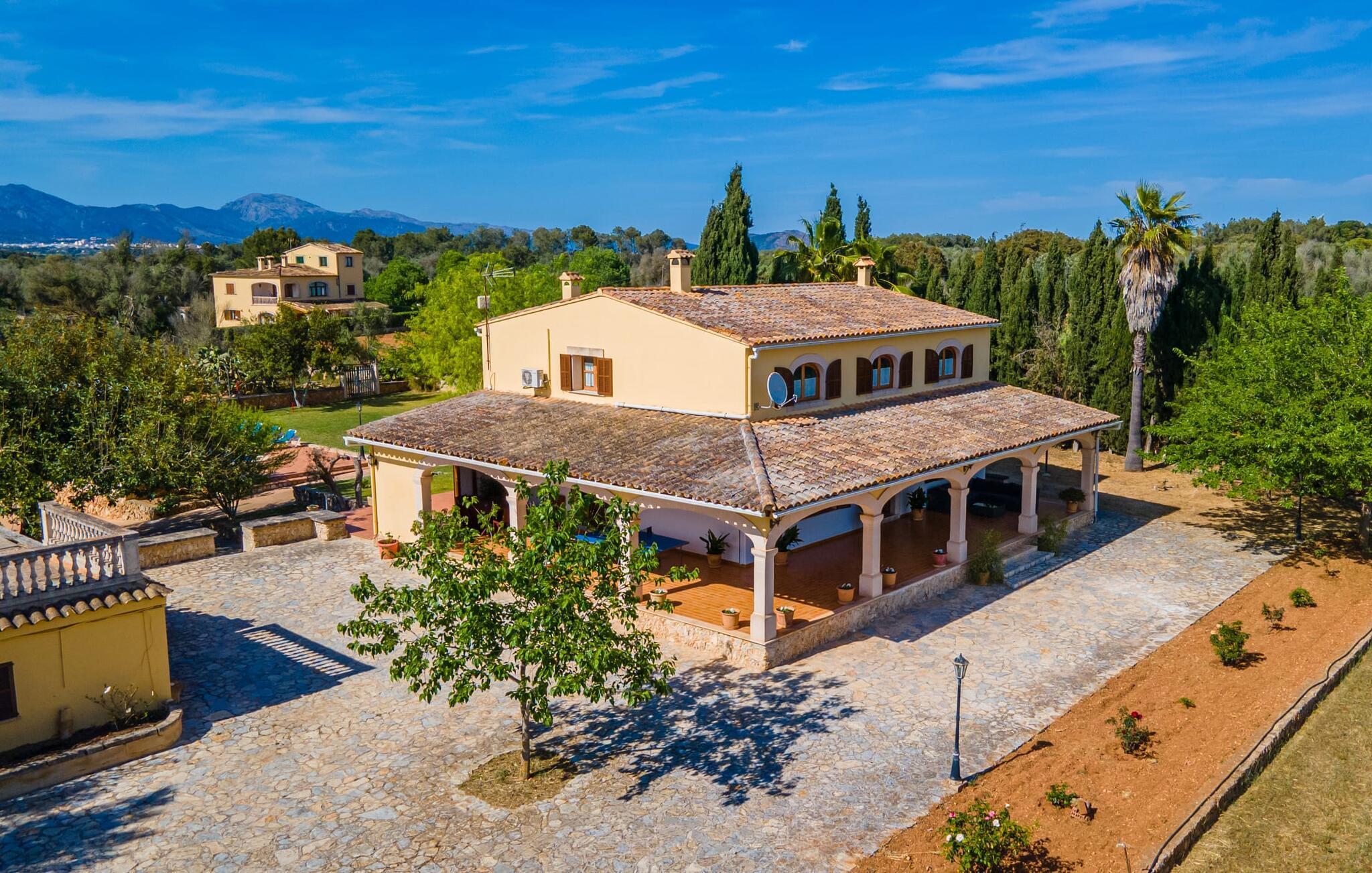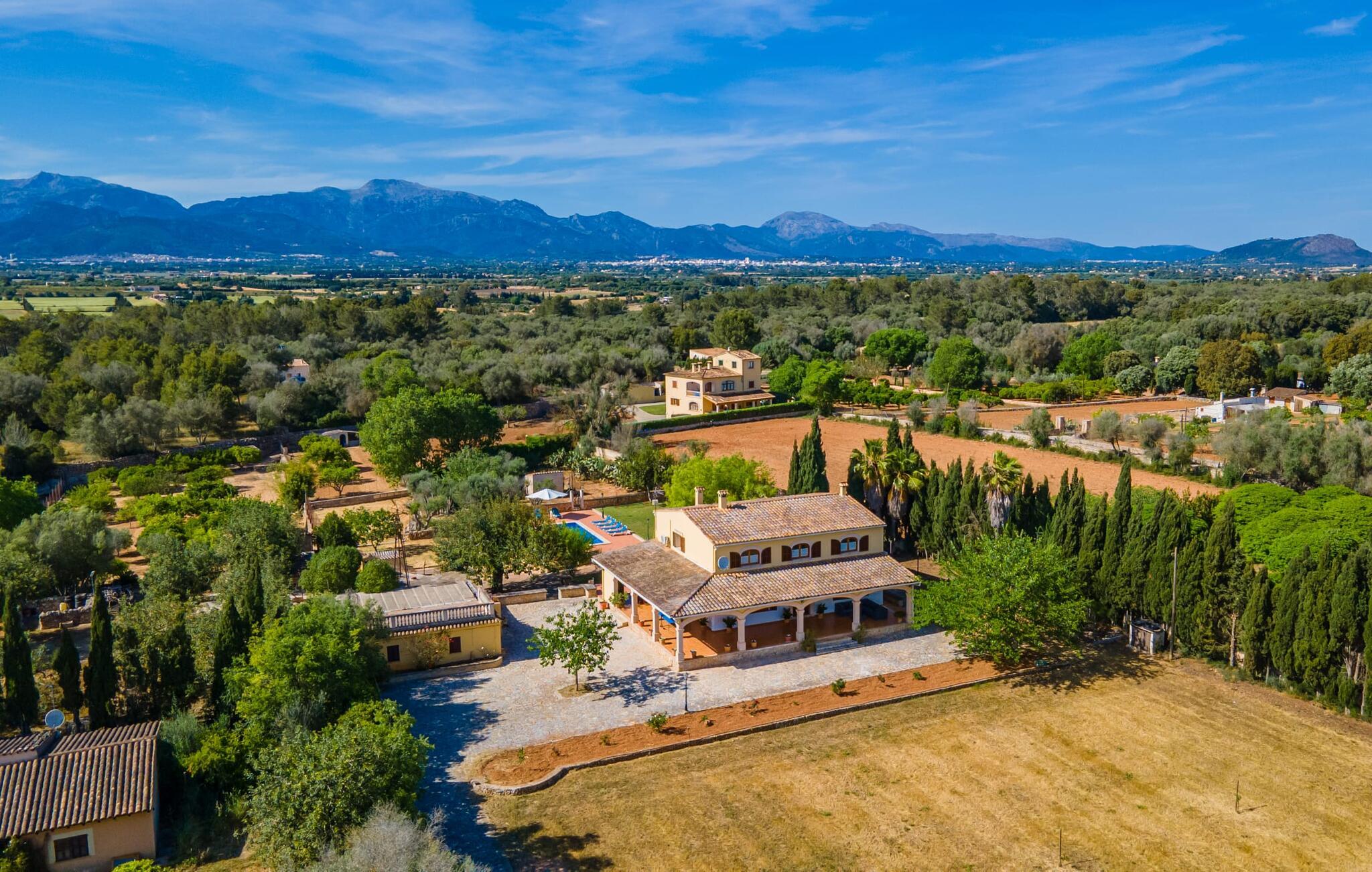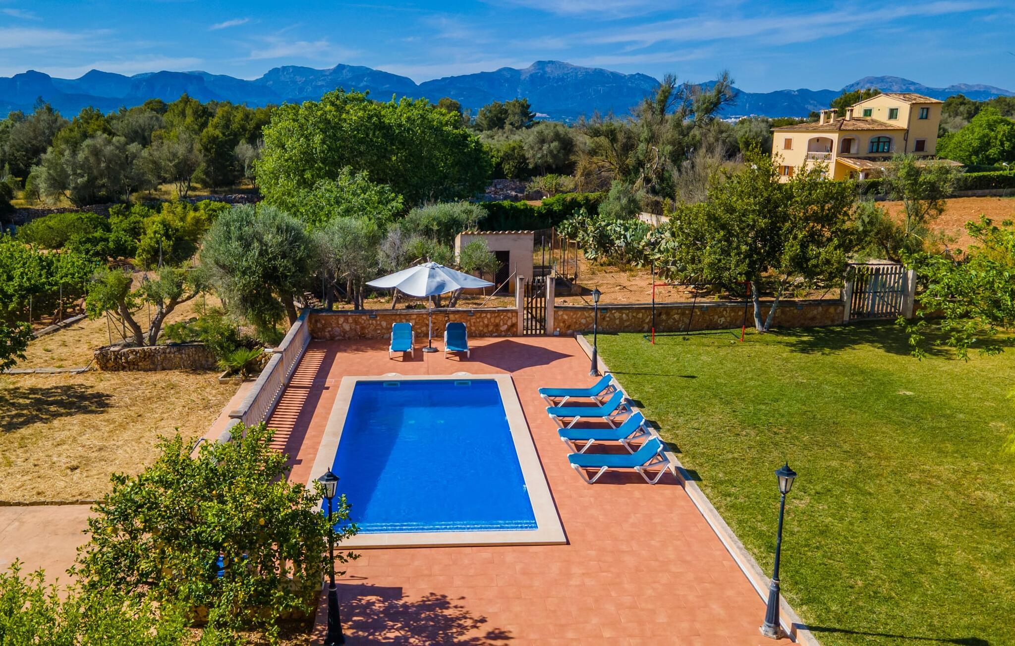 Det charmerende bondehus "Sa Vileta" skinner i solen. Det familievenlige feriehus er omgivet af en oaselignende have. Dette er naturligt dyrket med masser af græsplæner og et imponerende antal frugttræer. Der er også frodige blomstrende planter på de brolagte terrassearealer og omkring det rummelige poolområde. Det er ikke kun swimmingpoolen med rutsjebane, der er et højdepunkt for hele familien. De mange legemuligheder i haven samt bordtennisbordet og basketballkurven er virkelige højdepunkter for jeres børn. I mellemtiden kan voksne slappe af på liggestolene. Om aftenen kan I bruge grillen til en lækker BBQ. De to overdækkede terrasser med deres indbydende kurvebuer inviterer jer til at tilbringe jeres dyrebare ferietid hele dagen lang. Venner er hjerteligt velkomne. Det fantastisk beliggende stuehus afspejler den landlige atmosfære indenfor. Det hyggelige og rustikke feriehus byder på en harmonisk atmosfære. Terracotta og træ kombineres med moderne boligkomfort. Det fuldt udstyrede køkken på landet og den indendørs spisestue inviterer jer til at nyde måltider sammen. Tre badeværelser muliggør familievenlig brug for op til otte personer. Udover opholdsstue med TV er der fire lyse soveværelser med enkelt- eller dobbeltsenge. De lyse værelser tilbyder en smuk udsigt over den beroligende stilhed i den naturlige have. Takket være det varme-kolde klimaanlæg er der altid en behagelig temperatur i stuehuset. Det fremragende tekniske udstyr gør det også muligt at bruge det på hjemmekontoret. Kombiner ferie med arbejde og drag fordel af den kreative atmosfære i "Sa Vileta"-gården. Det familievenlige bondehus "Sa Vileta" er beliggende i en oase-lignende have i landlige omgivelser og alligevel kun få minutter fra den traditionelle landsby Sencelles. I nyder to gange af den behagelige centrale beliggenhed midt på øen: Der er kun 30 minutter i bil til øens hovedstad Palma eller den lange bugt Alcúdia med sine vidunderlige sandstrande.