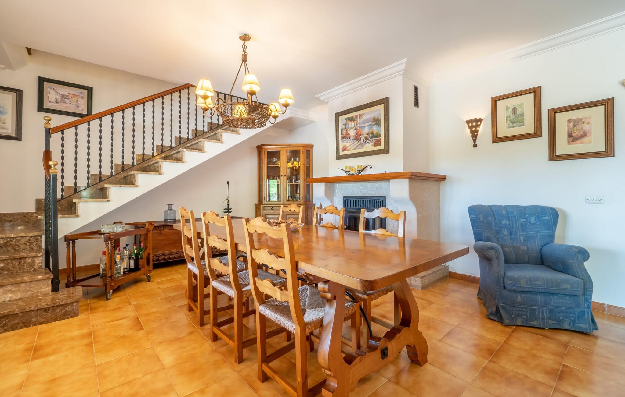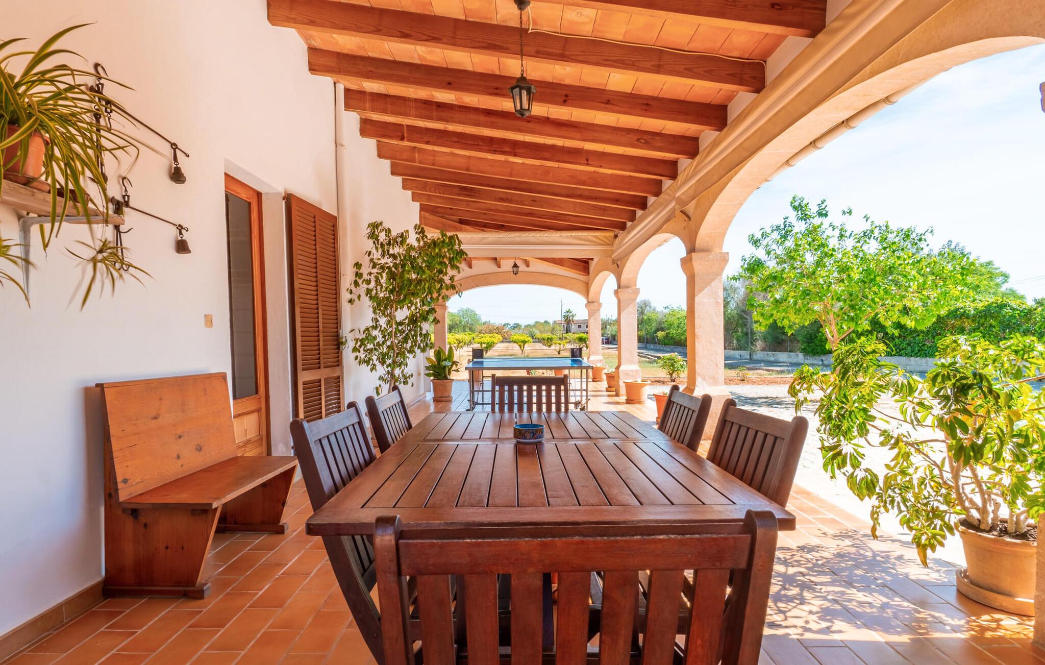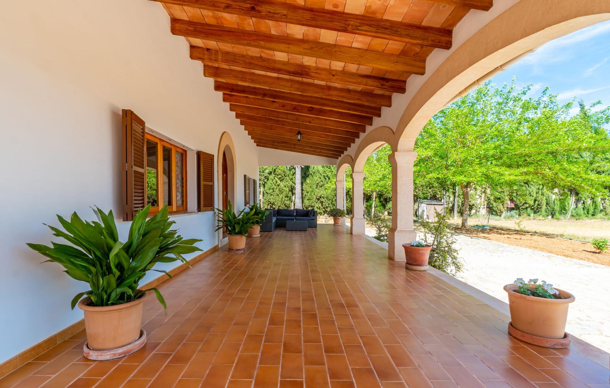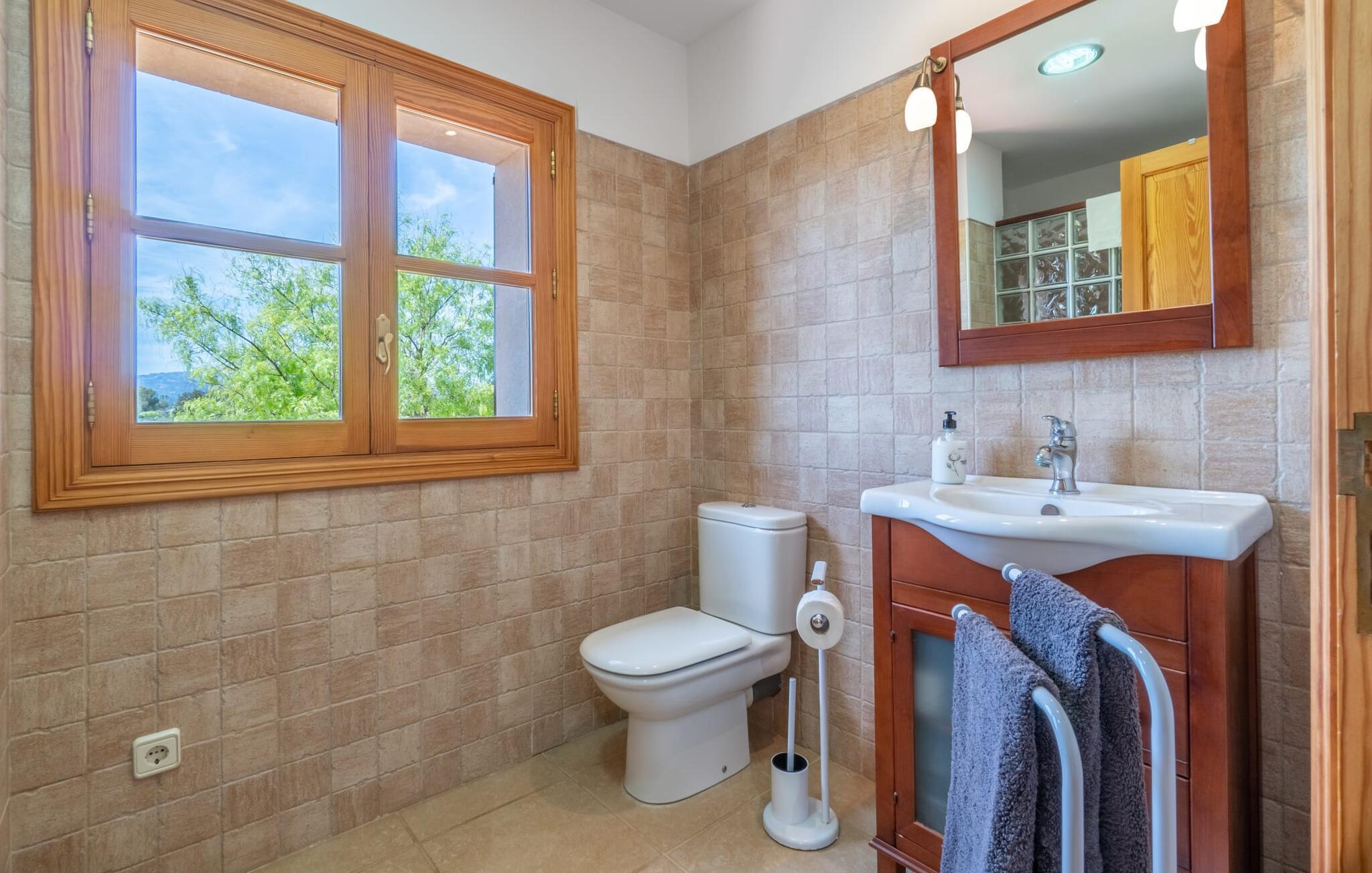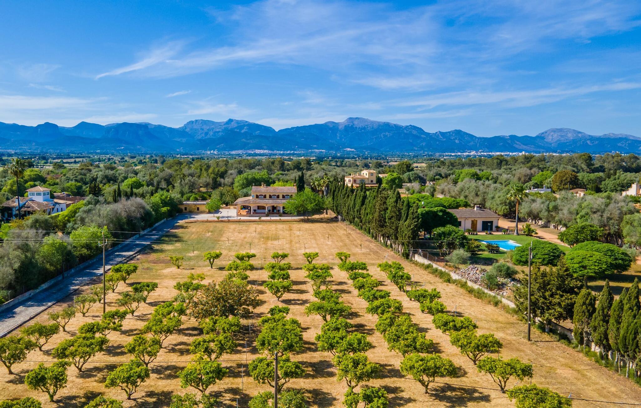Det charmerende bondehus "Sa Vileta" skinner i solen. Det familievenlige feriehus er omgivet af en oaselignende have. Dette er naturligt dyrket med masser af græsplæner og et imponerende antal frugttræer. Der er også frodige blomstrende planter på de brolagte terrassearealer og omkring det rummelige poolområde. Det er ikke kun swimmingpoolen med rutsjebane, der er et højdepunkt for hele familien. De mange legemuligheder i haven samt bordtennisbordet og basketballkurven er virkelige højdepunkter for jeres børn. I mellemtiden kan voksne slappe af på liggestolene. Om aftenen kan I bruge grillen til en lækker BBQ. De to overdækkede terrasser med deres indbydende kurvebuer inviterer jer til at tilbringe jeres dyrebare ferietid hele dagen lang. Venner er hjerteligt velkomne. Det fantastisk beliggende stuehus afspejler den landlige atmosfære indenfor. Det hyggelige og rustikke feriehus byder på en harmonisk atmosfære. Terracotta og træ kombineres med moderne boligkomfort. Det fuldt udstyrede køkken på landet og den indendørs spisestue inviterer jer til at nyde måltider sammen. Tre badeværelser muliggør familievenlig brug for op til otte personer. Udover opholdsstue med TV er der fire lyse soveværelser med enkelt- eller dobbeltsenge. De lyse værelser tilbyder en smuk udsigt over den beroligende stilhed i den naturlige have. Takket være det varme-kolde klimaanlæg er der altid en behagelig temperatur i stuehuset. Det fremragende tekniske udstyr gør det også muligt at bruge det på hjemmekontoret. Kombiner ferie med arbejde og drag fordel af den kreative atmosfære i "Sa Vileta"-gården. Det familievenlige bondehus "Sa Vileta" er beliggende i en oase-lignende have i landlige omgivelser og alligevel kun få minutter fra den traditionelle landsby Sencelles. I nyder to gange af den behagelige centrale beliggenhed midt på øen: Der er kun 30 minutter i bil til øens hovedstad Palma eller den lange bugt Alcúdia med sine vidunderlige sandstrande.