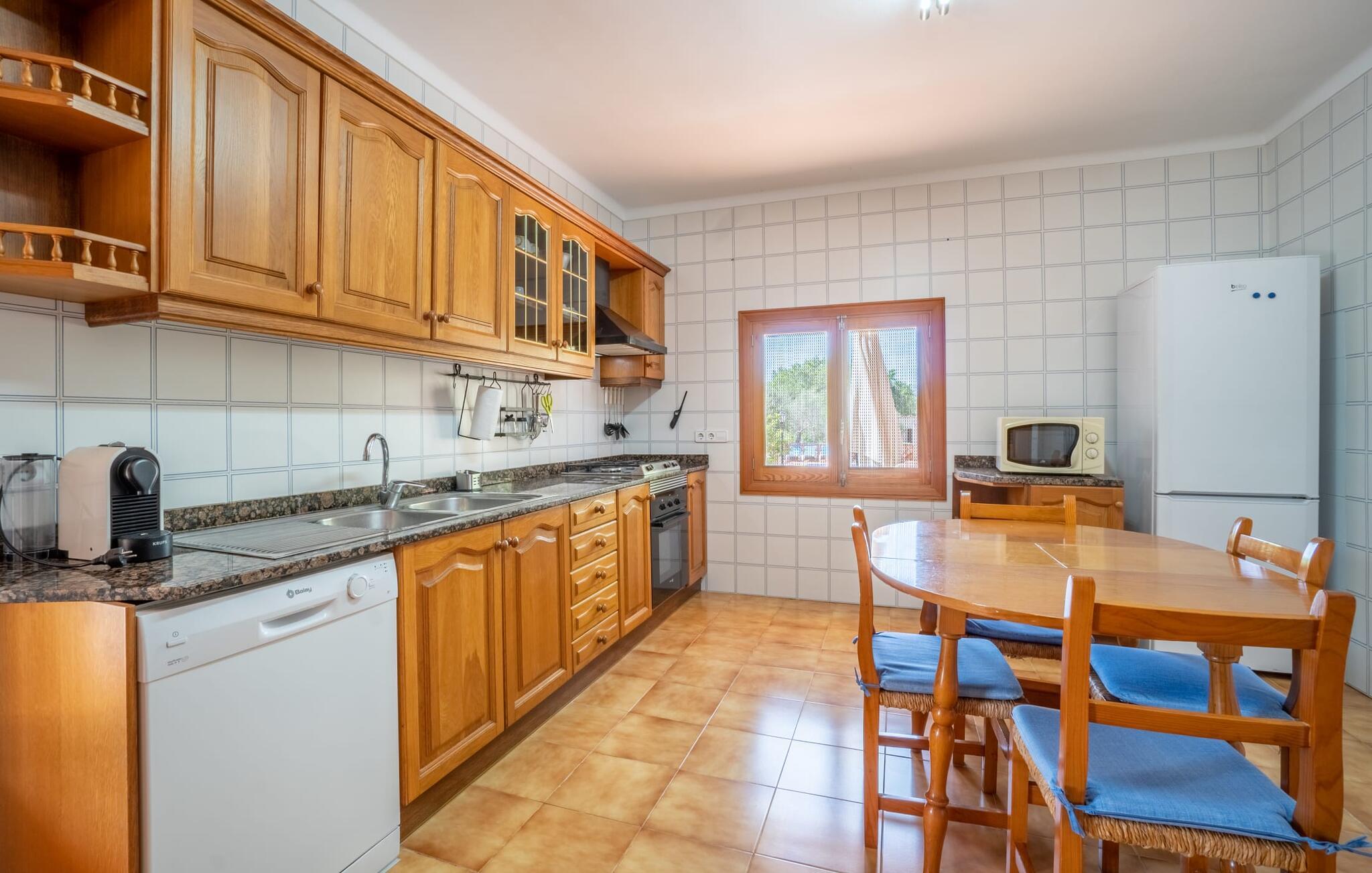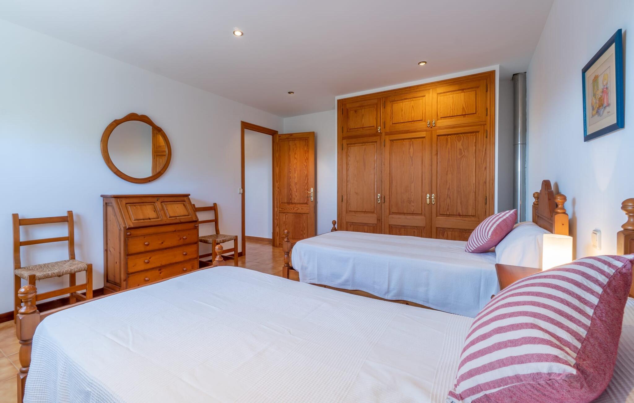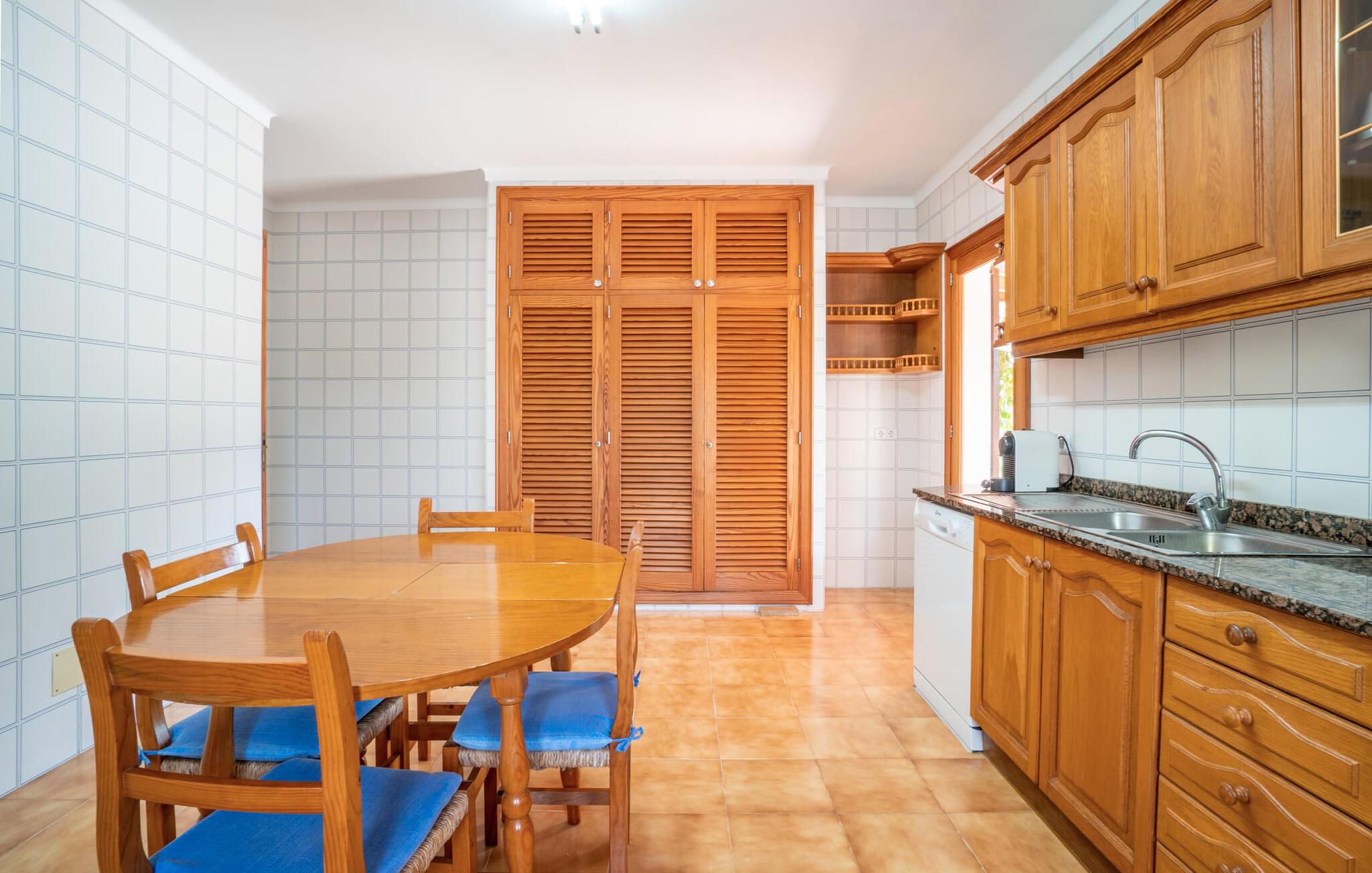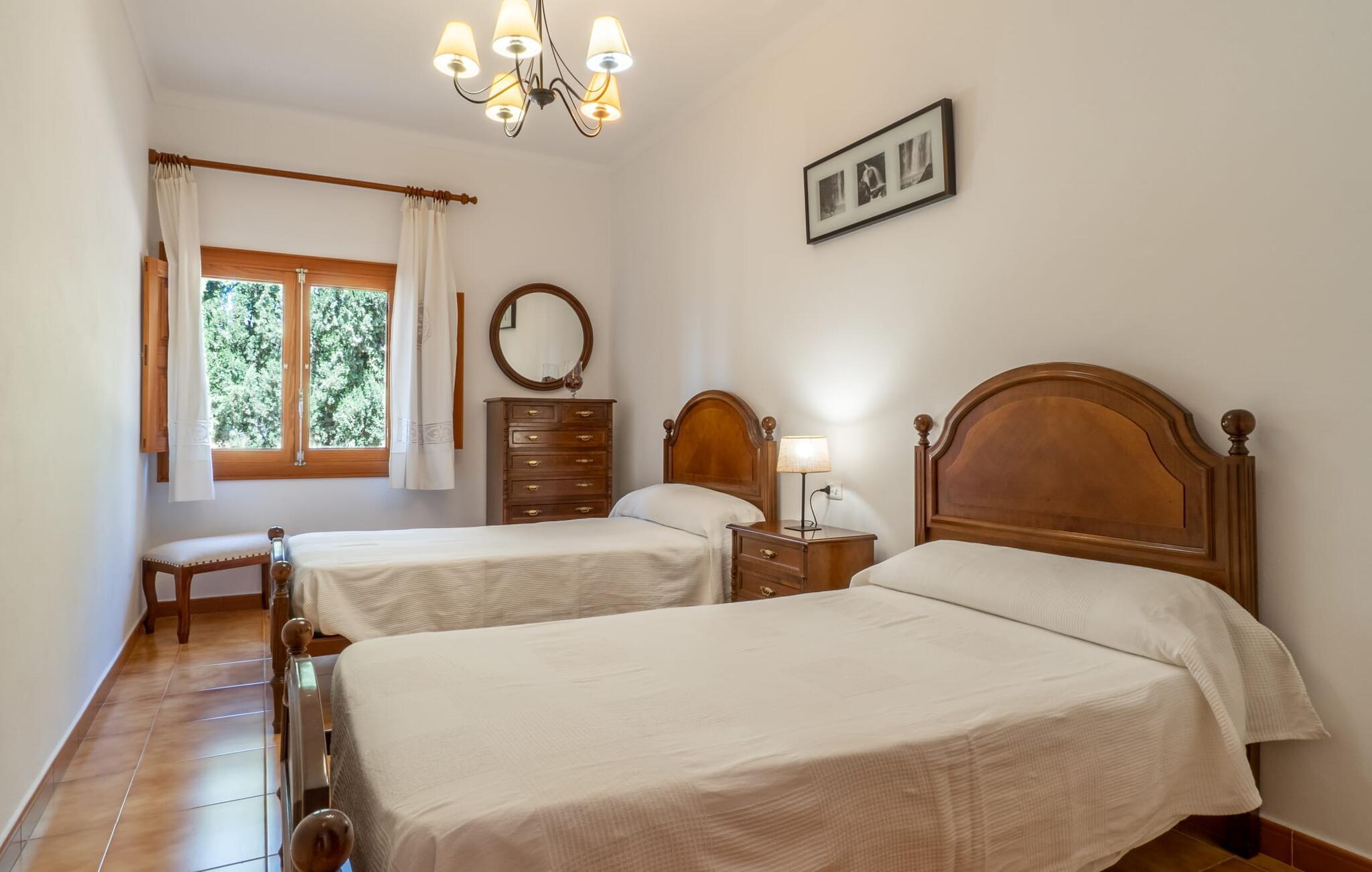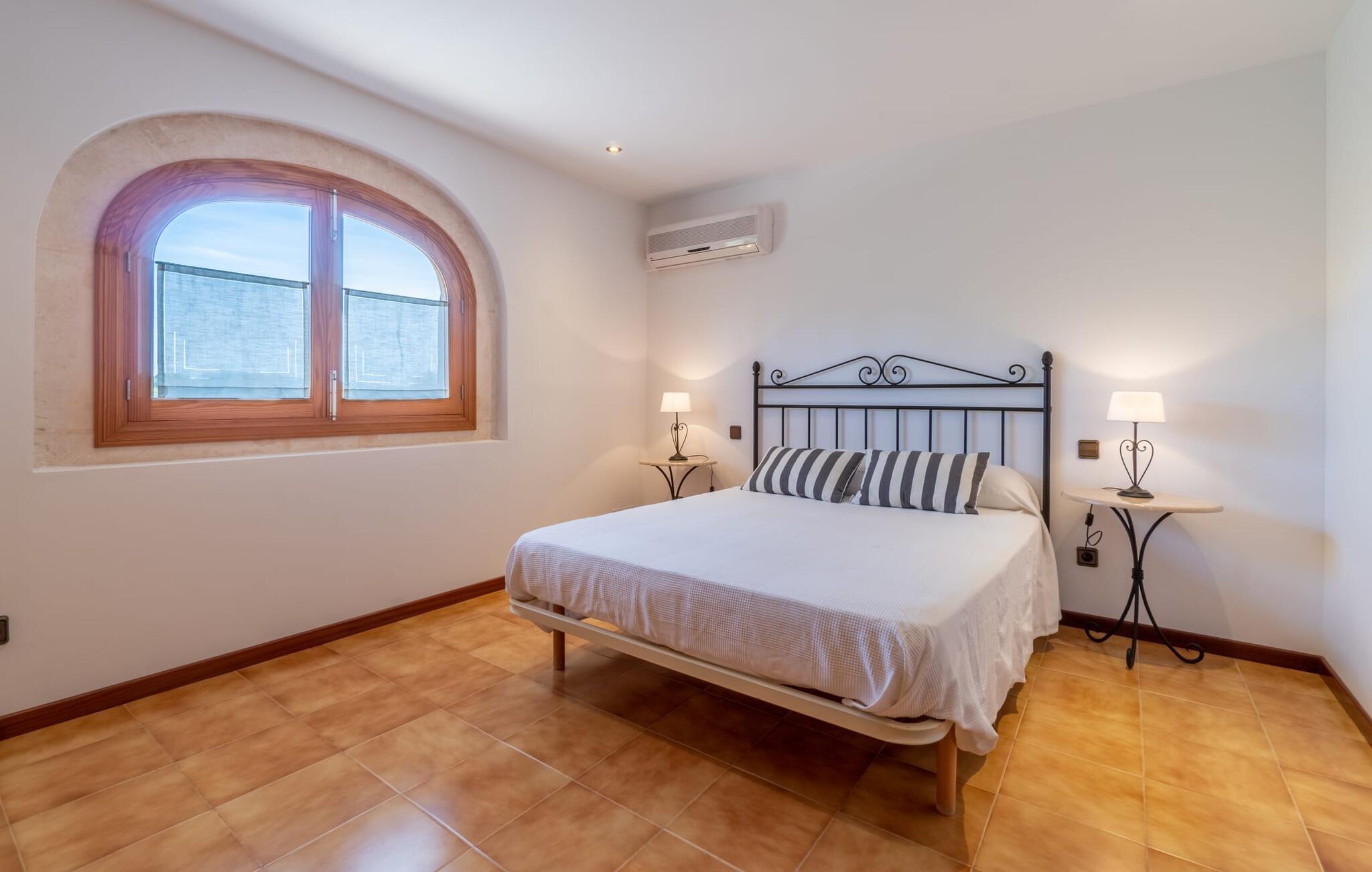 Det charmerende bondehus "Sa Vileta" skinner i solen. Det familievenlige feriehus er omgivet af en oaselignende have. Dette er naturligt dyrket med masser af græsplæner og et imponerende antal frugttræer. Der er også frodige blomstrende planter på de brolagte terrassearealer og omkring det rummelige poolområde. Det er ikke kun swimmingpoolen med rutsjebane, der er et højdepunkt for hele familien. De mange legemuligheder i haven samt bordtennisbordet og basketballkurven er virkelige højdepunkter for jeres børn. I mellemtiden kan voksne slappe af på liggestolene. Om aftenen kan I bruge grillen til en lækker BBQ. De to overdækkede terrasser med deres indbydende kurvebuer inviterer jer til at tilbringe jeres dyrebare ferietid hele dagen lang. Venner er hjerteligt velkomne. Det fantastisk beliggende stuehus afspejler den landlige atmosfære indenfor. Det hyggelige og rustikke feriehus byder på en harmonisk atmosfære. Terracotta og træ kombineres med moderne boligkomfort. Det fuldt udstyrede køkken på landet og den indendørs spisestue inviterer jer til at nyde måltider sammen. Tre badeværelser muliggør familievenlig brug for op til otte personer. Udover opholdsstue med TV er der fire lyse soveværelser med enkelt- eller dobbeltsenge. De lyse værelser tilbyder en smuk udsigt over den beroligende stilhed i den naturlige have. Takket være det varme-kolde klimaanlæg er der altid en behagelig temperatur i stuehuset. Det fremragende tekniske udstyr gør det også muligt at bruge det på hjemmekontoret. Kombiner ferie med arbejde og drag fordel af den kreative atmosfære i "Sa Vileta"-gården. Det familievenlige bondehus "Sa Vileta" er beliggende i en oase-lignende have i landlige omgivelser og alligevel kun få minutter fra den traditionelle landsby Sencelles. I nyder to gange af den behagelige centrale beliggenhed midt på øen: Der er kun 30 minutter i bil til øens hovedstad Palma eller den lange bugt Alcúdia med sine vidunderlige sandstrande.