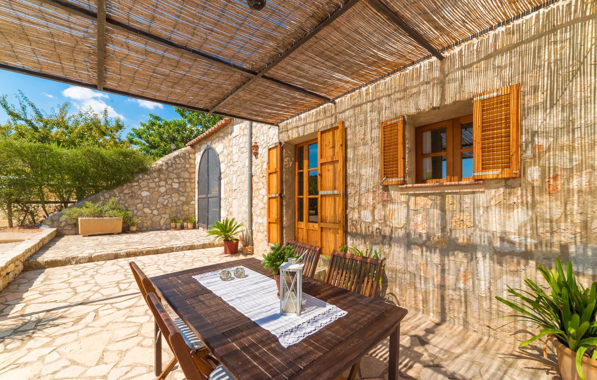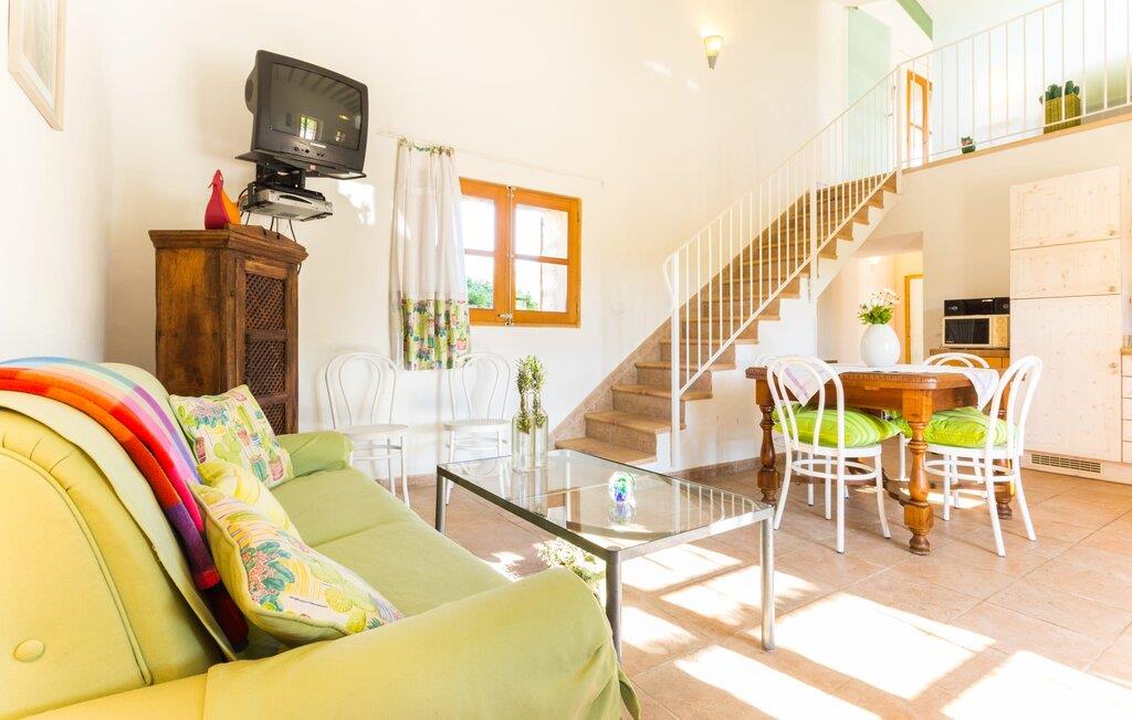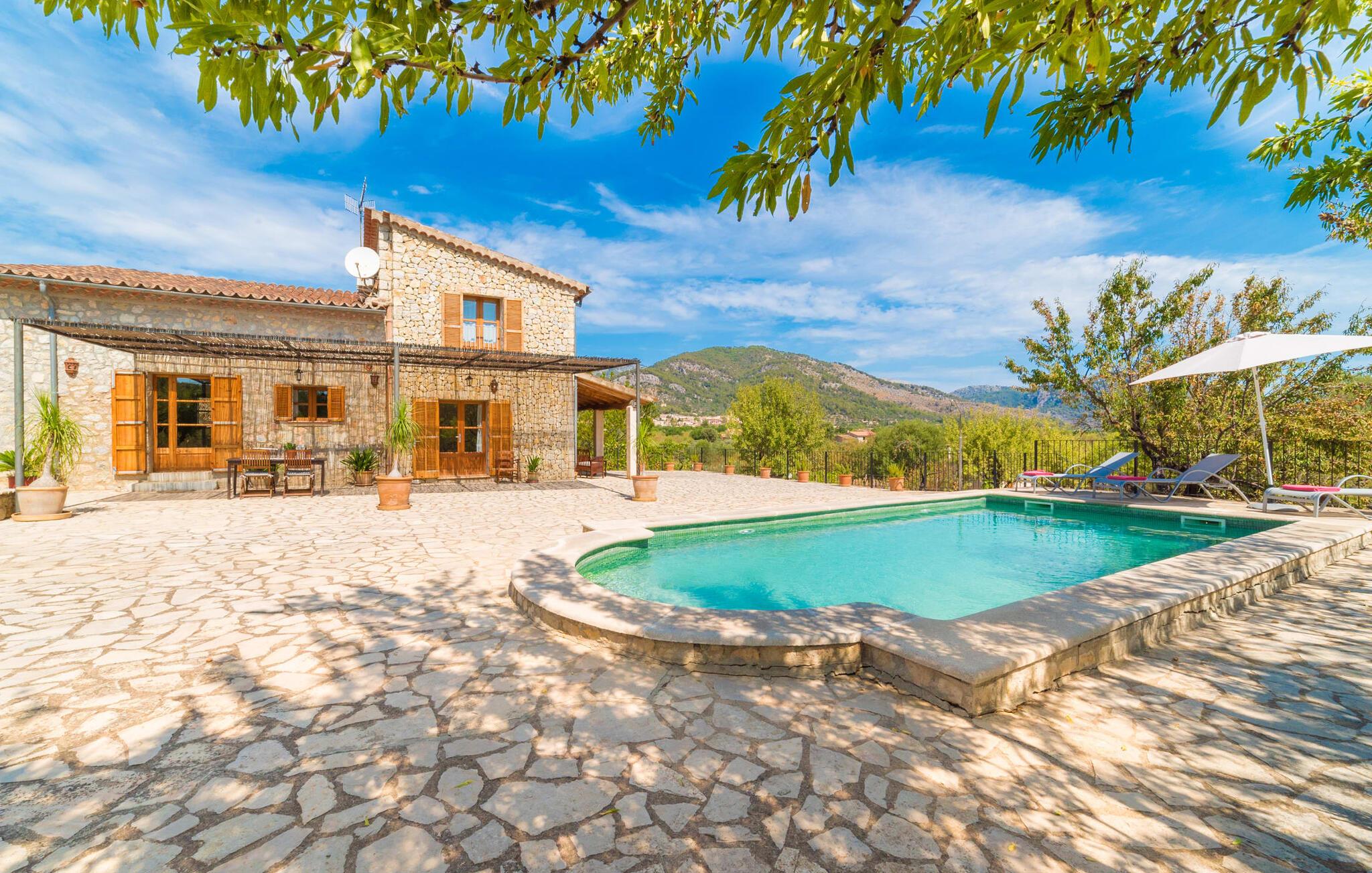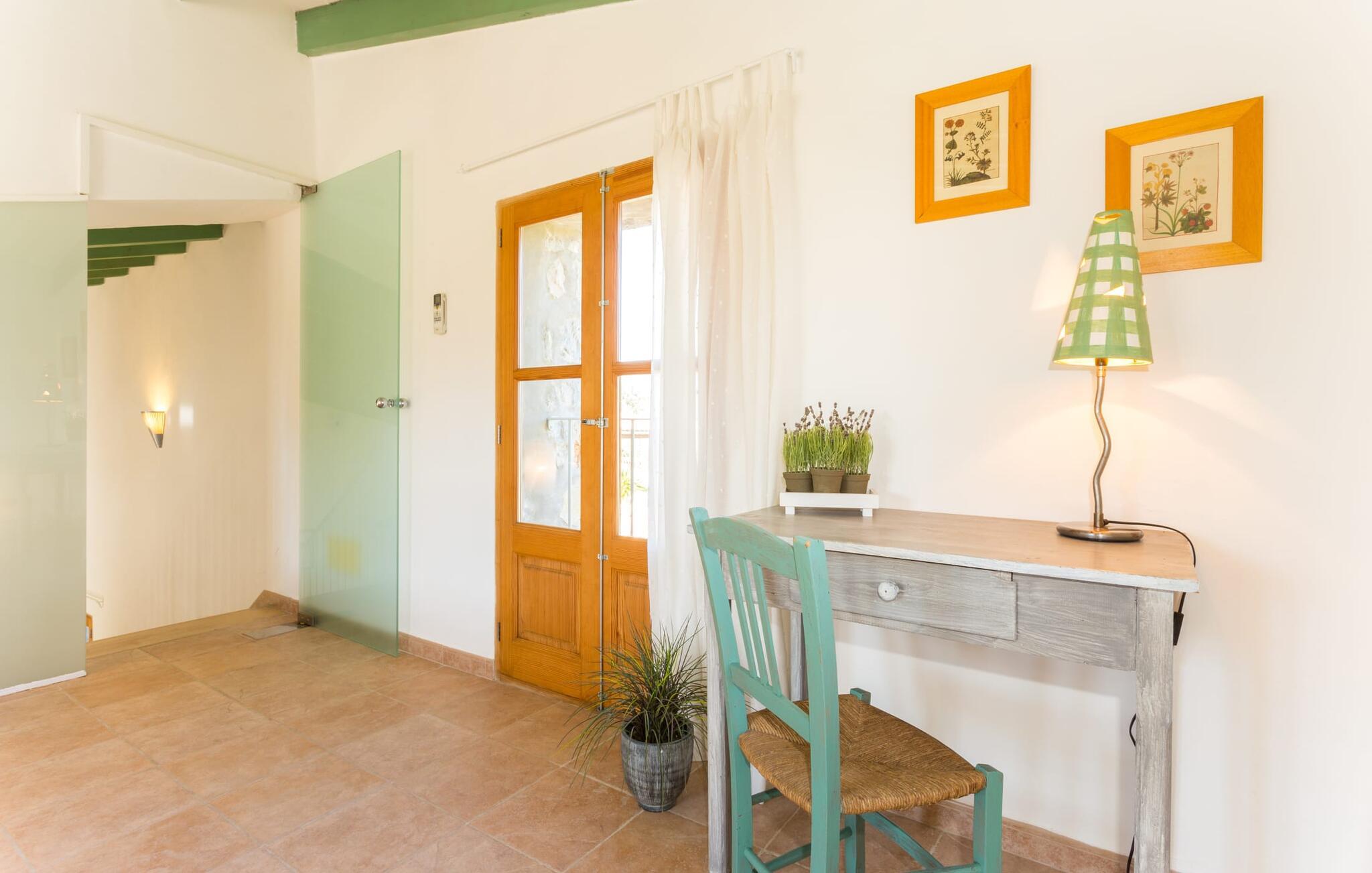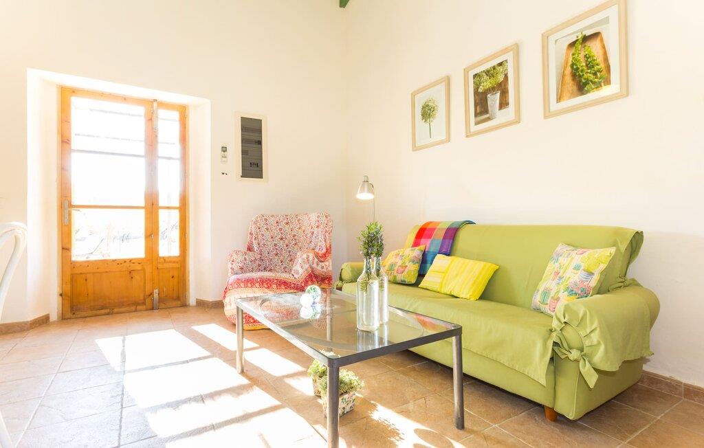 Naturstensvillaen "Sa Volta" byder sine gæster velkommen i en vidunderlig landlig idyl og omgivet af fortryllende middelhavscharme. Denne ekstraordinært venlige atmosfære får nytilkomne med det samme lyst til at blive. Udearealet i dette feriehus er præget af store terrassearealer beklædt med natursten og masser af grønt, som dekorativt indrammer dette maleriske billede. Poolen, som det centrale element i udendørsområdet, er et sandt blikfang med sine skinnende grønne mosaikfliser. Den har en dybde på op til 2,10 m og er meget let tilgængelig via trapper. På varme dage kan I forfriske jer dejligt i det kølende vand - og derefter slappe af i solen på de medfølgende liggestole og måske slet ikke lave noget. I er trods alt på ferie. Den medfølgende parasol beskytter jer mod overdreven UV-stråling. Huset byder på andre attraktive siddemuligheder fra solrige til halvskygge til skyggefulde. Med i alt syv muligheder for udendørs siddepladser er der stor variation, og alle vil finde deres personlige yndlingssted. Terrassen ved huset er et dejligt sted at nyde jeres måltider sammen. Afhængigt af tidspunktet på dagen byder dette sted på forskellige udsigter, der ændrer sig med solens position. Hver af dem har sin egen charme og vil give jer timevis af fornøjelse. Det indre af huset giver også en indbydende atmosfære. En høj og lyse stue/spisestue, designet med lyse og muntre farver og møbler, med et integreret køkken udgør det primære opholdsrum. Især den forfriskende grøn farve fremstår som et tilbagevendende element forskellige steder og giver den i forvejen hyggelige flair et ekstra harmonisk præg. Her finder I et hyggeligt sofahjørne, et lille spisebord til indendørs måltider og et fuldt udstyret, L-formet køkken, der byder på alt hvad I behøver til jeres daglige behov med brødrister, filterkaffemaskine og elkedel. Hvilken morgenlykke: at lave en aromatisk kop kaffe, blot træde ud af døren og stå under den åbne, dybblå himmel. En attraktiv trappe fører til husets første sal og byder på to charmerende, romantiske og moderne soveværelser. Ekstremt originale designelementer i sengenes hovedender giver rummene en meget individuel og meget stilfuld karakter. Det moderne design fortsætter konsekvent i badeværelset og byder på dagslys og møbler af høj kvalitet. Et strygejern og en hårtørrer er bekvemt tilgængelige og behøver ikke at medbringes i jeres bagage. Den lille villa "Sa Volta" ligger roligt i udkanten af Selva på den nordlige del af øen. Det er omgivet af smuk natur. Byens centrum ligger kun 10 minutters gang væk. Nær den maleriske bjerglandsby Caimari (1,4 km) ligger huset tæt på de imponerende Tramuntana-bjerge. De smukke bugter og strande på den nordlige og østlige del af øen kan også nemt nås i bil fra dette feriehus. Turen til lufthavnen tager 35 minutter. Så tæt på naturen og alligevel bekvemt placeret, kan I tilbringe en varieret og fuldstændig tilfredsstillende ferie i villaen "Sa Volta".