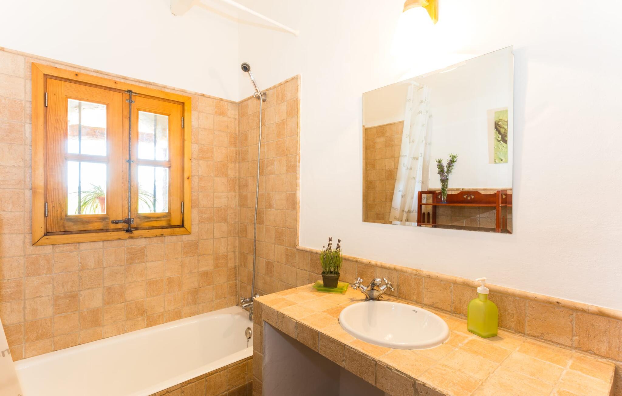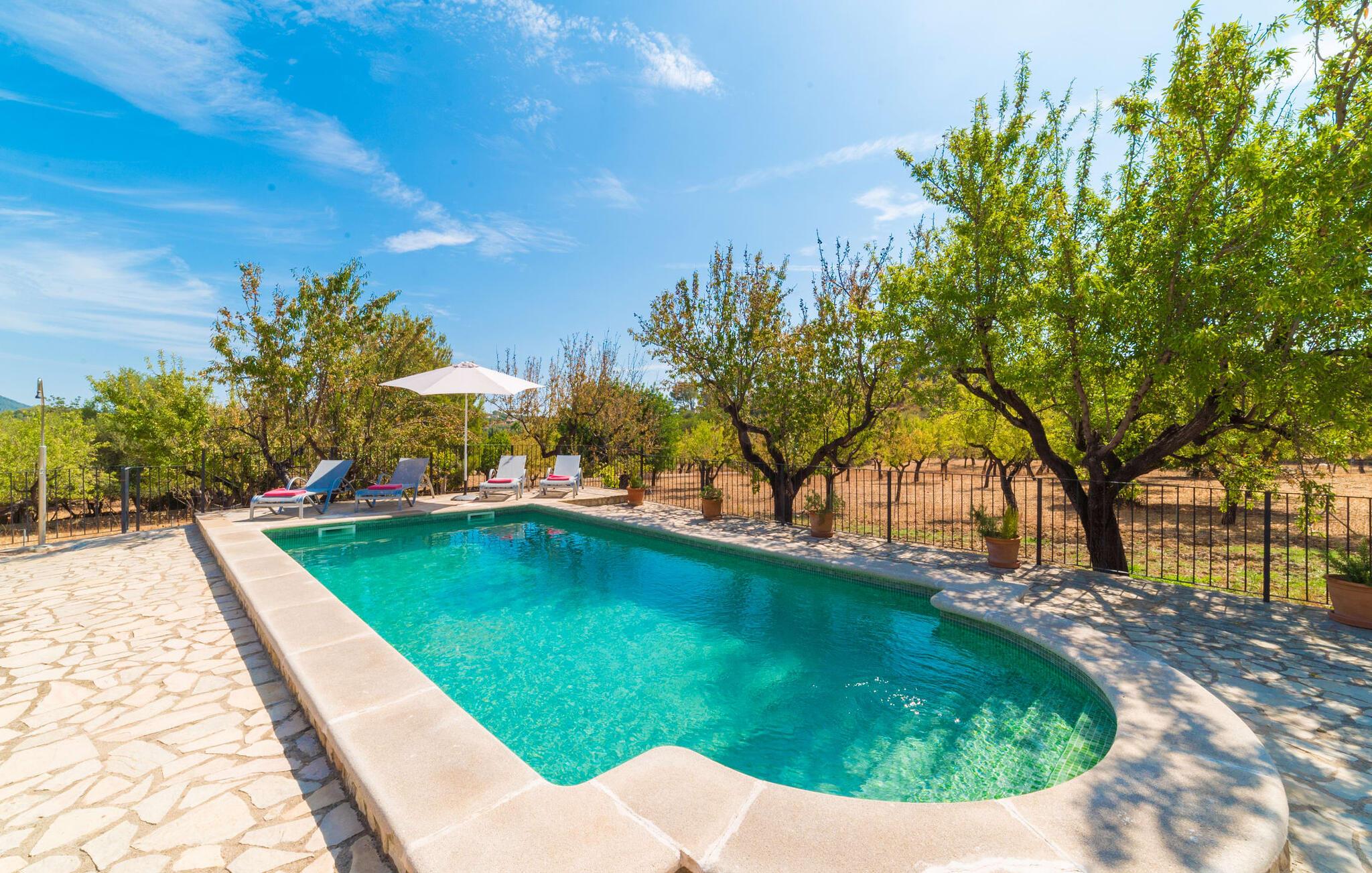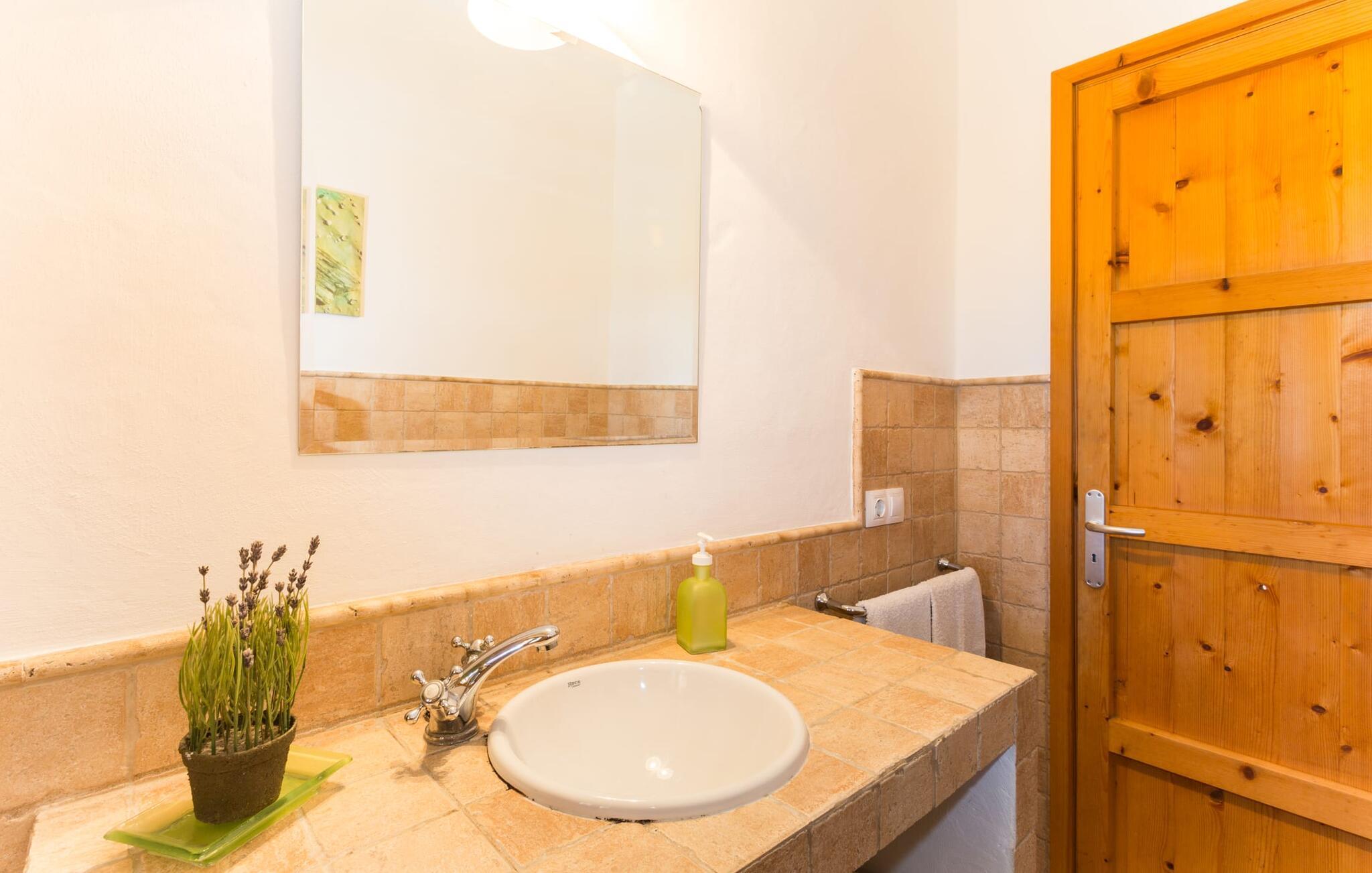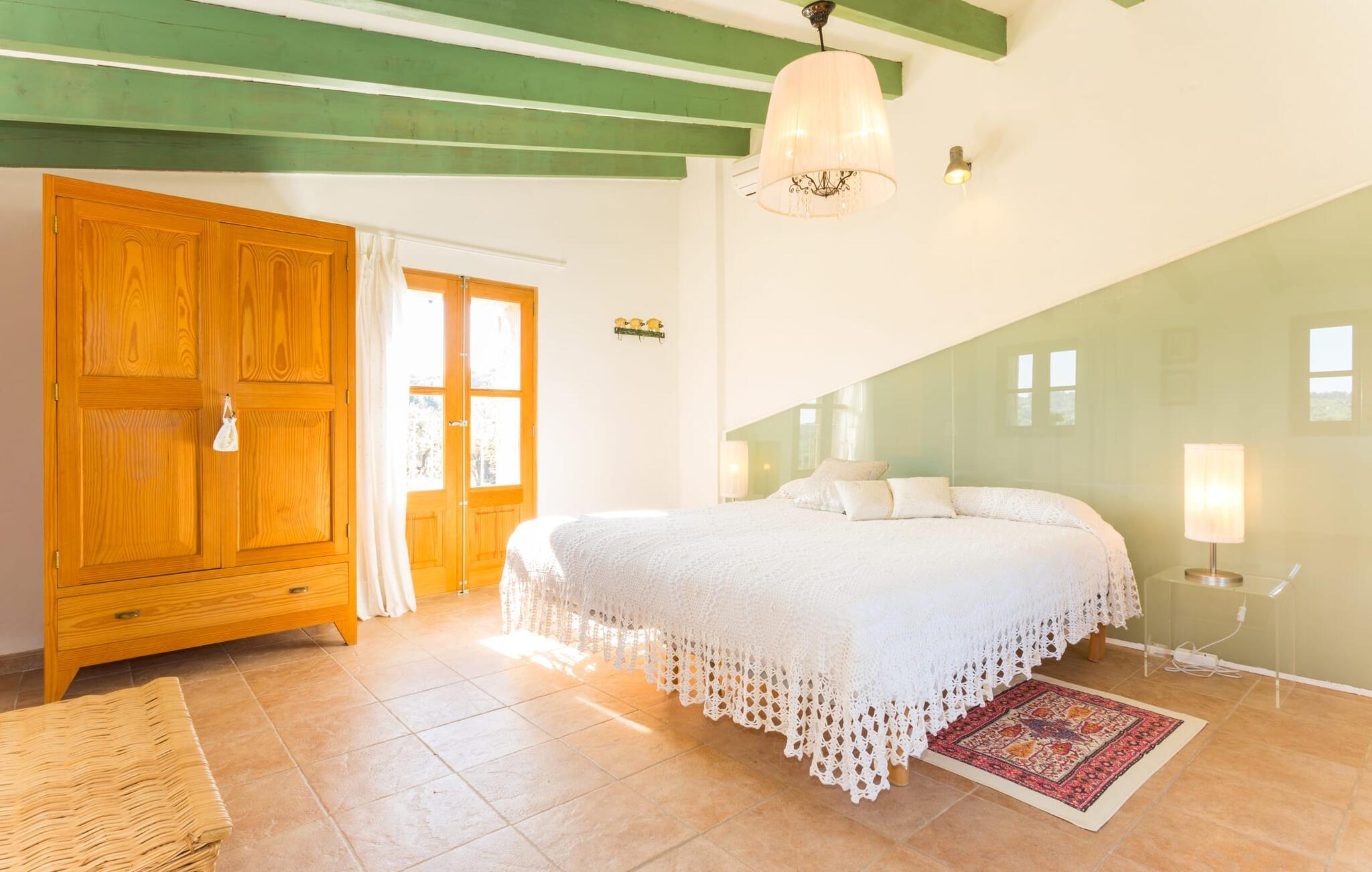 Naturstensvillaen "Sa Volta" byder sine gæster velkommen i en vidunderlig landlig idyl og omgivet af fortryllende middelhavscharme. Denne ekstraordinært venlige atmosfære får nytilkomne med det samme lyst til at blive. Udearealet i dette feriehus er præget af store terrassearealer beklædt med natursten og masser af grønt, som dekorativt indrammer dette maleriske billede. Poolen, som det centrale element i udendørsområdet, er et sandt blikfang med sine skinnende grønne mosaikfliser. Den har en dybde på op til 2,10 m og er meget let tilgængelig via trapper. På varme dage kan I forfriske jer dejligt i det kølende vand - og derefter slappe af i solen på de medfølgende liggestole og måske slet ikke lave noget. I er trods alt på ferie. Den medfølgende parasol beskytter jer mod overdreven UV-stråling. Huset byder på andre attraktive siddemuligheder fra solrige til halvskygge til skyggefulde. Med i alt syv muligheder for udendørs siddepladser er der stor variation, og alle vil finde deres personlige yndlingssted. Terrassen ved huset er et dejligt sted at nyde jeres måltider sammen. Afhængigt af tidspunktet på dagen byder dette sted på forskellige udsigter, der ændrer sig med solens position. Hver af dem har sin egen charme og vil give jer timevis af fornøjelse. Det indre af huset giver også en indbydende atmosfære. En høj og lyse stue/spisestue, designet med lyse og muntre farver og møbler, med et integreret køkken udgør det primære opholdsrum. Især den forfriskende grøn farve fremstår som et tilbagevendende element forskellige steder og giver den i forvejen hyggelige flair et ekstra harmonisk præg. Her finder I et hyggeligt sofahjørne, et lille spisebord til indendørs måltider og et fuldt udstyret, L-formet køkken, der byder på alt hvad I behøver til jeres daglige behov med brødrister, filterkaffemaskine og elkedel. Hvilken morgenlykke: at lave en aromatisk kop kaffe, blot træde ud af døren og stå under den åbne, dybblå himmel. En attraktiv trappe fører til husets første sal og byder på to charmerende, romantiske og moderne soveværelser. Ekstremt originale designelementer i sengenes hovedender giver rummene en meget individuel og meget stilfuld karakter. Det moderne design fortsætter konsekvent i badeværelset og byder på dagslys og møbler af høj kvalitet. Et strygejern og en hårtørrer er bekvemt tilgængelige og behøver ikke at medbringes i jeres bagage. Den lille villa "Sa Volta" ligger roligt i udkanten af Selva på den nordlige del af øen. Det er omgivet af smuk natur. Byens centrum ligger kun 10 minutters gang væk. Nær den maleriske bjerglandsby Caimari (1,4 km) ligger huset tæt på de imponerende Tramuntana-bjerge. De smukke bugter og strande på den nordlige og østlige del af øen kan også nemt nås i bil fra dette feriehus. Turen til lufthavnen tager 35 minutter. Så tæt på naturen og alligevel bekvemt placeret, kan I tilbringe en varieret og fuldstændig tilfredsstillende ferie i villaen "Sa Volta".