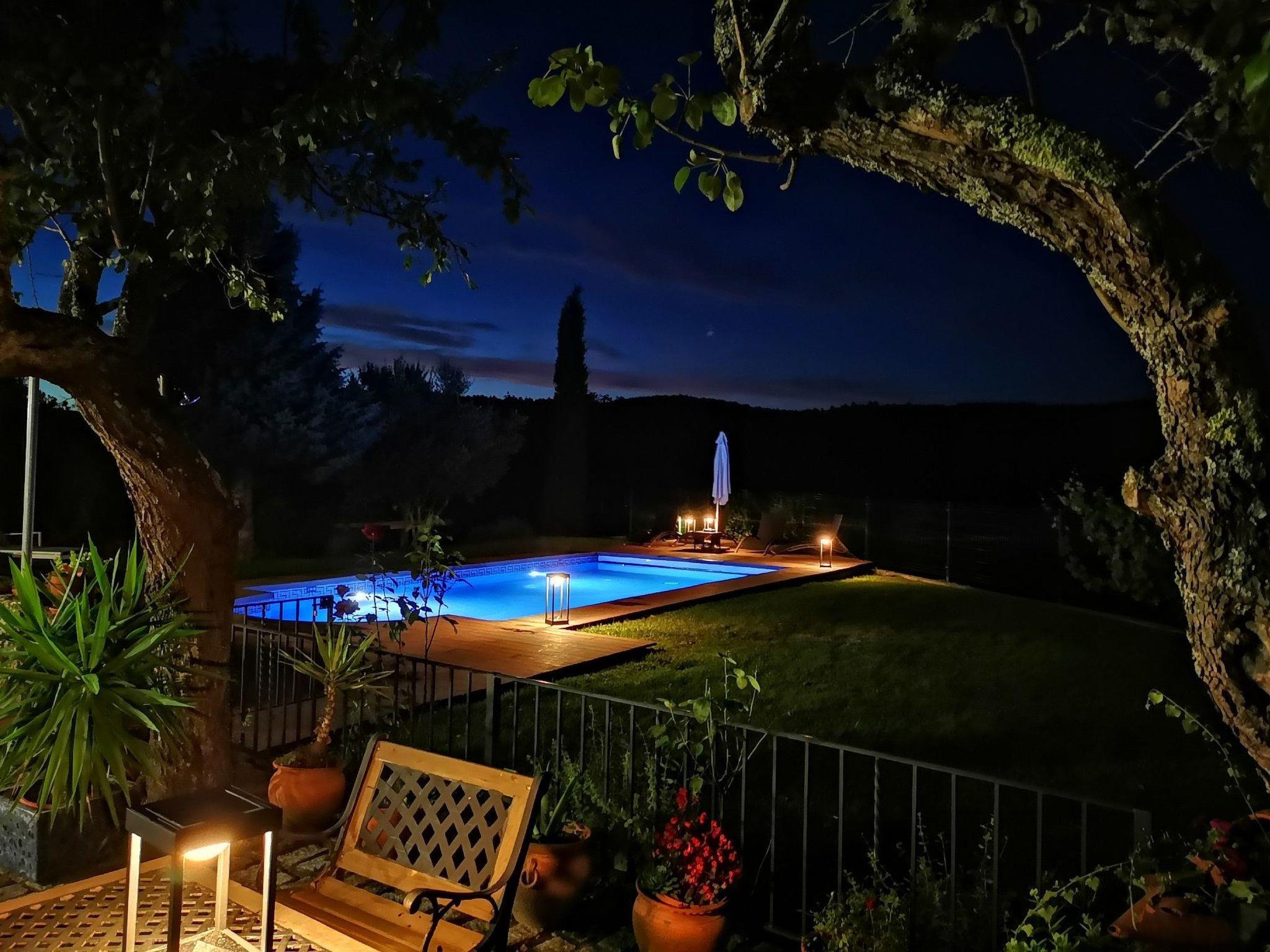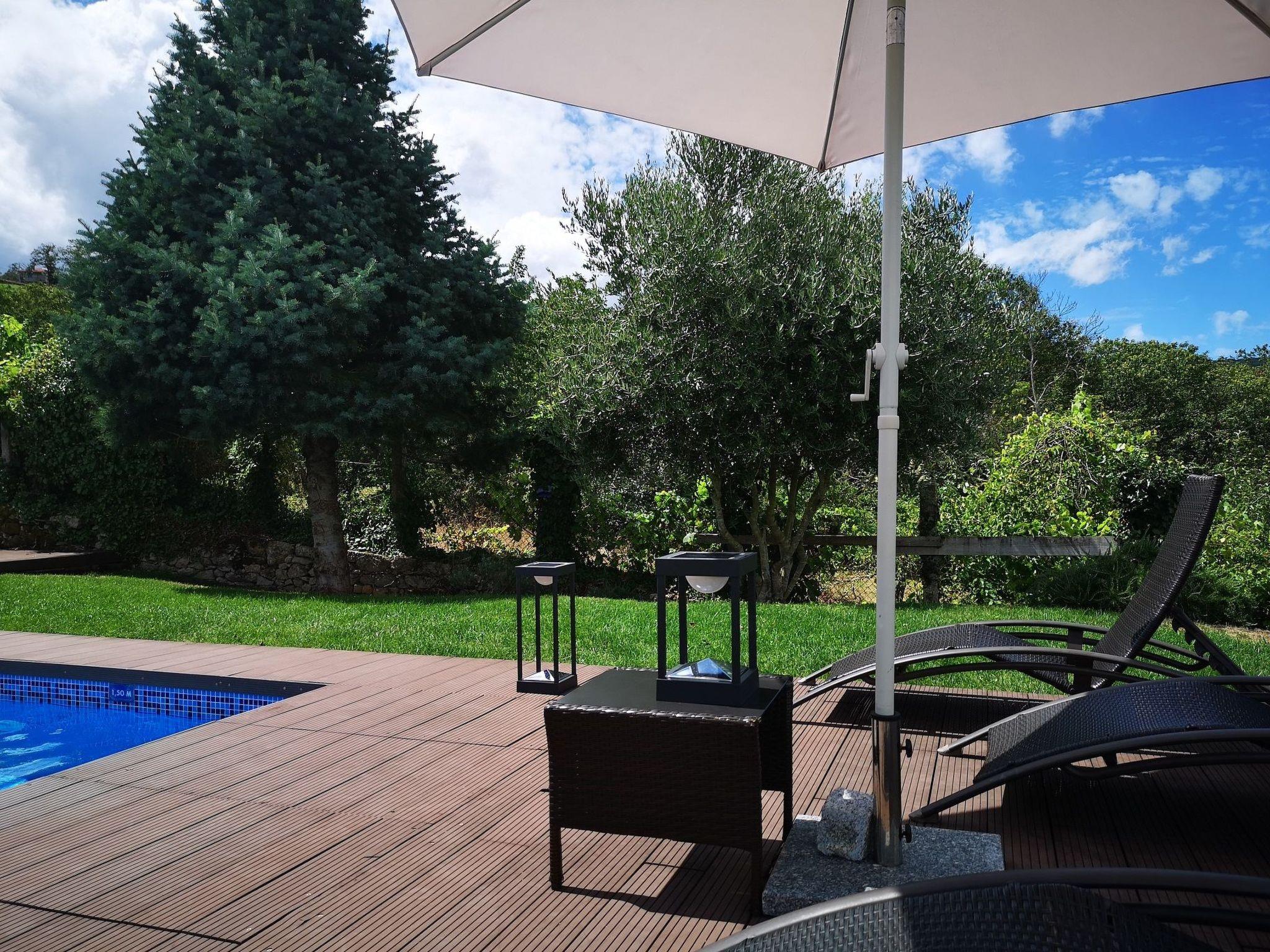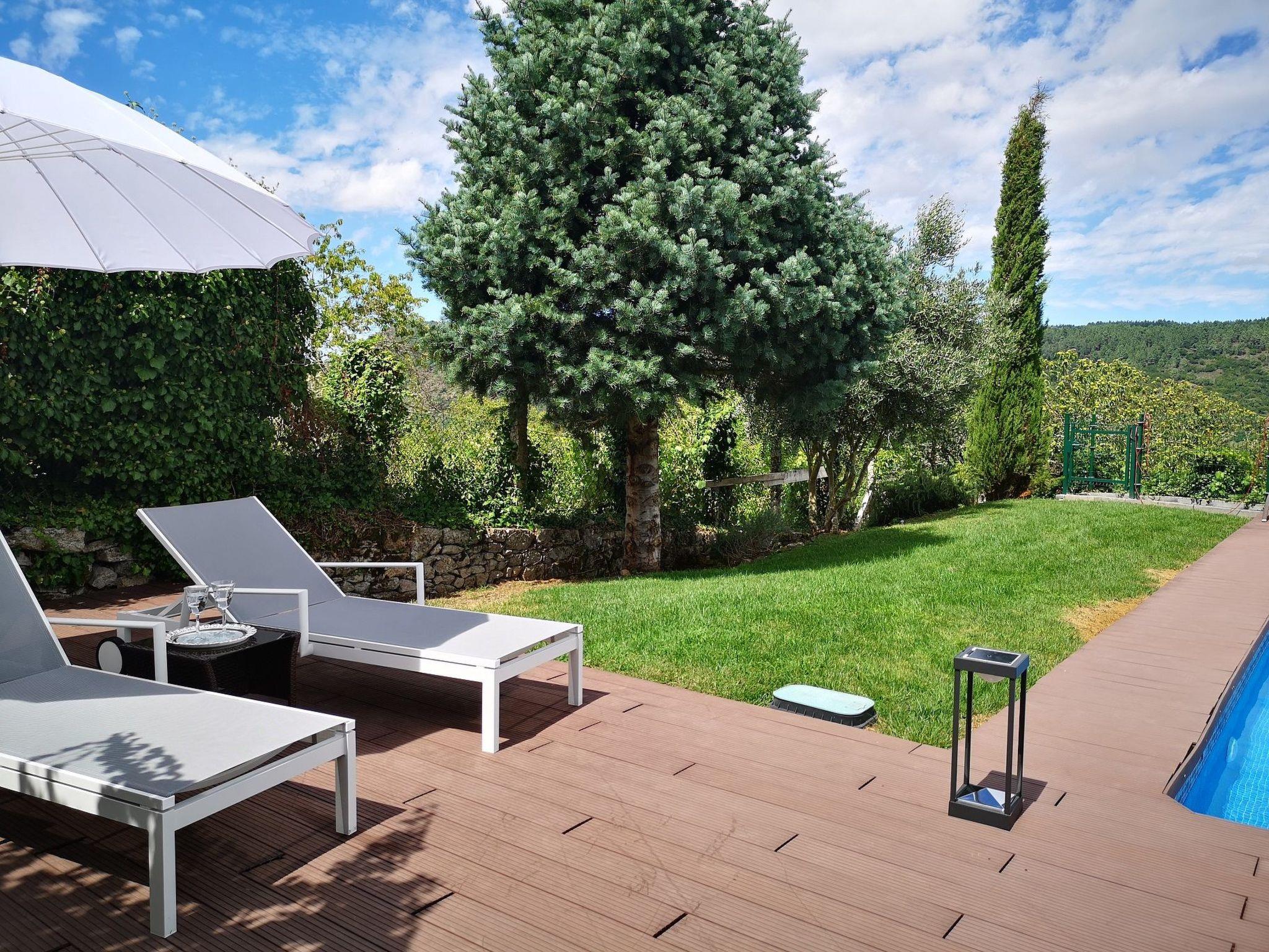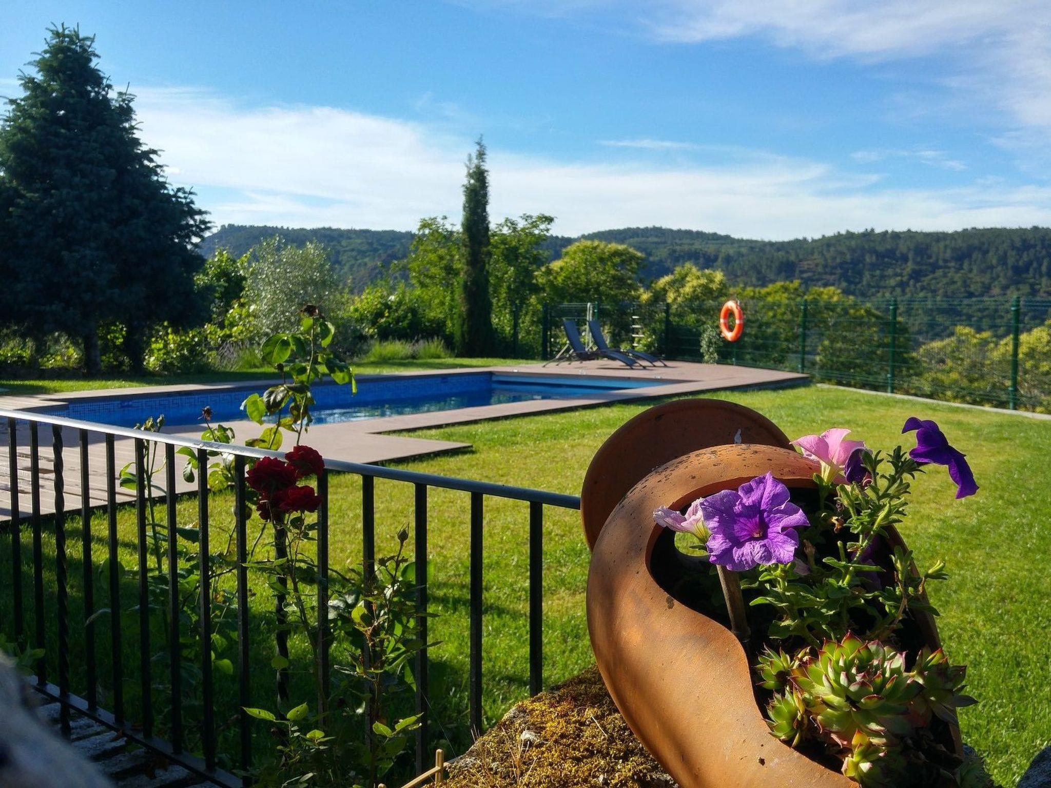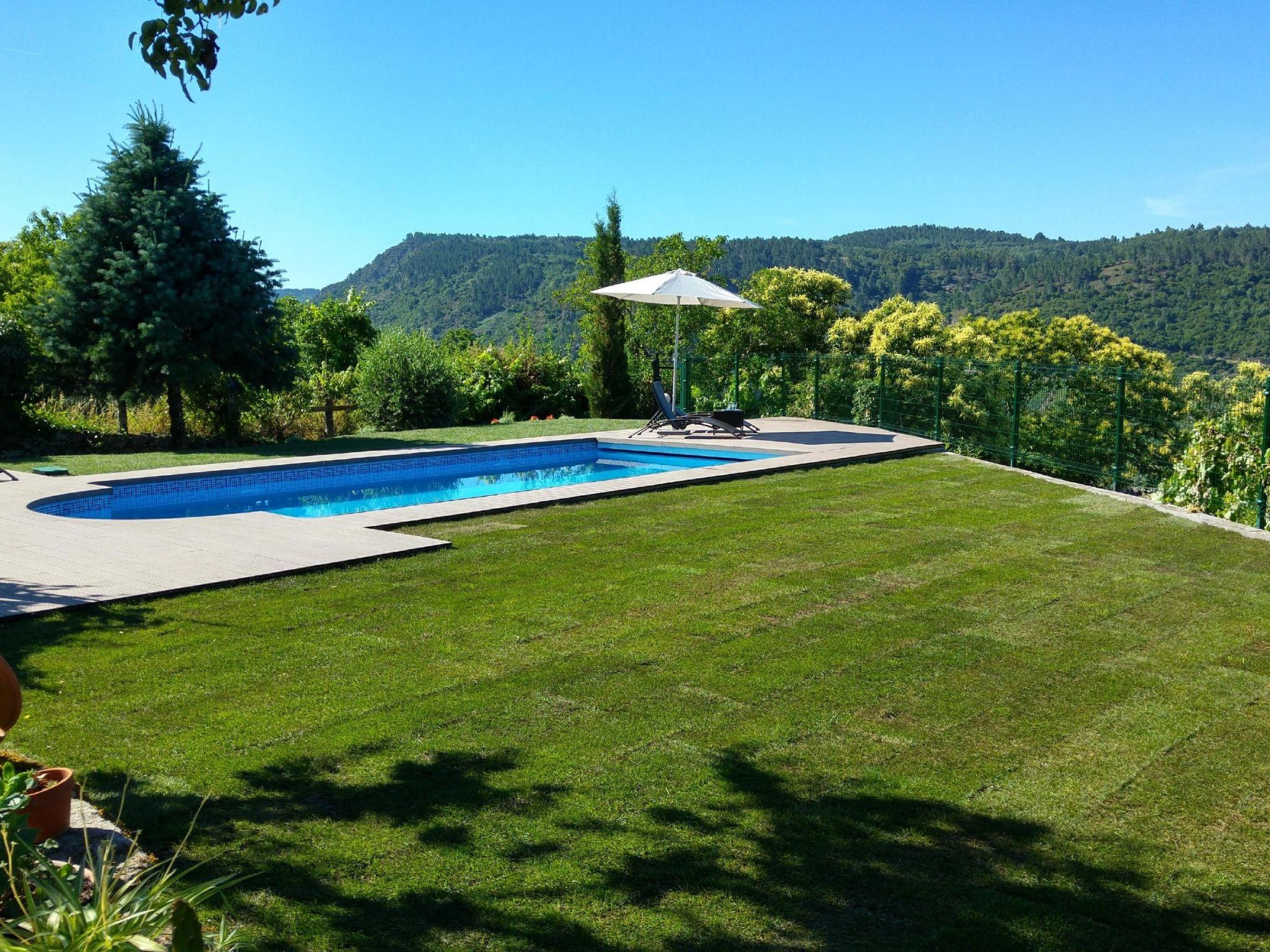 Im Garten steht Ihnen der private Pool (4x8 m, Wassertiefe max. 1,5 m) zur Verfügung. Es gbit viel Rasen und eine große Liegefläche mit herrlicher Aussicht auf die Berge und das Tal.