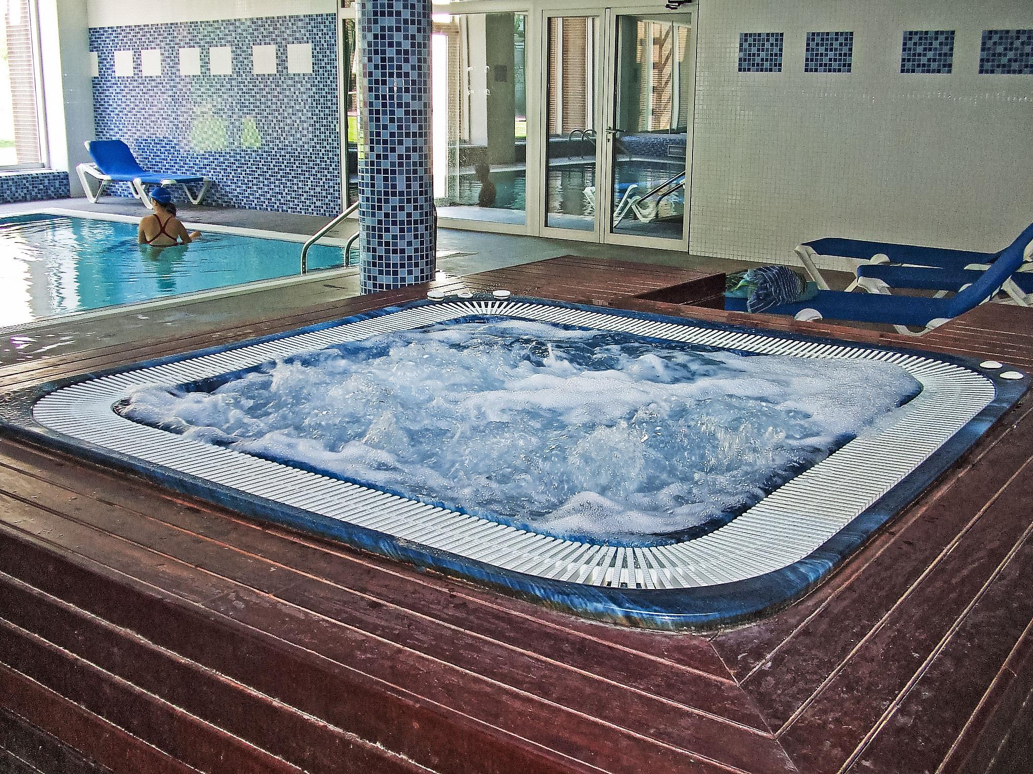 SALOU: Cosy, comfortable apartment block "Aquaria". In a central, busy position, 800 m from the sea, 800 m from the beach. For shared use: well-kept terraced garden lawn, swimming pool, indoor pool heated (seasonal availability: 01.Jan. - 31.Dec. and 16:00-20:00). In the complex: sauna, fitness room, hot tub (all included), lift. Roofed, parking space n 13. Shop, grocery 200 m, shopping centre 100 m, restaurant, bakery 200 m, café, bus stop 100 m, sandy beach 500 m. Golf course (18 hole) 2 km. Nearby attractions: Parque temático Portaventura 300 m, Parque aquático Aquapolis 3 km, Spa Aquum 3 km, Karting 2 km, Paintball 8 km. Object suitable for 4 adults + 3 children. The owner does not accept any youth groups.