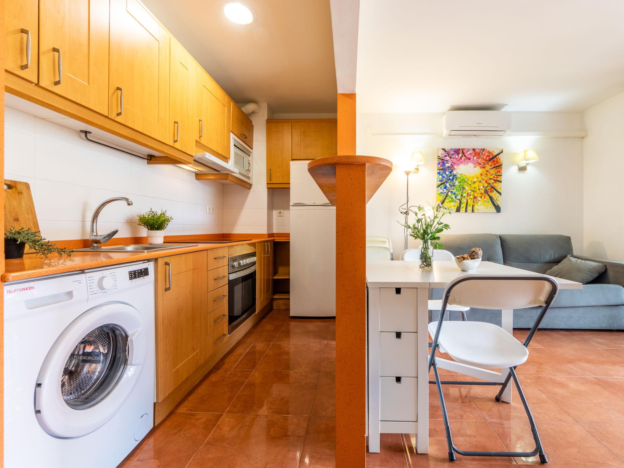 "Mercuri", 2-room apartment 41 m2 on 2nd floor. Practical furnishings: living/dining room with digital TV. Exit to the terrace. 1 room with 1 sofabed (135 cm, length 190 cm), 1 french bed (150 cm, length 190 cm). Open kitchen (oven, 4 ceramic glass hob hotplates, kettle, microwave, electric coffee machine). Shower/bidet/WC. Air-conditioning, forced-air heating, boiler (80 litres). Terrace furniture. View of the resort. Facilities: washing machine, iron, hair dryer. Parking space n 55 Calle Burguera 2 (extra) at 200 m, height 200 cm, width 180 cm. Please note: non-smokers only. HUTT-042467 // Reg. Nr.: ESFCTU00004302400026002300000000000000000HUTT-0424677