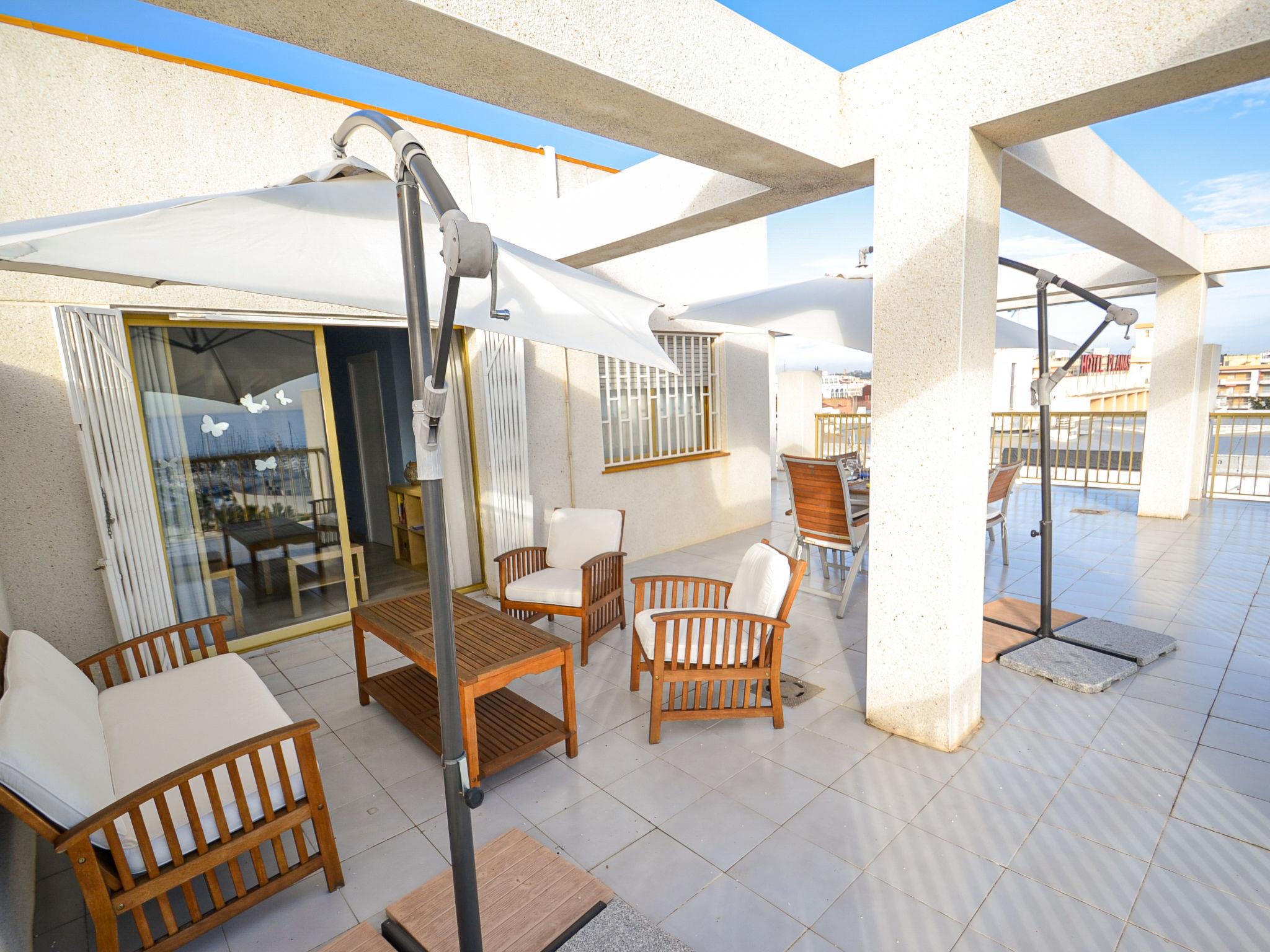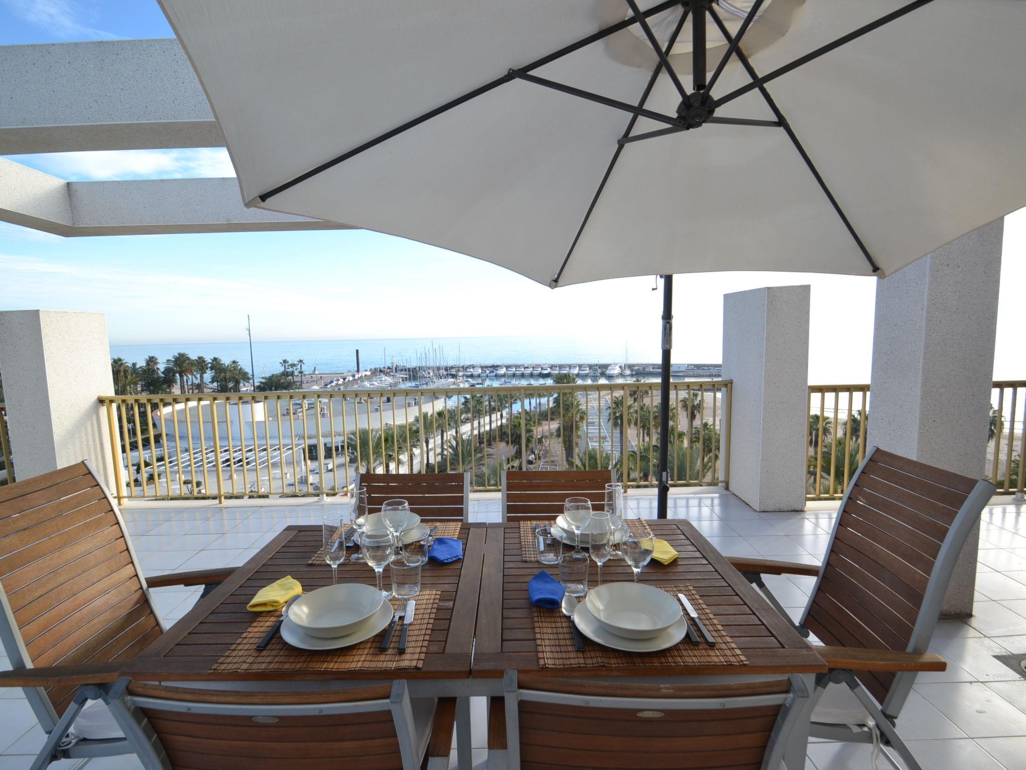 "Atico Miramar", 4-room penthouse 60 m2 on 6th floor. Spacious and bright, comfortable and tasteful furnishings: living/dining room with dining table, digital TV, air conditioning and forced-air heating. Exit to the terrace. 1 room with 2 beds (90 cm). 1 room with 2 beds (90 cm). 1 room with 1 french bed (150 cm, length 190 cm). Large kitchen (oven, dishwasher, 4 ceramic glass hob hotplates, toaster, kettle, microwave, electric coffee machine, Capsules for coffee machine (Nespresso) extra). Exit to the terrace. 2 baths/WC. Heating not available in all rooms. Large terrace 130 m2. Terrace furniture, barbecue, deck chairs. Beautiful view of the sea. Facilities: washing machine, iron, hair dryer. Internet (WiFi, free). Garage space n 29, height 185 cm, width 220 cm. Please note: non-smokers only, parking space for small car only. HUTT-007190 // Reg. Nr.: ESFCTU00004302400035843000000000000000000HUTT-0071901