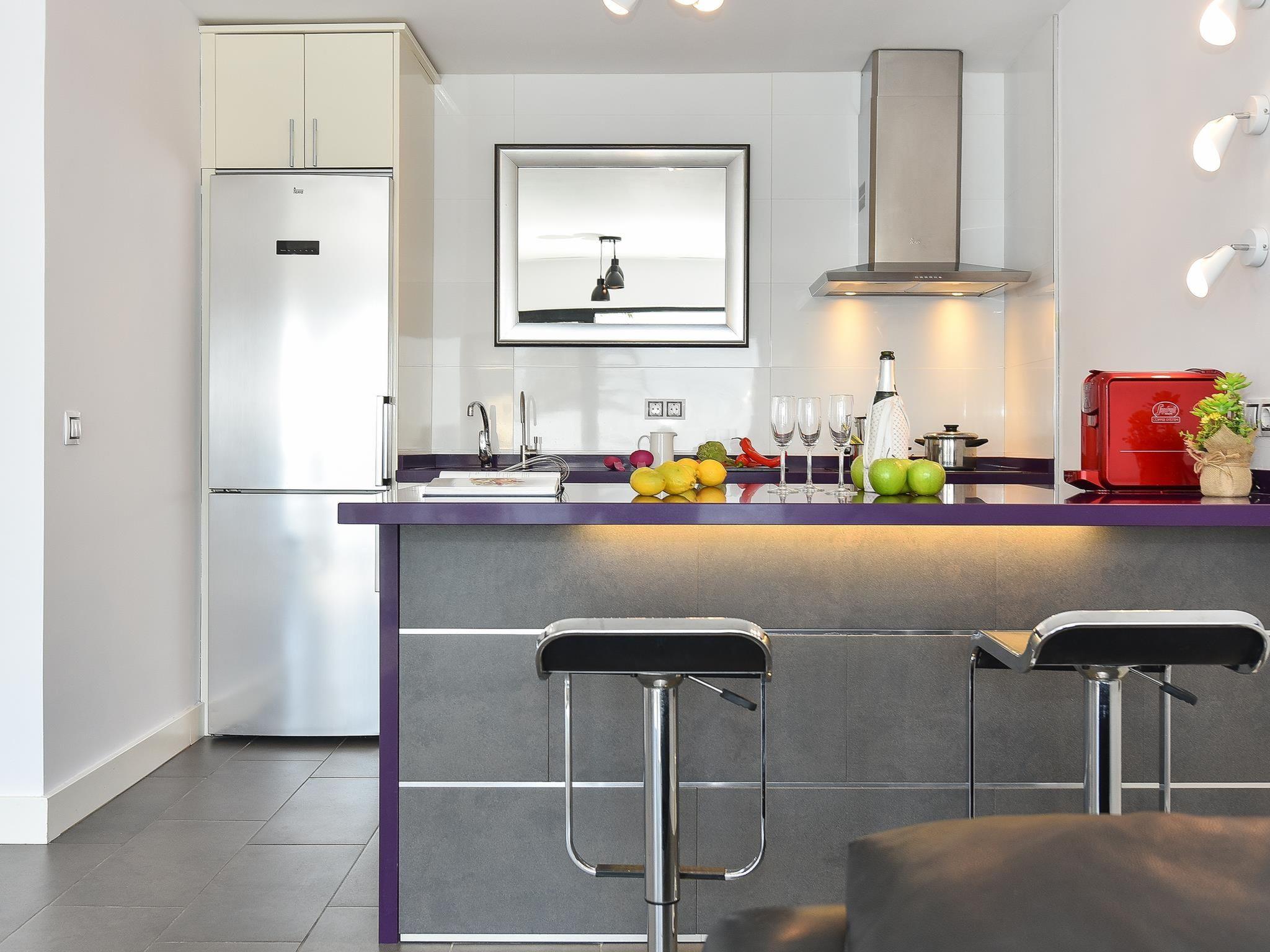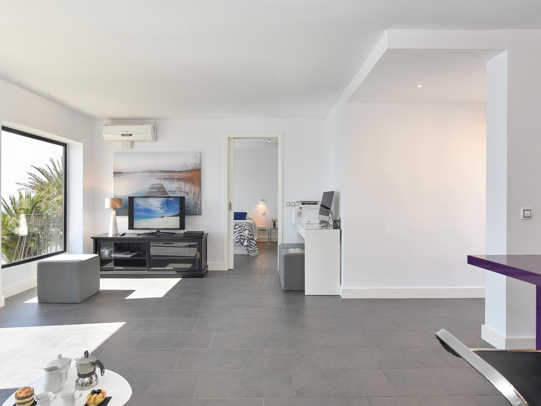2-room apartment 60 m2, on the upper floor. Comfortable and cosy furnishings: living room with dining nook, satellite TV, cable TV, digital TV and air conditioning. Exit to the balcony. 1 room with 1 french bed and air conditioning. Open kitchen (oven, dishwasher, 3 ceramic glass hob hotplates, toaster, kettle, microwave, freezer, electric coffee machine). Shower/WC, sep. WC. Small balcony. Marvellous view of the sea. Facilities: washing machine, safe, iron, children's high chair, baby cot for up to 2 year olds, hair dryer. Internet (WiFi, free). Please note: non-smokers only. 2021-T6528 // Reg. Nr.: ESFCTU0000350120005022130000000000000VV-35-1-00161343