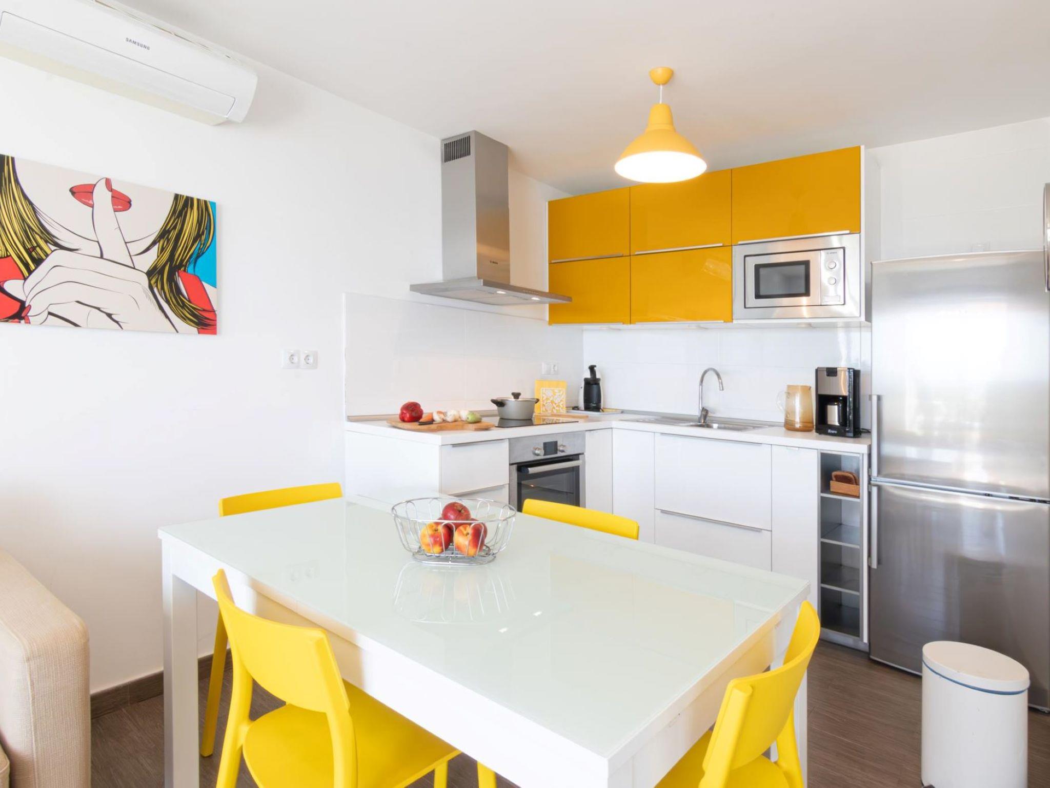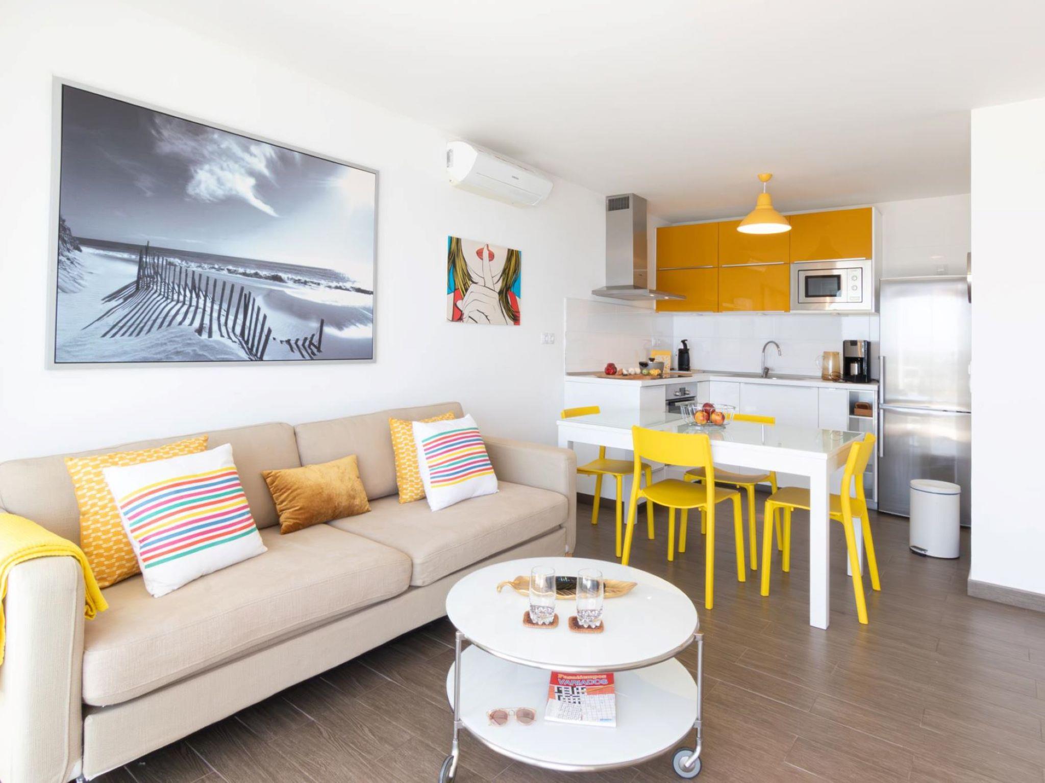 "Nueva Suecia 515", 3-room apartment. Object suitable for 4 adults. Very practical and cosy furnishings: living/dining room with TV, flat screen and air conditioning. Exit to the terrace. 1 room with 1 double bed (150 cm, length 200 cm). 1 room with 2 beds (90 cm, length 190 cm). Open kitchen (oven, dishwasher, 4 ceramic glass hob hotplates, toaster, kettle, microwave, freezer, electric coffee machine) with dining table. Shower/WC. Parquet floors. Porch. Terrace furniture. Very beautiful panoramic view of the sea. Facilities: washing machine, dryer, children's high chair, baby cot for up to 2 year olds, hair dryer. Internet (WiFi). Please note: non-smokers only. VV-35-1-0024287 // Reg. Nr.: ESFCTU00003501200014154200000000000000000000000000008