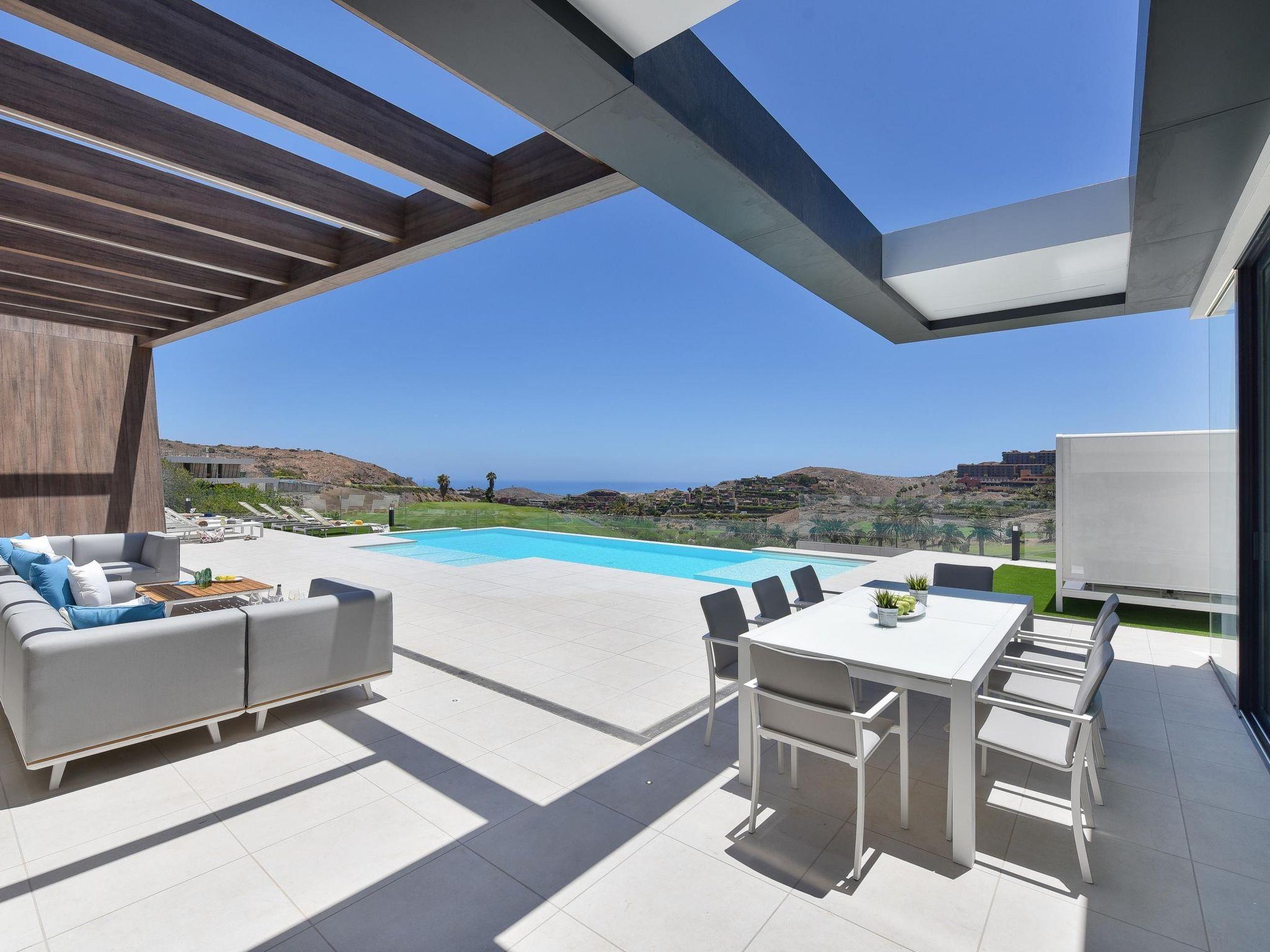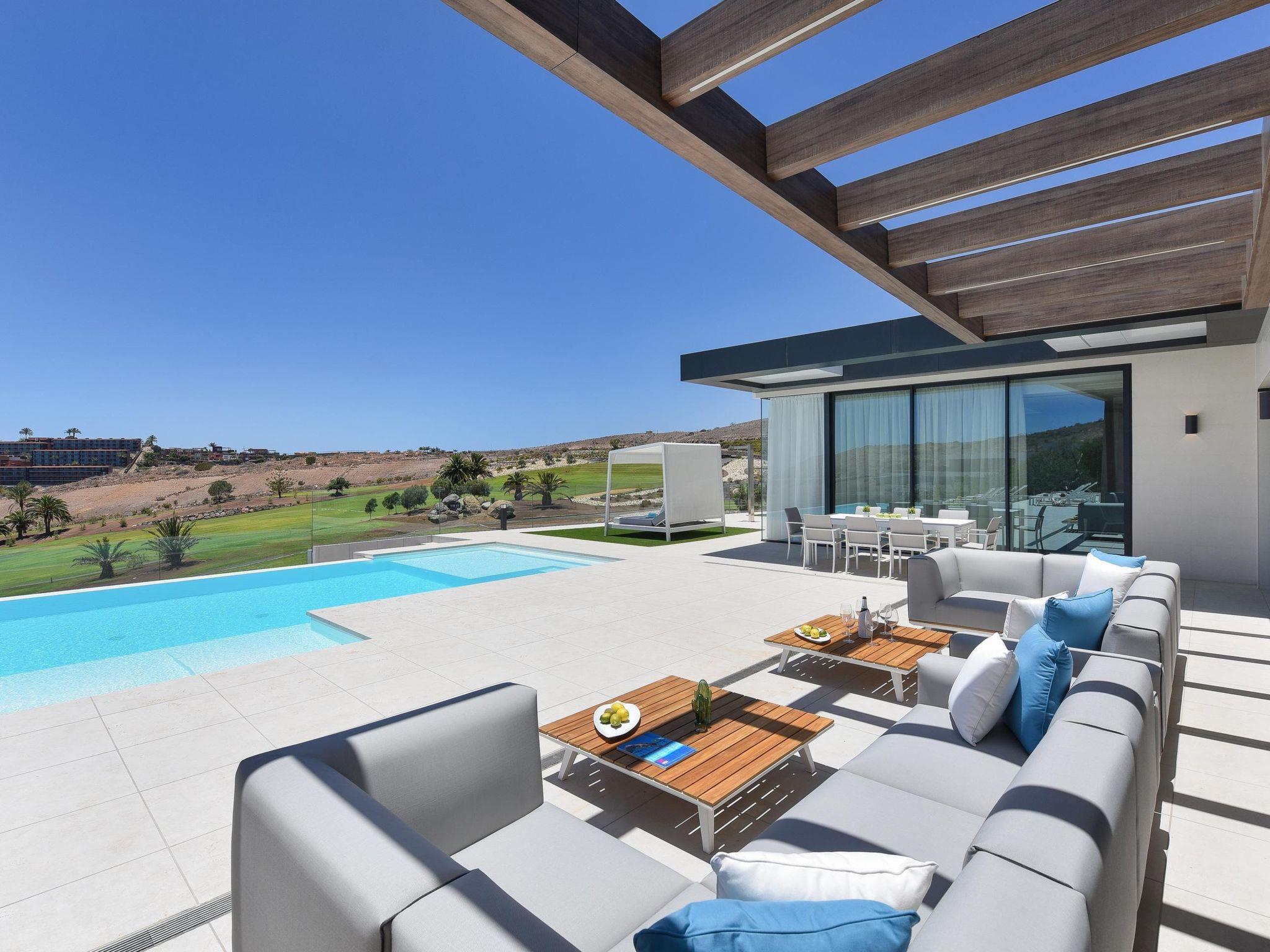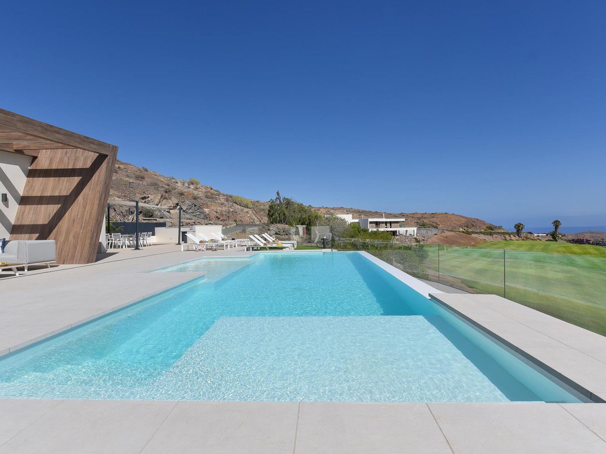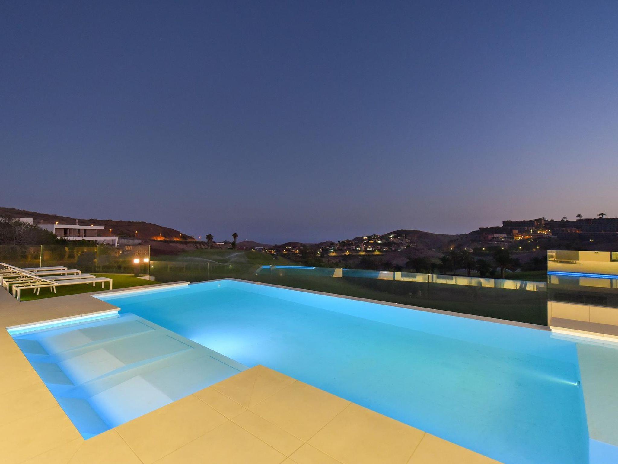 Modern, luxurious villa "Salobre Sunset Villa V", built in 2020, surrounded by meadows. In the centre of Salobre Golf Resort, in a quiet, sunny position on top of a hill. Private: property 1'000 m2, swimming pool angular (11 x 4 m, seasonal availability: 01.Jan. - 31.Dec.). Barbecue, parking on the premises, public parking on the road. Bus stop "Las Crucitas" 19 km. The owner does not accept any youth groups. Neighbourhood highly sensitive to noise. Quietness and good behaviour expected.