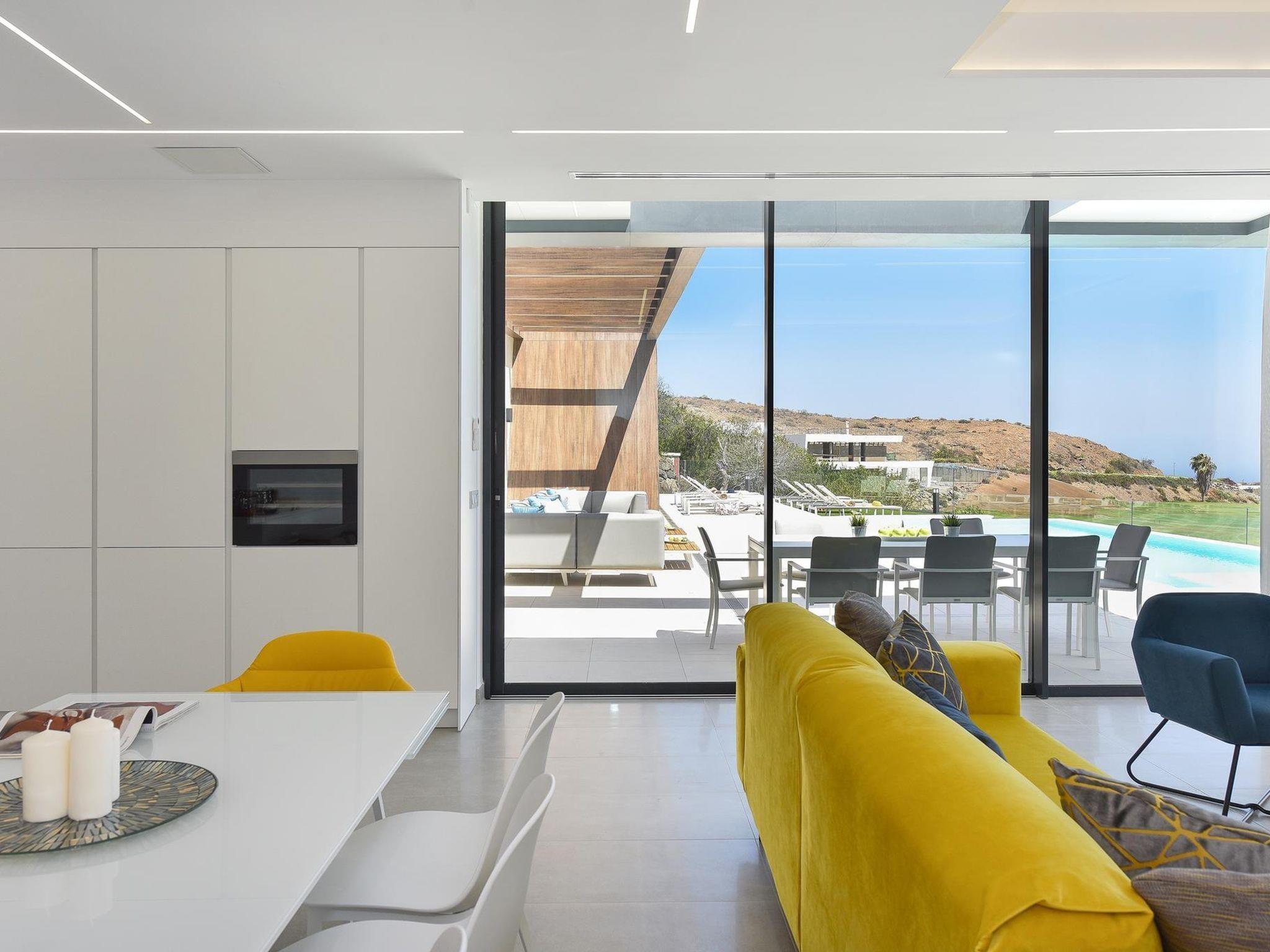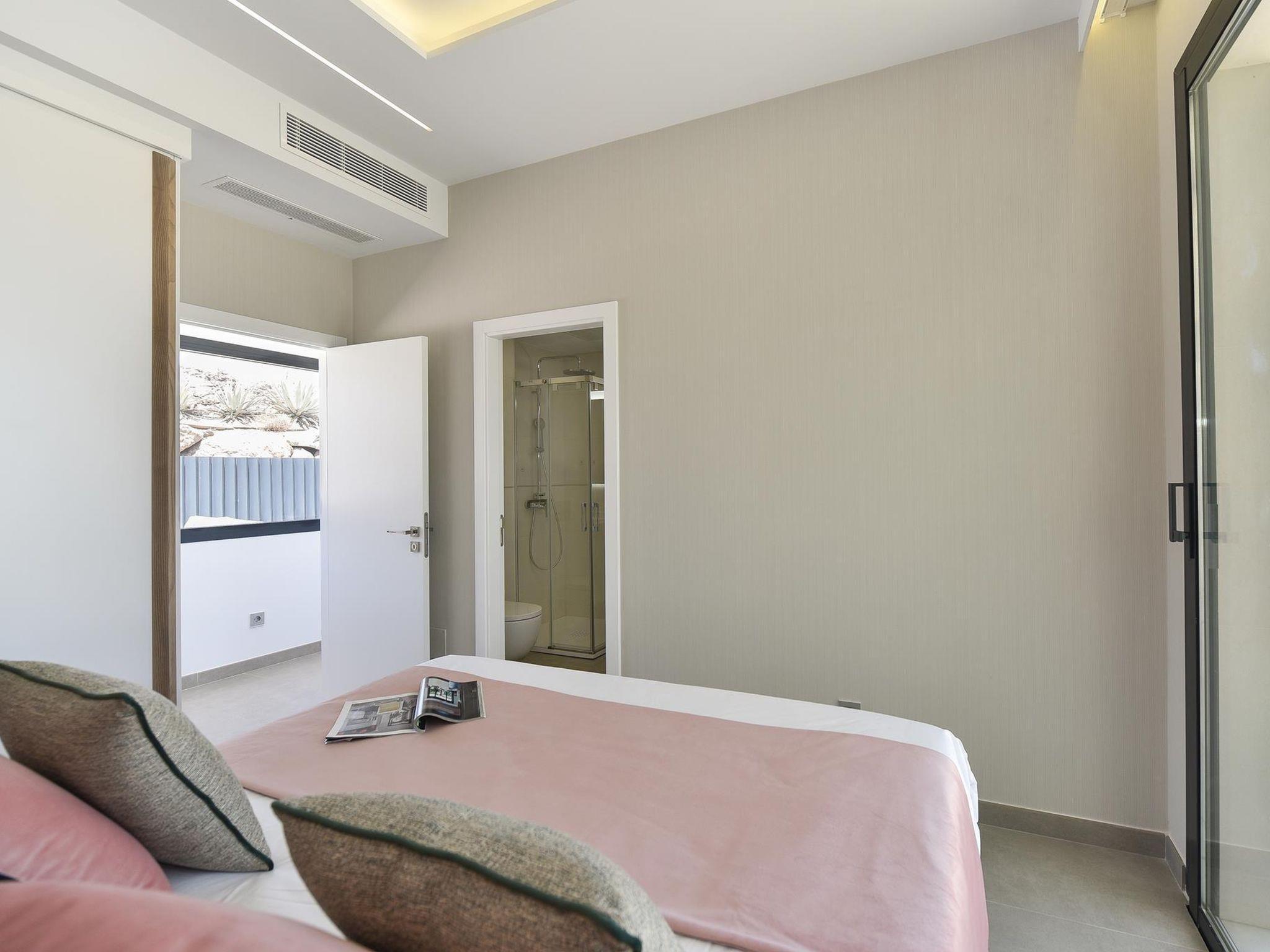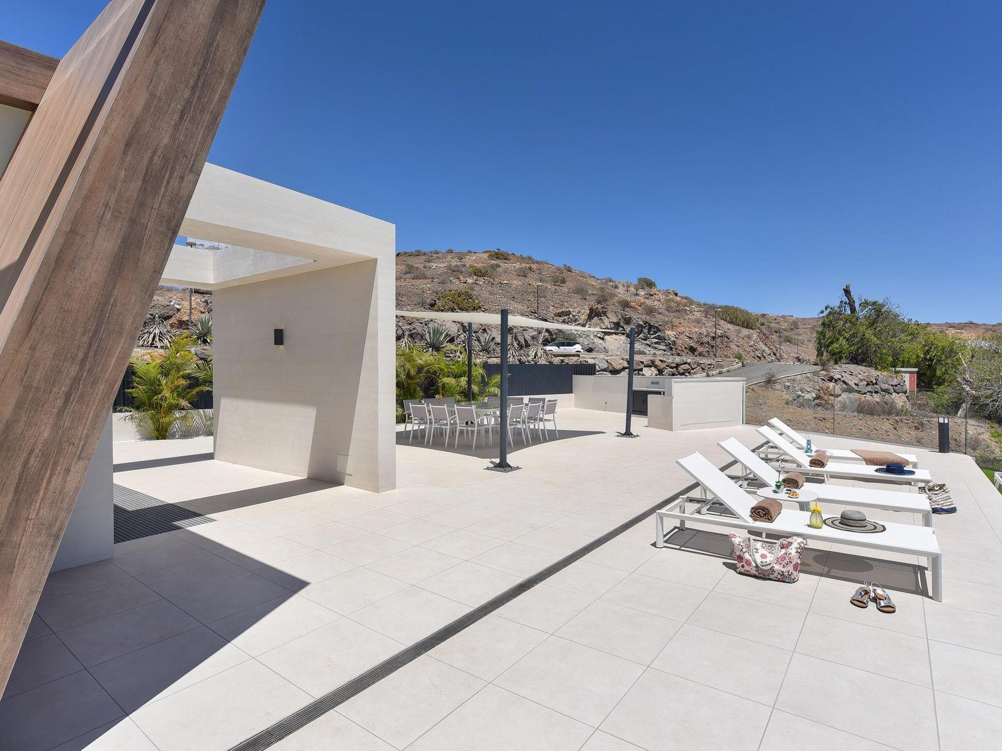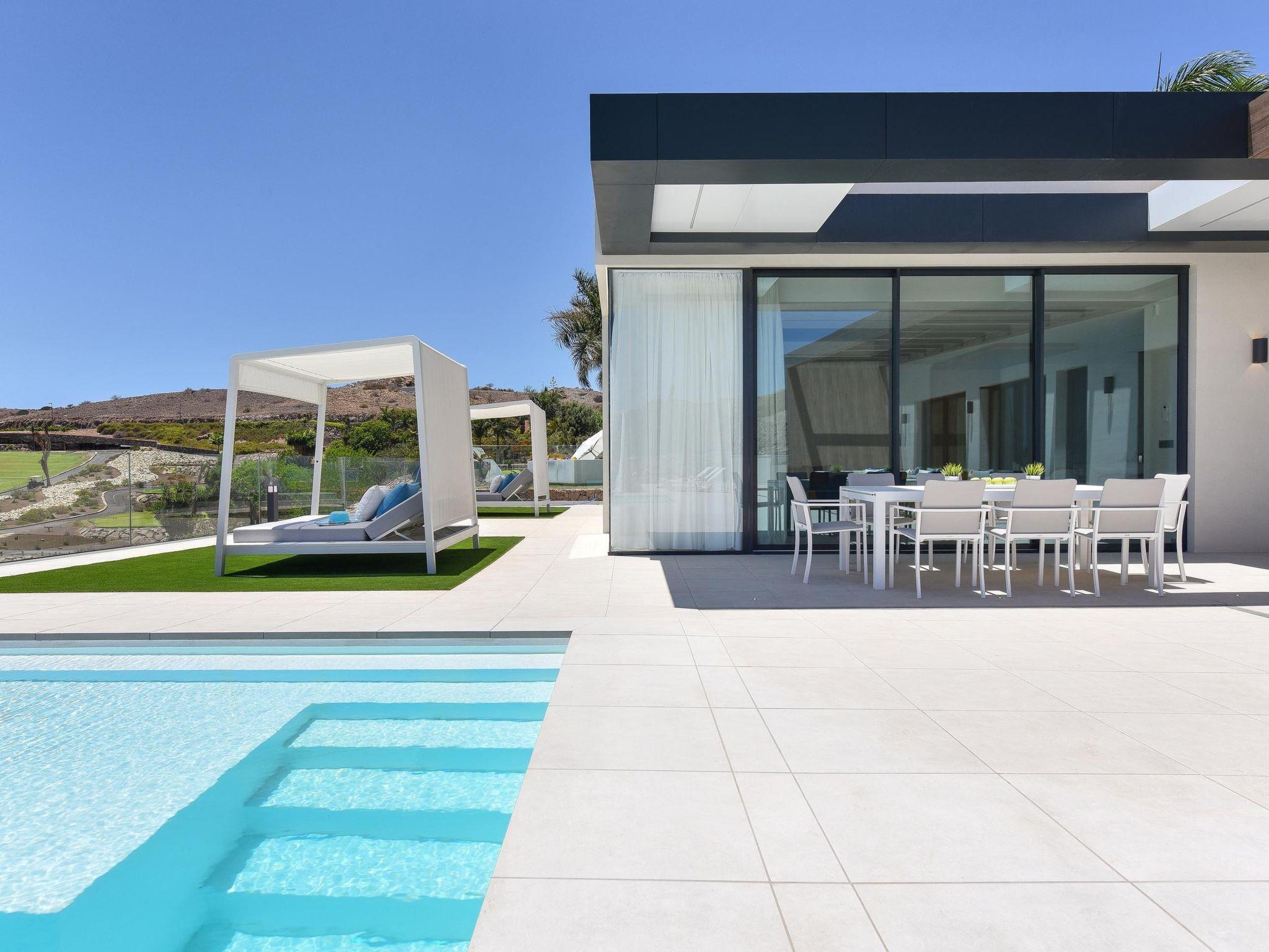 Modern, luxurious villa "Salobre Sunset Villa V", built in 2020, surrounded by meadows. In the centre of Salobre Golf Resort, in a quiet, sunny position on top of a hill. Private: property 1'000 m2, swimming pool angular (11 x 4 m, seasonal availability: 01.Jan. - 31.Dec.). Barbecue, parking on the premises, public parking on the road. Bus stop "Las Crucitas" 19 km. The owner does not accept any youth groups. Neighbourhood highly sensitive to noise. Quietness and good behaviour expected.