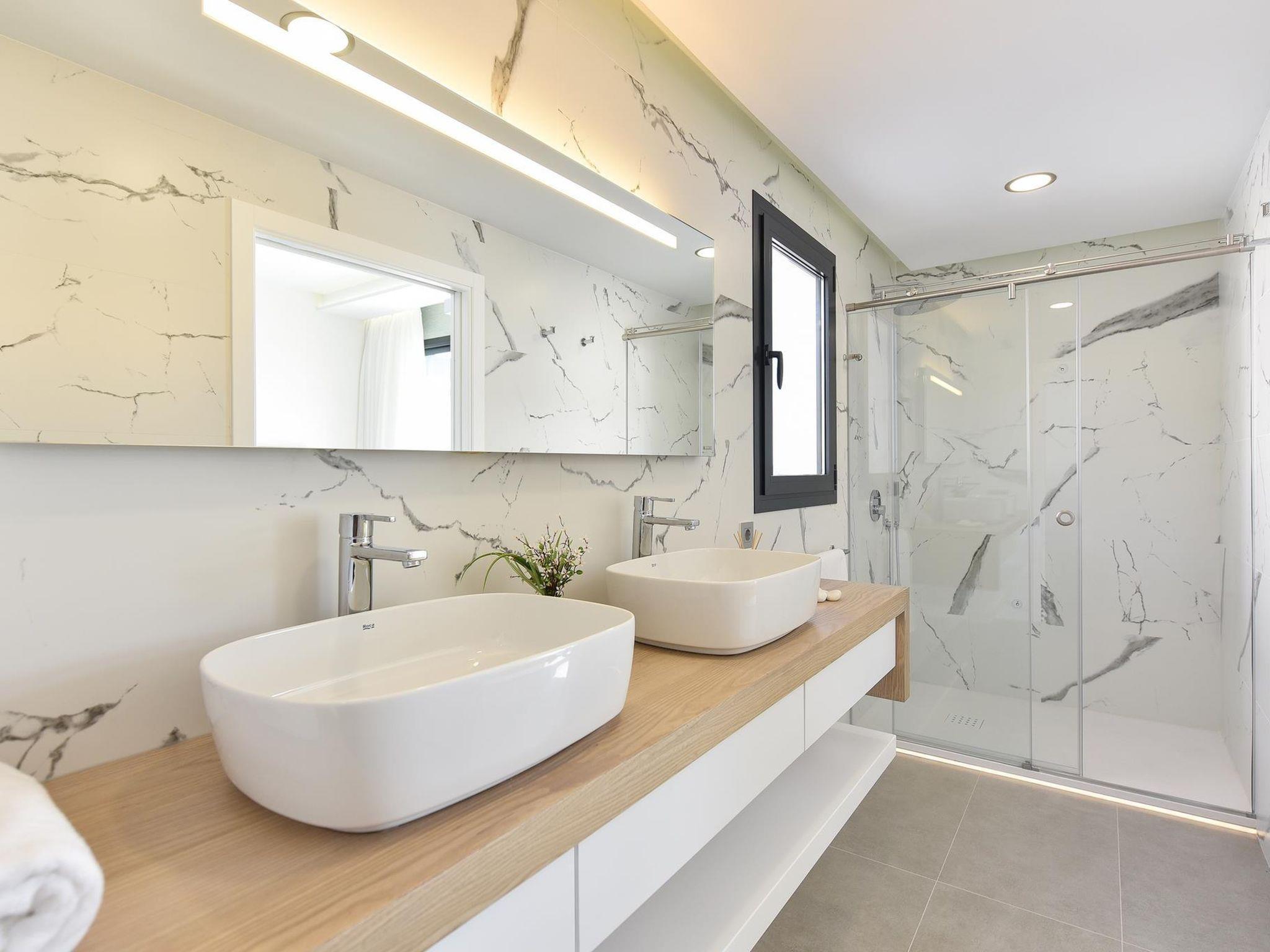 "Sunset 12PAX", 7-room house 480 m2 on 2 levels. Modern and luxurious furnishings: living/dining room with dining table, cable TV, digital TV and air conditioning. Exit to the patio. 3 rooms, each room with 1 french bed, shower/WC and air conditioning. 3 rooms, each room with 2 beds, shower/WC and air conditioning. Open kitchen (oven, dishwasher, 4 ceramic glass hob hotplates, toaster, kettle, microwave, freezer, electric coffee machine). Terrace 300 m2. Terrace furniture, barbecue. View of the mountains and the forest. Facilities: washing machine, dryer, safe, children's high chair, baby cot for up to 2 year olds, hair dryer. Internet (WiFi, free). Parking (1 car). Please note: non-smoking house. Maximum 1 pet/ dog allowed. 2020/75585 // Reg. Nr.: ESFCTU00003501200031690200000000000000000035100149146