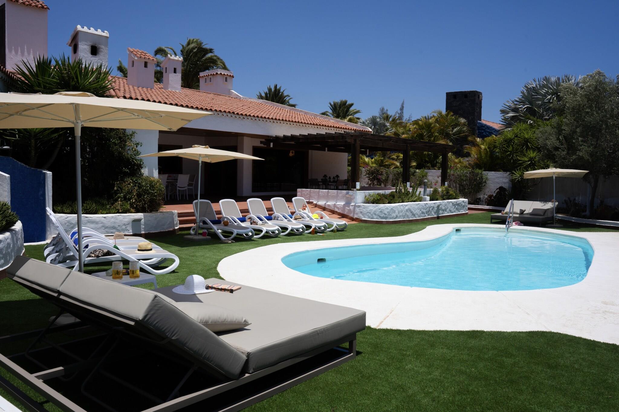 Denne fantastiske, nyligt renoverede hytte tilbyder det ultimative tilflugtssted for store familier eller grupper, der søger privatliv og ro på Gran Canaria. Med en rummelig planløsning omfatter ejendommen fem soveværelser, der kan rumme op til 13 gæster. Det store soveværelse har en king-size seng, mens de andre værelser tilbyder en blanding af enkelt- og dobbeltsenge, alle med aircondition og en-suite badeværelser. Stuen er udstyret med komfortable sofaer og et 65" smart-tv med internationale kanaler. Gæsterne kan nyde den store opvarmede pool, udendørs siddepladser og et spillerum med pool, bordtennis, bordfodbold, et fitnesscenter og en legeplads. Kæledyr er tilladt efter anmodning mod et tillægsgebyr, og huset ligger i et fredeligt boligområde. Ejendommen er ideelt beliggende i Maspalomas, kun en kort køretur fra den berømte Maspalomas-strand og Playa del Inglés. Det er også tæt på lokale supermarkeder, restauranter og butikker. Med 2 minutters kørsel til det nærmeste supermarked og nem adgang til store attraktioner, kombinerer beliggenheden bekvemmelighed og sindsro. Ejendommen ligger kun 7 minutter i bil fra Maspalomas Strand, og tilbyder gæsterne en perfekt balance mellem afslapning og udforskning. Det fuldt udstyrede køkken omfatter elektrisk kogeplade, ovn, køleskab, blender, brødrister og både Nespresso- og filterkaffemaskiner. For ekstra bekvemmelighed er der et spisekammer med et stort køleskab, ekstra fryser i garagen og en rummelig terrasse med to udendørs spiseborde. Den store, opvarmede pool (valgfri service) sikrer, at gæsterne kan nyde solbadning året rundt.