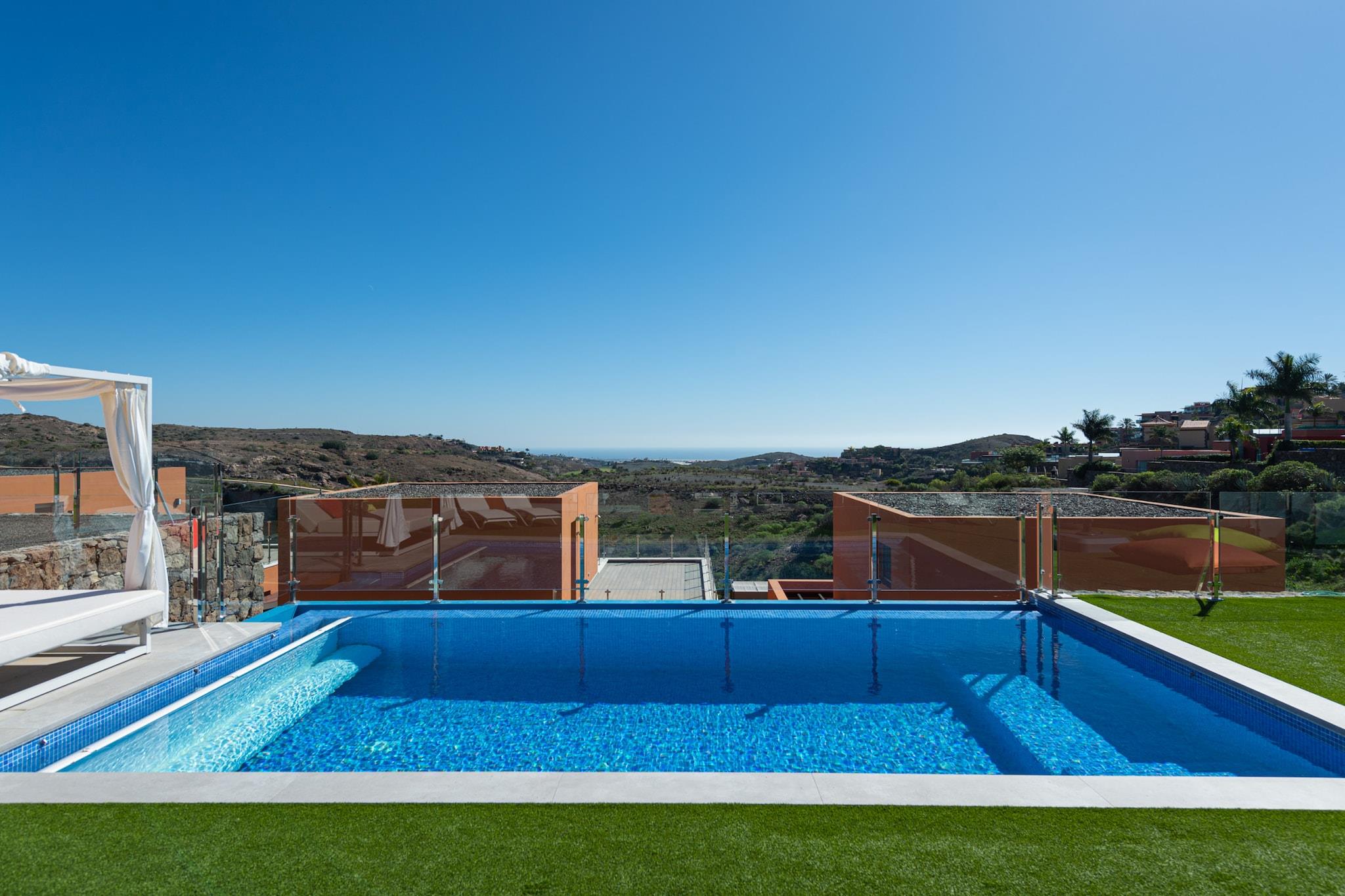 Denne fantastiske nybyggede en-etagers chalet tilbyder en enestående blanding af komfort og kvalitet, med en privat opvarmet pool og beliggende kun 8 minutter fra Maspalomas strand. Beliggende i et moderne kompleks ved siden af en golfbane, er villaen strategisk orienteret mod vest, hvilket giver gæsterne mulighed for at nyde rigeligt solskin og en betagende udsigt over havet. Designet prioriterer rummelighed og naturligt lys, med store skydedøre, der skaber en sømløs sammenhæng mellem indendørs og udendørs rum. Det velindrettede layout omfatter to soveværelser med enkeltsenge og et soveværelse med dobbeltseng, komplet med et smart-tv og et privat badeværelse med bruser. Begge soveværelser deler et ekstra badeværelse, mens den moderne opholdsstue kan prale af en komfortabel sofa, et smart-tv og et spisebord, alt sammen integreret med et fuldt udstyret køkken, der inkluderer vigtige redskaber og en opvaskemaskine for ekstra bekvemmelighed. Denne villa er udstyret med aircondition, varme, pengeskab, grill og andre faciliteter, der sikrer, at gæsterne føler sig hjemme under deres ophold. Det ydre af hytten er lige så imponerende, med en privat opvarmet pool omgivet af kunstgræs, en balinesisk seng og liggestole til ultimativ afslapning. En udendørs spiseplads med plads til seks og en gasgrill forstærker oplevelsen yderligere. Mens den opvarmede pool er tilgængelig mod et ekstra gebyr, skal gæsterne bemærke, at dette er et boligområde med strenge støjregler for at sikre et fredeligt miljø. Med 24-timers privat sikkerhed, adgang til børneunderholdning og forskellige nærliggende faciliteter, herunder særlige golfpriser, er denne hytte den perfekte tilflugtssted for at udforske alt, hvad øen har at tilbyde. En bil anbefales for bekvem rejse til områdets attraktioner.