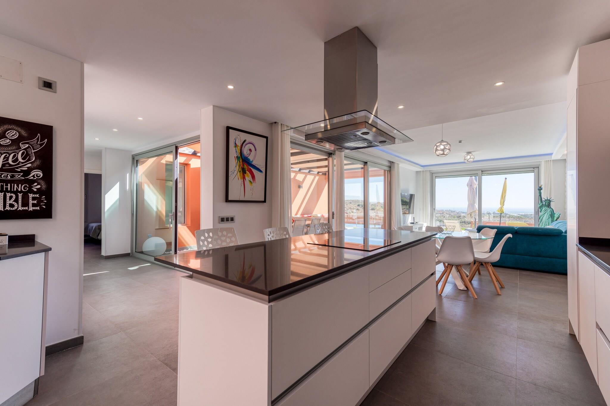 Åbent køkken(elkedel, brødrister, kaffemaskine, ovn, mikrobølgeovn, opvaskemaskine , køleskab, fryser, ), stue / spisestue(Fjernsyn, spisebord, sofahjørne), Soveværelse med badeværelse(dobbeltseng, bruser), Soveværelse med badeværelse(enkeltseng, enkeltseng, bruser), Soveværelse med badeværelse(enkeltseng, enkeltseng, bruser), Internetadgang, Havemøbler, Fjernsyn, tremmeseng, vaskemaskine, terrasse, have(indhegnet), have, solstole, grill, parkering, swimmingpool(privat, opvarmet), barnestol, strygejern, føntørrer, Mountain view, Sea view