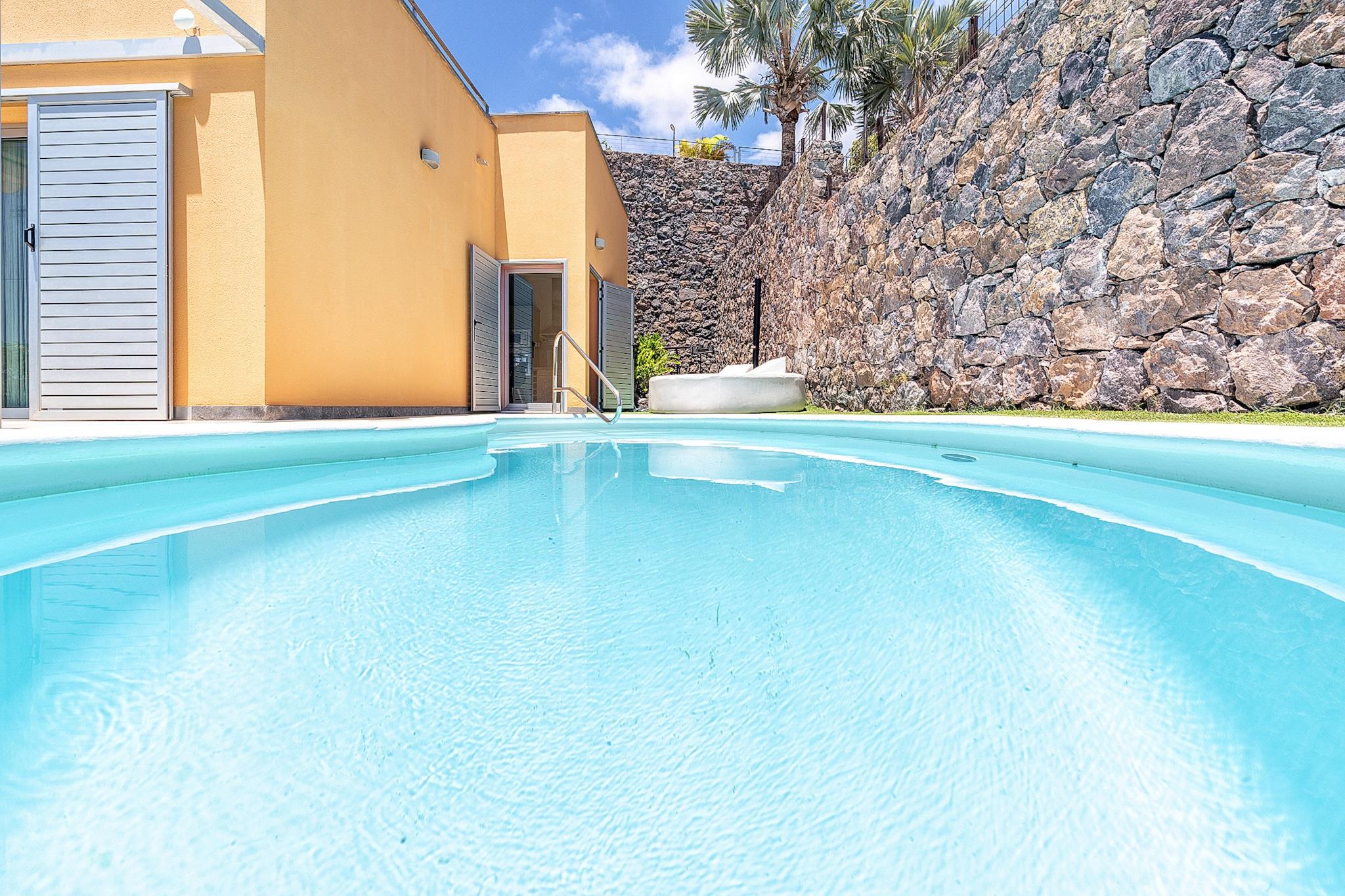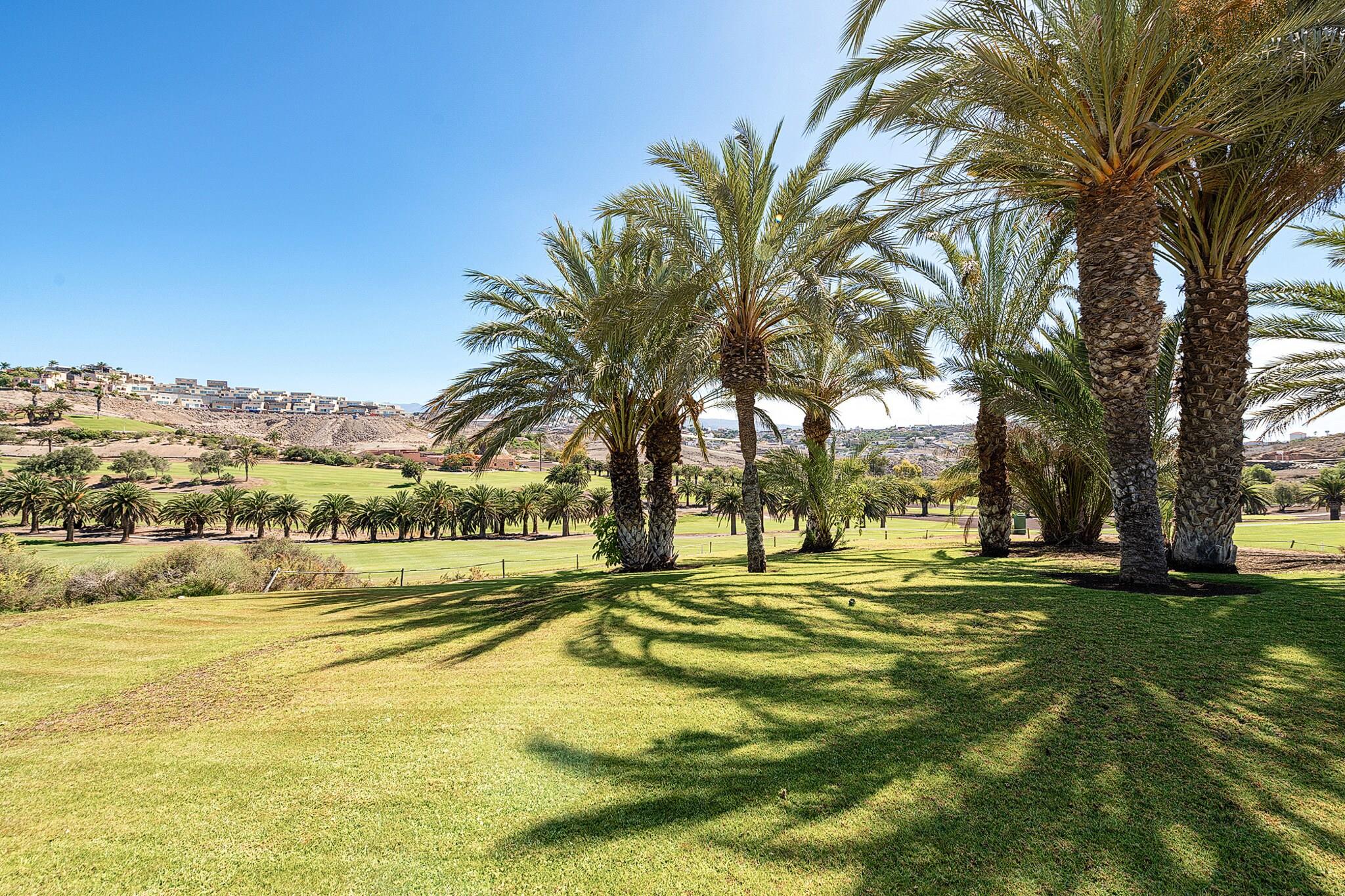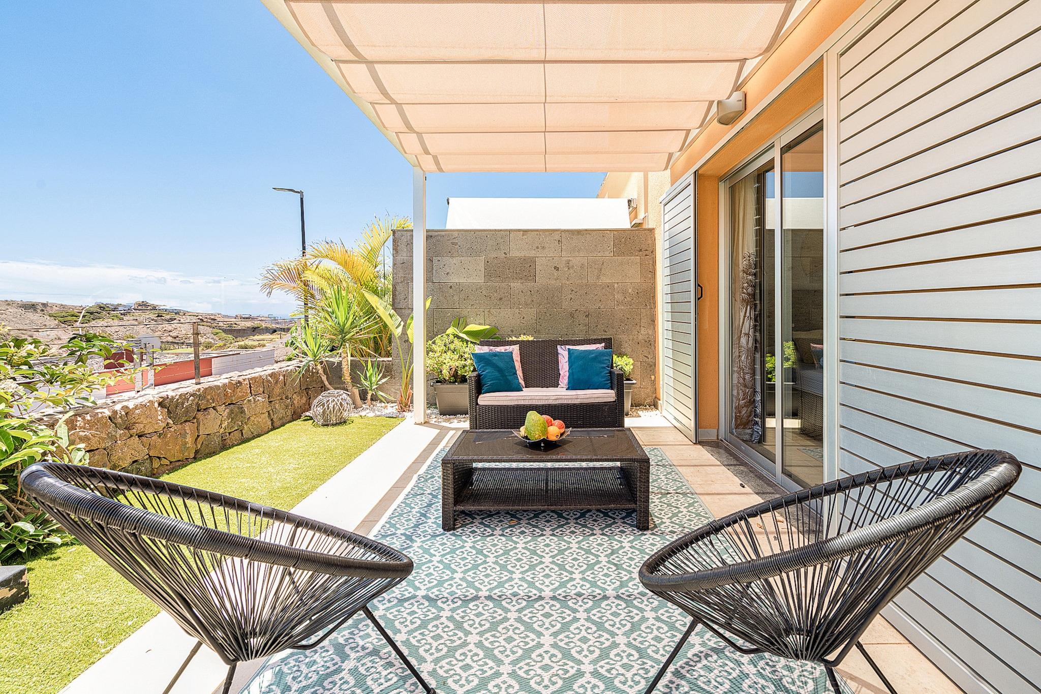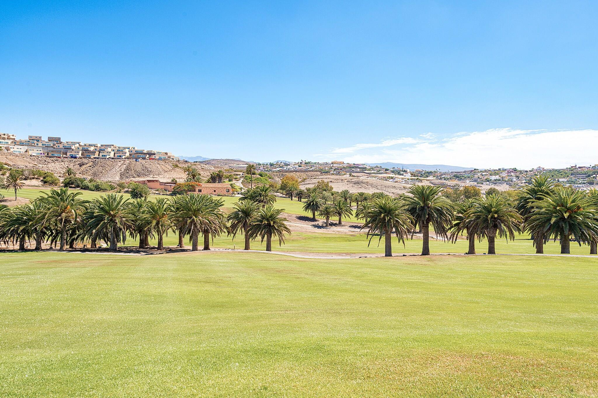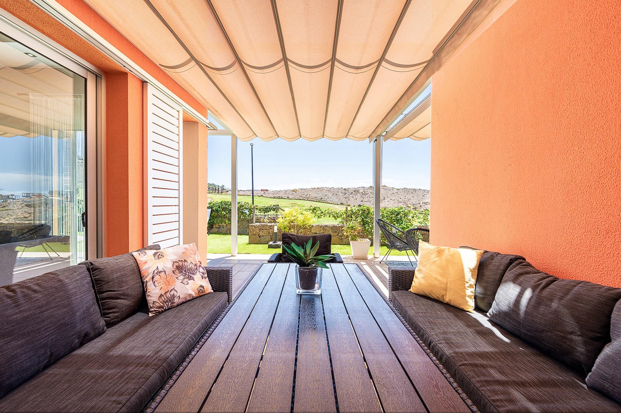 Beliggende i det eksklusive Salobre Golf-resort tilbyder denne lyse 2-værelses villa et enestående ophold for op til 4 gæster i de fredfyldte bakker i San Bartolomé de Tirajana. Med 102 m² veldesignet boligareal er villaen den perfekte blanding af ro, stil og komfort. Ejendommen er omgivet af panoramaudsigt over golfbanen, bjergene og kysten og tilbyder en virkelig privilegeret ramme for en fredelig flugt. Uanset om du leder efter en afslappende ferie eller en aktiv ferie, placerer denne familievenlige villa dig inden for rækkevidde af Gran Canarias bedste strande, fritidsfaciliteter og naturreservater. Villaen er omhyggeligt udstyret til at sikre et luksuriøst og selvforsynende ophold. Indvendigt byder layoutet i åbent plan på et moderne køkken med keramiske kogeplader, et køleskab, ovn, mikroovn, opvaskemaskine og komplet køkkenudstyr - perfekt til fælles måltider og underholdende. Villaen inkluderer også tre tv'er, satellitkanaler, Wi-Fi og aircondition for komplet komfort. Den mesterlige brug af naturligt lys og indendørs-udendørs flow skaber en lys og indbydende atmosfære. Træd udenfor for at nyde en 20 m² stor privat terrasse, en smukt anlagt have og din egen private opvarmede swimmingpool - ideel til at slappe af efter en dag på de nærliggende greens eller kystlinje. Placeringen er lige så imponerende. Du er kun 100 meter fra Salobre Golf, 7 km fra det rolige sand i Playa de Pasito Blanco og kun en kort køretur fra ikoniske steder som Playa de Maspalomas og Playa del Inglés. Nærliggende restauranter såsom Restaurante Sidecar og La Palmera Sur tilbyder lokale retter i topklasse, mens supermarkeder og fritidsparker som Aqualand og HolidayWorld sikrer bekvemmelighed og underholdning for alle.