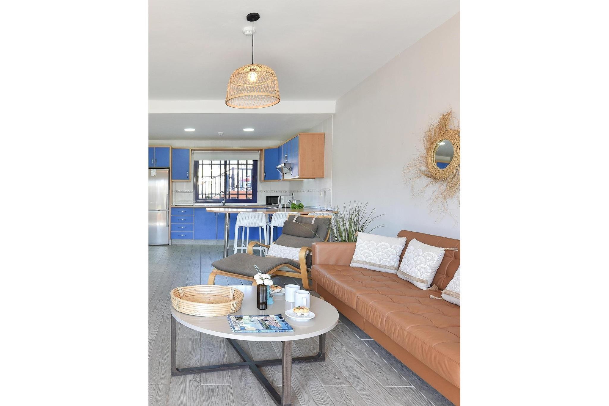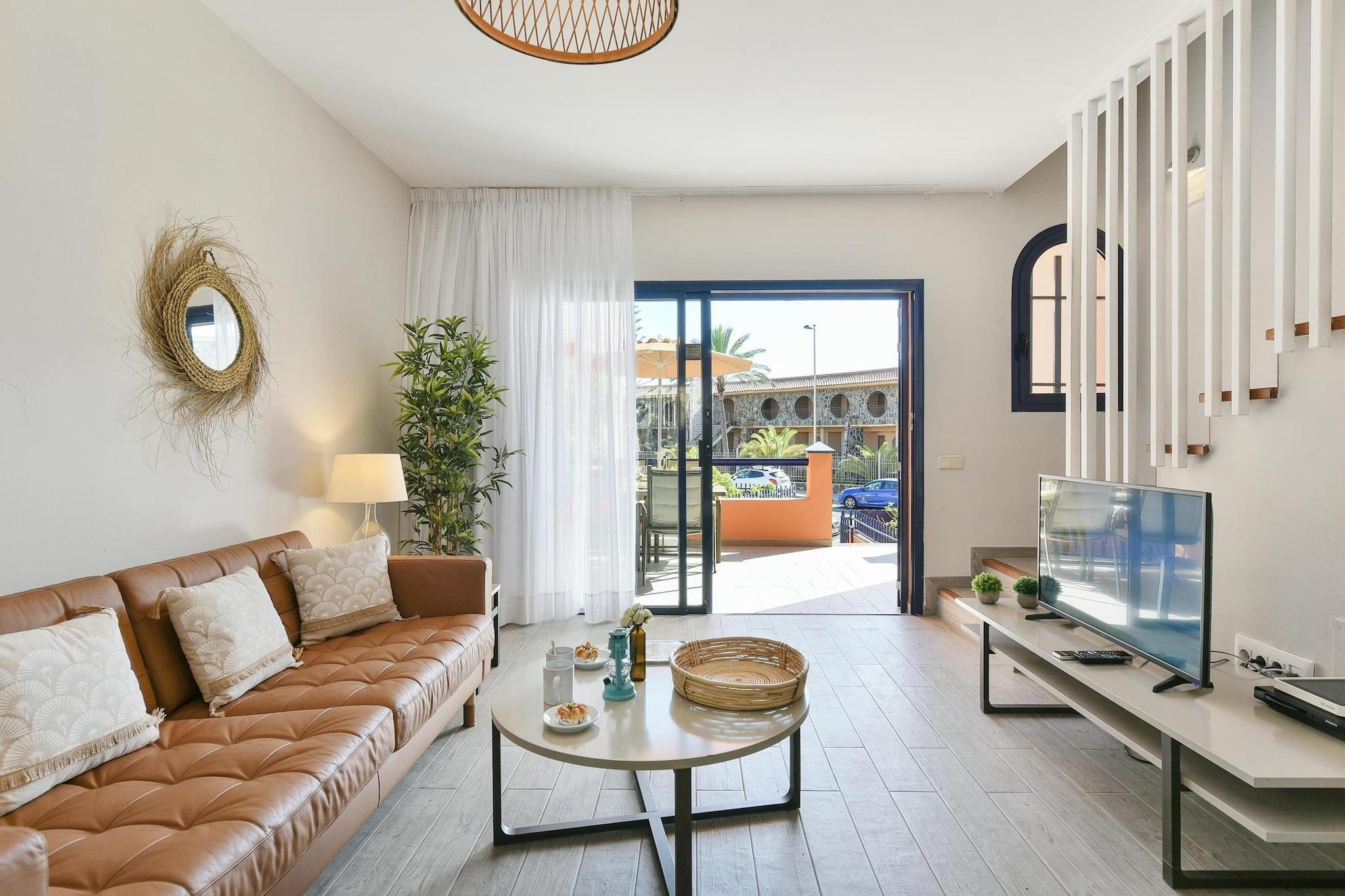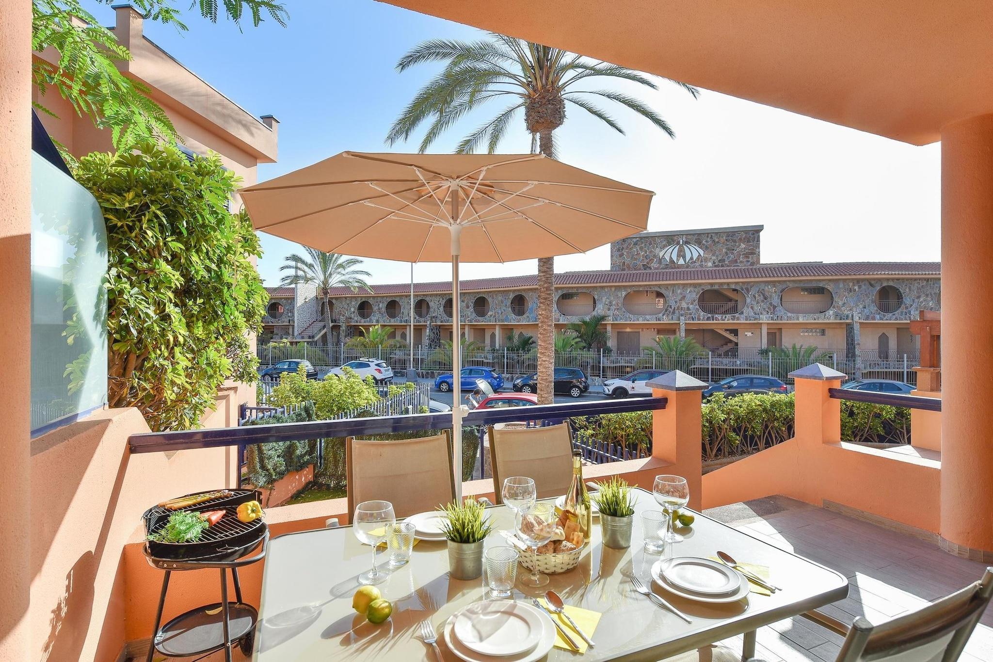 Beliggende i det rolige kompleks på den solrige sydlige del af Gran Canaria, tilbyder denne toetagers duplex en fortryllende oase, hvor komfort møder kysten. Dit ophold begynder i det lyse, åbne opholdsområde, hvor store døre fører dig ud til en privat terrasse - det perfekte sted at slappe af på solsenge med en kølig drink. Uanset om du tilbereder en middelhavsfest i det fuldt udstyrede køkken (komplet med espressomaskine og opvaskemaskine) eller slapper af foran Smart TV'et, sikrer den fulde aircondition, at dine indendørs øjeblikke er lige så forfriskende som øens brise. Overetagen er designet til afslappende nætter og rolige morgener. Soveværelset fungerer som et privat fristed med en charmerende balkon, hvor du kan nyde den tidlige sol, før resten af verden vågner. Et andet soveværelse med to enkeltsenge og to moderne badeværelser med brusere giver rigelig plads og privatliv til op til fire gæster. Hver detalje, fra vaskemaskinen til højstolen og barnesengen til de små rejsende, er omhyggeligt inkluderet for at få dig til at føle dig helt hjemme. Ud over din private have inviterer komplekset dig til at dykke ned i den store fælles swimmingpool eller slentre gennem smukt anlagte fællesområder. Beliggenheden er virkelig uovertruffen for opdagelsesrejsende; Meloneras-stranden ligger kun en kort gåtur væk, og den ikoniske promenade tilbyder en naturskøn gåtur direkte ind i hjertet af Maspalomas-resortet. På denne ejendom booker du ikke bare en lejlighed; du sikrer dig en plads på første række til de bedste fritidsaktiviteter, shoppingmuligheder og gyldne solnedgange, som Gran Canaria har at byde på.