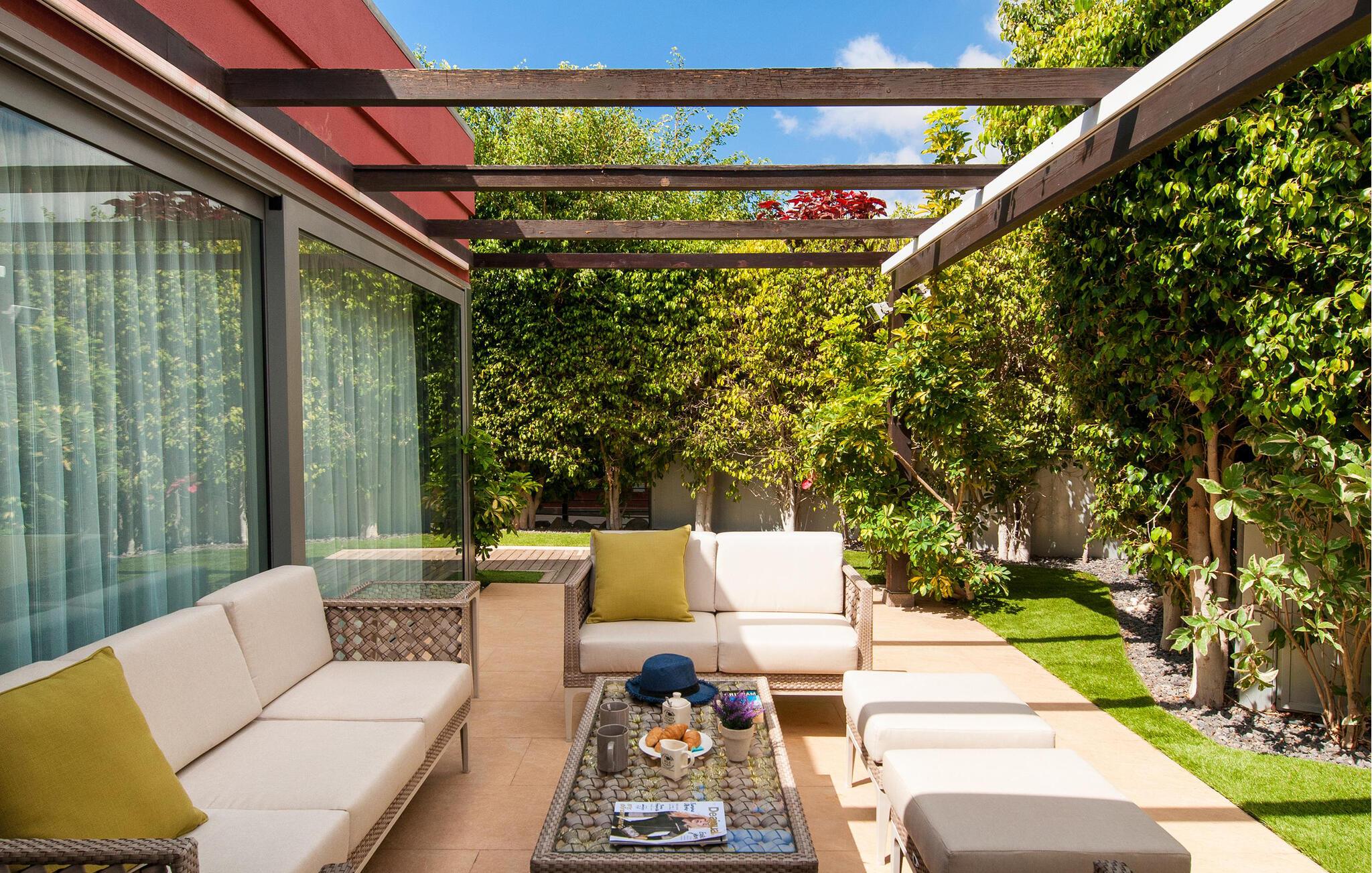 Det elegante udendørsområde er perfekt til at nyde det behagelige kanariske klima fra morgen til aften. Tag en afslappet dukkert i poolen om morgenen, lad batterierne op på de komfortable liggestole og nyd forfriskende frugtjuicer i loungen. Snak over et glas vin indtil solnedgang, og oplev stemningsfulde grillmiddage på den charmerende terrasse.