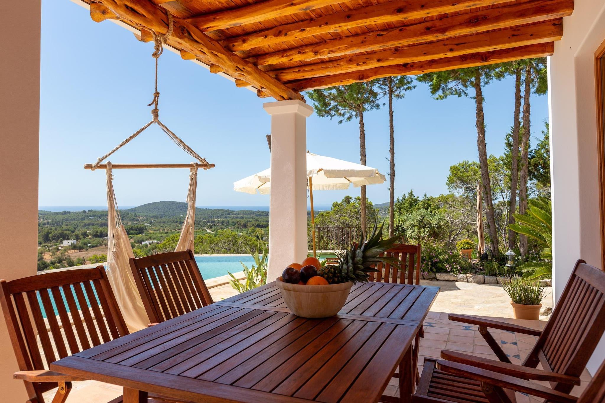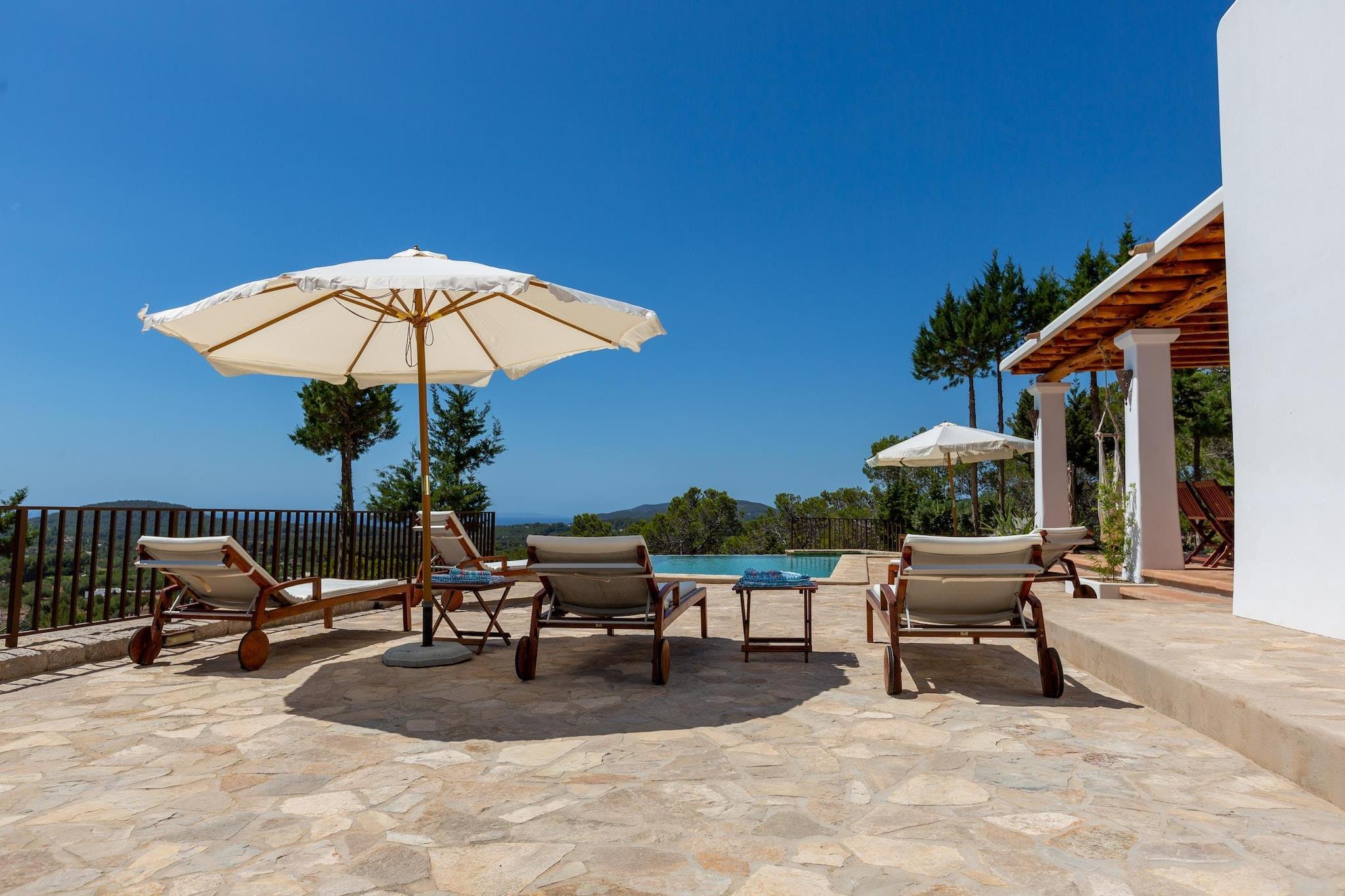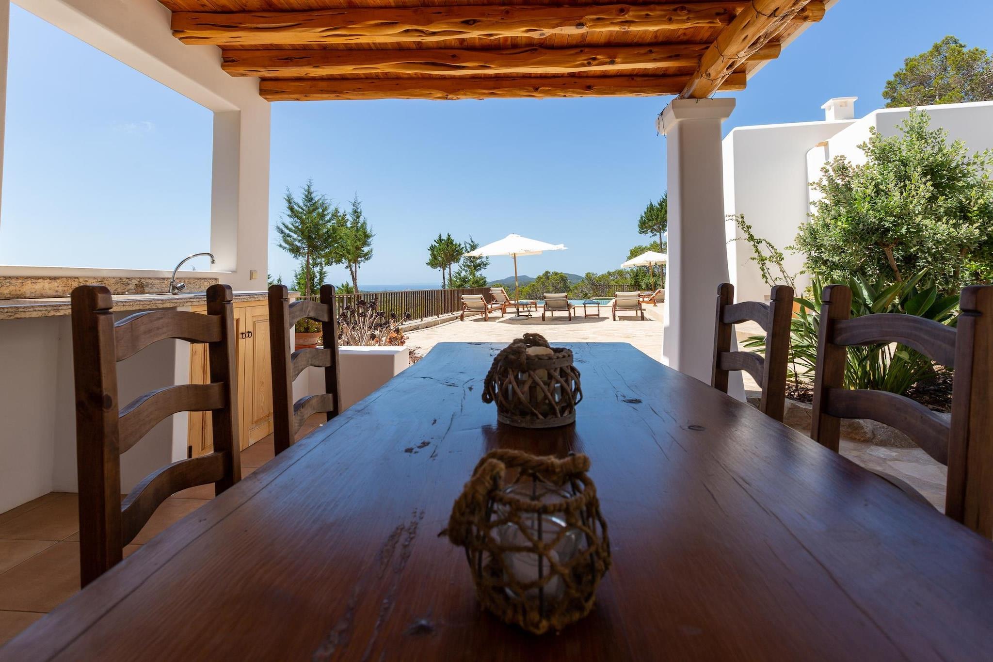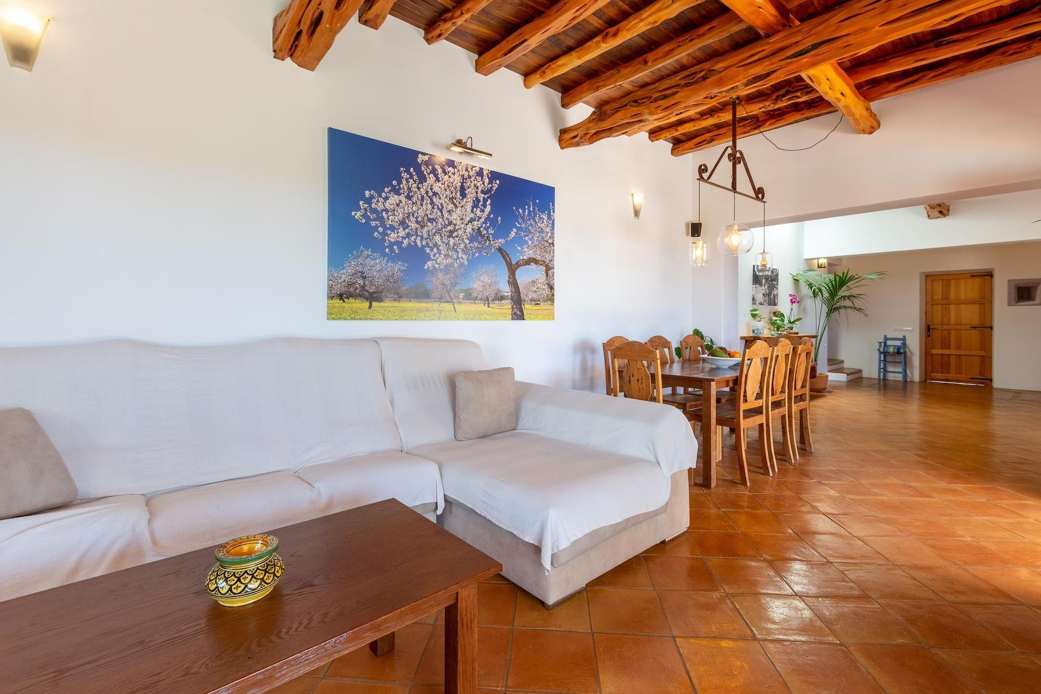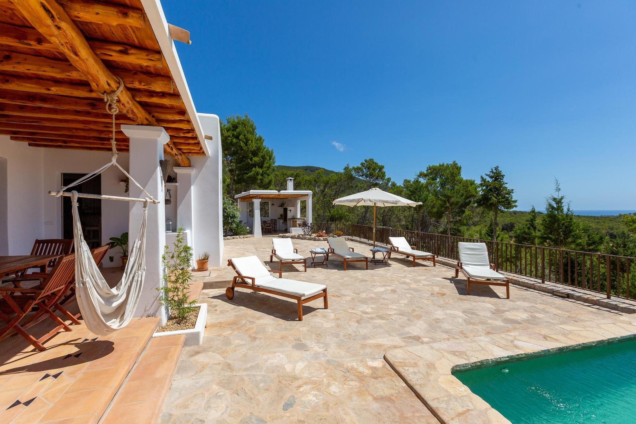 Smukt landsted bygget i stil med de gamle bondehuse, med tykke hvide vægge og lofter af sabinatræ. Det er det ideelle sted at slappe af og udforske denne rolige del af øen. Dette feriehus ligger på toppen af en bakke i et landligt område nær San Carlos. Selvom det kan virke meget isoleret, tager det kun et par minutter i bil at nå landsbyen og Santa Eulalia. Det er meget tæt på nogle af strandene i øst, såsom Aguas Blancas, Cala Llenya, Es Figueral og Cala Boix. Da landstedet ligger på et højere niveau, har det en fantastisk panoramaudsigt over øen og havet. Landstedet har en rummelig og lys stue og spisestue samt køkken. Der er også et vaskerum og et spisekammer. Der er også 3 soveværelser med dobbeltsenge, to komplette badeværelser, et med bruser og et med badekar. Alle tre soveværelser har aircondition. Køkkenet har et stort gaskomfur, opvaskemaskine og er fuldt udstyret. Derudover har det en separat hane til drikkevand. Køkkenet har adgang til den private pool. Stuen har en komfortabel sofa med chaiselong, satellit-tv og yderligere adgang til terrassen. Grunden omkring huset er stor og eksklusiv, uden naboer i nærheden. Ud over den private pool er der også et legeområde med legehuse. Der er også en overdækket terrasse med grill og spiseplads. Ideelt for familier, romantiske øjeblikke eller bare for at nyde en fredelig ferie i et unikt miljø. Kæledyr: Gæster skal kontakte HO for priser og tilgængelighed.