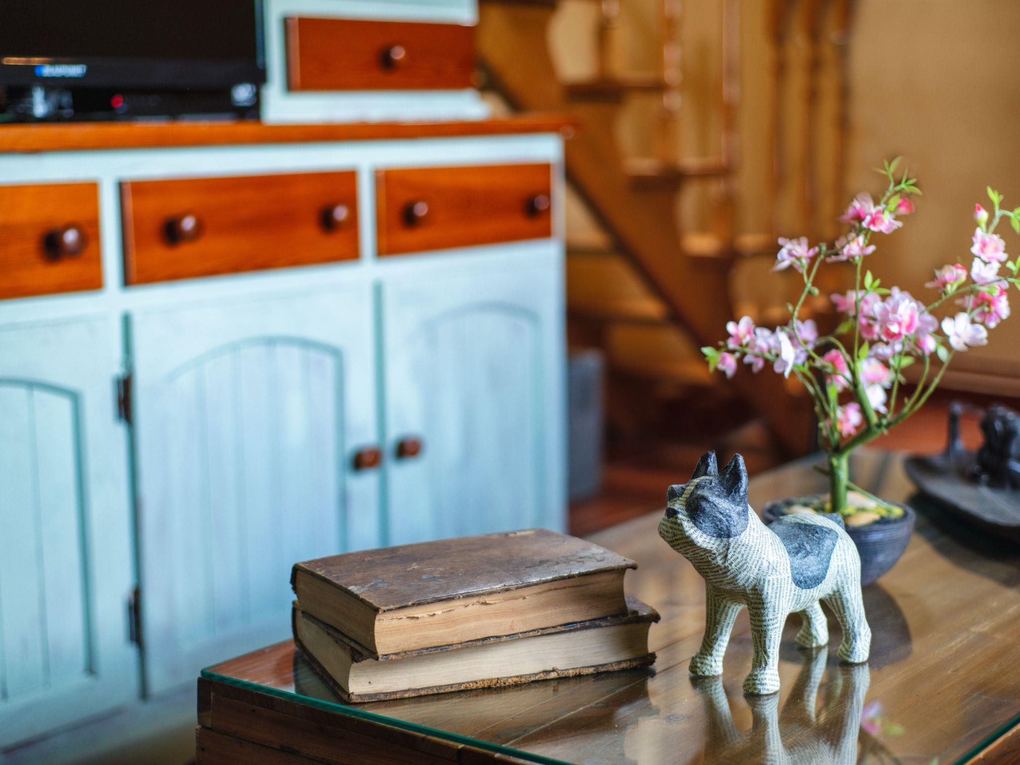 The holiday home has a cosy interior without sacrificing comfort. It can accommodate up to seven adults or six adults and two children on two floors. On the ground floor there is a spacious fully equipped kitchen and a living room with fireplace, TV and sofa bed. The first floor has two bedrooms and another living room with a second sofa bed and TV.