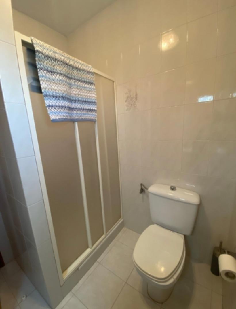 Das Badezimmer verfügt über eine Dusche, Waschbecken, Toilette und alle notwendigen Annehmlichkeiten wie Handtücher und Toilettenartikel.