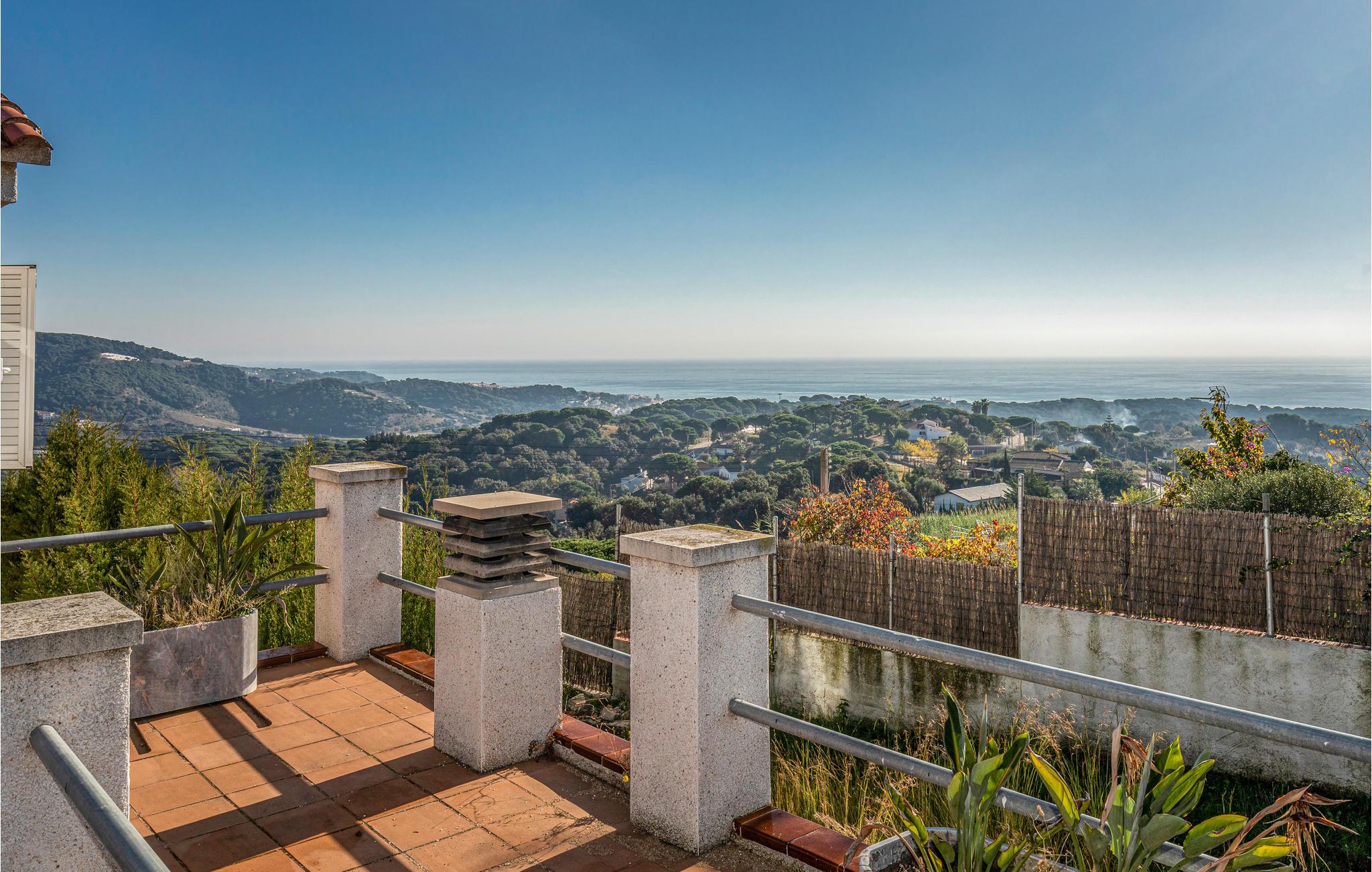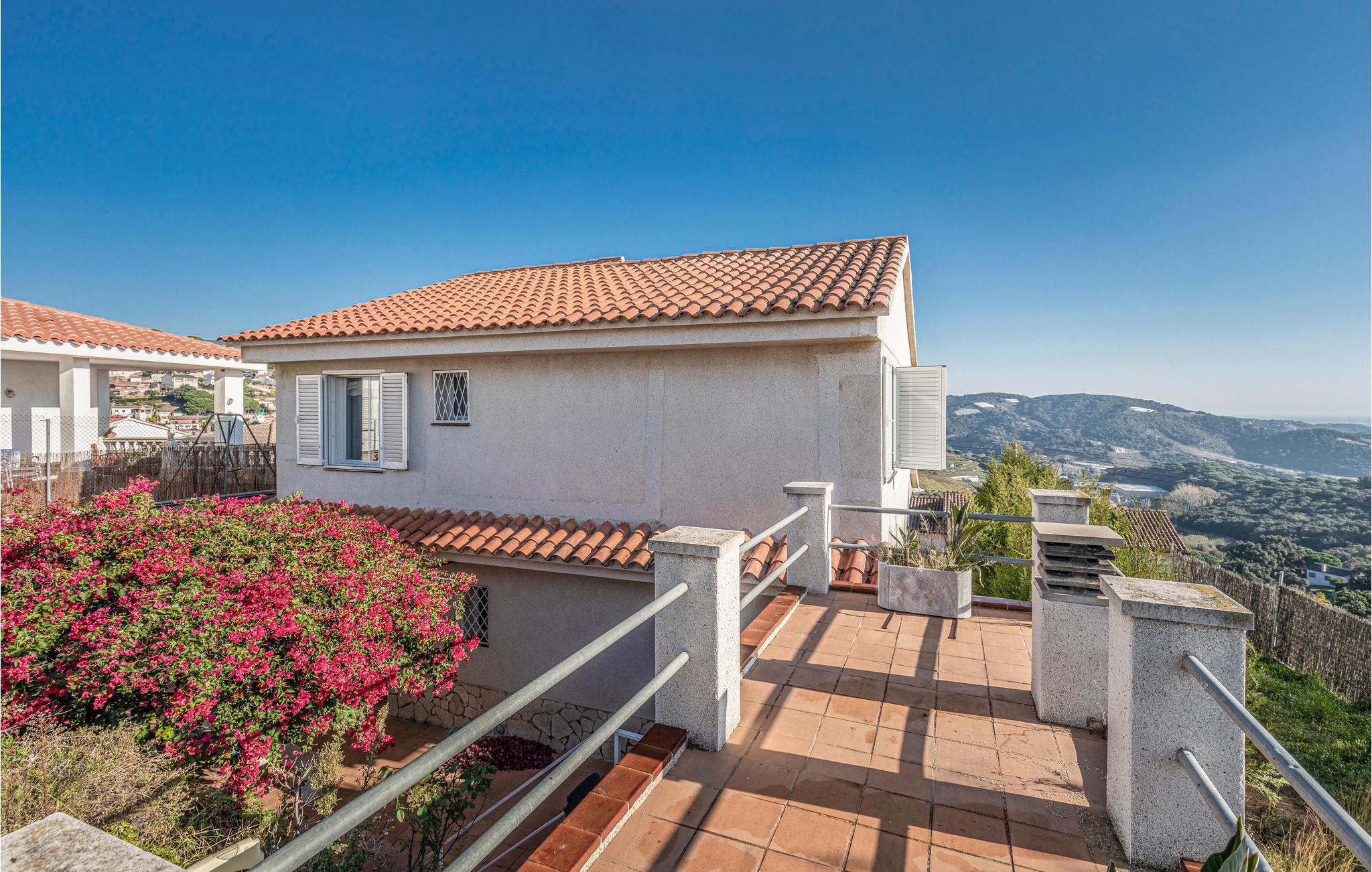 Spektakulært, fritliggende feriehus i moderne stil med 3 etager og fremragende udsigt. Det ligger kun 500 m fra en 9-hullers golfbane og tæt på strandene i Maresme, der betragtes som det smukkeste i området.