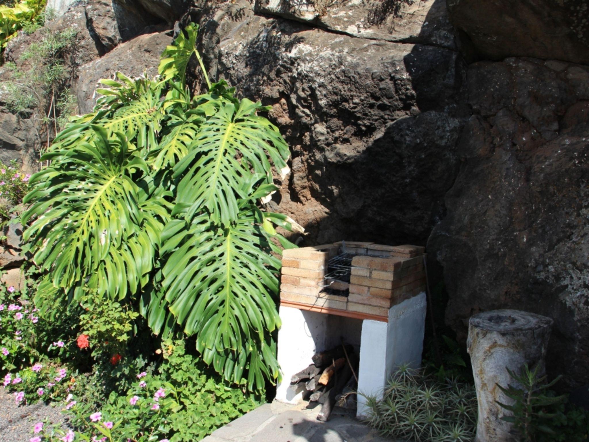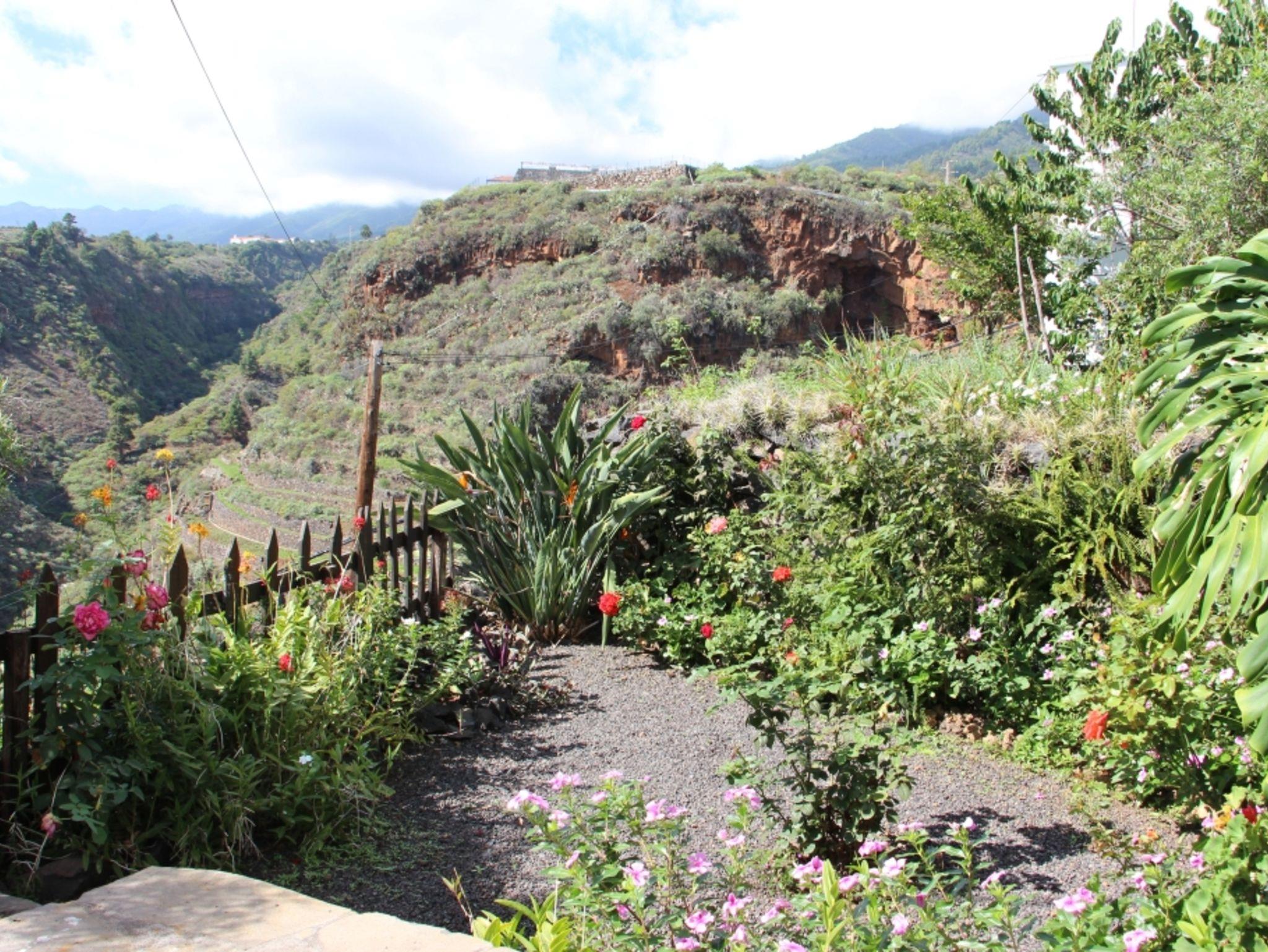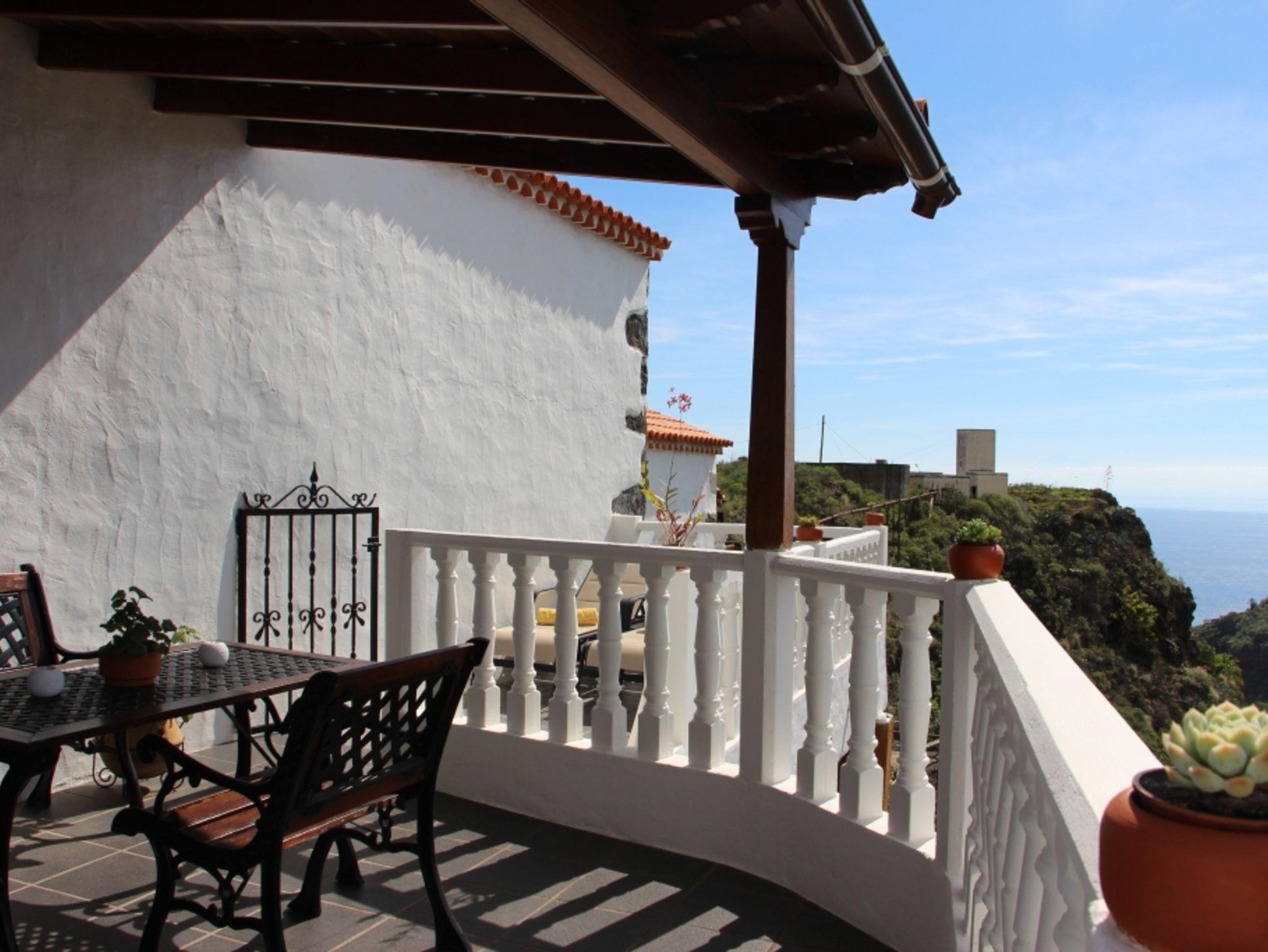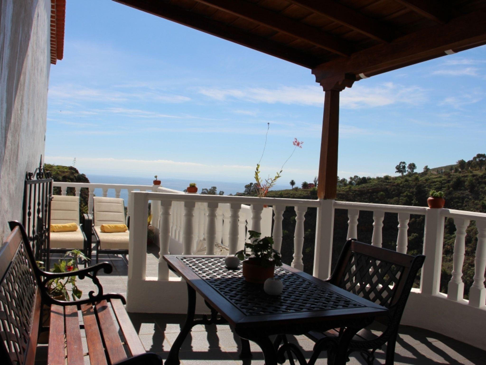 Eine teilüberdachte Terrasse mit einem Tisch, Bank und zwei Stühlen bietet einen phantastischen Blick in den grünen Barranco de Juan Mayor bis zum Meer. Ein kleiner Platz für zwei Liegestühle ist hervorragend für ein ungestörtes Sonnenbad. Hinter dem Haus befindet sich ein kleiner Garten mit Grill.