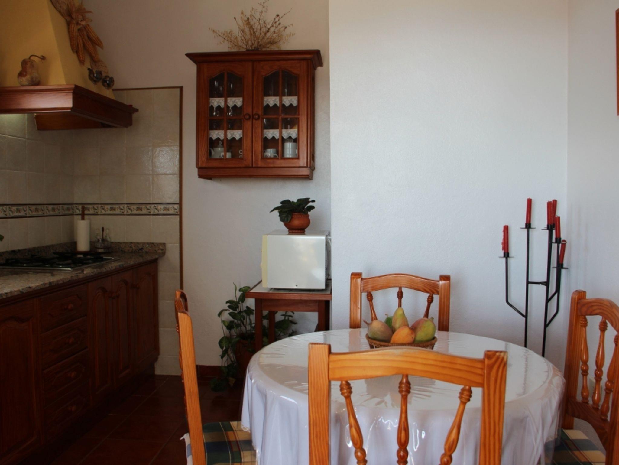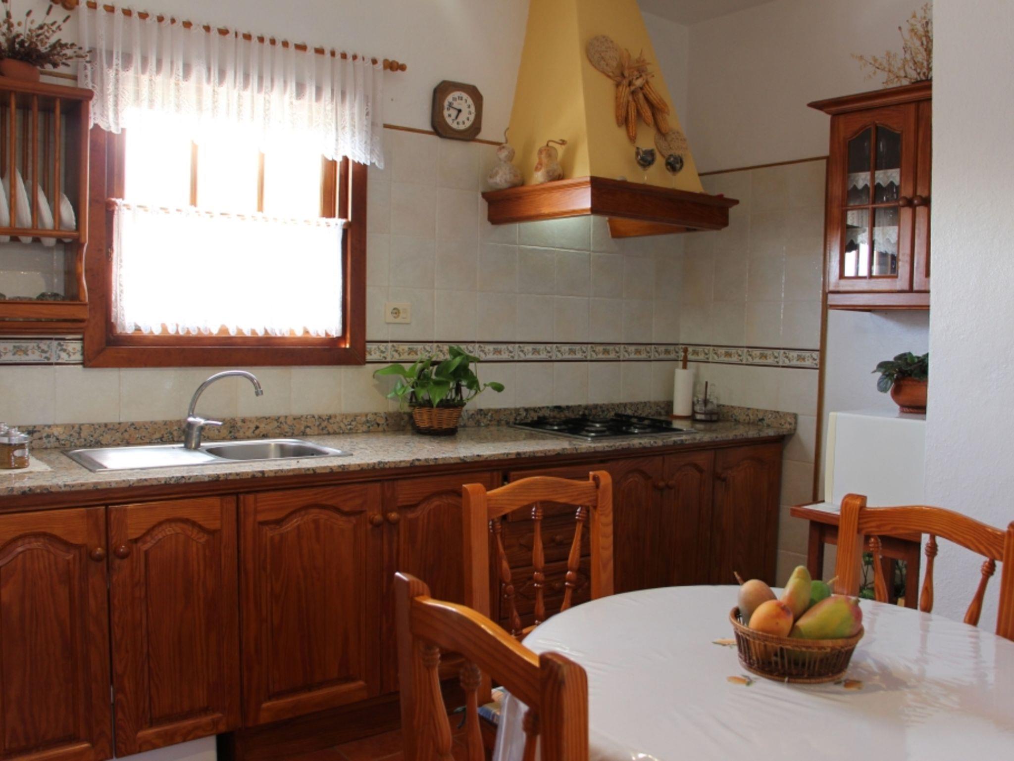 Das Wohnzimmer ist großzügig und hell und bildet den Mittelpunkt des Hauses. Die überdachte Terrasse erreicht man von der Küche aus. Diese ist gut ausgestattet und bietet auch einen Esstisch für bis zu 4 Personen.