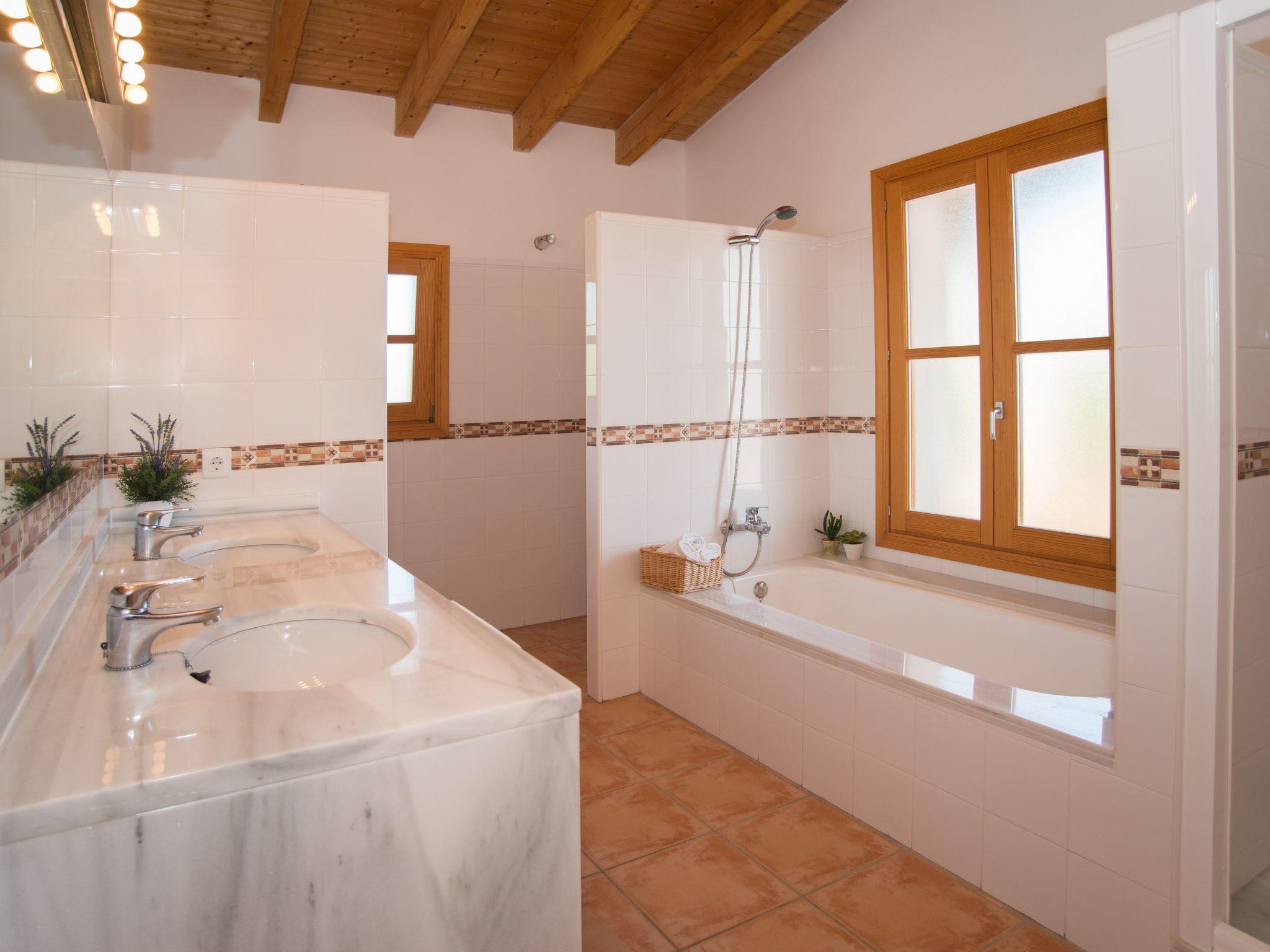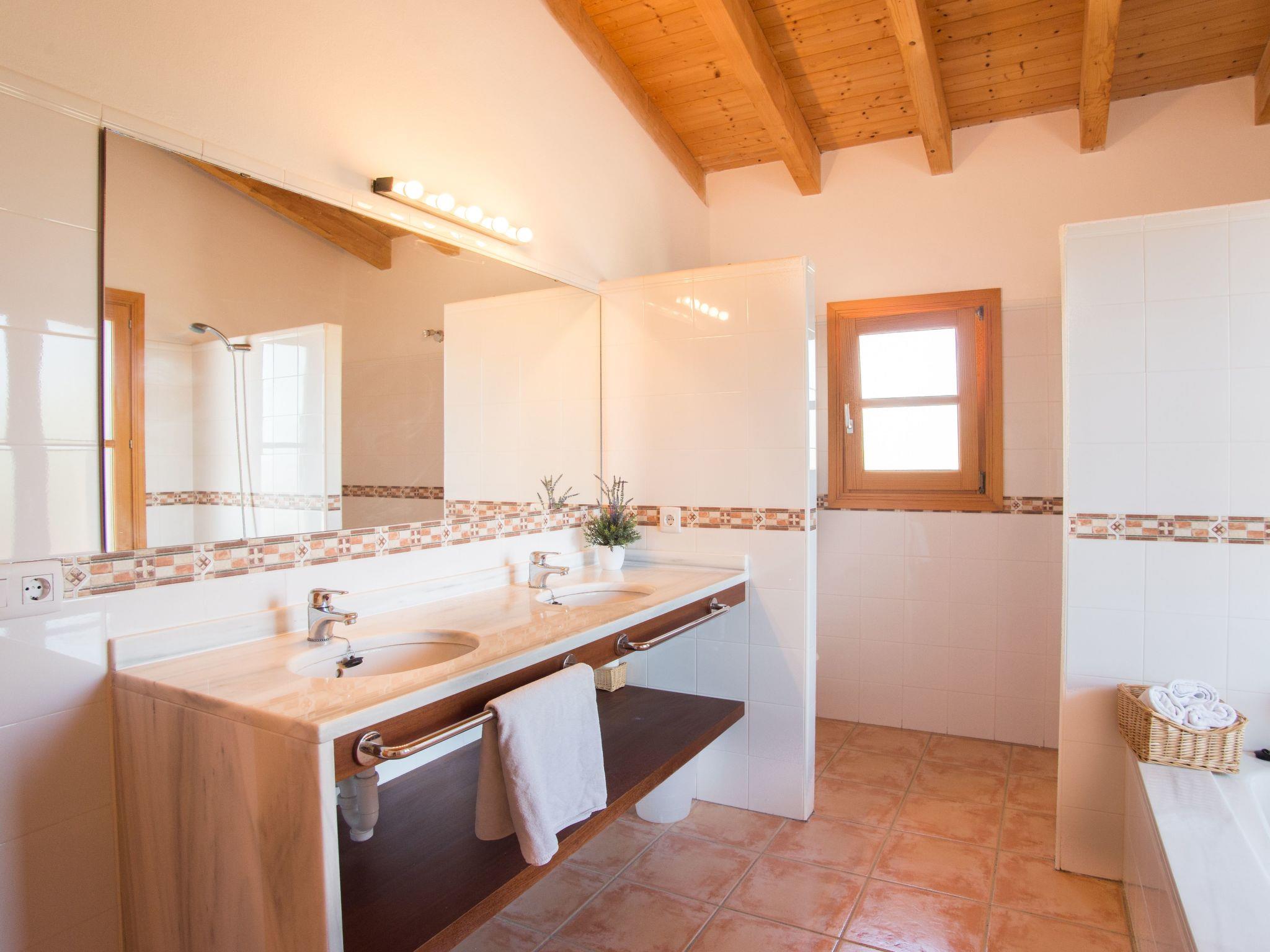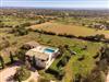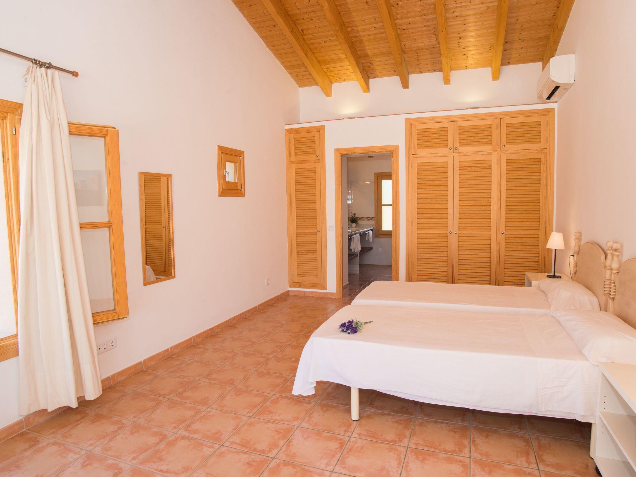 Finca Romana is a friendly and brightly furnished new build. Spacious, sunny areas offer an appealing place to relax and enjoy the peace and quiet of country life. The beautiful country house offers an airy living and dining area, designed in Ibizan style. Large glass doors lead to the charming covered terrace. The modern and spacious kitchen is well equipped. Two bedrooms, each with two single beds, share a bathroom with shower. A guest toilet completes the ground floor. The upper floor houses a master bedroom with double bed, dressing area, a large en-suite bathroom and direct access to two large terraces with panoramic views of the pool and the countryside. A further bedroom with two single beds also has a dressing area and an en-suite bathroom. In a small guest house by the pool there are two further bedrooms, each with two single beds and en-suite bathrooms with shower.