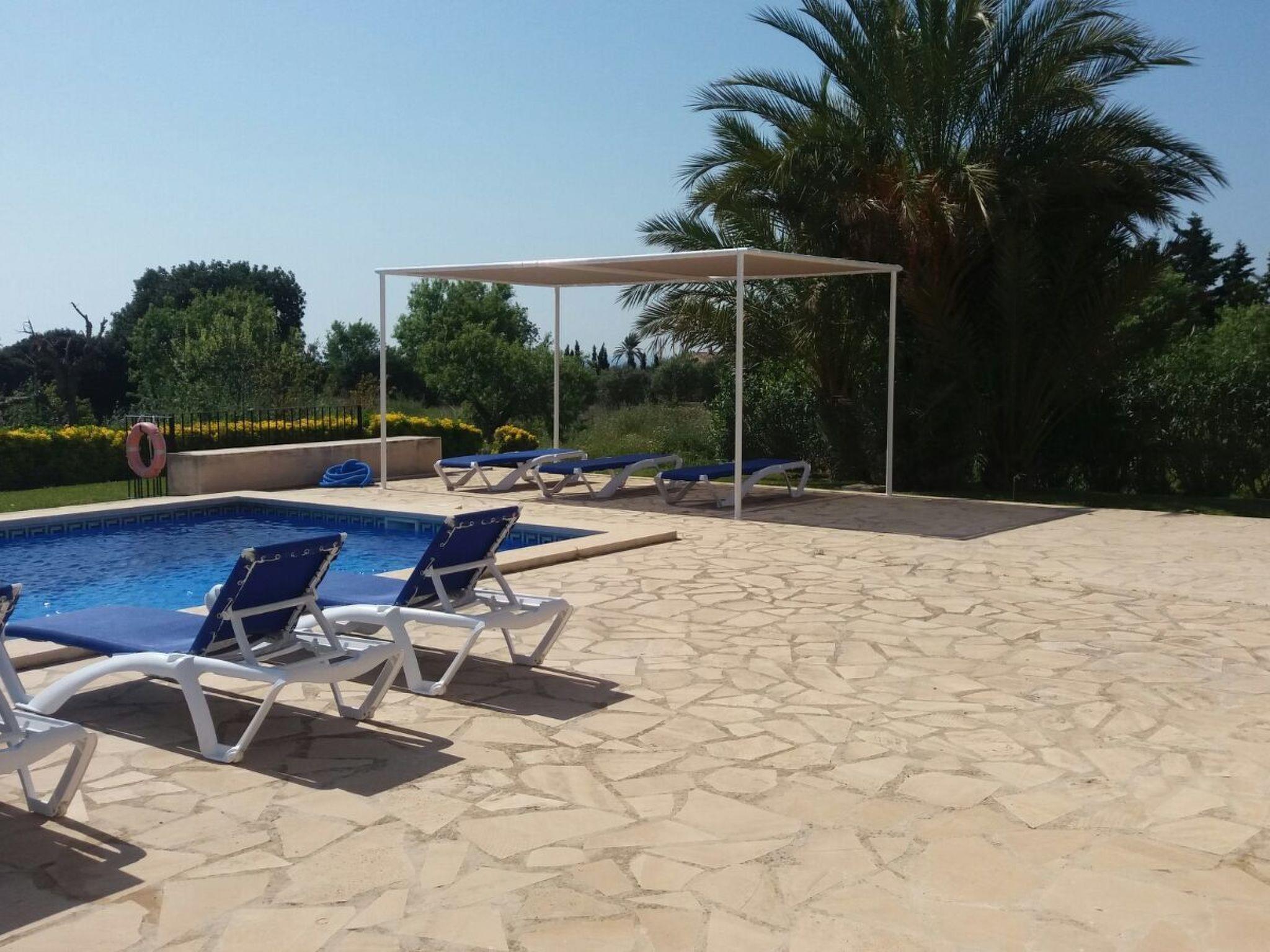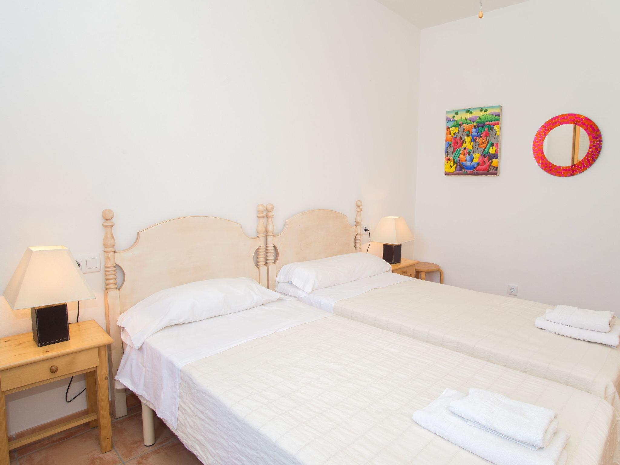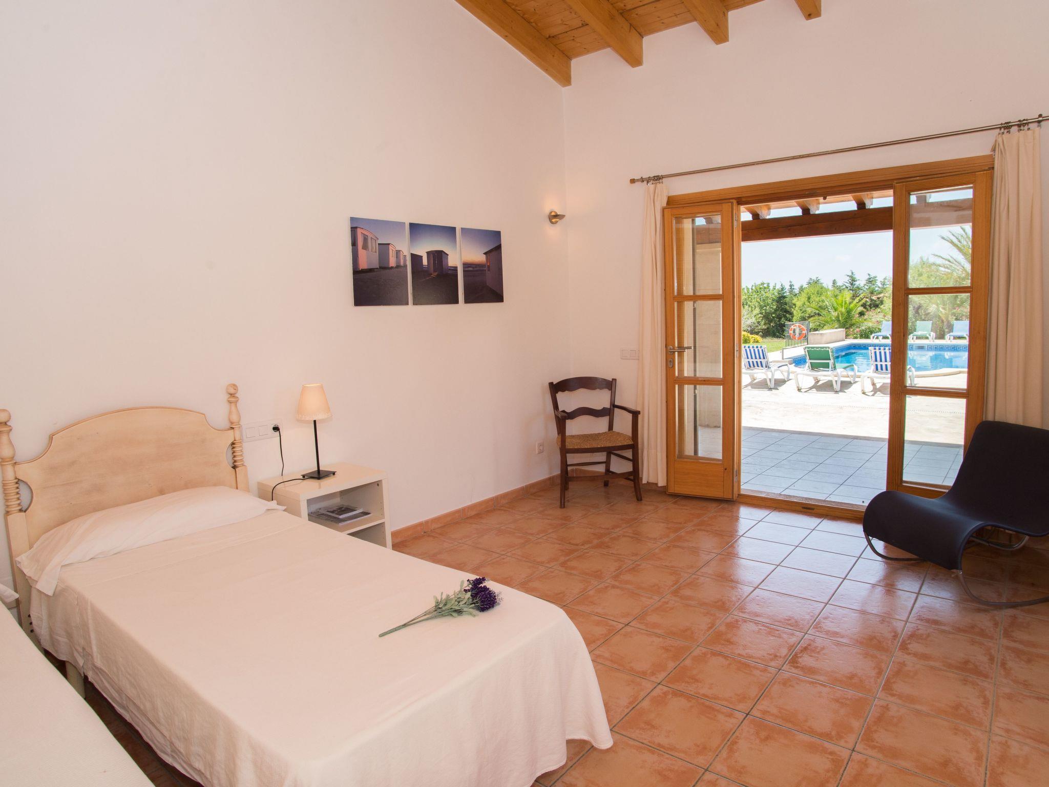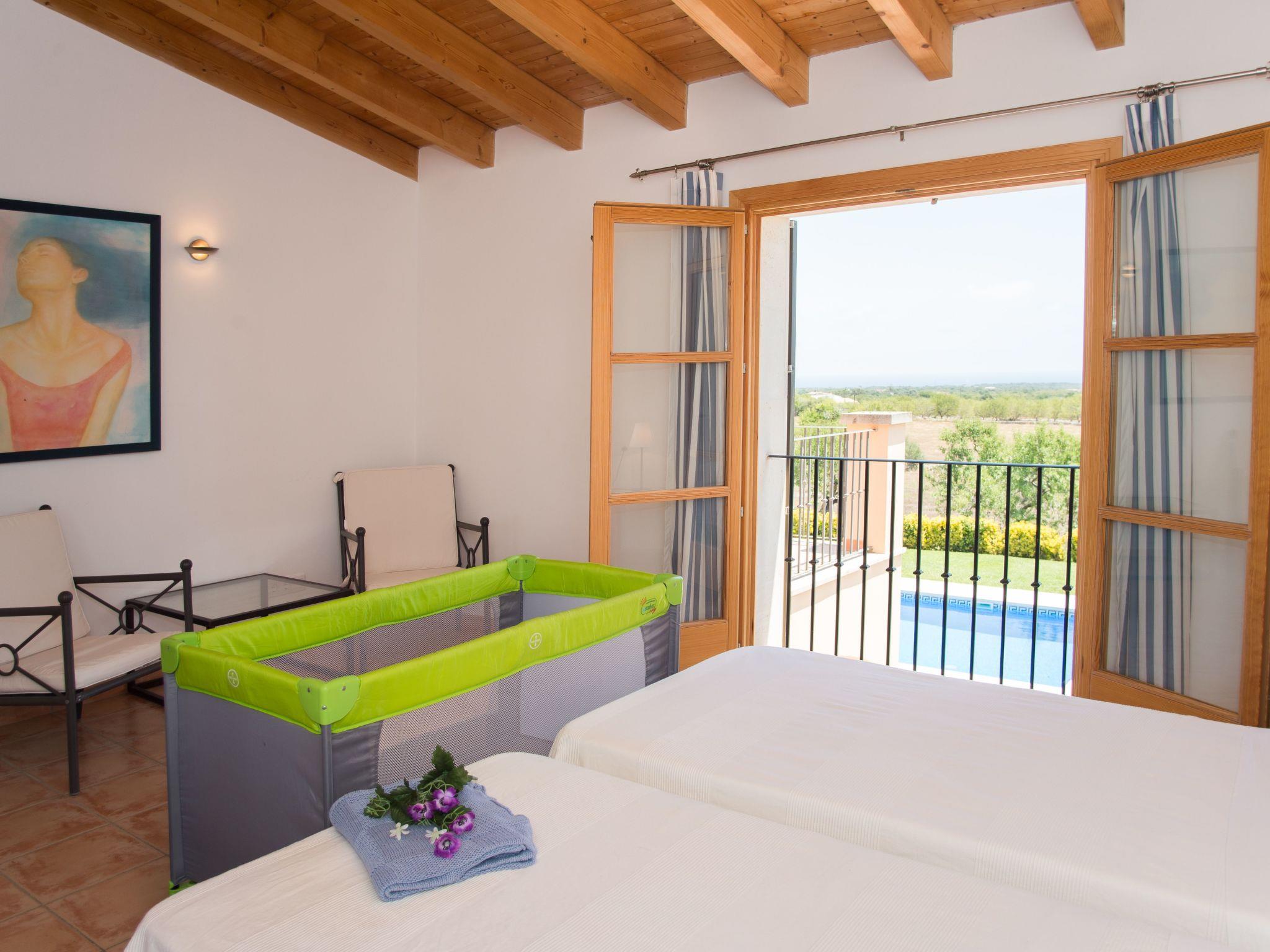 Finca Romana is a friendly and brightly furnished new build. Spacious, sunny areas offer an appealing place to relax and enjoy the peace and quiet of country life. The beautiful country house offers an airy living and dining area, designed in Ibizan style. Large glass doors lead to the charming covered terrace. The modern and spacious kitchen is well equipped. Two bedrooms, each with two single beds, share a bathroom with shower. A guest toilet completes the ground floor. The upper floor houses a master bedroom with double bed, dressing area, a large en-suite bathroom and direct access to two large terraces with panoramic views of the pool and the countryside. A further bedroom with two single beds also has a dressing area and an en-suite bathroom. In a small guest house by the pool there are two further bedrooms, each with two single beds and en-suite bathrooms with shower.